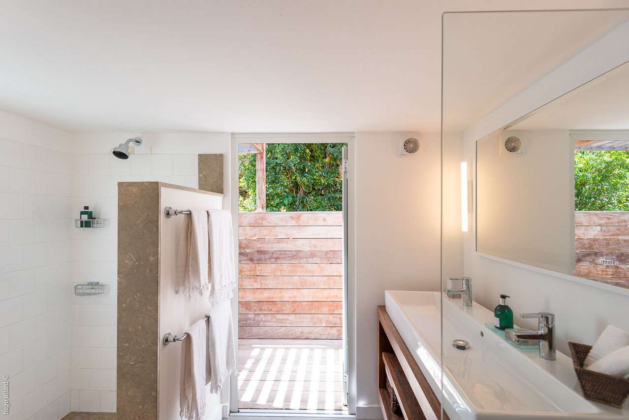 To the right of the great room, a separate pavilion is where you’ll find 3 out of the 4 bedrooms at Villa Romana. In this space, there are two bedrooms with a king-sized bed and one with a queen. All three open to the outdoor terrace, with views of the lush tropical hills through the doors.