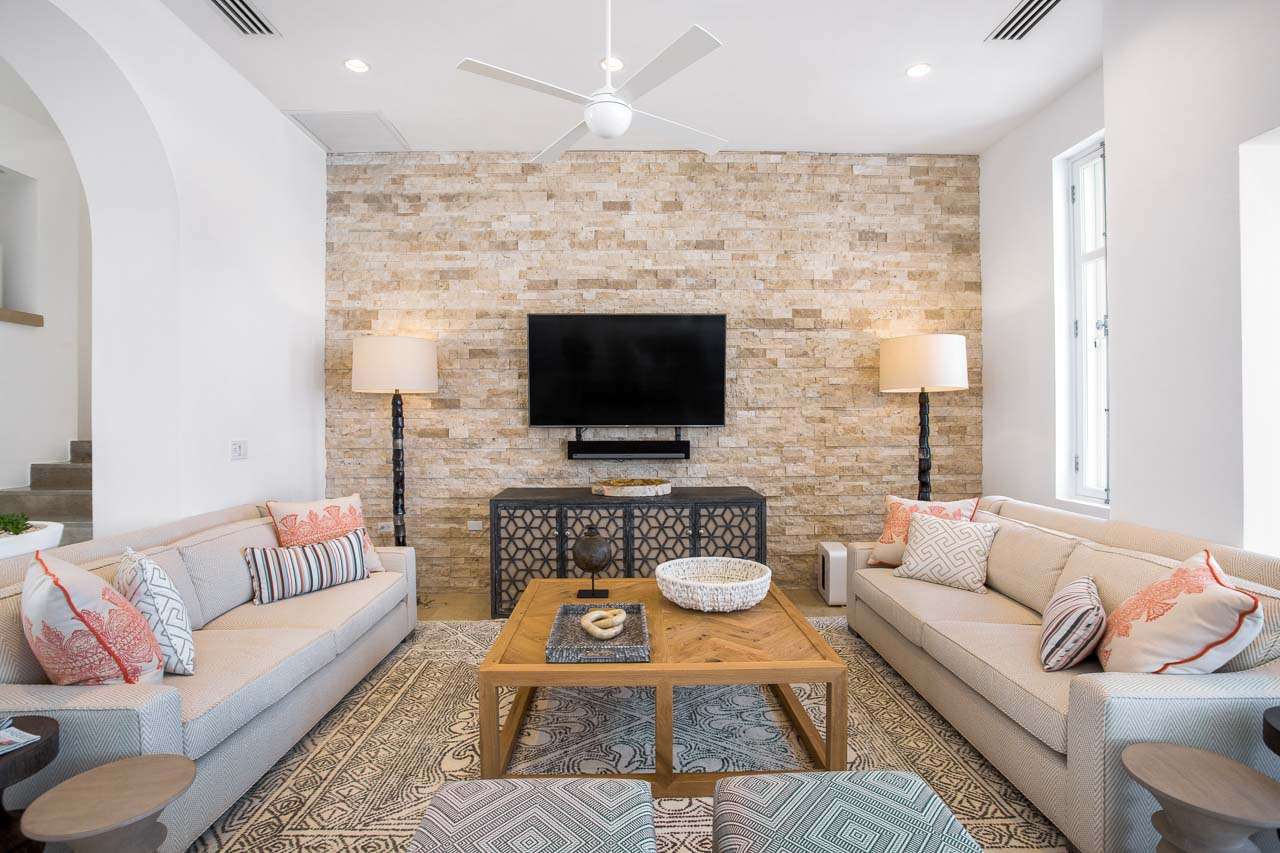 Villa Sand’s elegant living room is an ideal place to entertain with its full entertainment center and custom furnishings. Sinking into the soft sofas will help you unwind, while the flat-screen TV lets you enjoy a night inside with your favorite movies.