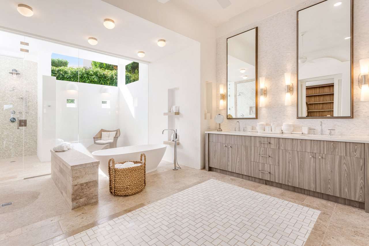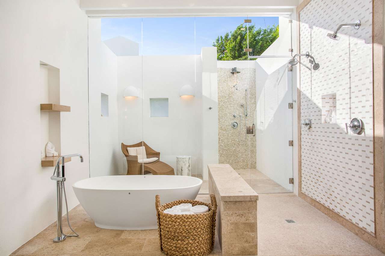 There are two master-quality bedroom suites on the first floor and two on the second floor. Each offers an ensuite bathroom, a king-size bed, an outdoor shower, and spectacular sea views.