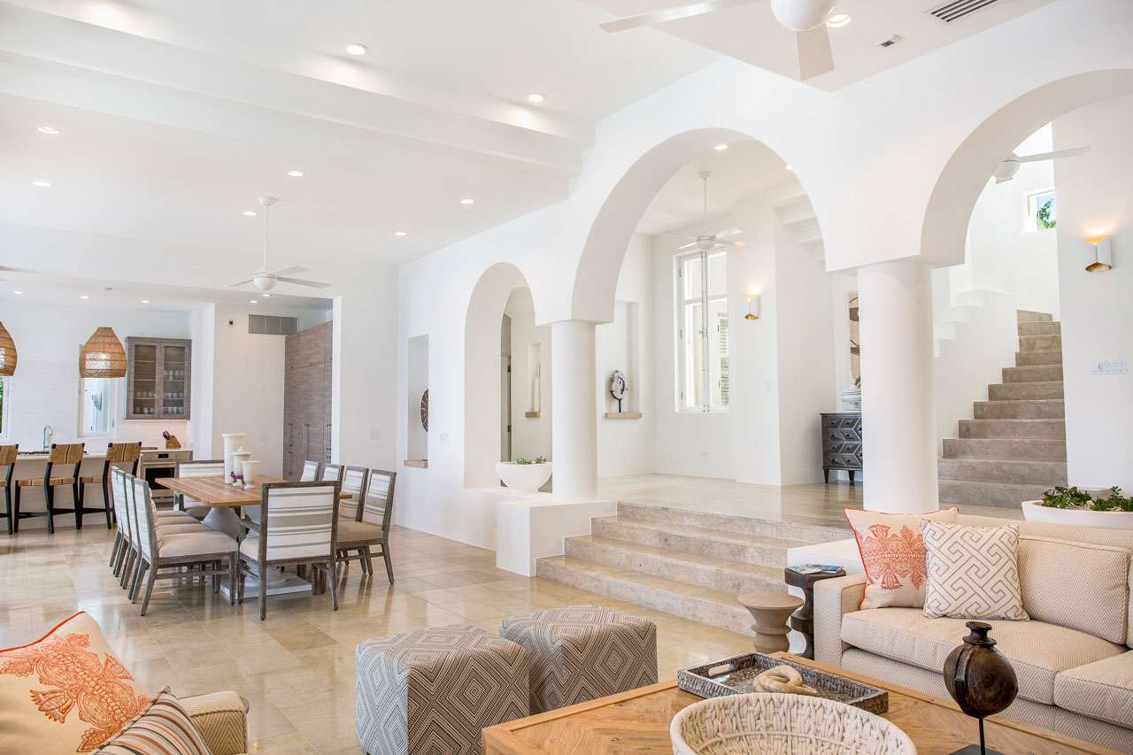 Spacious, bright, and airy, the great room acts as the comfortable gathering spot for your stay at Villa Sand. Mediterranean-style arches and pillars divide the otherwise open-plan space, which is home to the living room, dining area, and kitchen.