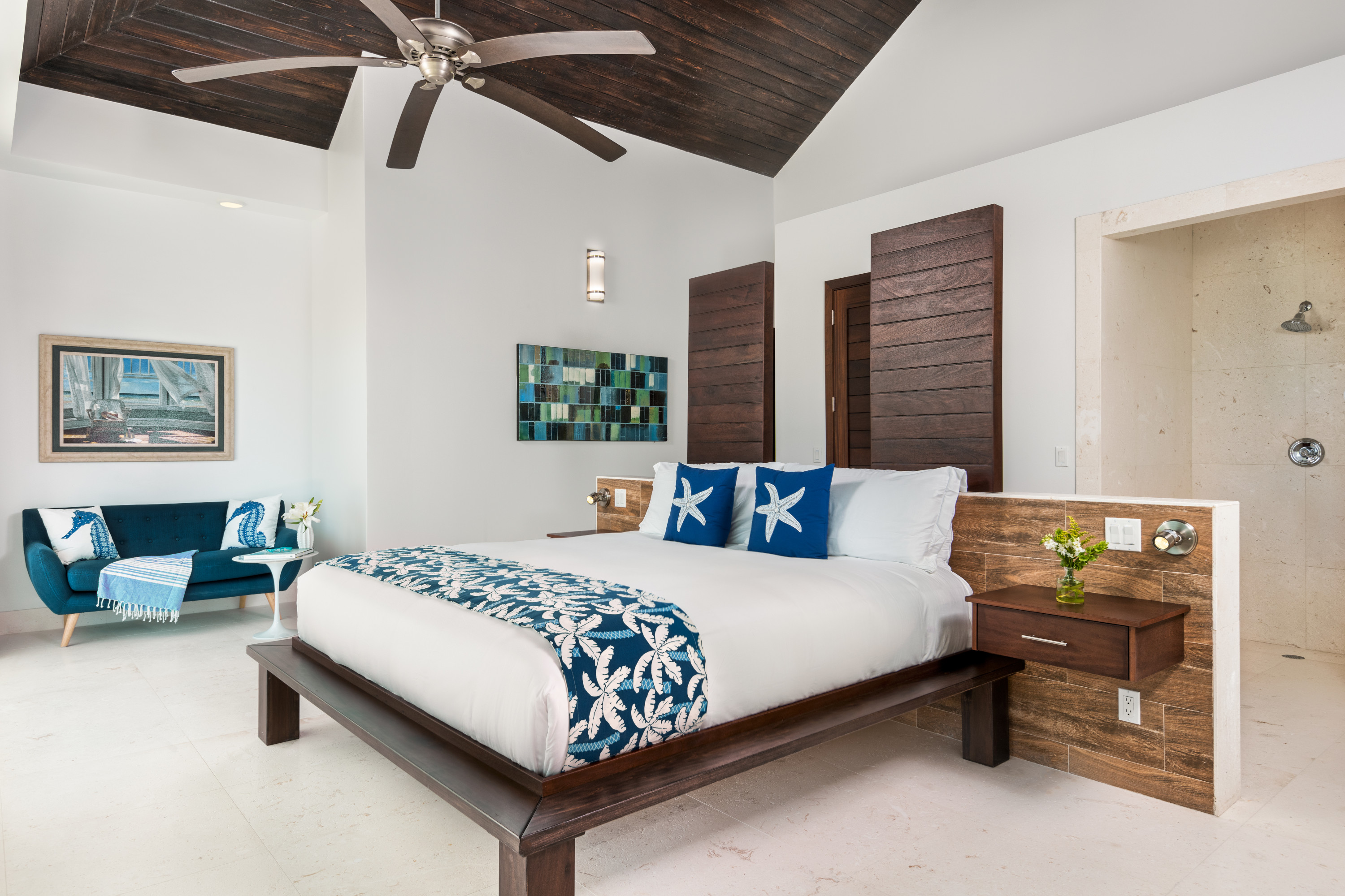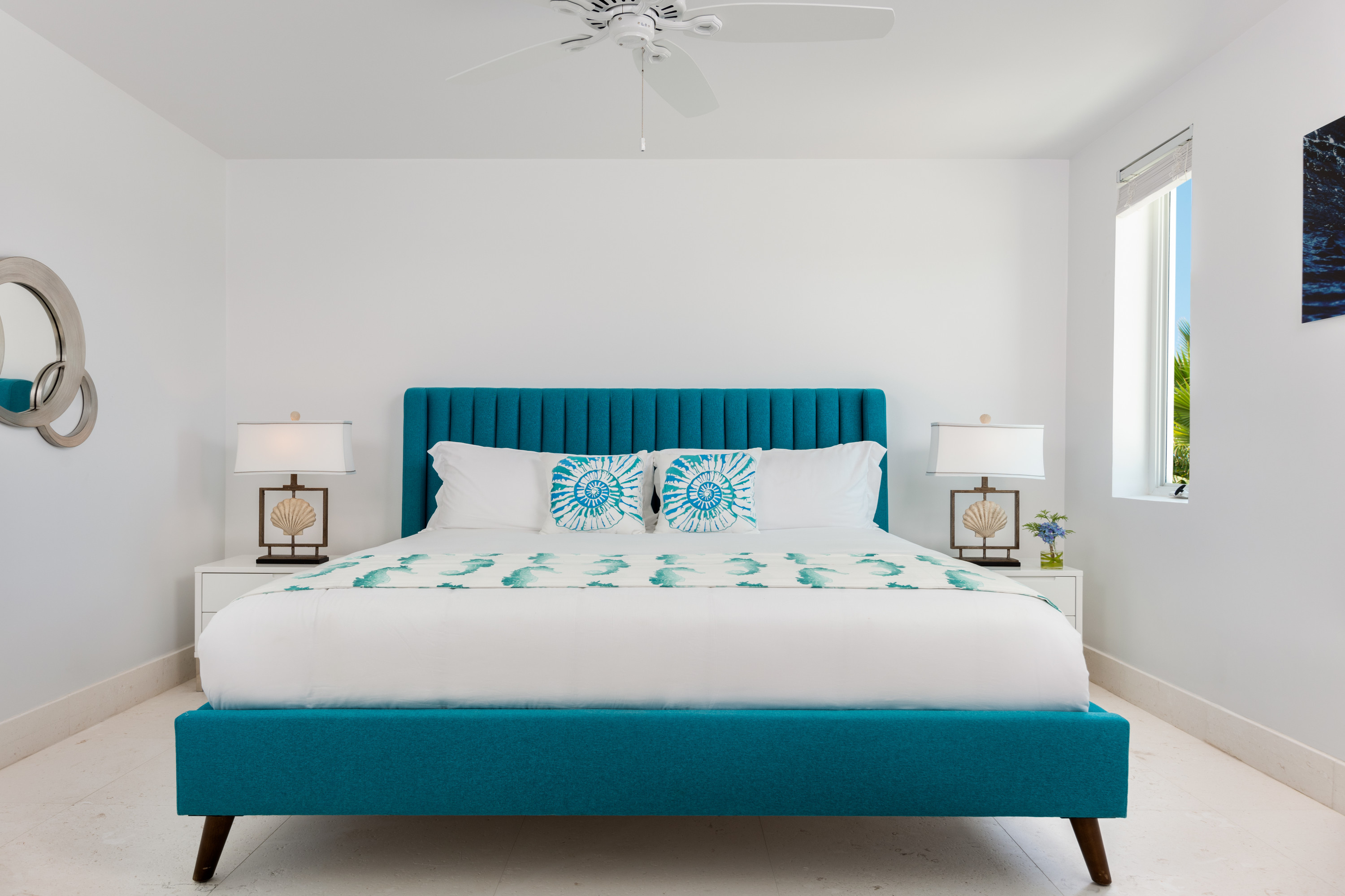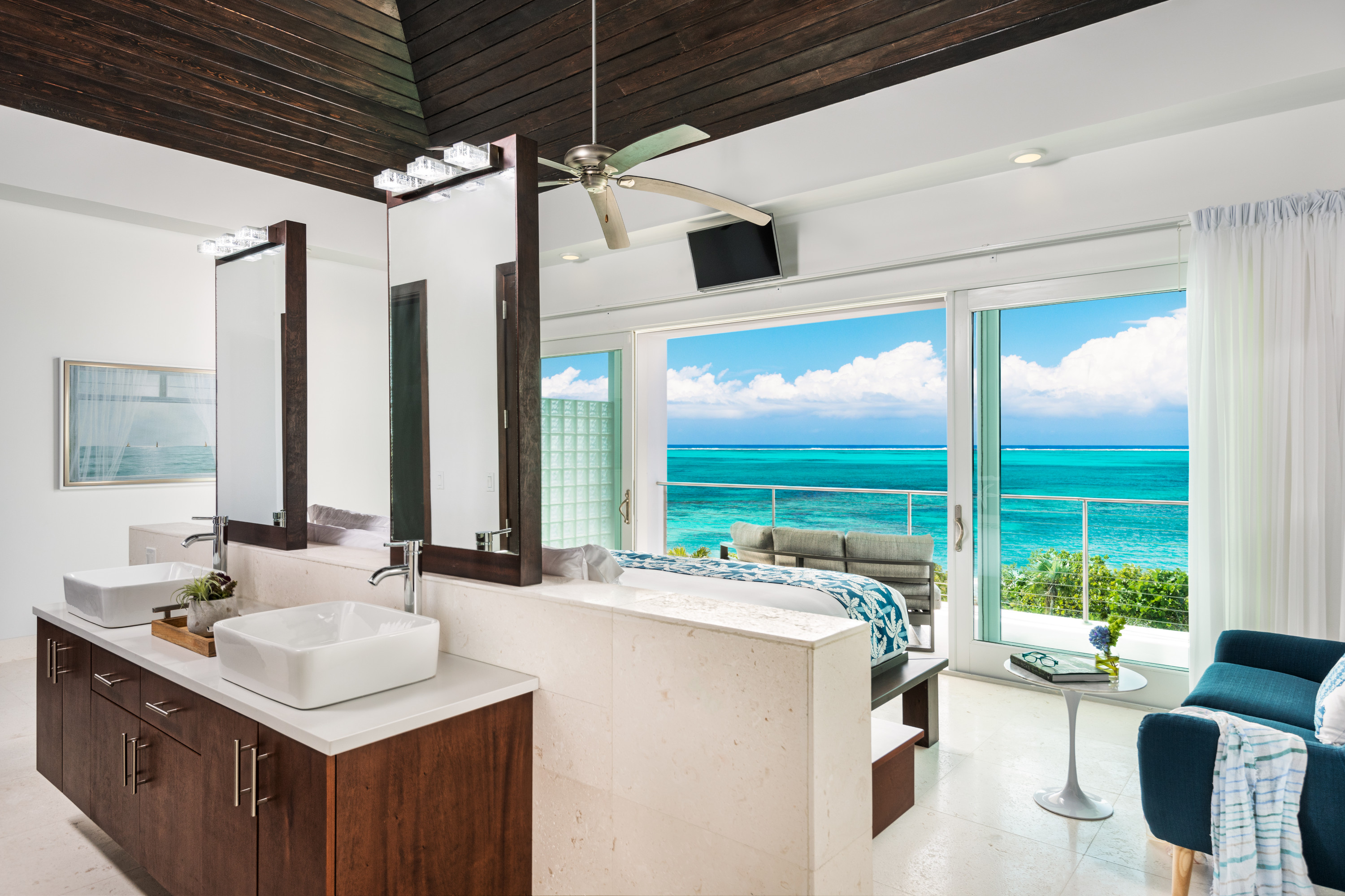 All the bedrooms in Villa Sandpebble, have an ensuite bathroom. The first is on the main floor, boasting a king-sized bed and ensuite bath. Quiet and secluded, it’s a relaxing space to retreat to after a long day lounging by the pool. The master suite is on the second floor, complete with a private balcony. It’s an incredible spot to watch the sunset burn orange and pink in the late afternoon, rum cocktail in hand. Each night, the gentle sounds of the ocean lull you into a restful sleep. A third bedroom on the second floor is identical to the master suite, with views to the south towards Turtle Cove Marina. Both bedrooms on the upper floor have comfortable sofas as well, offering a pleasant spot to settle down with a book before bed. Wall-mounted TVs also let you watch a late-night move from under the silky covers.