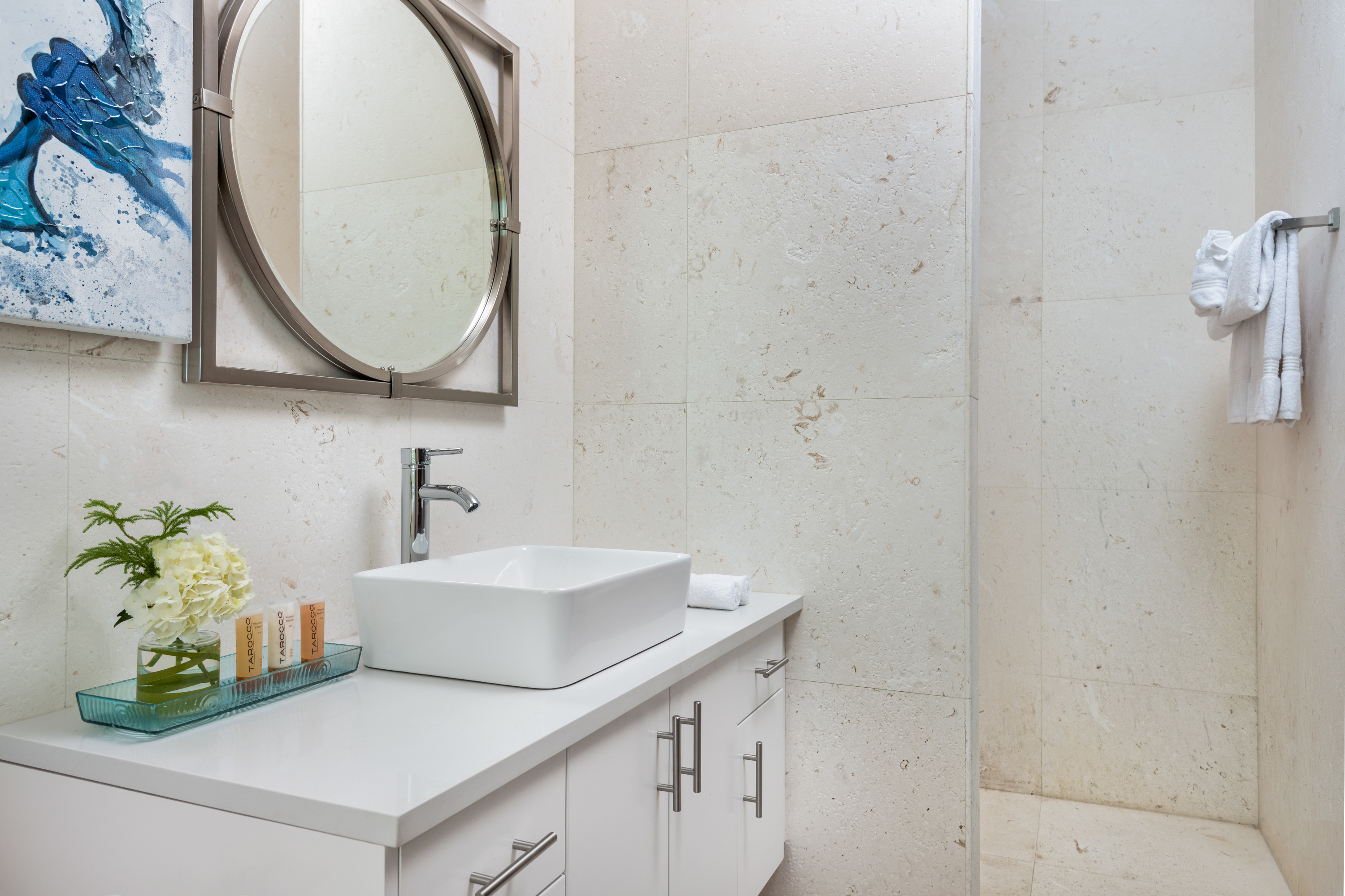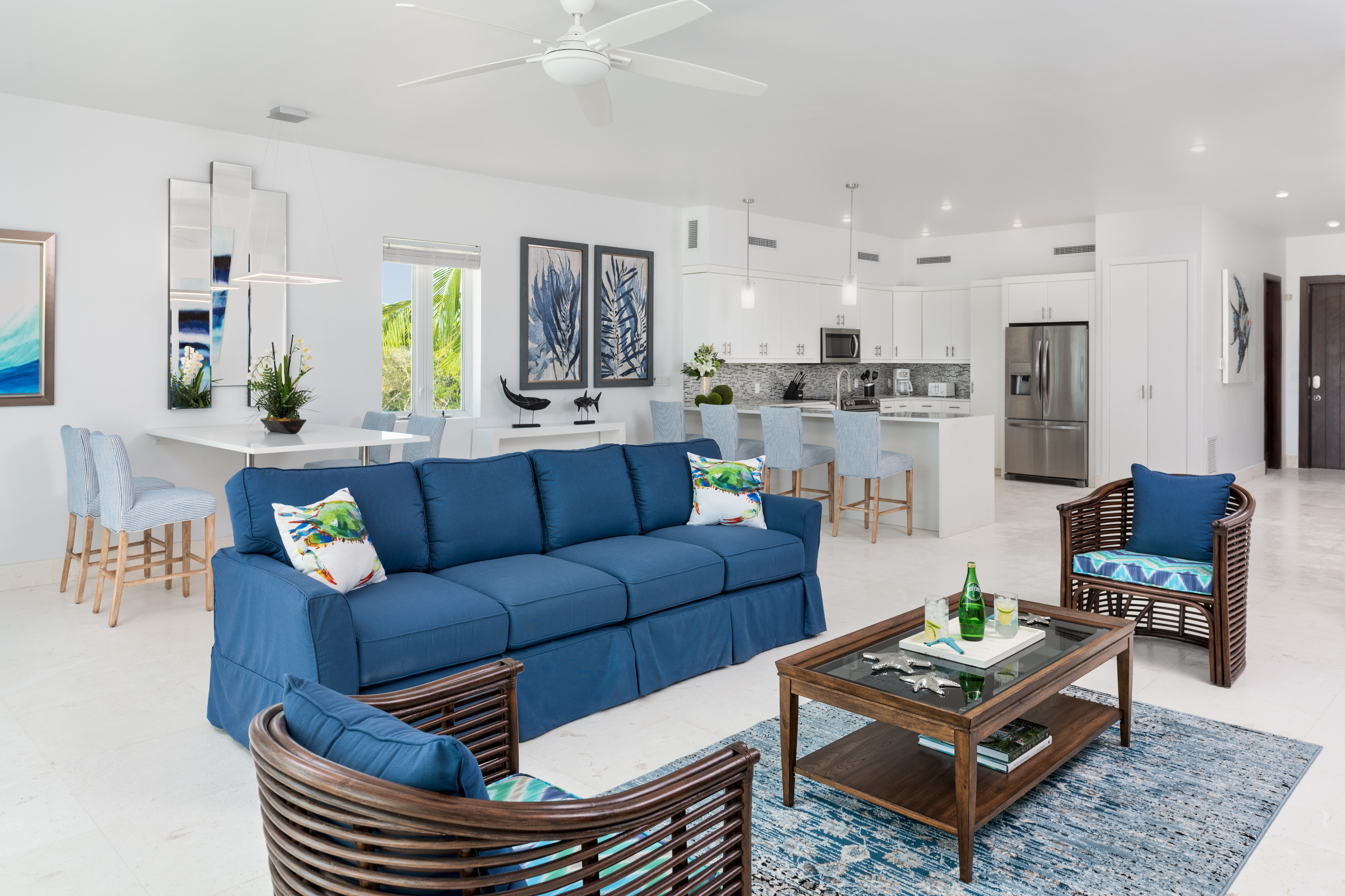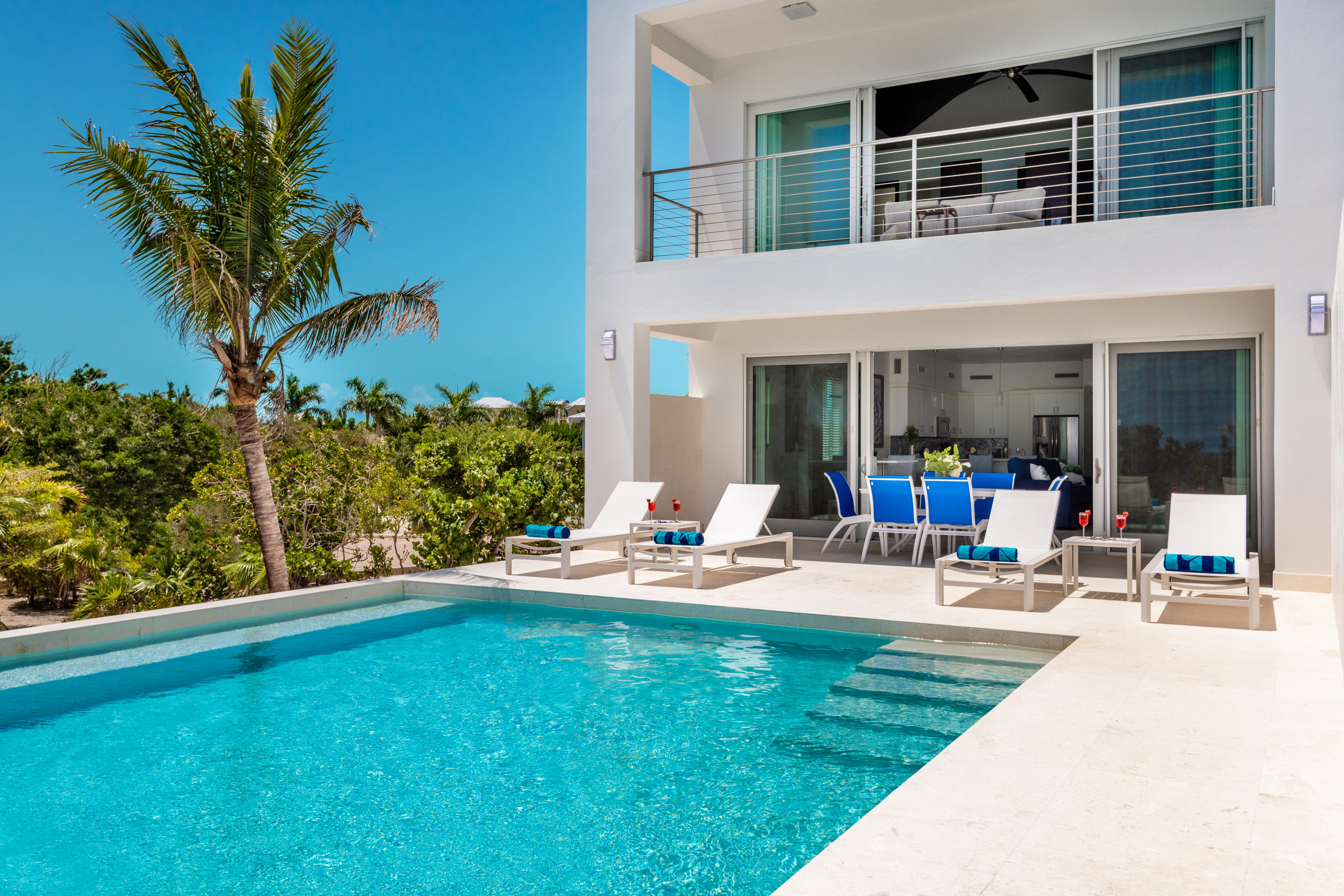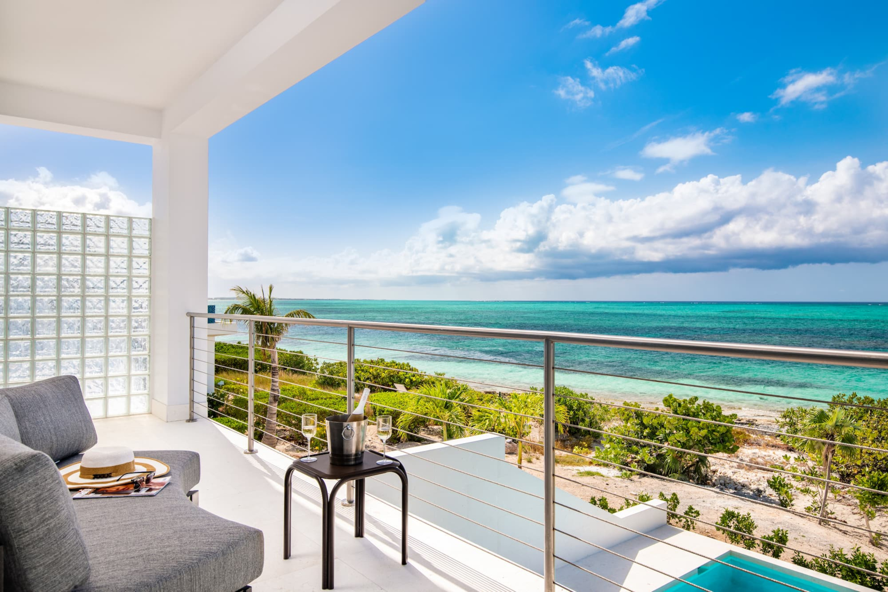 All the bedrooms in Villa Sandpebble, have an ensuite bathroom. The first is on the main floor, boasting a king-sized bed and ensuite bath. Quiet and secluded, it’s a relaxing space to retreat to after a long day lounging by the pool. The master suite is on the second floor, complete with a private balcony. It’s an incredible spot to watch the sunset burn orange and pink in the late afternoon, rum cocktail in hand. Each night, the gentle sounds of the ocean lull you into a restful sleep. A third bedroom on the second floor is identical to the master suite, with views to the south towards Turtle Cove Marina. Both bedrooms on the upper floor have comfortable sofas as well, offering a pleasant spot to settle down with a book before bed. Wall-mounted TVs also let you watch a late-night move from under the silky covers.