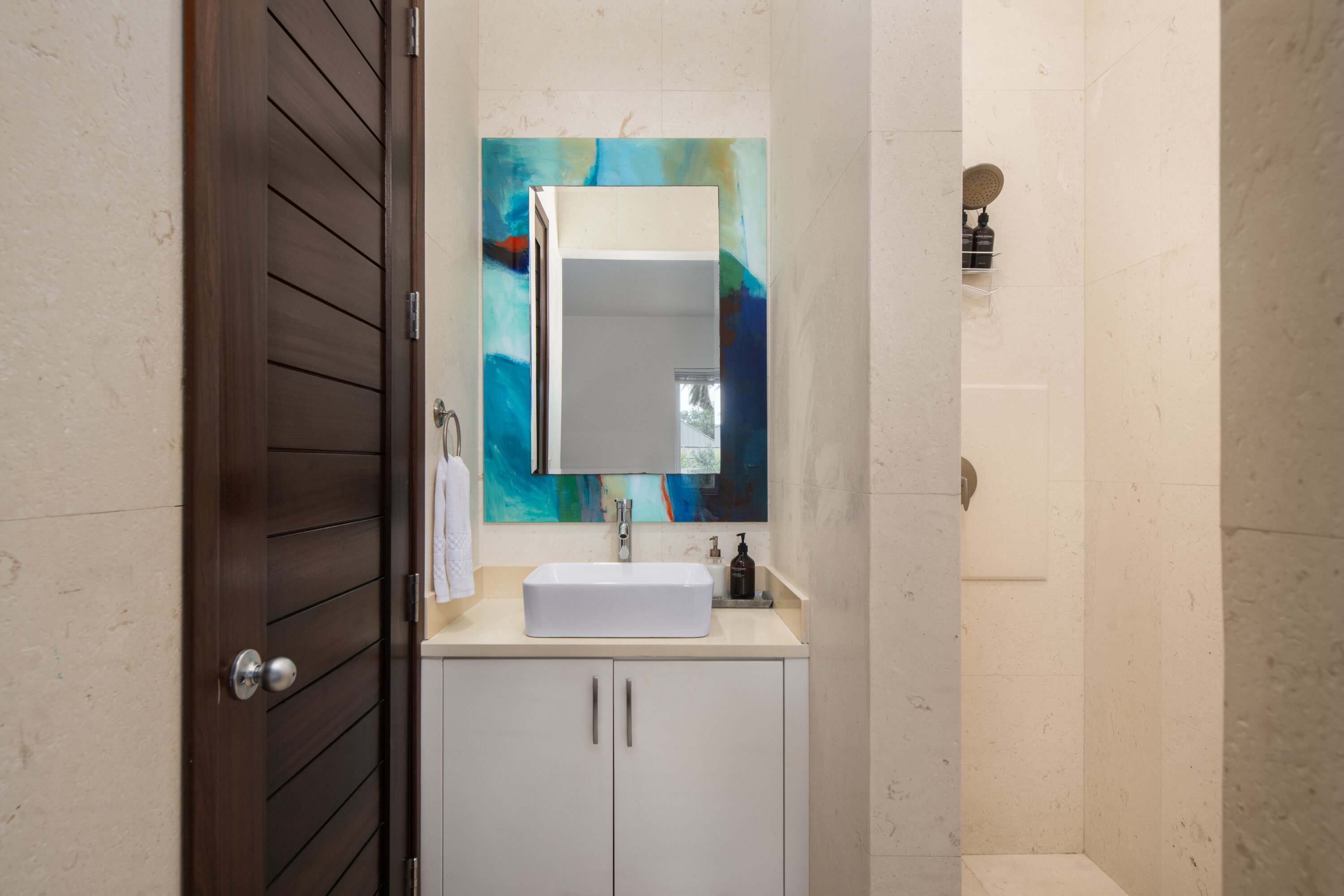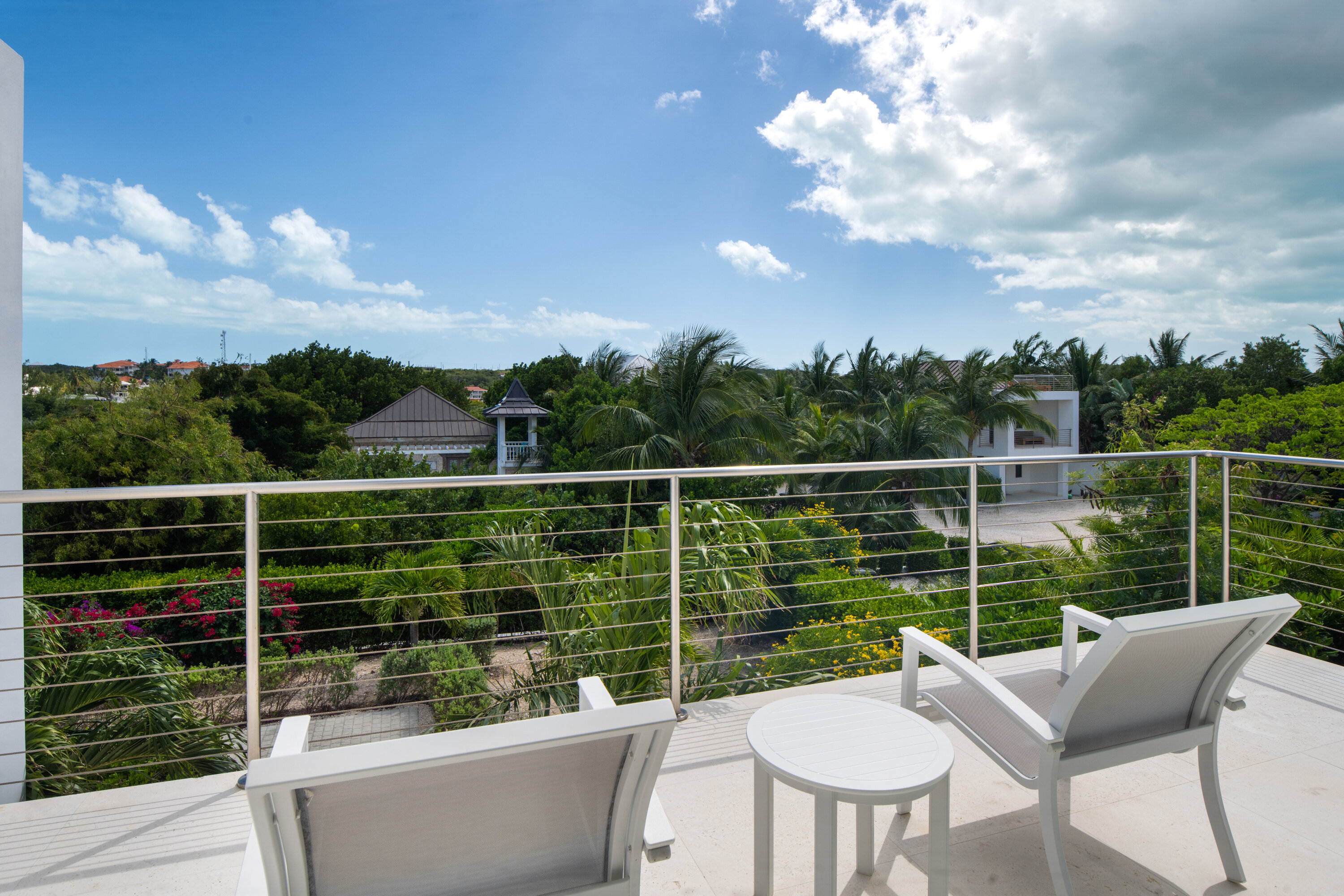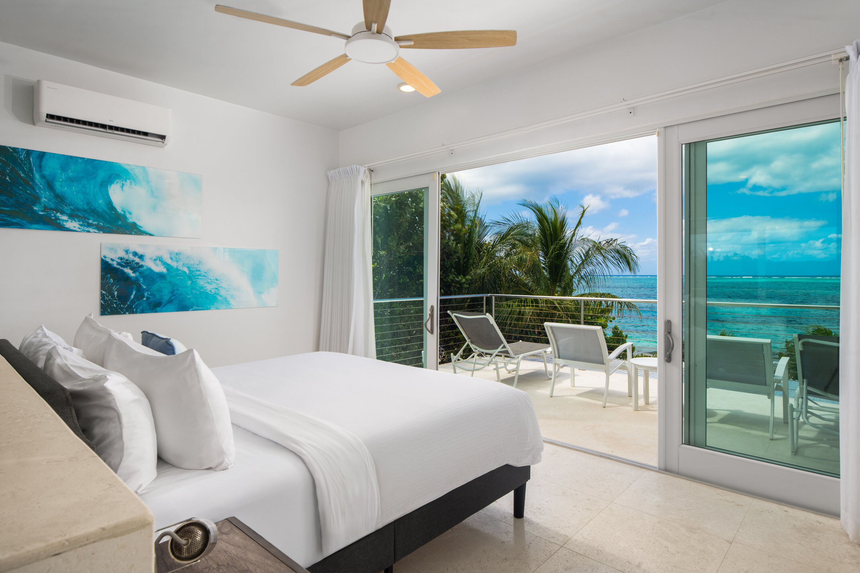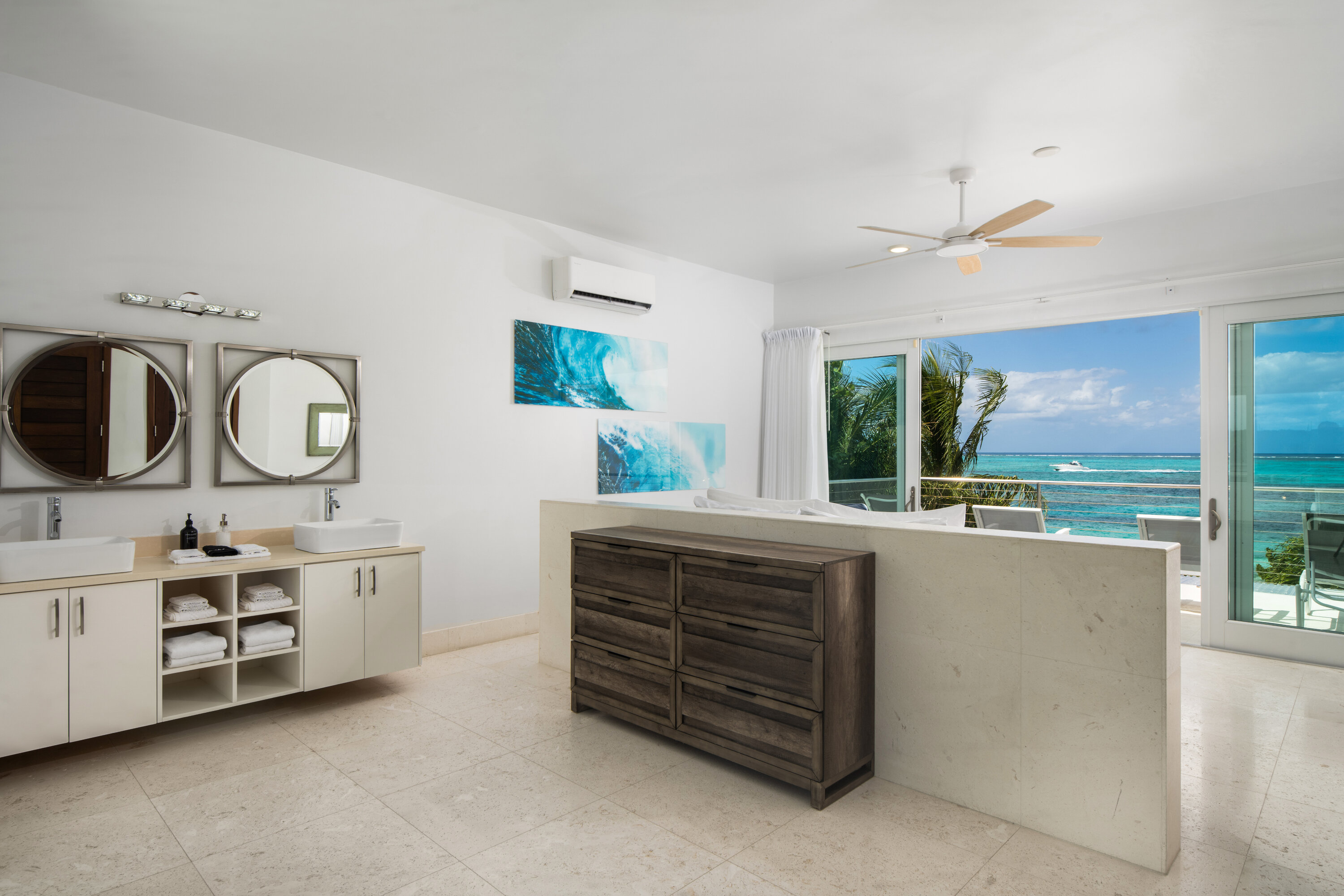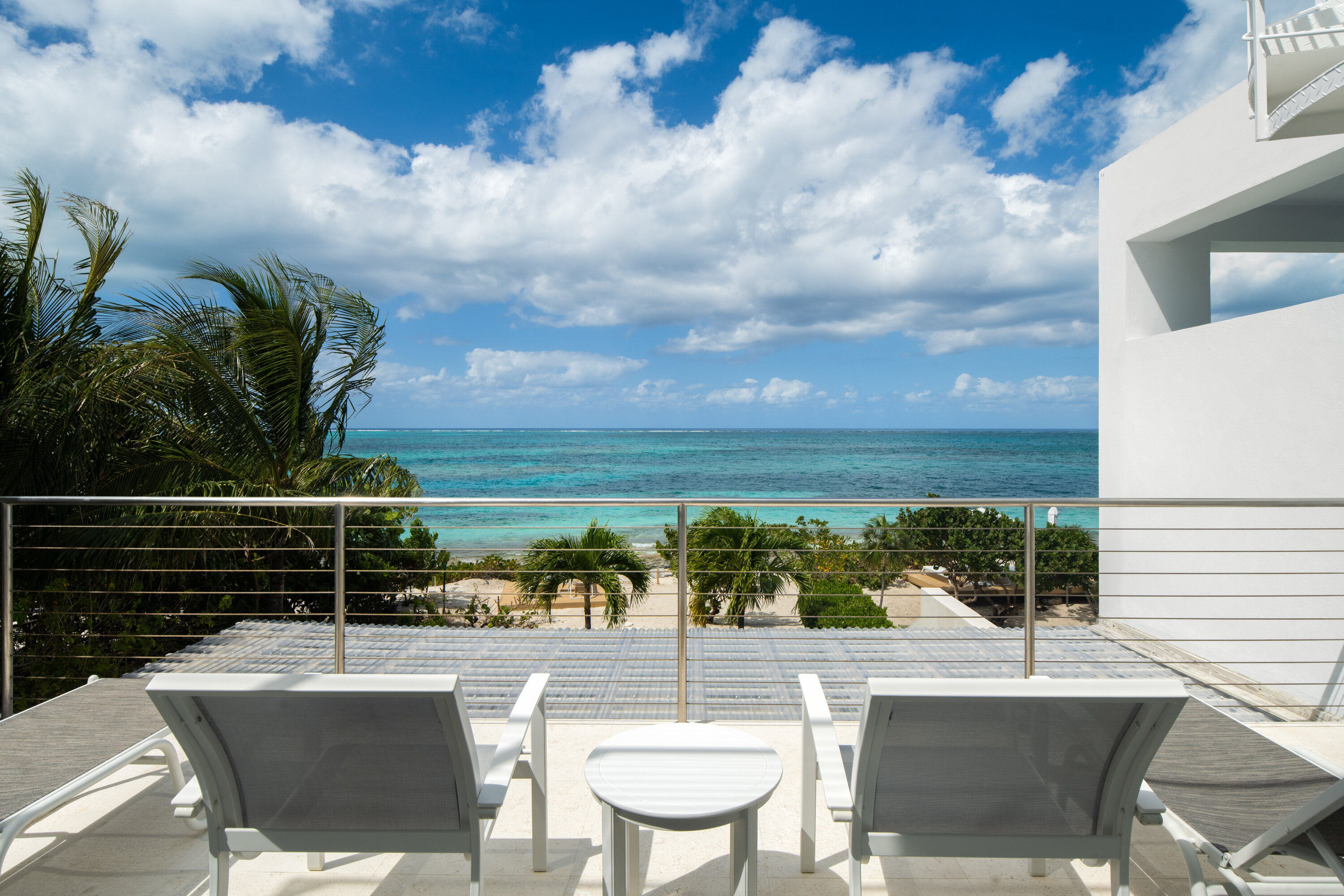 Upstairs, the primary suite enjoys two private terraces—one overlooking the open ocean and the other facing the marina—along with access to a rooftop terrace that showcases expansive island views. The guest suite is located on the beach level, offering added privacy for couples or friends sharing the villa. Throughout the home, quality finishes and carefully selected amenities provide comfort, style, and a truly relaxing atmosphere.