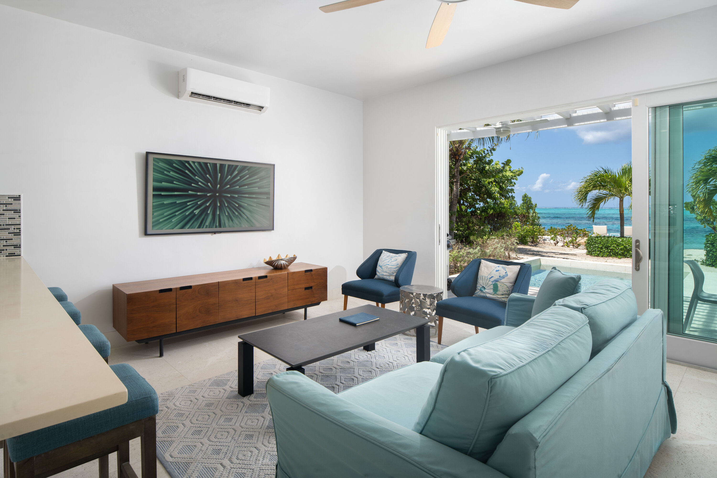 Inside, the home features a fresh, modern design with bright interiors accented by soft coastal tones. The open-concept living area combines a fully equipped kitchen, dining space, and comfortable seating, all flowing directly onto the pool terrace to create a seamless indoor-outdoor experience.
