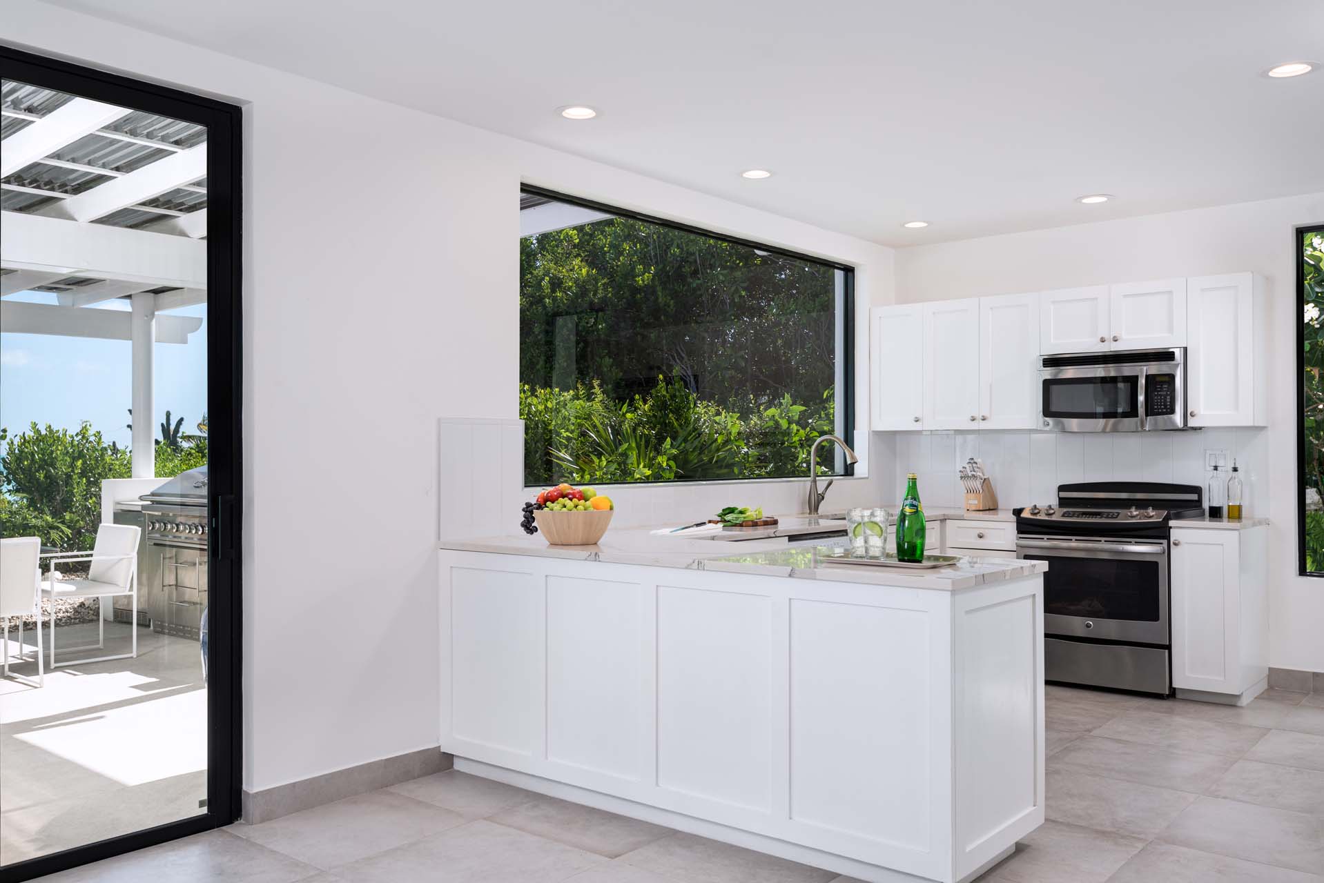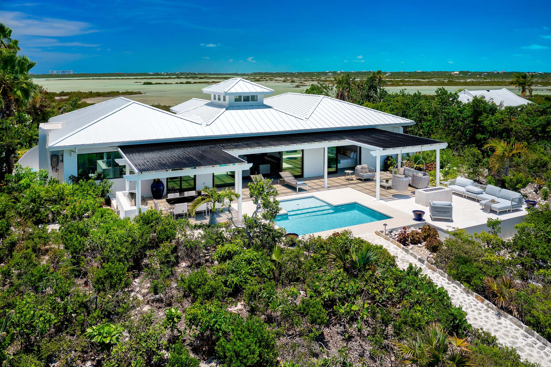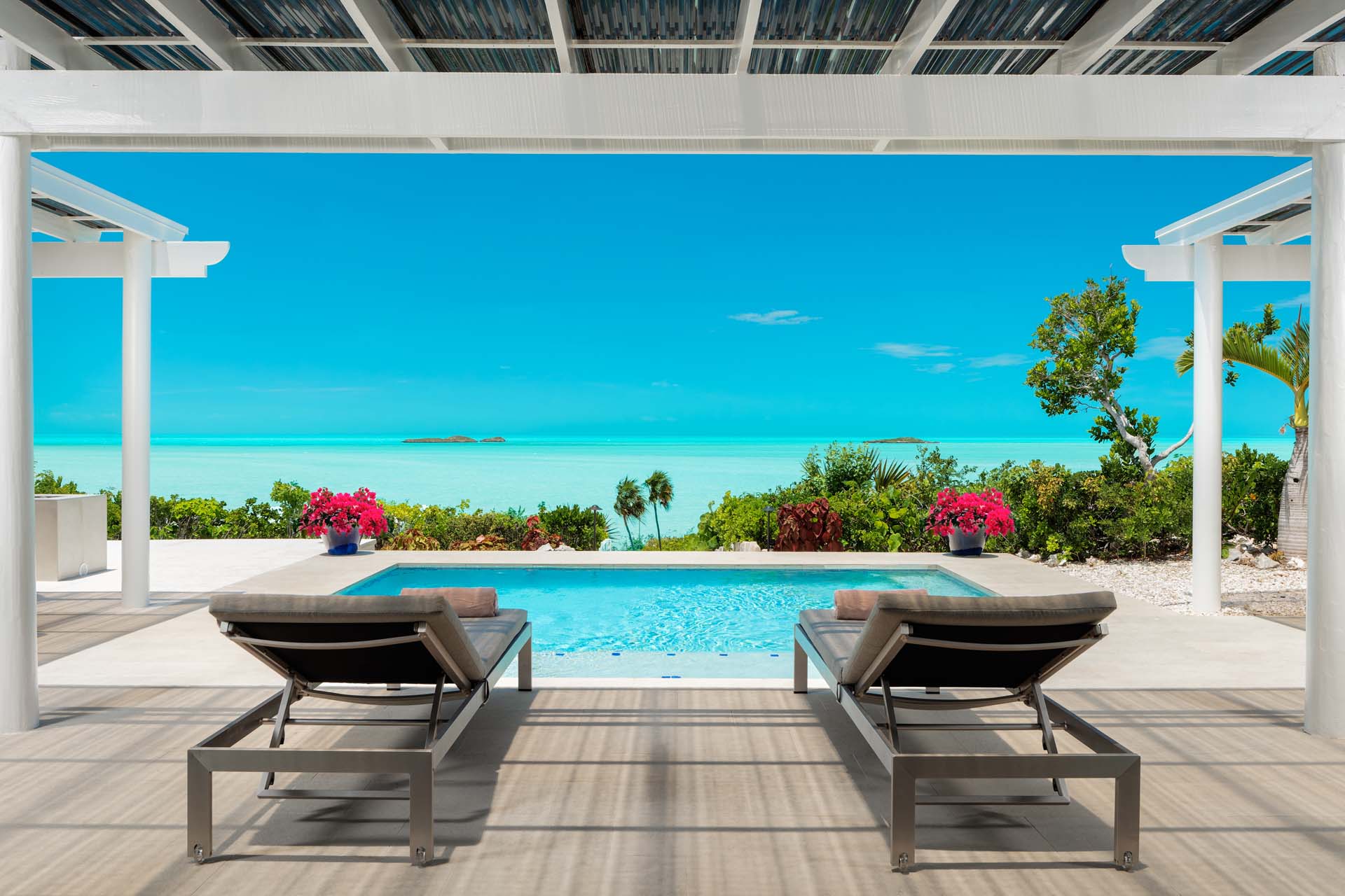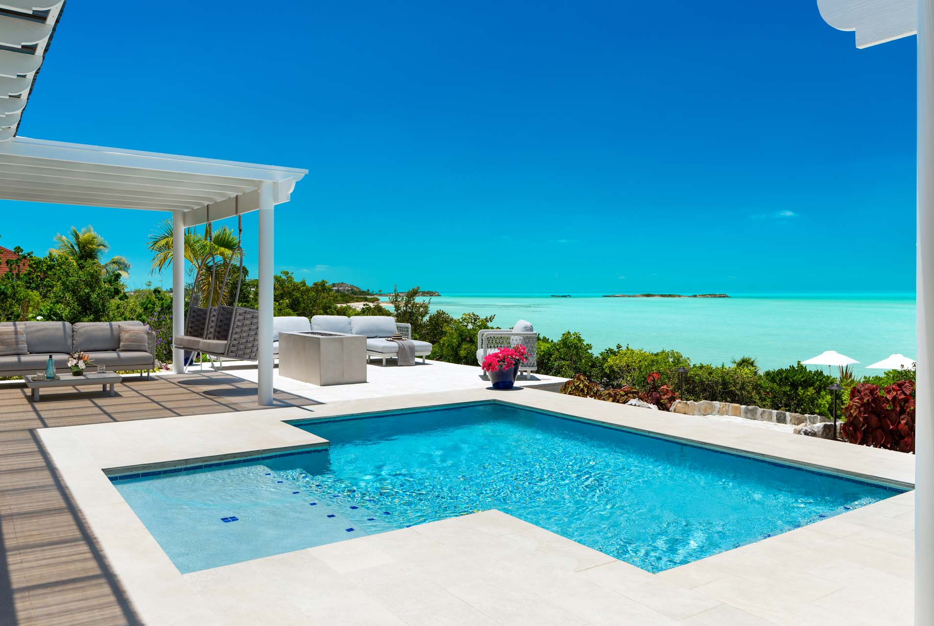 Outdoor living at Villa Sandy Shore gets even better. A grand patio with umbrella-covered pergolas on each side surrounds the swimming pool, commanding exceptional views of the Caribbean.