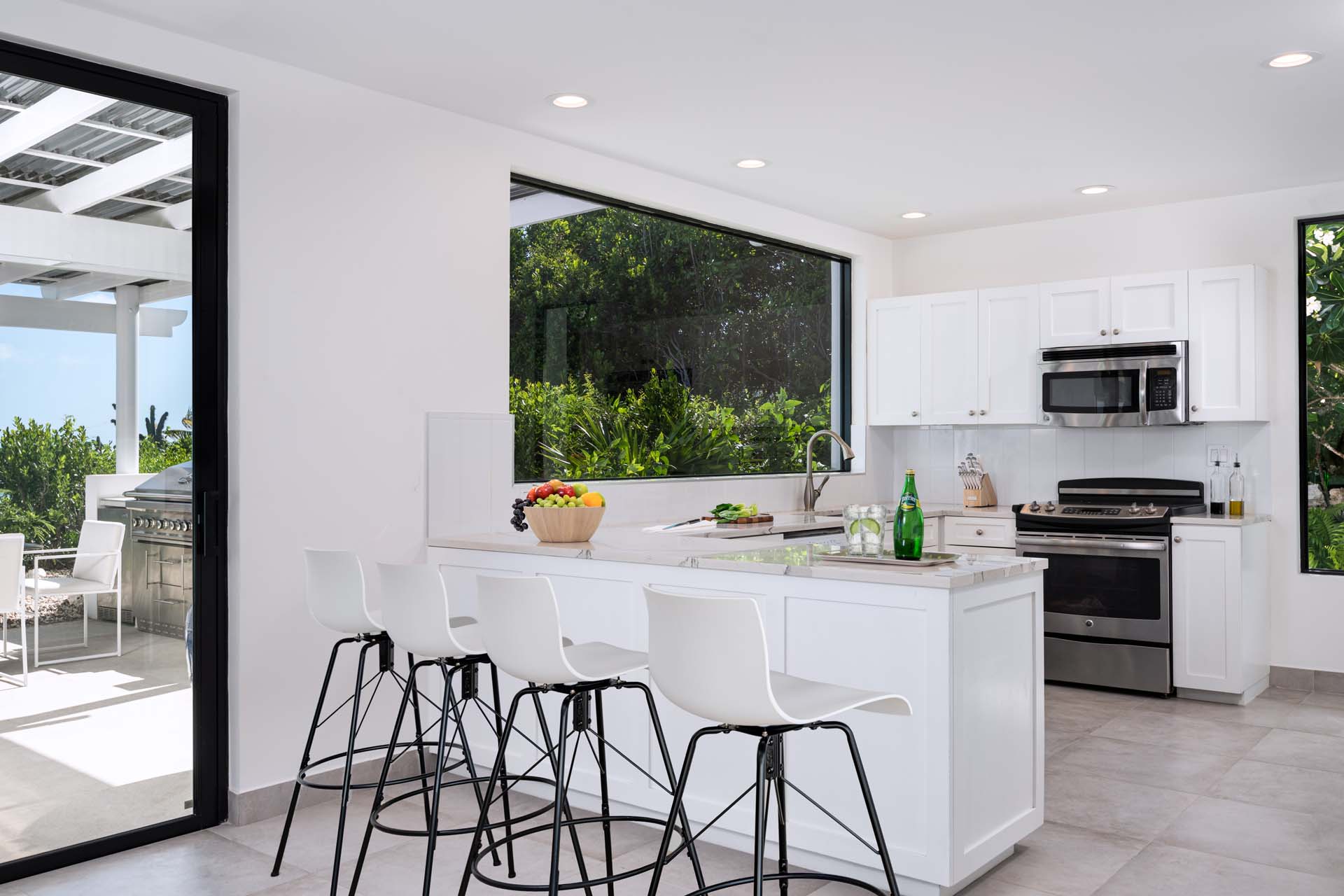 The heart of Villa Sandy Shore is its spacious great room, an open-plan living and dining area with 2-story high arched ceilings and rustic exposed beams. A sliding-door system ( with slide-away screens) overlooks the pool, opening to the cool island breeze blowing off the ocean. Three plush sofas invite you to sink in and relax at any time, whether it’s for a mid-morning nap or a post-dinner drink. A large flat-screen TV offers a chance to kick back and unwind with your favorite movie or TV series at the end of a long day exploring the island.