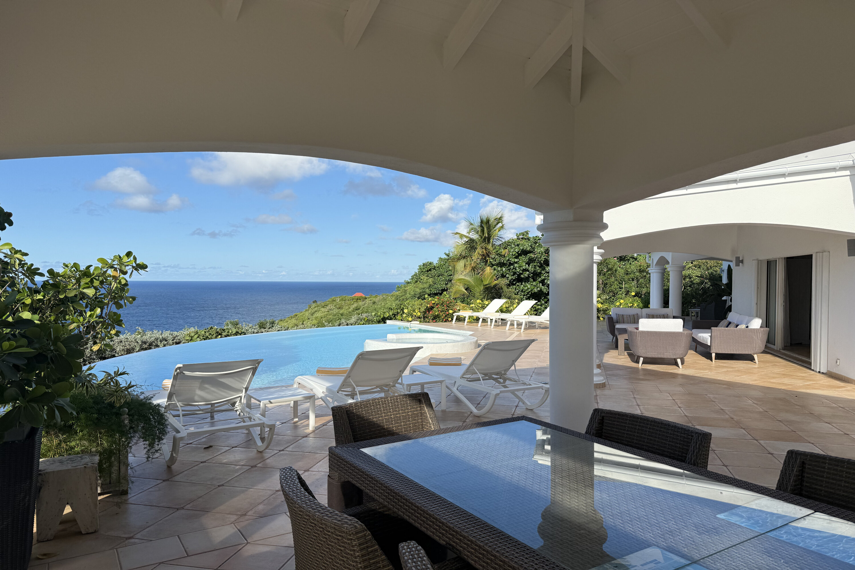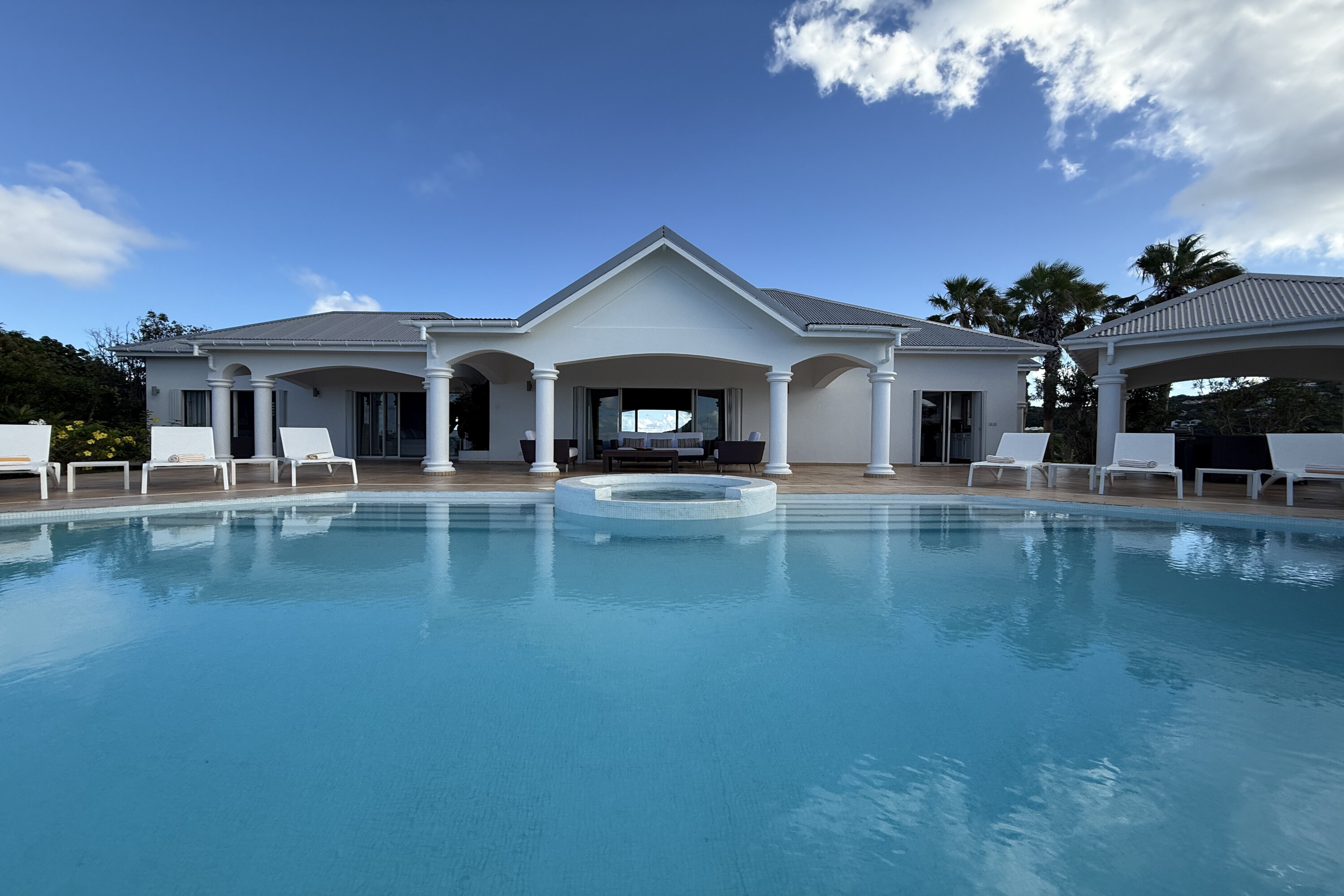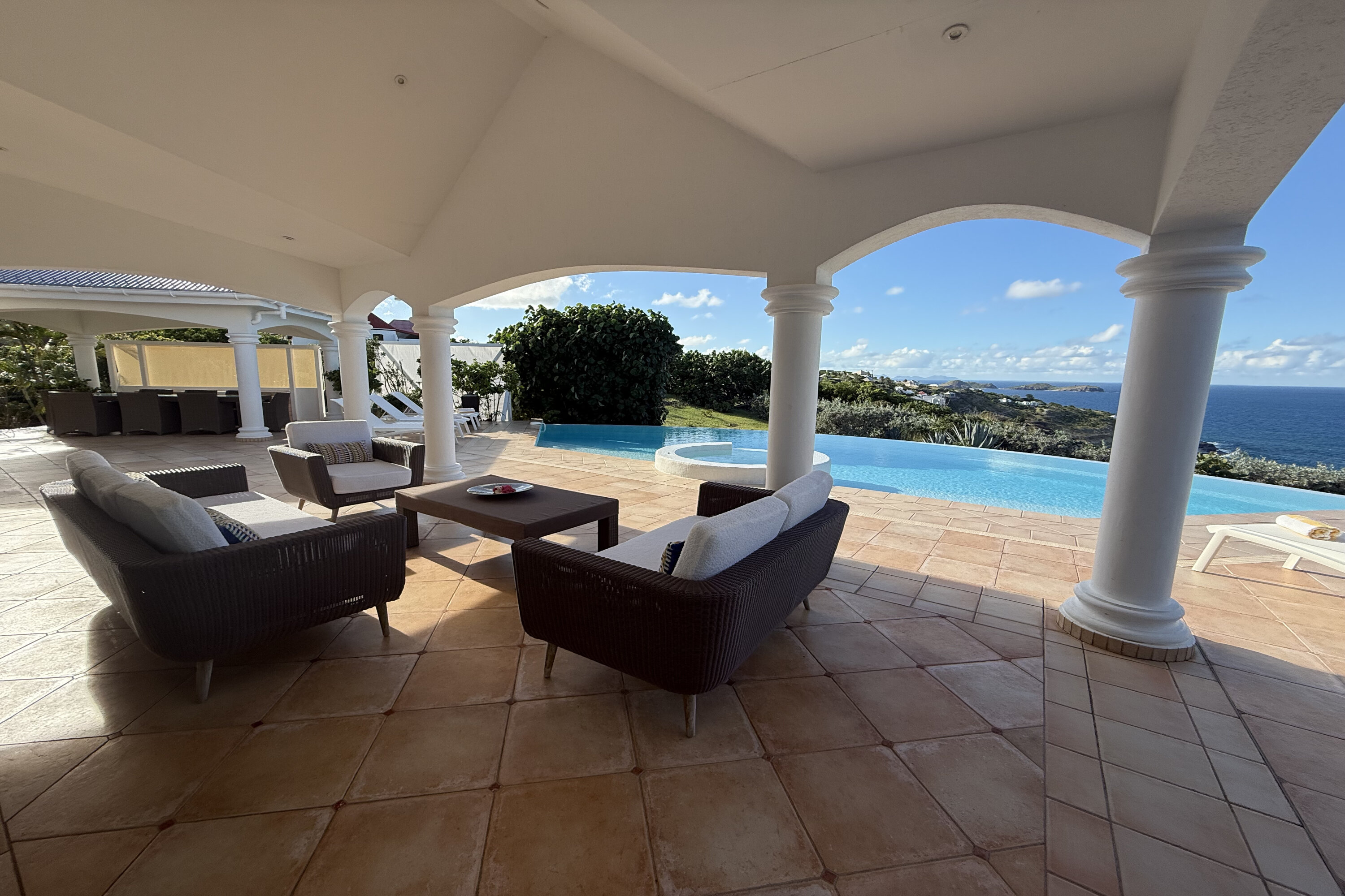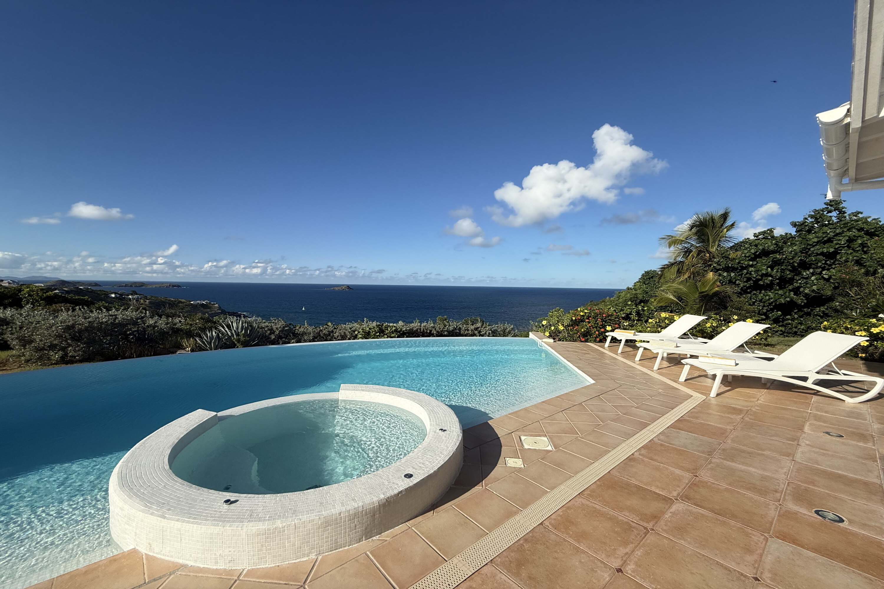 Welcome to Villa Sea Bird 19 (villa code: WV AHA), a stylish 3-bedroom villa located in the exclusive gated community of Mont Jean, St. Barts. This villa offers dramatic eastern and western views and is within minutes of several beaches and restaurants. Inside, open and airy interiors are awash with island charms. Natural light illuminates the stylish open-plan design and Indonesian-inspired décor. Cool terracotta tiles and artwork adorning the walls add pops of color and contrast with the earthy tones. Located on the Mont Jean peninsula, Villa Sea Bird 19 offers peerless privacy. The beaches at Marigot and Grand Cul-de-Sac are just a short drive away. Elegant shopping and dining await in St. Jean, 10 minutes away by car. The spacious main great room combines the living room, dining area, kitchen, and office. Vaulted ceilings give the entire room a breezy, open feel, while modern furniture adds a touch of luxurious beach chic. The living room has two plush sofas facing a large entertainment center with a TV. This is an ideal space to relax, whether it’s with a morning coffee or a movie night with family and friends. If you need to get some work done, the office has a desk and chair. The well-equipped kitchen at Villa Sea Bird 19 has everything you’ll need to create gourmet meals during your stay. Our concierge can even organize grocery pre-stocking or delivery, catered meals, or arrange private chef service for a special occasion. The indoor dining table is an excellent setting for elegant dinner parties, overlooking the ocean outside. The kitchen also opens out to a covered dining area, allowing you to pair your meal with the warm island air and stunning sunset. The 3 airy bedrooms at Villa Sea Bird 19 are private and peaceful, offering a relaxing area to relax and recharge each evening. The large master bedroom is connected to the living room, featuring a plush king-sized bed, TV, and ensuite bathroom. It also has stunning views out over both sides of the house, letting you wake up with views of the shimmering Caribbean. The guest bedrooms are in a separate cottage on the lower level. Each with a king-sized bed, TV, ensuite bathroom, and a private terrace overlooking Marigot Bay. Furnished terraces on both sides of Sea Bird 19 Villa offer exquisite views of the ocean, coastline, and undulating tropical hills of St. Barts. Comfortable lounges offer plenty of room to unwind, enjoy a good book, or kick back with a tropical cocktail and enjoy the island breeze. The swimming pool overlooks the ocean, a fabulous spot for a refreshing dip. Loungers lining the water let you sunbathe in the island rays, or even work poolside. There are two hot tubs, one located in the back of the villa facing Marigot, and one in the pool. A gas grill also encourages you to host cookouts, frying up some fresh fish or a succulent steak with a golden island sunset. There’s nothing like the sizzle of the grill combined with colorful hues of pink and purple shooting across the sky. Nearby, the beaches at Marigot Bay and Grand Cul-de-Sac are both around a 5-minute drive. World-class dining and shopping are available at St. Jean, 10 minutes away by car. During the Thanksgiving and December holidays, the villa rents at the full occupancy rate regardless of how many bedrooms are used.Please fill out the form to begin your inquiry and we will connect you with a seasoned villa rental specialist.