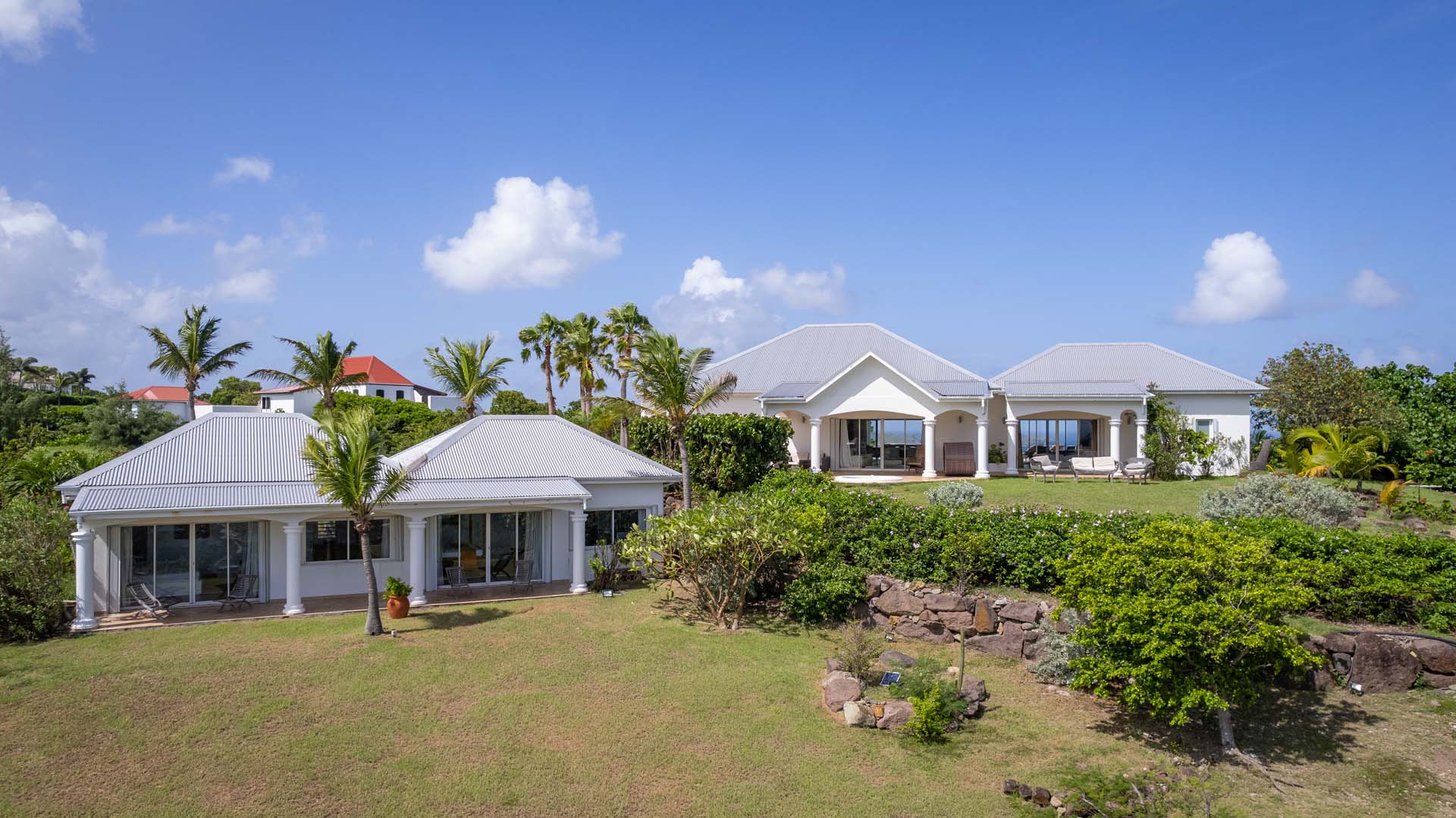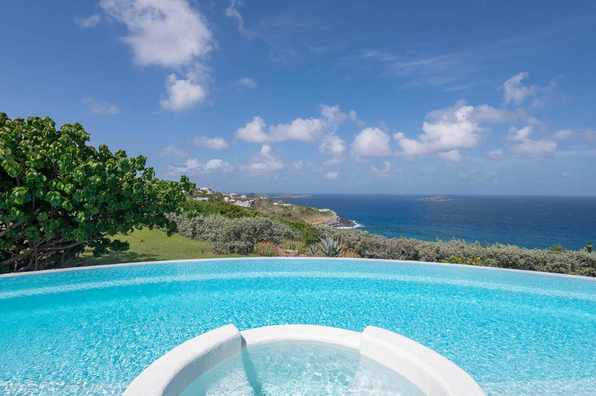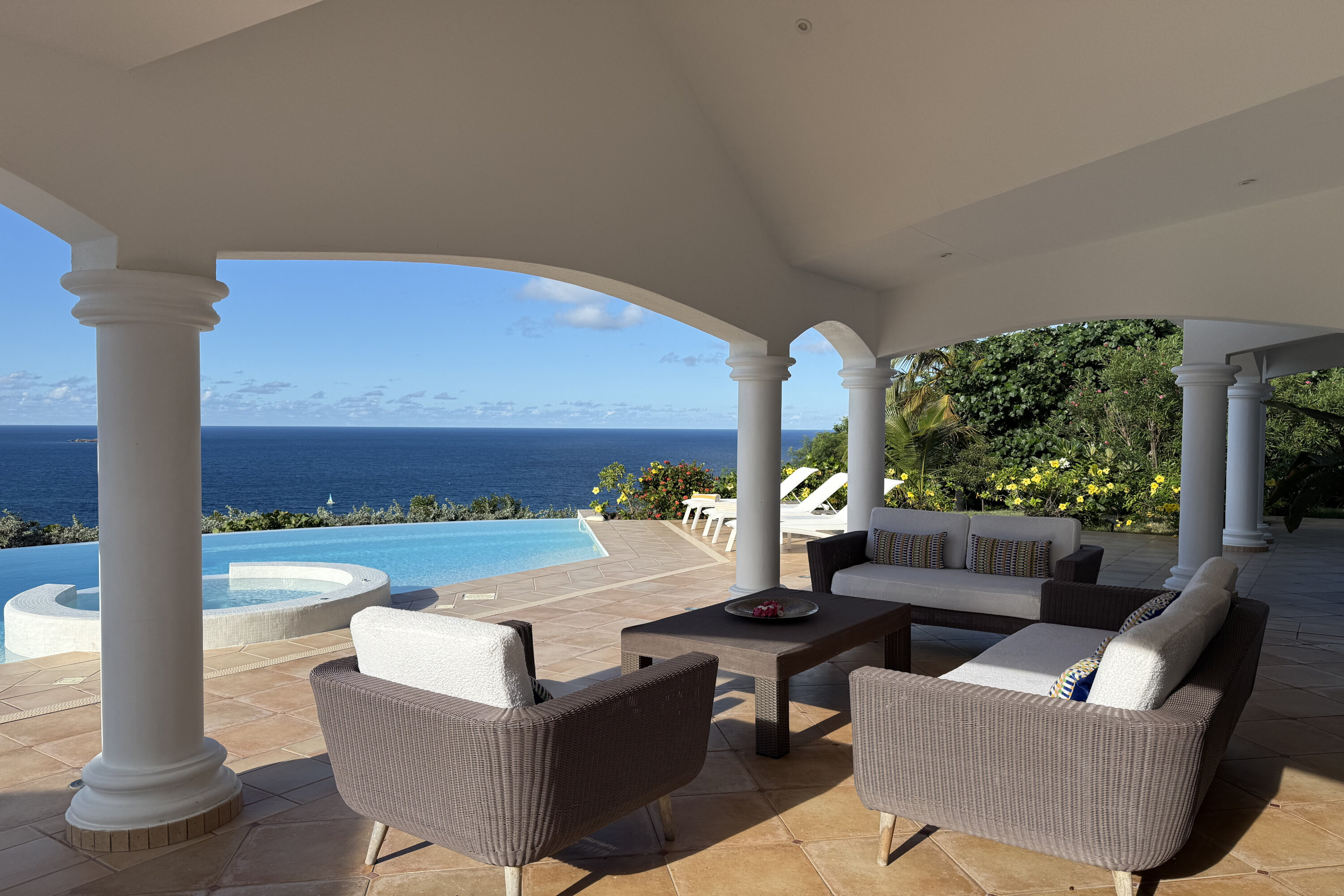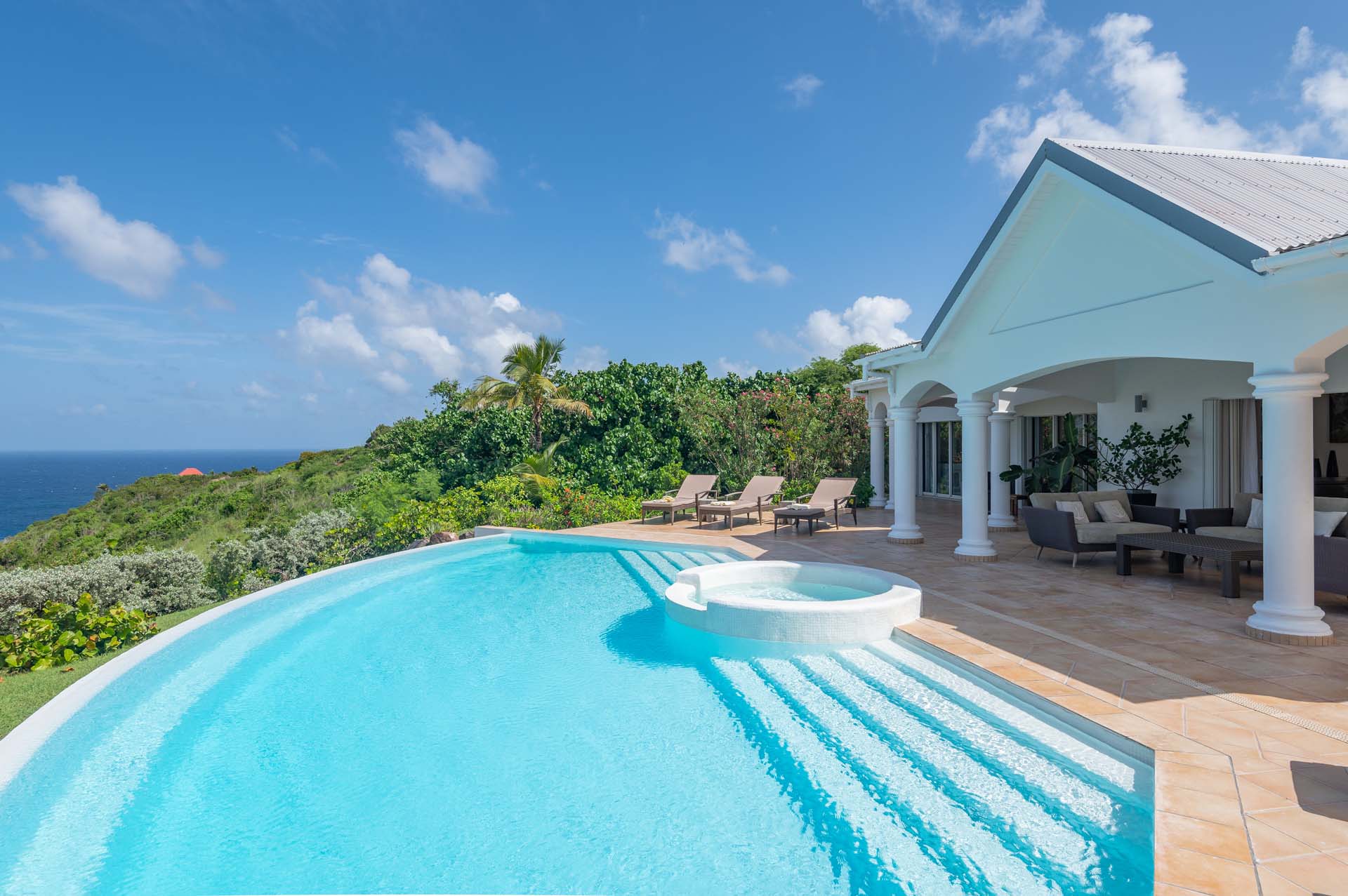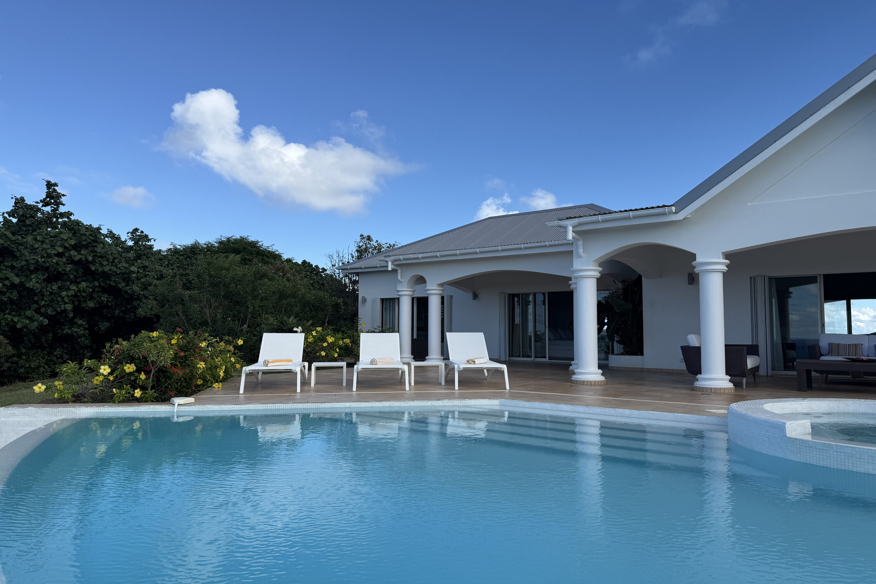 Welcome to Villa Sea Bird 19 (villa code: WV AHA), a stylish 3-bedroom villa located in the exclusive gated community of Mont Jean, St. Barts. This villa offers dramatic eastern and western views and is within minutes of several beaches and restaurants. Inside, open and airy interiors are awash with island charms. Natural light illuminates the stylish open-plan design and Indonesian-inspired décor. Cool terracotta tiles and artwork adorning the walls add pops of color and contrast with the earthy tones. Located on the Mont Jean peninsula, Villa Sea Bird 19 offers peerless privacy. The beaches at Marigot and Grand Cul-de-Sac are just a short drive away. Elegant shopping and dining await in St. Jean, 10 minutes away by car. The spacious main great room combines the living room, dining area, kitchen, and office. Vaulted ceilings give the entire room a breezy, open feel, while modern furniture adds a touch of luxurious beach chic. The living room has two plush sofas facing a large entertainment center with a TV. This is an ideal space to relax, whether it’s with a morning coffee or a movie night with family and friends. If you need to get some work done, the office has a desk and chair. The well-equipped kitchen at Villa Sea Bird 19 has everything you’ll need to create gourmet meals during your stay. Our concierge can even organize grocery pre-stocking or delivery, catered meals, or arrange private chef service for a special occasion. The indoor dining table is an excellent setting for elegant dinner parties, overlooking the ocean outside. The kitchen also opens out to a covered dining area, allowing you to pair your meal with the warm island air and stunning sunset. The 3 airy bedrooms at Villa Sea Bird 19 are private and peaceful, offering a relaxing area to relax and recharge each evening. The large master bedroom is connected to the living room, featuring a plush king-sized bed, TV, and ensuite bathroom. It also has stunning views out over both sides of the house, letting you wake up with views of the shimmering Caribbean. The guest bedrooms are in a separate cottage on the lower level. Each with a king-sized bed, TV, ensuite bathroom, and a private terrace overlooking Marigot Bay. Furnished terraces on both sides of Sea Bird 19 Villa offer exquisite views of the ocean, coastline, and undulating tropical hills of St. Barts. Comfortable lounges offer plenty of room to unwind, enjoy a good book, or kick back with a tropical cocktail and enjoy the island breeze. The swimming pool overlooks the ocean, a fabulous spot for a refreshing dip. Loungers lining the water let you sunbathe in the island rays, or even work poolside. There are two hot tubs, one located in the back of the villa facing Marigot, and one in the pool. A gas grill also encourages you to host cookouts, frying up some fresh fish or a succulent steak with a golden island sunset. There’s nothing like the sizzle of the grill combined with colorful hues of pink and purple shooting across the sky. Nearby, the beaches at Marigot Bay and Grand Cul-de-Sac are both around a 5-minute drive. World-class dining and shopping are available at St. Jean, 10 minutes away by car. During the Thanksgiving and December holidays, the villa rents at the full occupancy rate regardless of how many bedrooms are used.Please fill out the form to begin your inquiry and we will connect you with a seasoned villa rental specialist.