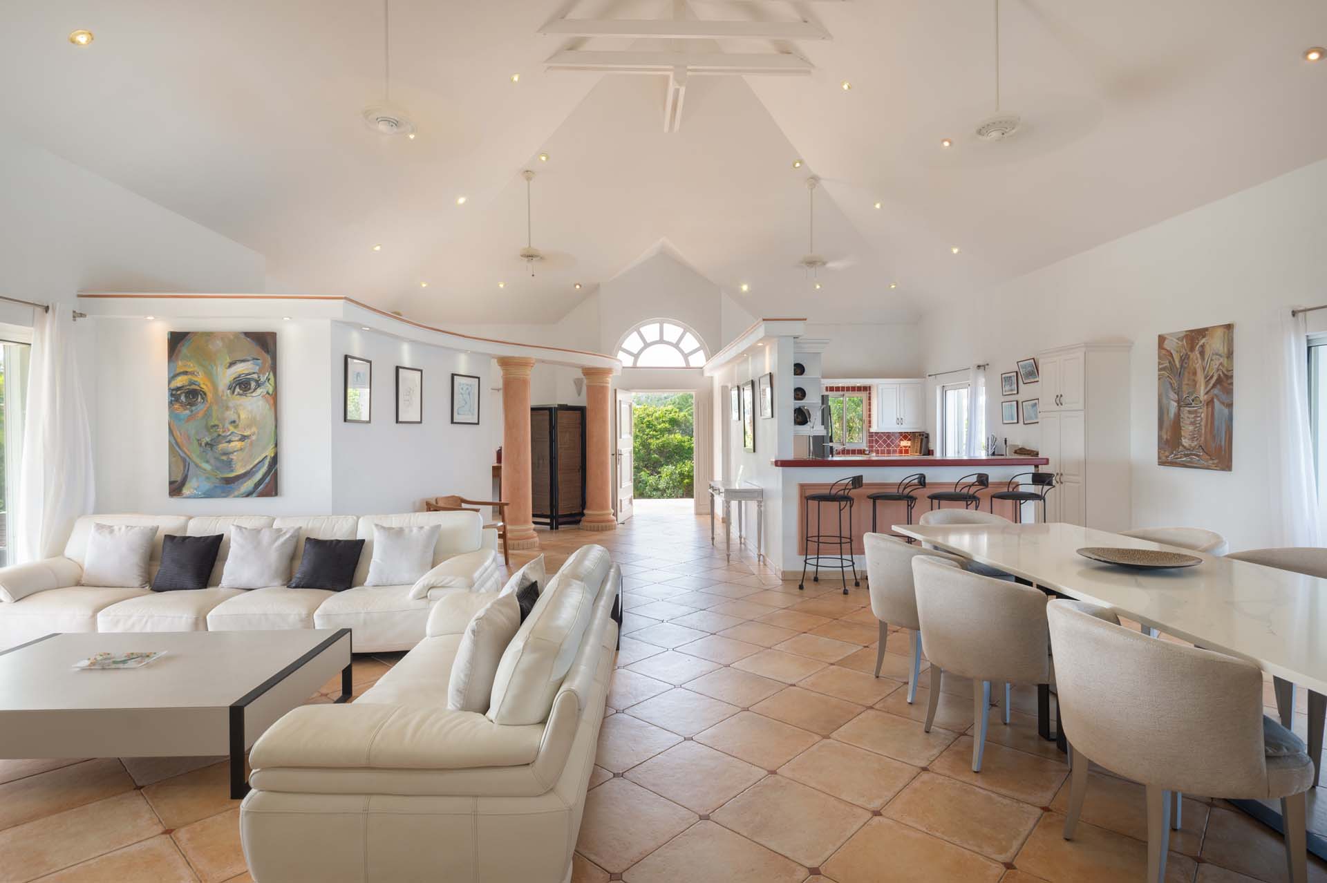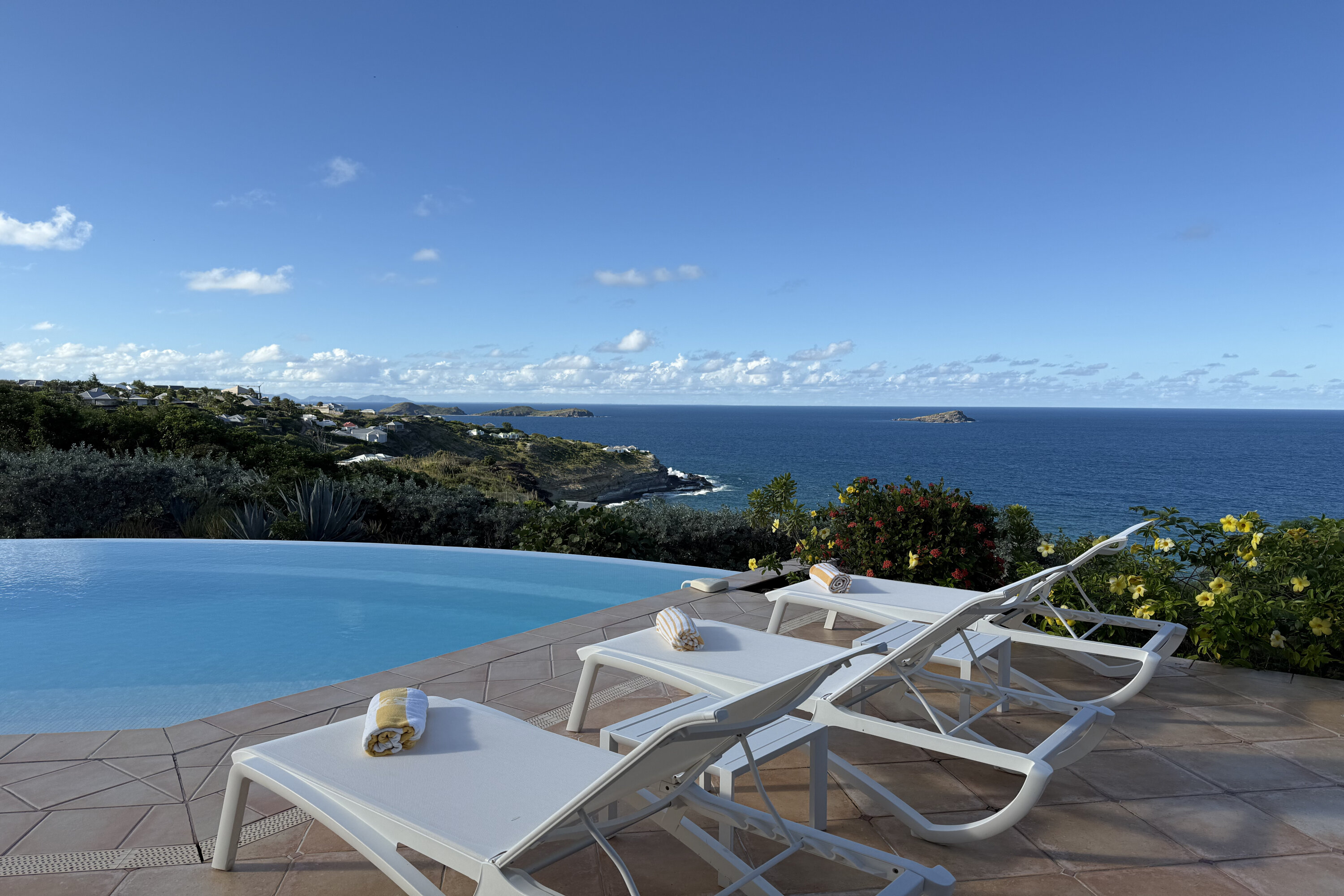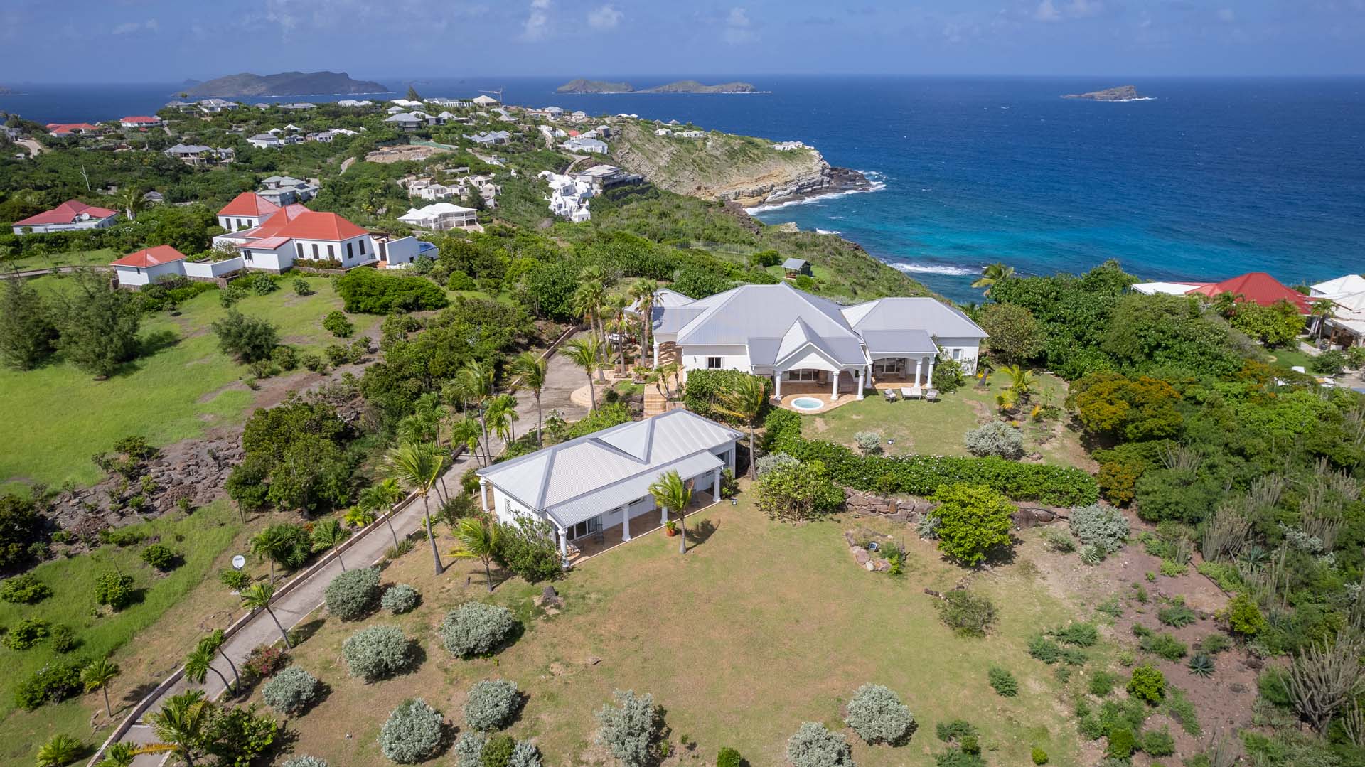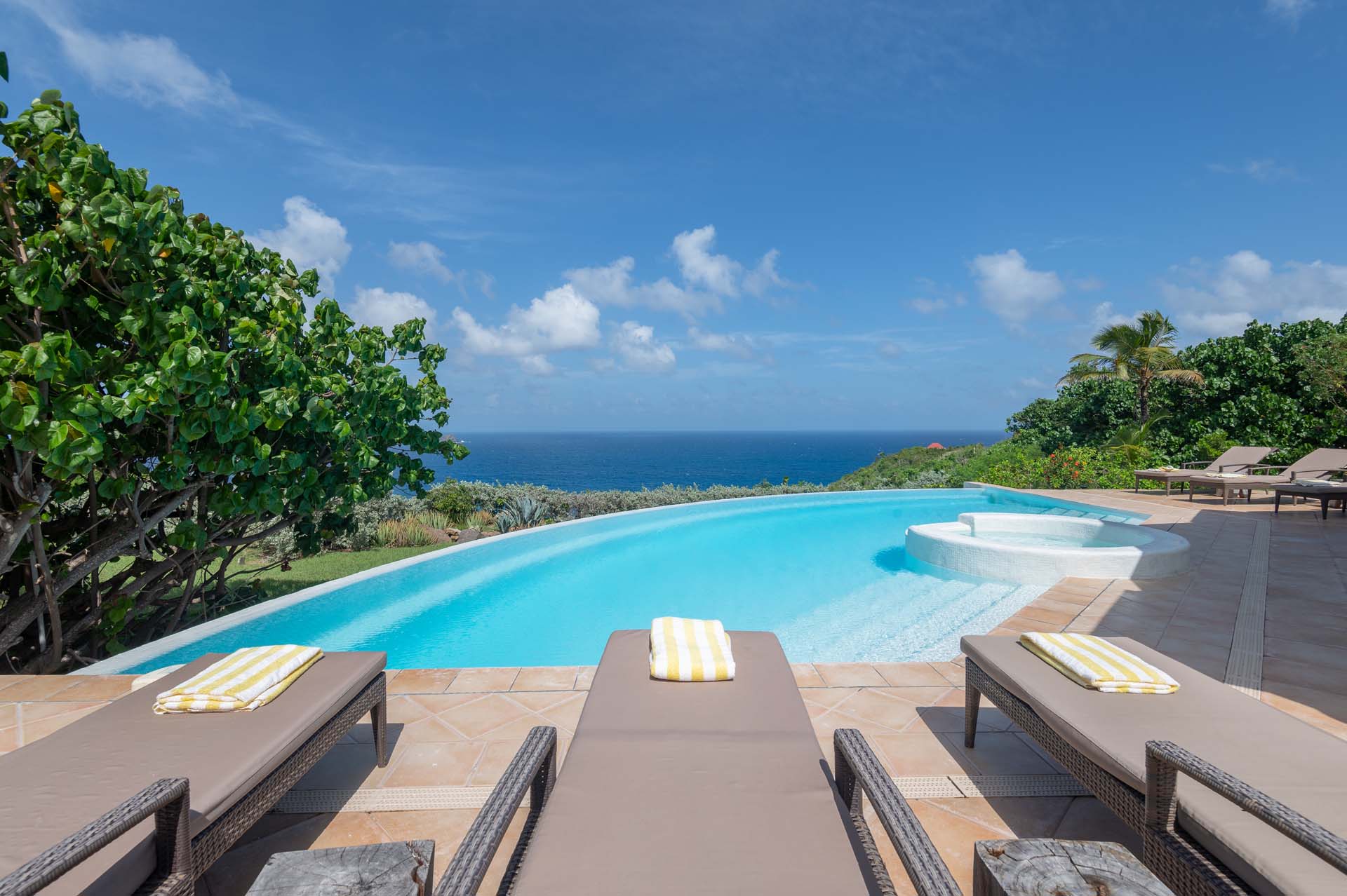 Welcome to Villa Sea Bird 19 (villa code: WV AHA), a stylish 3-bedroom villa located in the exclusive gated community of Mont Jean, St. Barts. This villa offers dramatic eastern and western views and is within minutes of several beaches and restaurants. Inside, open and airy interiors are awash with island charms. Natural light illuminates the stylish open-plan design and Indonesian-inspired décor. Cool terracotta tiles and artwork adorning the walls add pops of color and contrast with the earthy tones. Located on the Mont Jean peninsula, Villa Sea Bird 19 offers peerless privacy. The beaches at Marigot and Grand Cul-de-Sac are just a short drive away. Elegant shopping and dining await in St. Jean, 10 minutes away by car. The spacious main great room combines the living room, dining area, kitchen, and office. Vaulted ceilings give the entire room a breezy, open feel, while modern furniture adds a touch of luxurious beach chic. The living room has two plush sofas facing a large entertainment center with a TV. This is an ideal space to relax, whether it’s with a morning coffee or a movie night with family and friends. If you need to get some work done, the office has a desk and chair. The well-equipped kitchen at Villa Sea Bird 19 has everything you’ll need to create gourmet meals during your stay. Our concierge can even organize grocery pre-stocking or delivery, catered meals, or arrange private chef service for a special occasion. The indoor dining table is an excellent setting for elegant dinner parties, overlooking the ocean outside. The kitchen also opens out to a covered dining area, allowing you to pair your meal with the warm island air and stunning sunset. The 3 airy bedrooms at Villa Sea Bird 19 are private and peaceful, offering a relaxing area to relax and recharge each evening. The large master bedroom is connected to the living room, featuring a plush king-sized bed, TV, and ensuite bathroom. It also has stunning views out over both sides of the house, letting you wake up with views of the shimmering Caribbean. The guest bedrooms are in a separate cottage on the lower level. Each with a king-sized bed, TV, ensuite bathroom, and a private terrace overlooking Marigot Bay. Furnished terraces on both sides of Sea Bird 19 Villa offer exquisite views of the ocean, coastline, and undulating tropical hills of St. Barts. Comfortable lounges offer plenty of room to unwind, enjoy a good book, or kick back with a tropical cocktail and enjoy the island breeze. The swimming pool overlooks the ocean, a fabulous spot for a refreshing dip. Loungers lining the water let you sunbathe in the island rays, or even work poolside. There are two hot tubs, one located in the back of the villa facing Marigot, and one in the pool. A gas grill also encourages you to host cookouts, frying up some fresh fish or a succulent steak with a golden island sunset. There’s nothing like the sizzle of the grill combined with colorful hues of pink and purple shooting across the sky. Nearby, the beaches at Marigot Bay and Grand Cul-de-Sac are both around a 5-minute drive. World-class dining and shopping are available at St. Jean, 10 minutes away by car. During the Thanksgiving and December holidays, the villa rents at the full occupancy rate regardless of how many bedrooms are used.Please fill out the form to begin your inquiry and we will connect you with a seasoned villa rental specialist.