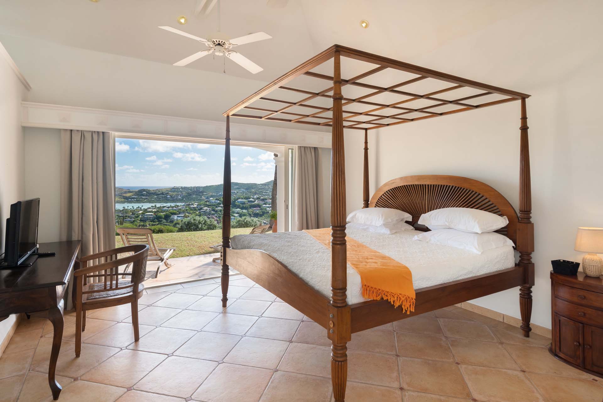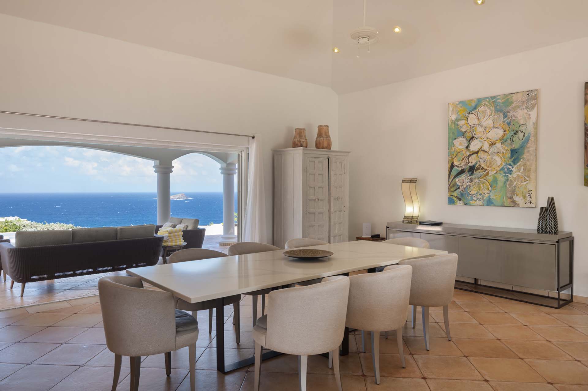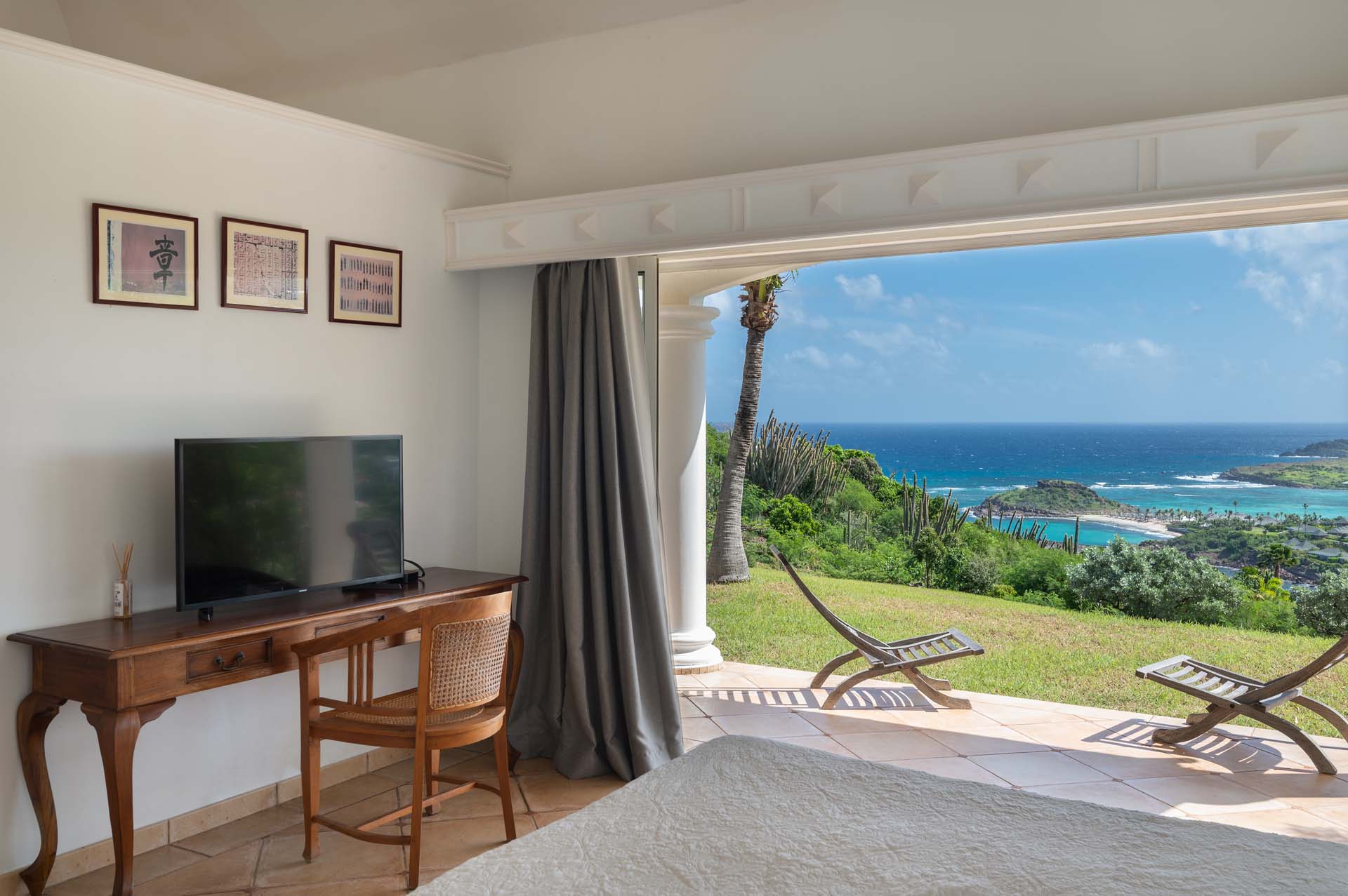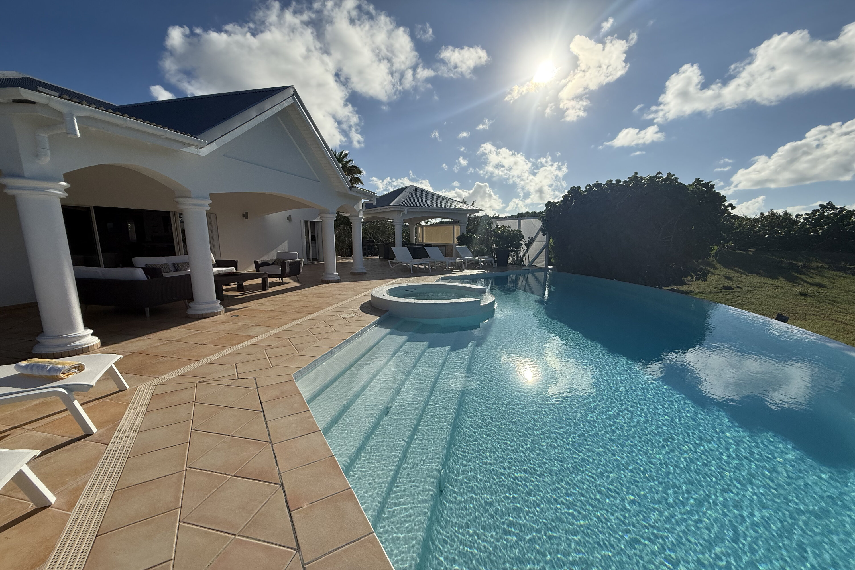 Welcome to Villa Sea Bird 19 (villa code: WV AHA), a stylish 3-bedroom villa located in the exclusive gated community of Mont Jean, St. Barts. This villa offers dramatic eastern and western views and is within minutes of several beaches and restaurants. Inside, open and airy interiors are awash with island charms. Natural light illuminates the stylish open-plan design and Indonesian-inspired décor. Cool terracotta tiles and artwork adorning the walls add pops of color and contrast with the earthy tones. Located on the Mont Jean peninsula, Villa Sea Bird 19 offers peerless privacy. The beaches at Marigot and Grand Cul-de-Sac are just a short drive away. Elegant shopping and dining await in St. Jean, 10 minutes away by car. The spacious main great room combines the living room, dining area, kitchen, and office. Vaulted ceilings give the entire room a breezy, open feel, while modern furniture adds a touch of luxurious beach chic. The living room has two plush sofas facing a large entertainment center with a TV. This is an ideal space to relax, whether it’s with a morning coffee or a movie night with family and friends. If you need to get some work done, the office has a desk and chair. The well-equipped kitchen at Villa Sea Bird 19 has everything you’ll need to create gourmet meals during your stay. Our concierge can even organize grocery pre-stocking or delivery, catered meals, or arrange private chef service for a special occasion. The indoor dining table is an excellent setting for elegant dinner parties, overlooking the ocean outside. The kitchen also opens out to a covered dining area, allowing you to pair your meal with the warm island air and stunning sunset. The 3 airy bedrooms at Villa Sea Bird 19 are private and peaceful, offering a relaxing area to relax and recharge each evening. The large master bedroom is connected to the living room, featuring a plush king-sized bed, TV, and ensuite bathroom. It also has stunning views out over both sides of the house, letting you wake up with views of the shimmering Caribbean. The guest bedrooms are in a separate cottage on the lower level. Each with a king-sized bed, TV, ensuite bathroom, and a private terrace overlooking Marigot Bay. Furnished terraces on both sides of Sea Bird 19 Villa offer exquisite views of the ocean, coastline, and undulating tropical hills of St. Barts. Comfortable lounges offer plenty of room to unwind, enjoy a good book, or kick back with a tropical cocktail and enjoy the island breeze. The swimming pool overlooks the ocean, a fabulous spot for a refreshing dip. Loungers lining the water let you sunbathe in the island rays, or even work poolside. There are two hot tubs, one located in the back of the villa facing Marigot, and one in the pool. A gas grill also encourages you to host cookouts, frying up some fresh fish or a succulent steak with a golden island sunset. There’s nothing like the sizzle of the grill combined with colorful hues of pink and purple shooting across the sky. Nearby, the beaches at Marigot Bay and Grand Cul-de-Sac are both around a 5-minute drive. World-class dining and shopping are available at St. Jean, 10 minutes away by car. During the Thanksgiving and December holidays, the villa rents at the full occupancy rate regardless of how many bedrooms are used.Please fill out the form to begin your inquiry and we will connect you with a seasoned villa rental specialist.