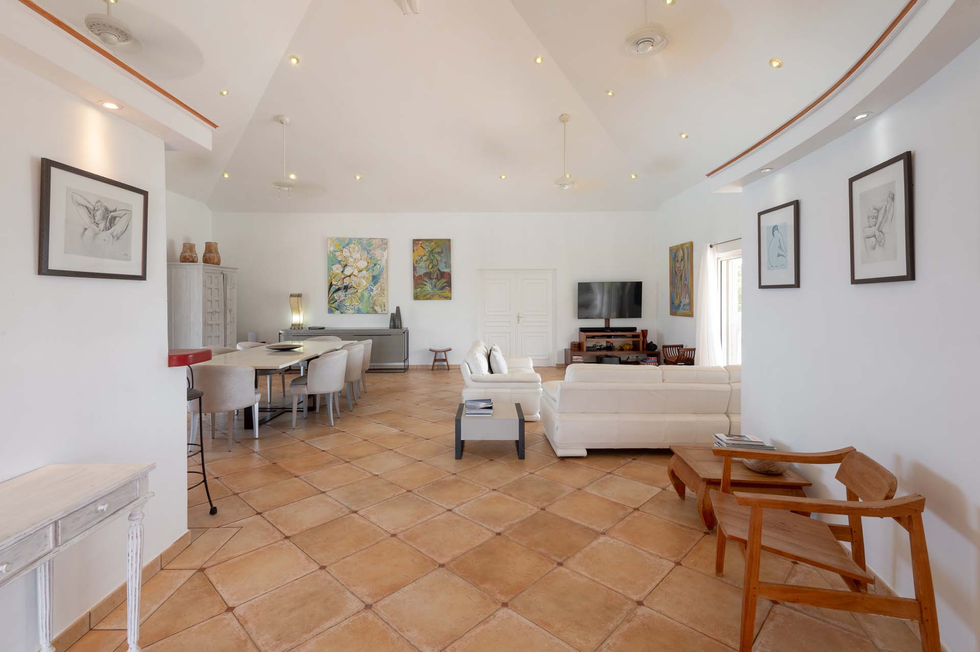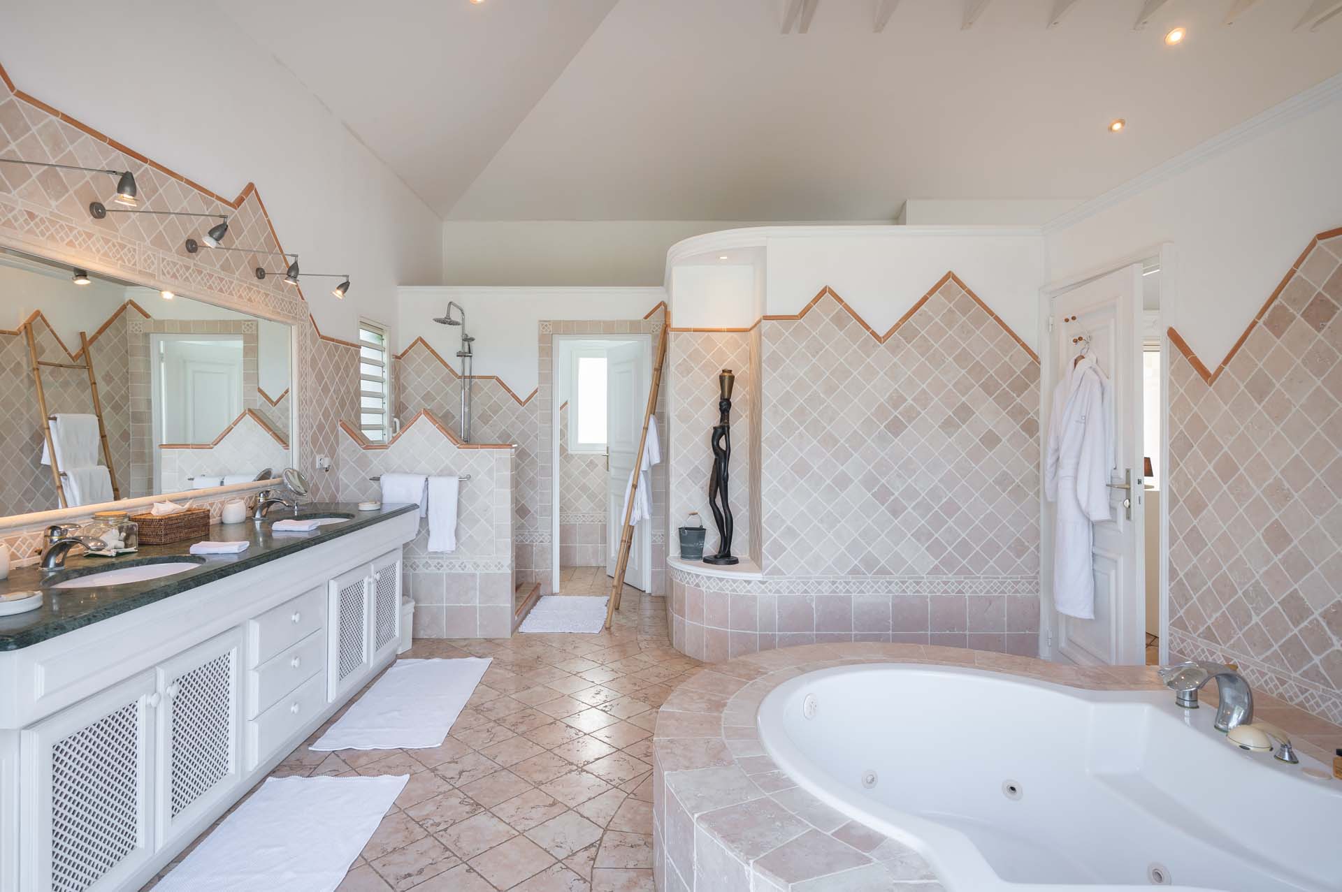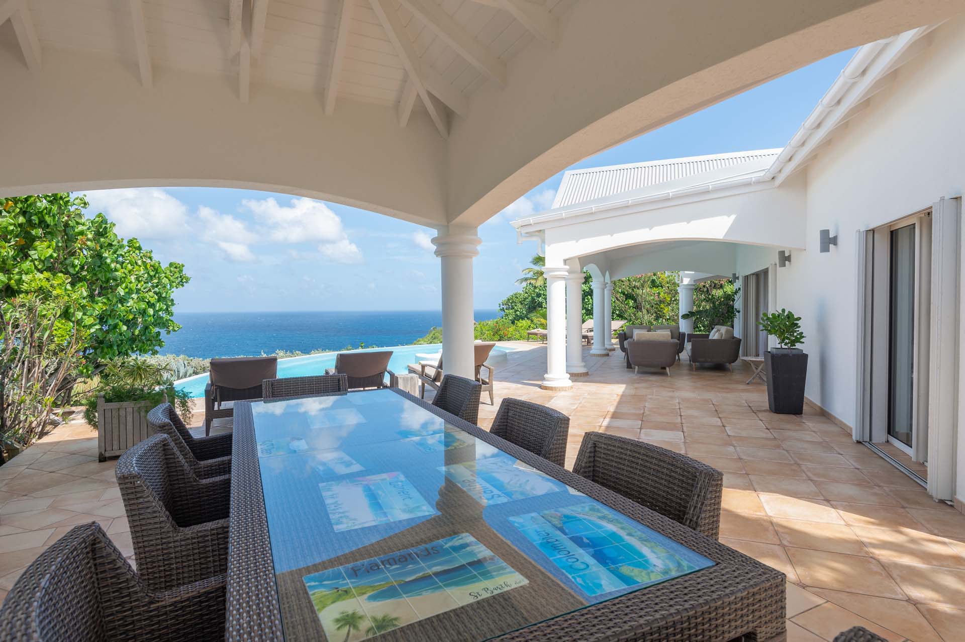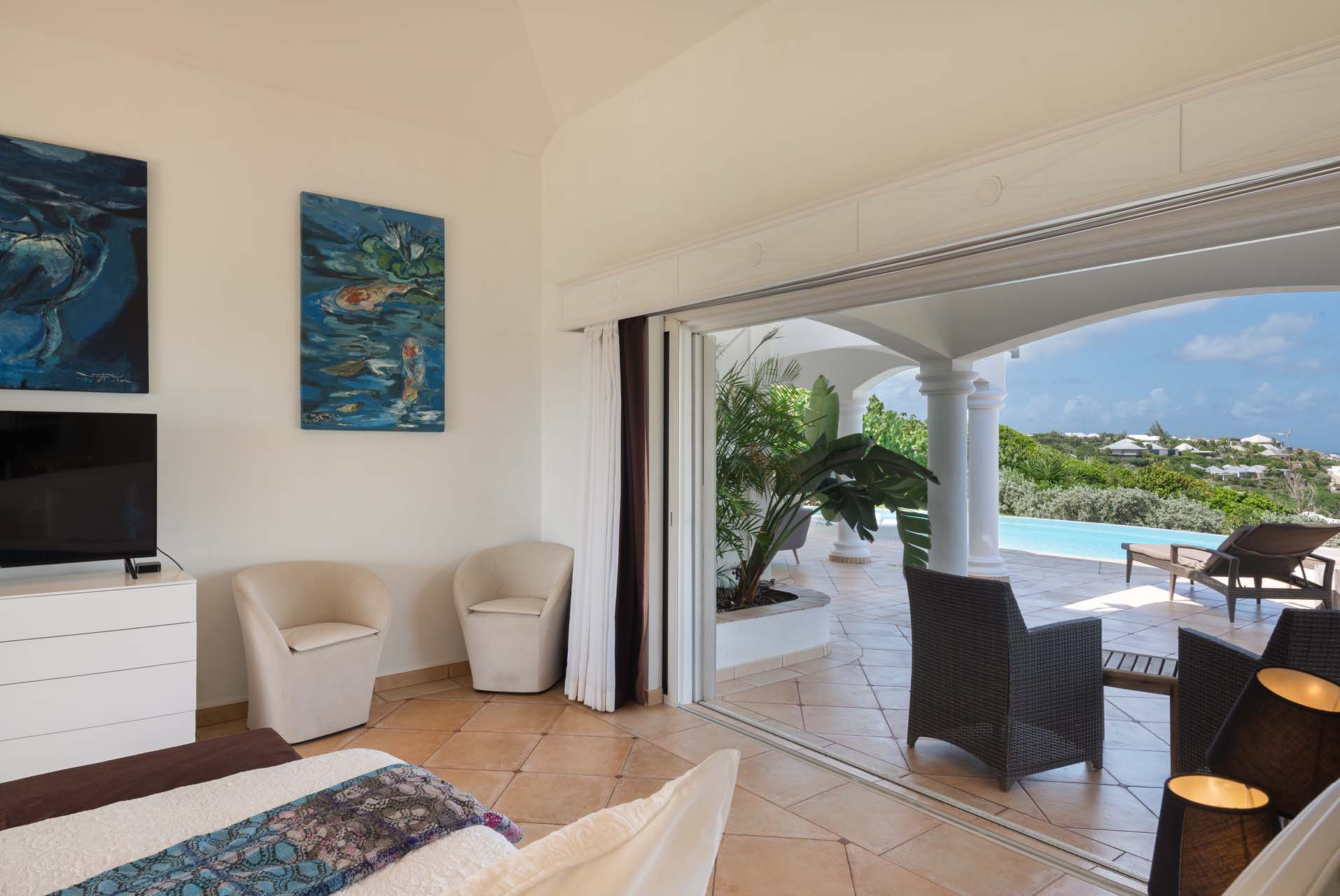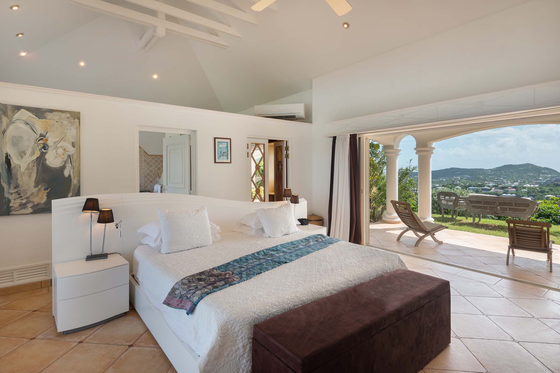 Welcome to Villa Sea Bird 19 (villa code: WV AHA), a stylish 3-bedroom villa located in the exclusive gated community of Mont Jean, St. Barts. This villa offers dramatic eastern and western views and is within minutes of several beaches and restaurants. Inside, open and airy interiors are awash with island charms. Natural light illuminates the stylish open-plan design and Indonesian-inspired décor. Cool terracotta tiles and artwork adorning the walls add pops of color and contrast with the earthy tones. Located on the Mont Jean peninsula, Villa Sea Bird 19 offers peerless privacy. The beaches at Marigot and Grand Cul-de-Sac are just a short drive away. Elegant shopping and dining await in St. Jean, 10 minutes away by car. The spacious main great room combines the living room, dining area, kitchen, and office. Vaulted ceilings give the entire room a breezy, open feel, while modern furniture adds a touch of luxurious beach chic. The living room has two plush sofas facing a large entertainment center with a TV. This is an ideal space to relax, whether it’s with a morning coffee or a movie night with family and friends. If you need to get some work done, the office has a desk and chair. The well-equipped kitchen at Villa Sea Bird 19 has everything you’ll need to create gourmet meals during your stay. Our concierge can even organize grocery pre-stocking or delivery, catered meals, or arrange private chef service for a special occasion. The indoor dining table is an excellent setting for elegant dinner parties, overlooking the ocean outside. The kitchen also opens out to a covered dining area, allowing you to pair your meal with the warm island air and stunning sunset. The 3 airy bedrooms at Villa Sea Bird 19 are private and peaceful, offering a relaxing area to relax and recharge each evening. The large master bedroom is connected to the living room, featuring a plush king-sized bed, TV, and ensuite bathroom. It also has stunning views out over both sides of the house, letting you wake up with views of the shimmering Caribbean. The guest bedrooms are in a separate cottage on the lower level. Each with a king-sized bed, TV, ensuite bathroom, and a private terrace overlooking Marigot Bay. Furnished terraces on both sides of Sea Bird 19 Villa offer exquisite views of the ocean, coastline, and undulating tropical hills of St. Barts. Comfortable lounges offer plenty of room to unwind, enjoy a good book, or kick back with a tropical cocktail and enjoy the island breeze. The swimming pool overlooks the ocean, a fabulous spot for a refreshing dip. Loungers lining the water let you sunbathe in the island rays, or even work poolside. There are two hot tubs, one located in the back of the villa facing Marigot, and one in the pool. A gas grill also encourages you to host cookouts, frying up some fresh fish or a succulent steak with a golden island sunset. There’s nothing like the sizzle of the grill combined with colorful hues of pink and purple shooting across the sky. Nearby, the beaches at Marigot Bay and Grand Cul-de-Sac are both around a 5-minute drive. World-class dining and shopping are available at St. Jean, 10 minutes away by car. During the Thanksgiving and December holidays, the villa rents at the full occupancy rate regardless of how many bedrooms are used.Please fill out the form to begin your inquiry and we will connect you with a seasoned villa rental specialist.