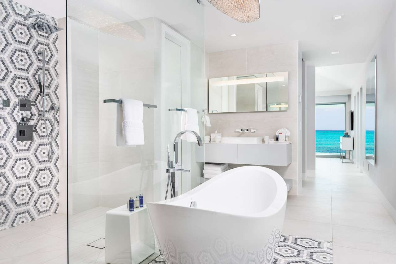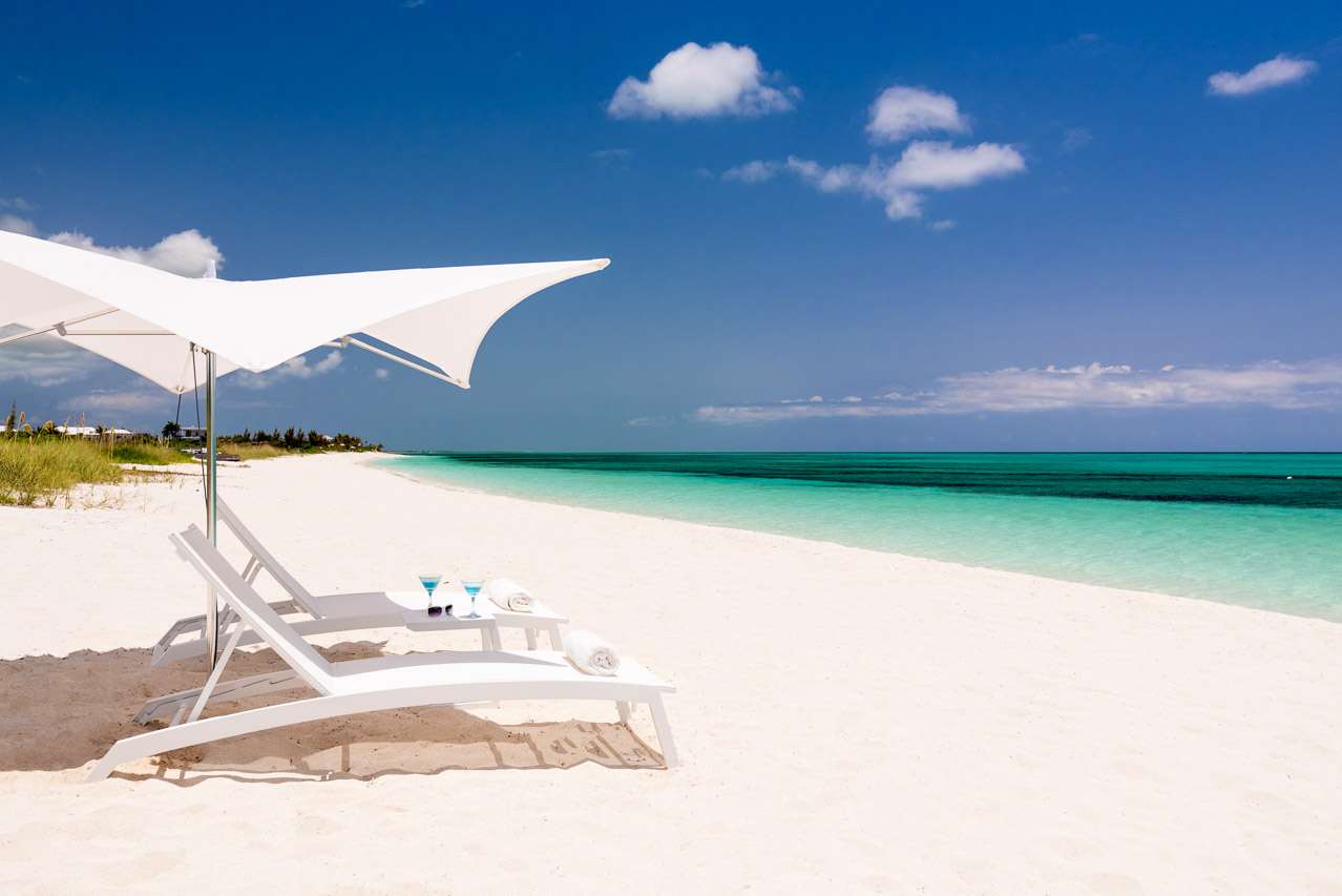 Sun loungers scattered both in and outside of the water all face towards the ocean, framed by swaying palm trees. The sparkling sea will no doubt tempt you; Grace Bay beach is one of the prettiest beaches in the world. Once you experience the soft white sand and cool turquoise waters for yourself, we think you’ll agree.