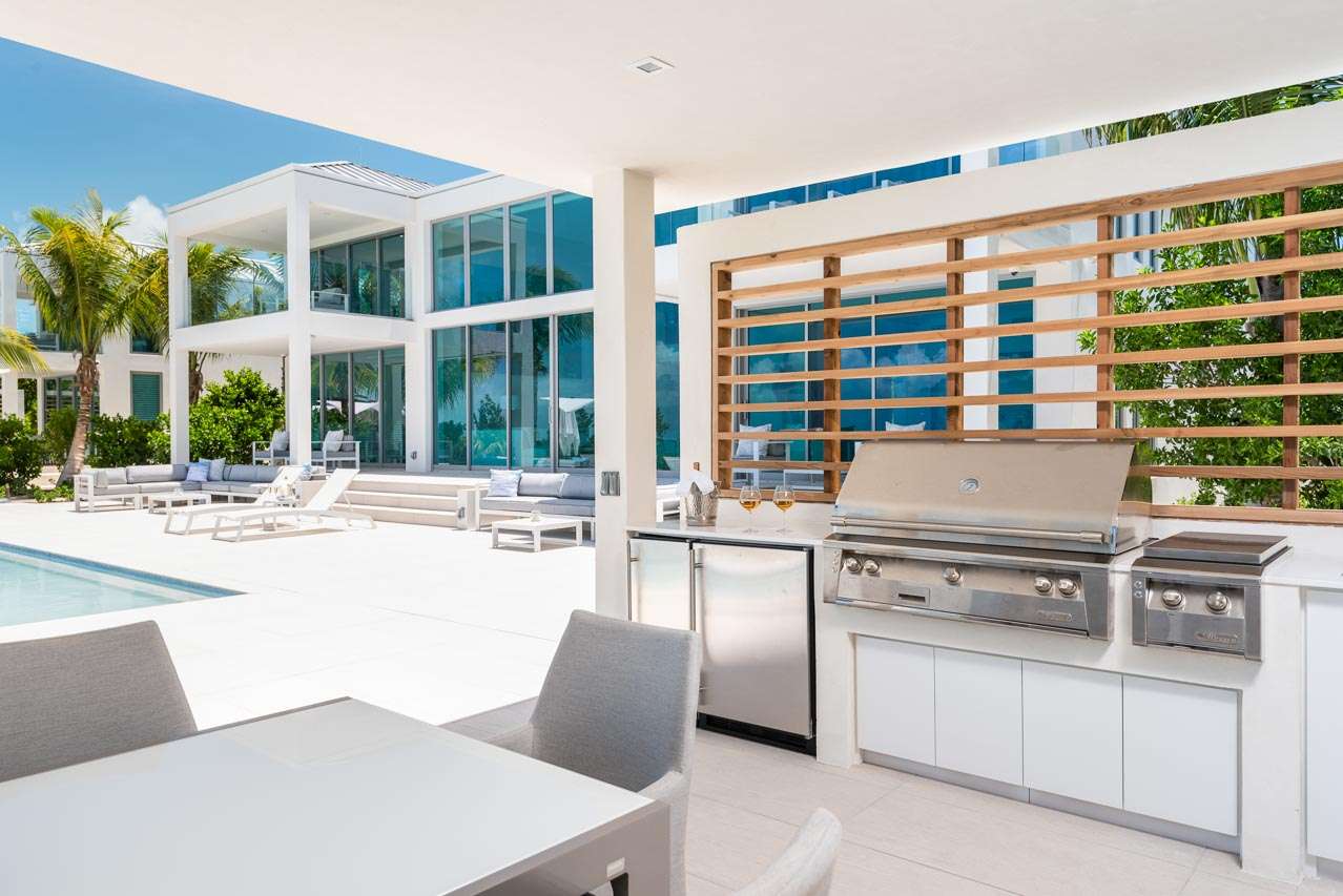 The outdoor living space at Villa Seaclusion is nothing short of breathtaking. The grand infinity pool takes center stage, a magnificent spot to cool off with a refreshing dip or lounge in the shallows with a glass of champagne.
