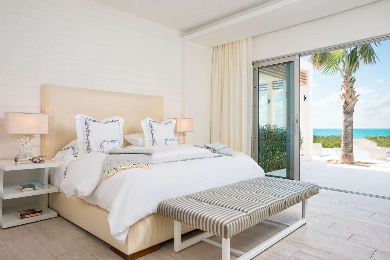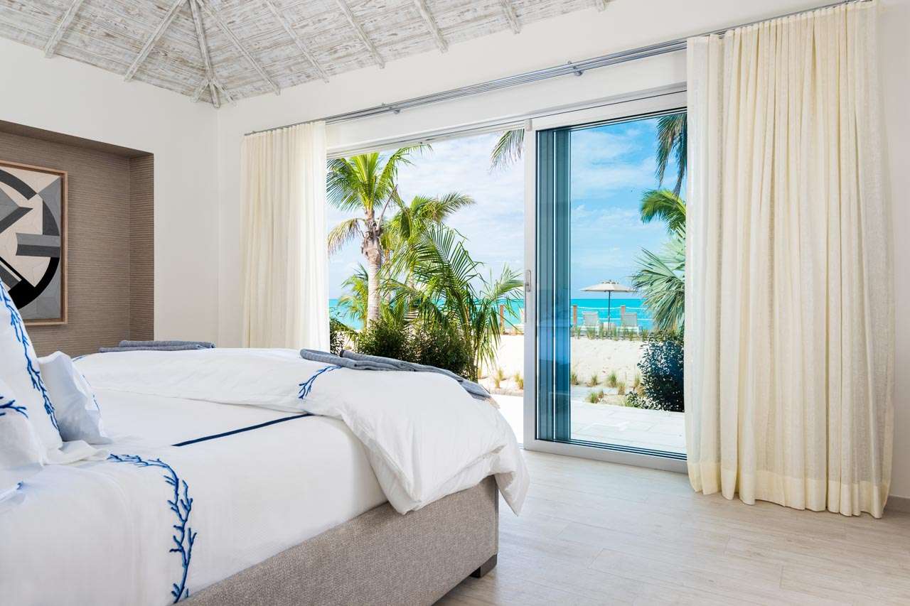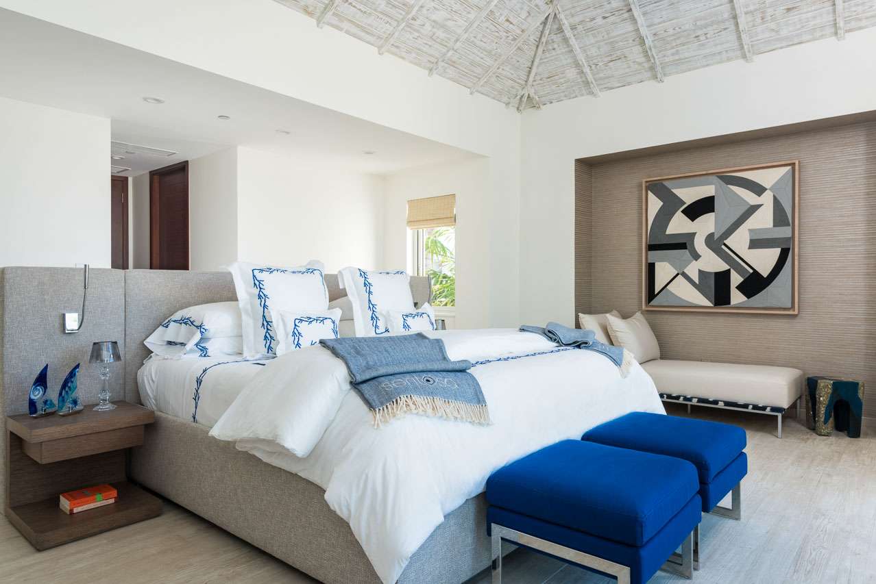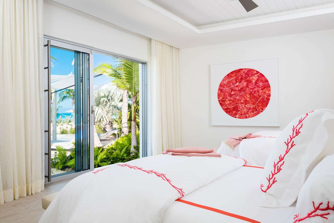 There are 8 fabulous bedrooms at Villa Sentosa, all of them with ensuite bathrooms and featuring a striking piece of art that sets the theme for each room. The curved construction of the villa allows each room a wonderful vista of the stunning Grace Bay Beach.