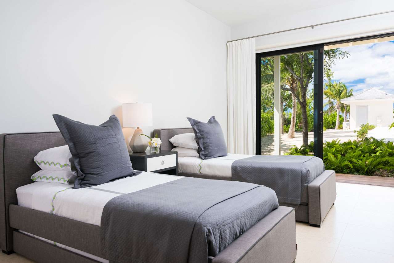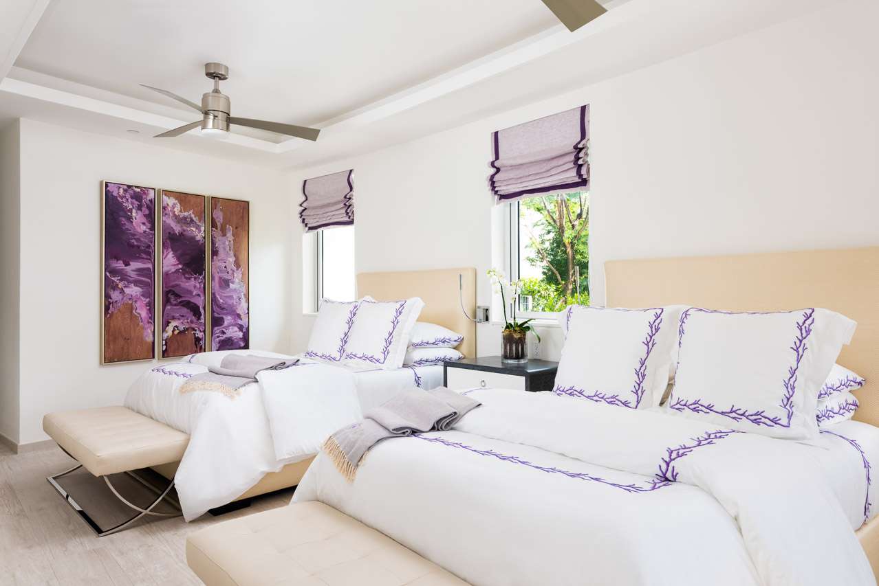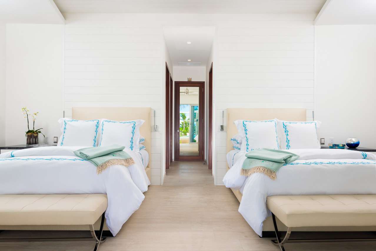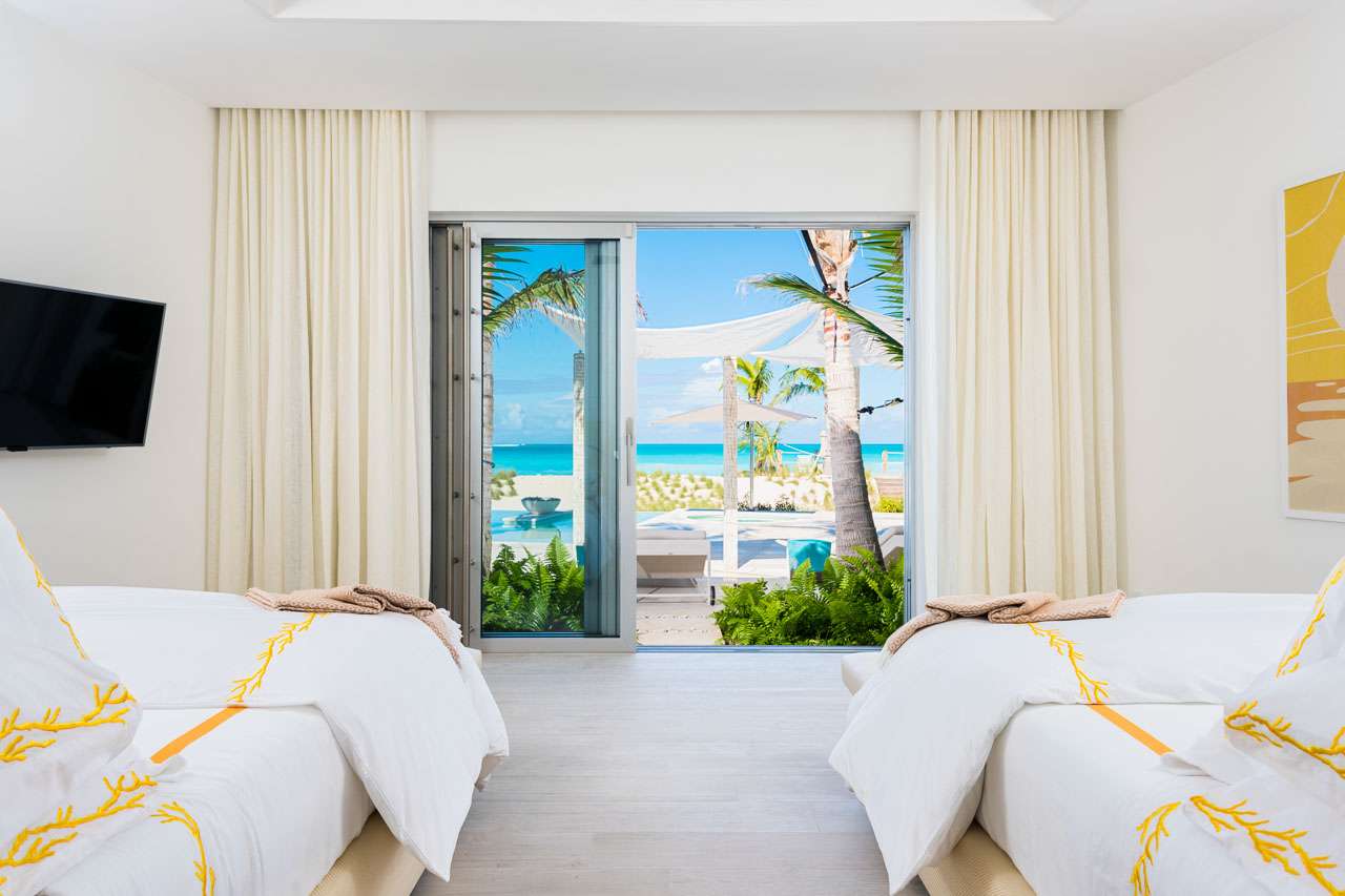 There are 8 fabulous bedrooms at Villa Sentosa, all of them with ensuite bathrooms and featuring a striking piece of art that sets the theme for each room. The curved construction of the villa allows each room a wonderful vista of the stunning Grace Bay Beach.