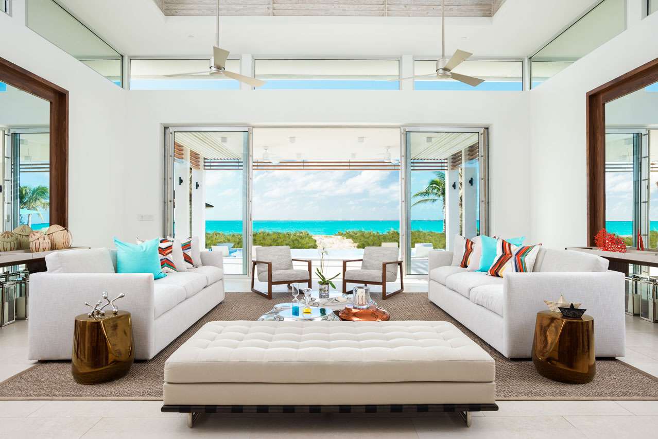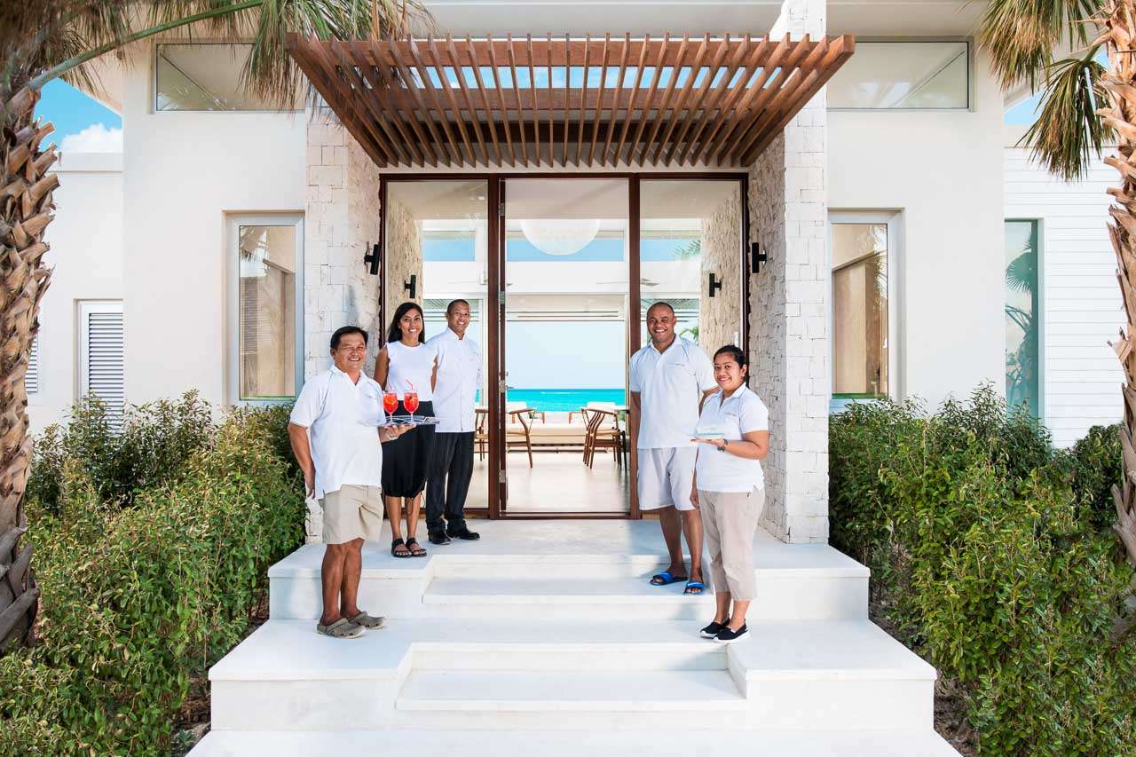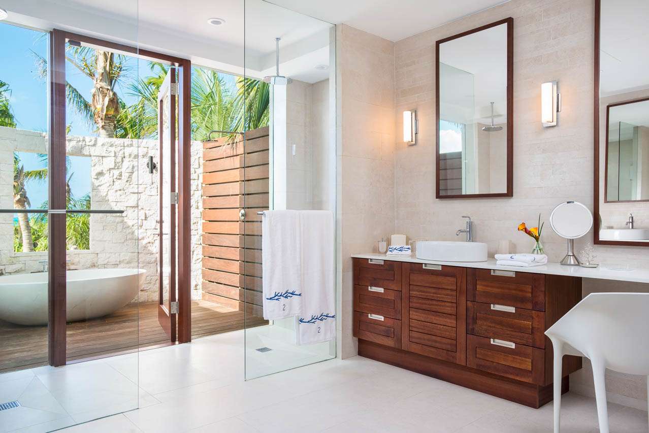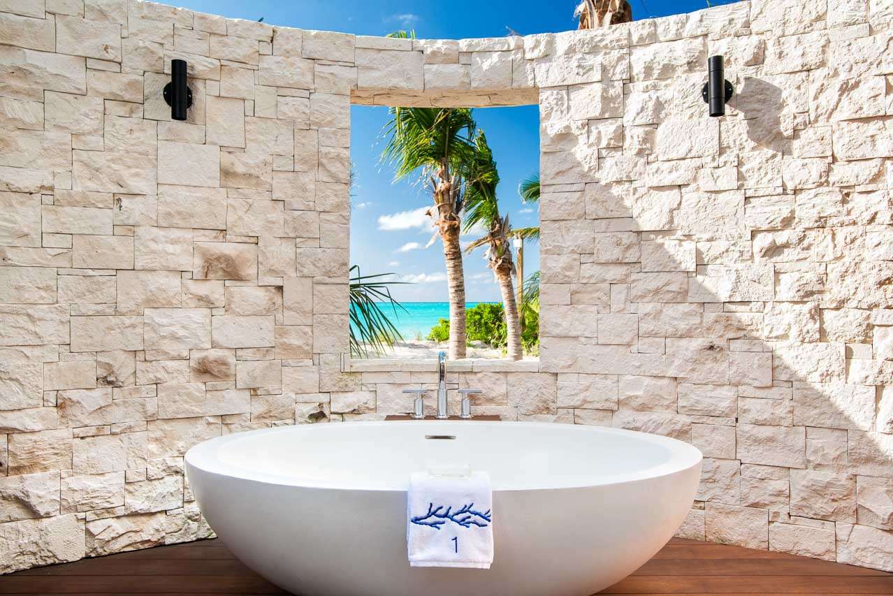 There are 8 fabulous bedrooms at Villa Sentosa, all of them with ensuite bathrooms and featuring a striking piece of art that sets the theme for each room. The curved construction of the villa allows each room a wonderful vista of the stunning Grace Bay Beach.