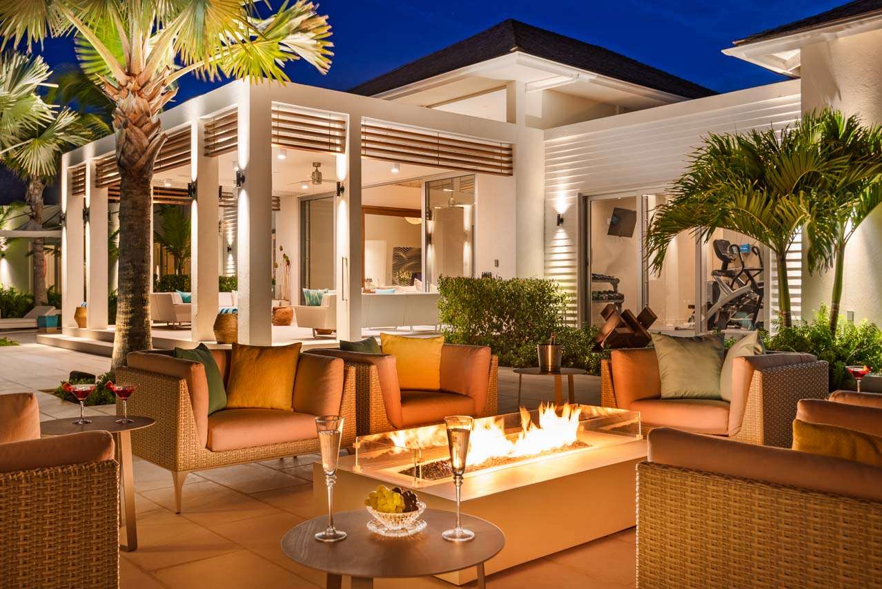 As night falls, enjoy the starlight glinting off the water from the comfort of the hot tub or a comfortable lounge surrounding a fire pit is a perfect spot for late-night island soirees.