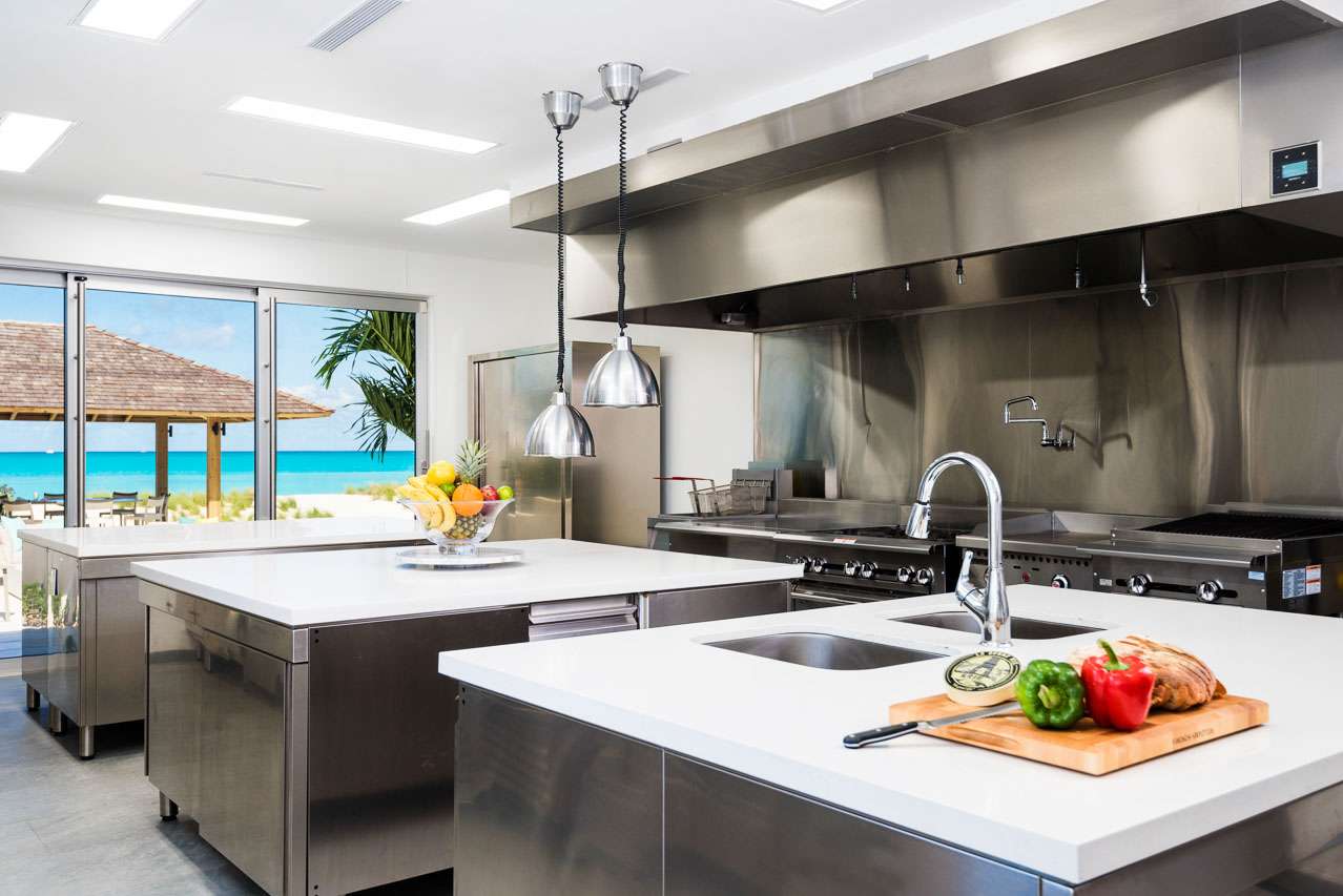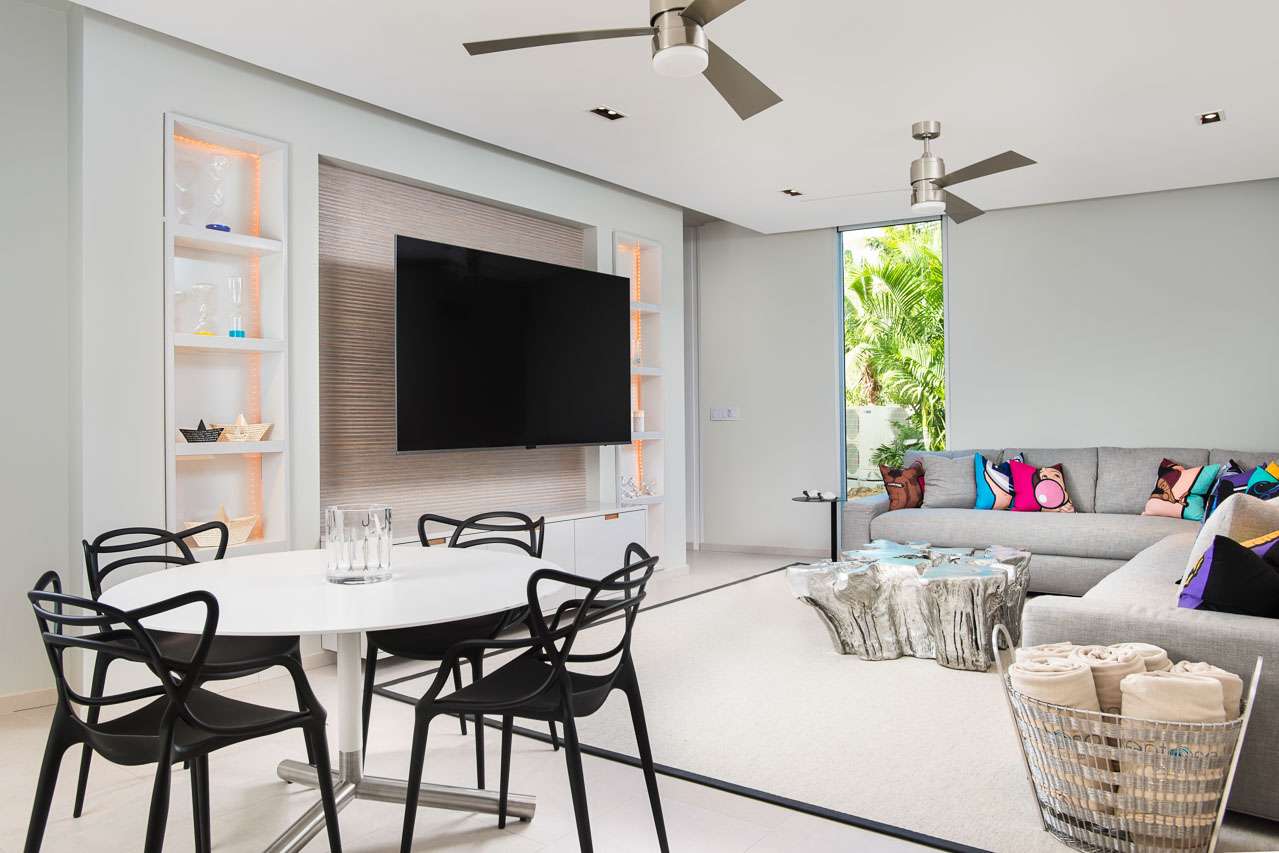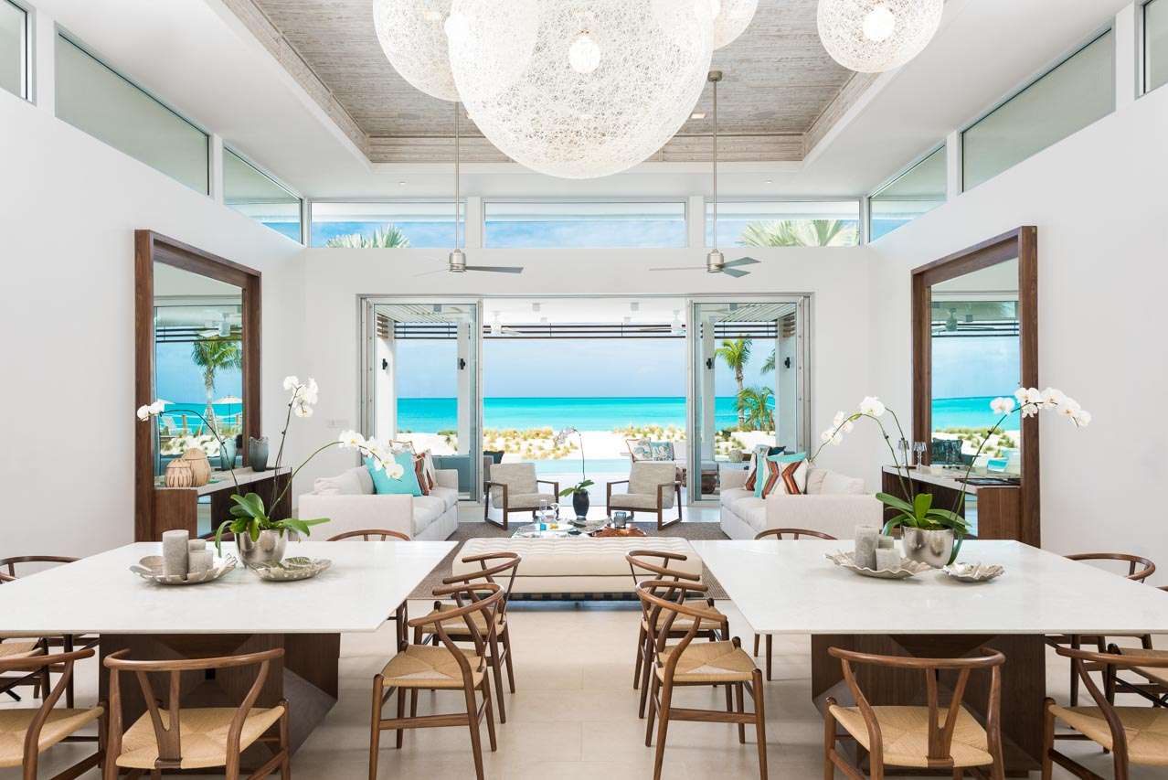 The indoor dining area has two tables, seating a total of 16 guests. With an eye-catching light fixture hovering above, it’s an elegant spot to enjoy a festive dinner party, feasting on the fresh flavors of the Caribbean.