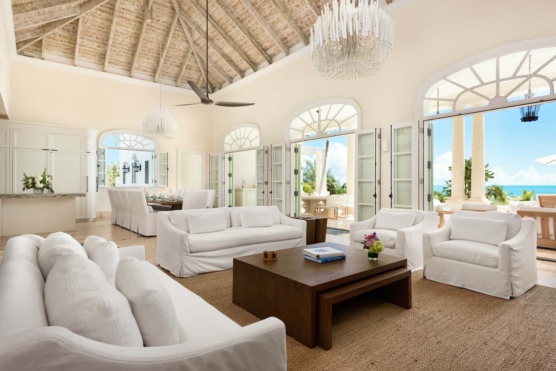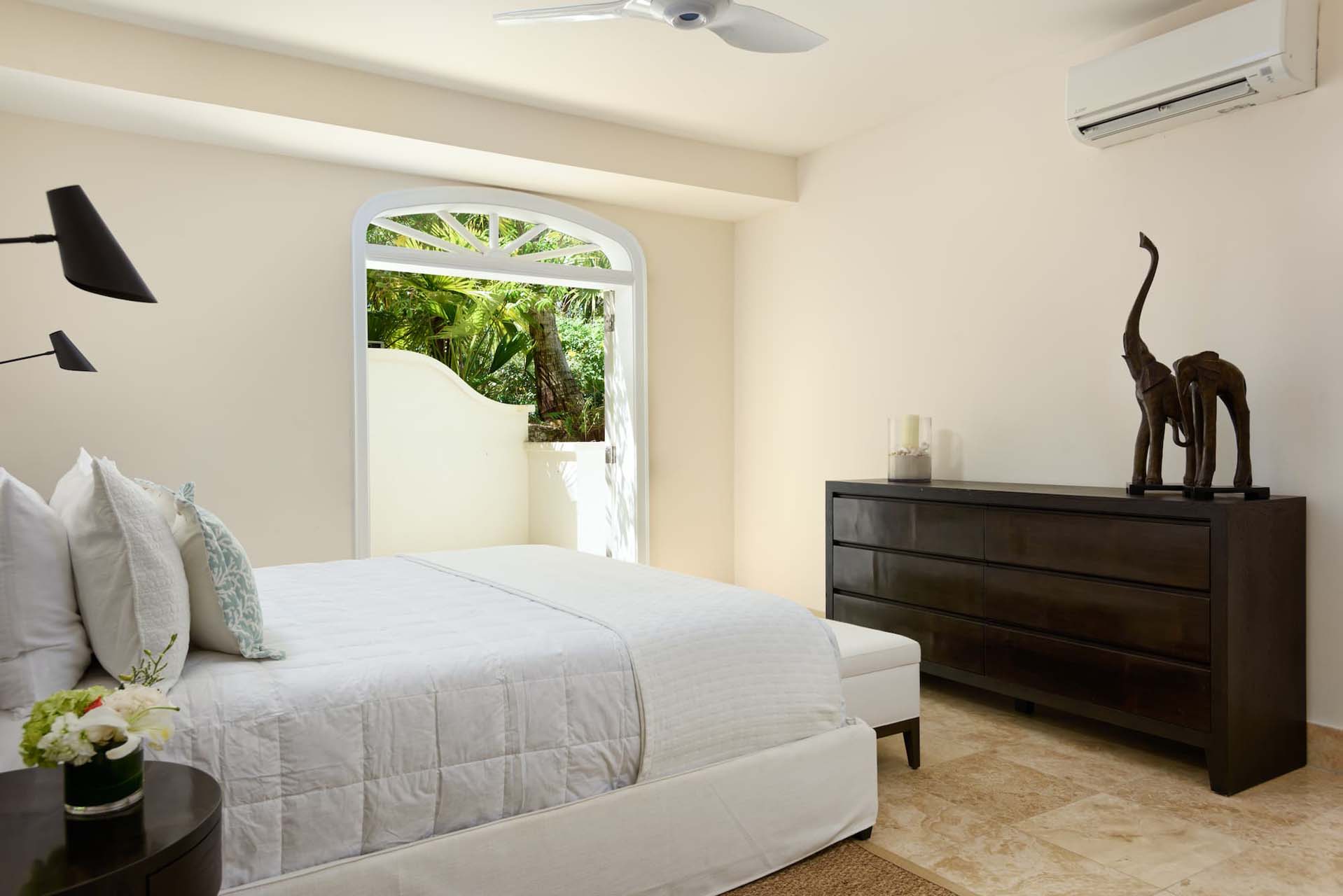 The main house, boasting five bedrooms and spanning 7,300 square feet, showcases quintessential Barbadian architecture, with intimate enclaves seamlessly connected by inviting open-air Tuscan galleries. At its core lies a grand great room adorned with alabaster walls, timeless furnishings, and magnificent arched French doors leading to a hand-painted cathedral-style ceiling. A formal dining area, accommodating ten guests, overlooks breathtaking ocean panoramas, while a cozy nook offers plush seating, entertainment options, and relaxation.