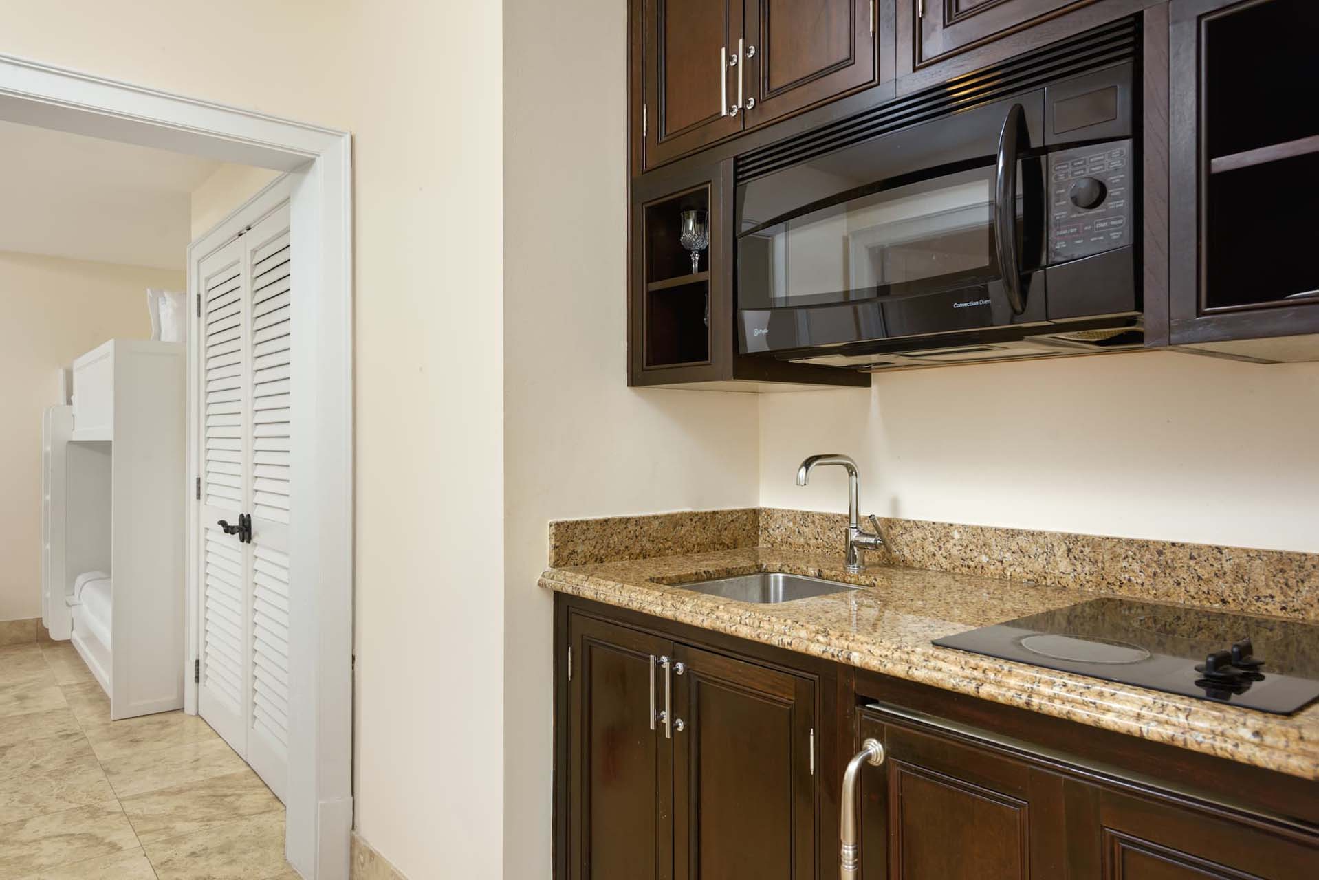 The chef's kitchen is a culinary haven, featuring top-of-the-line appliances, granite countertops, marble backsplashes, and bespoke Guatambu hardwood cabinetry from Argentina.