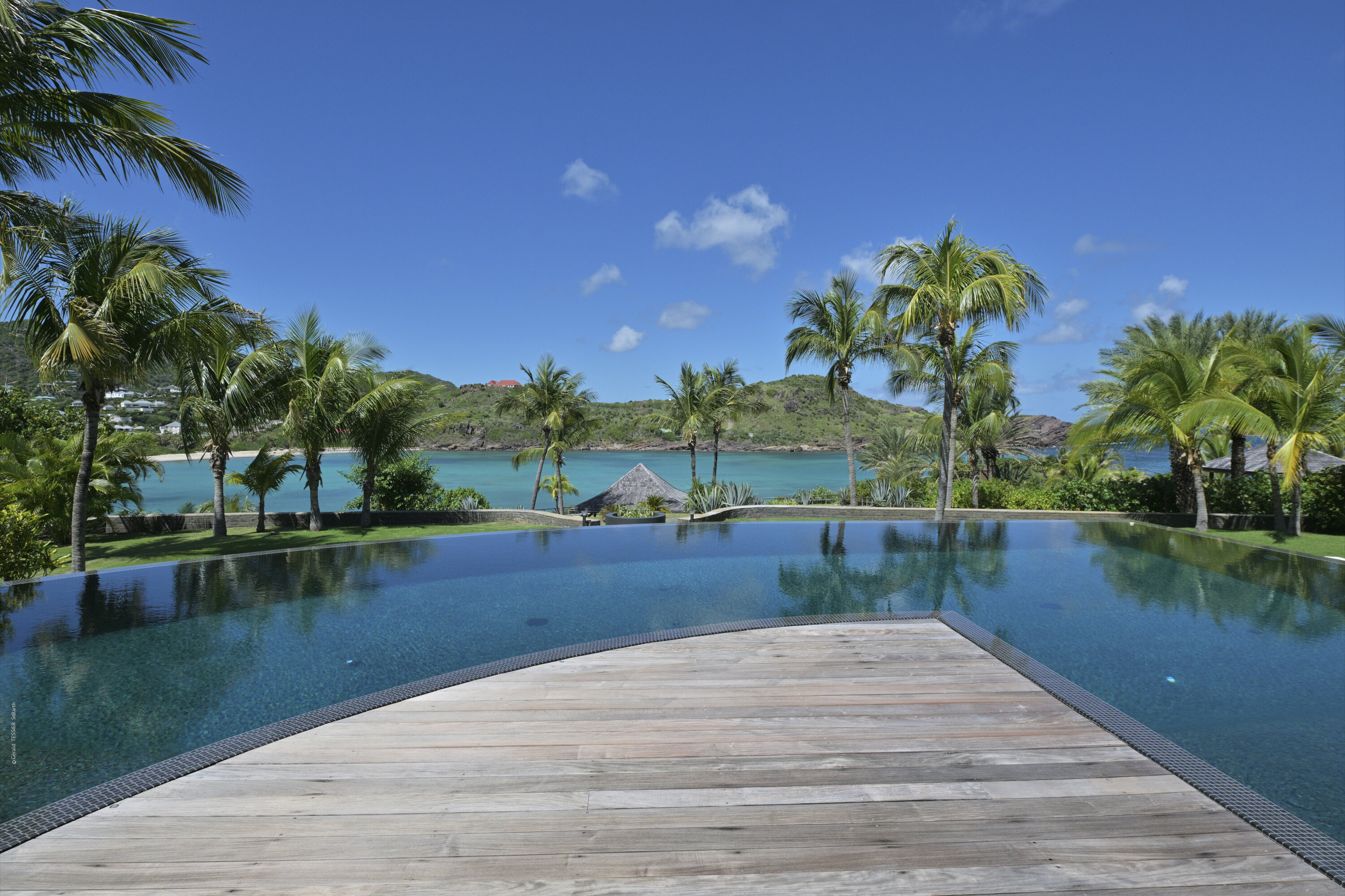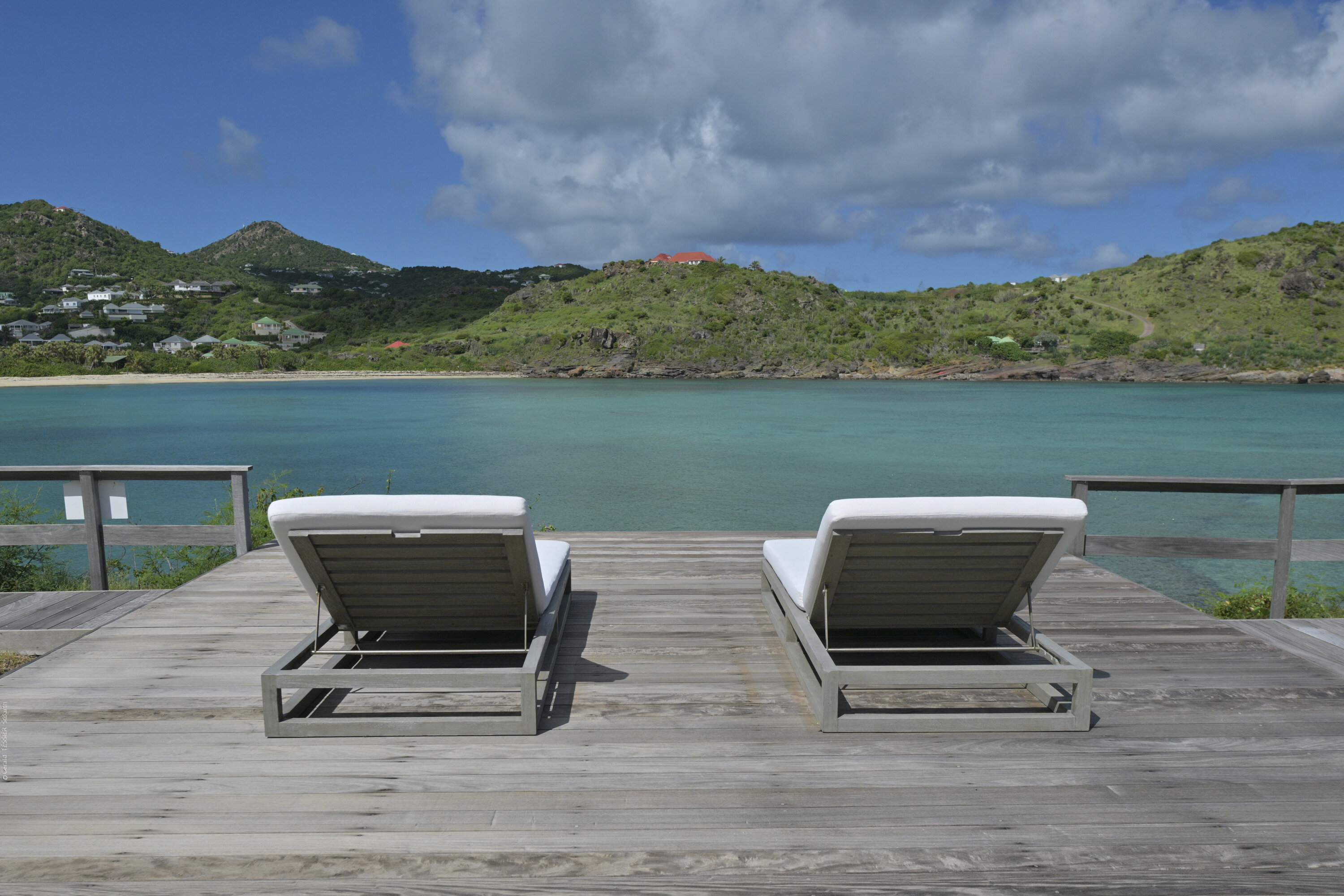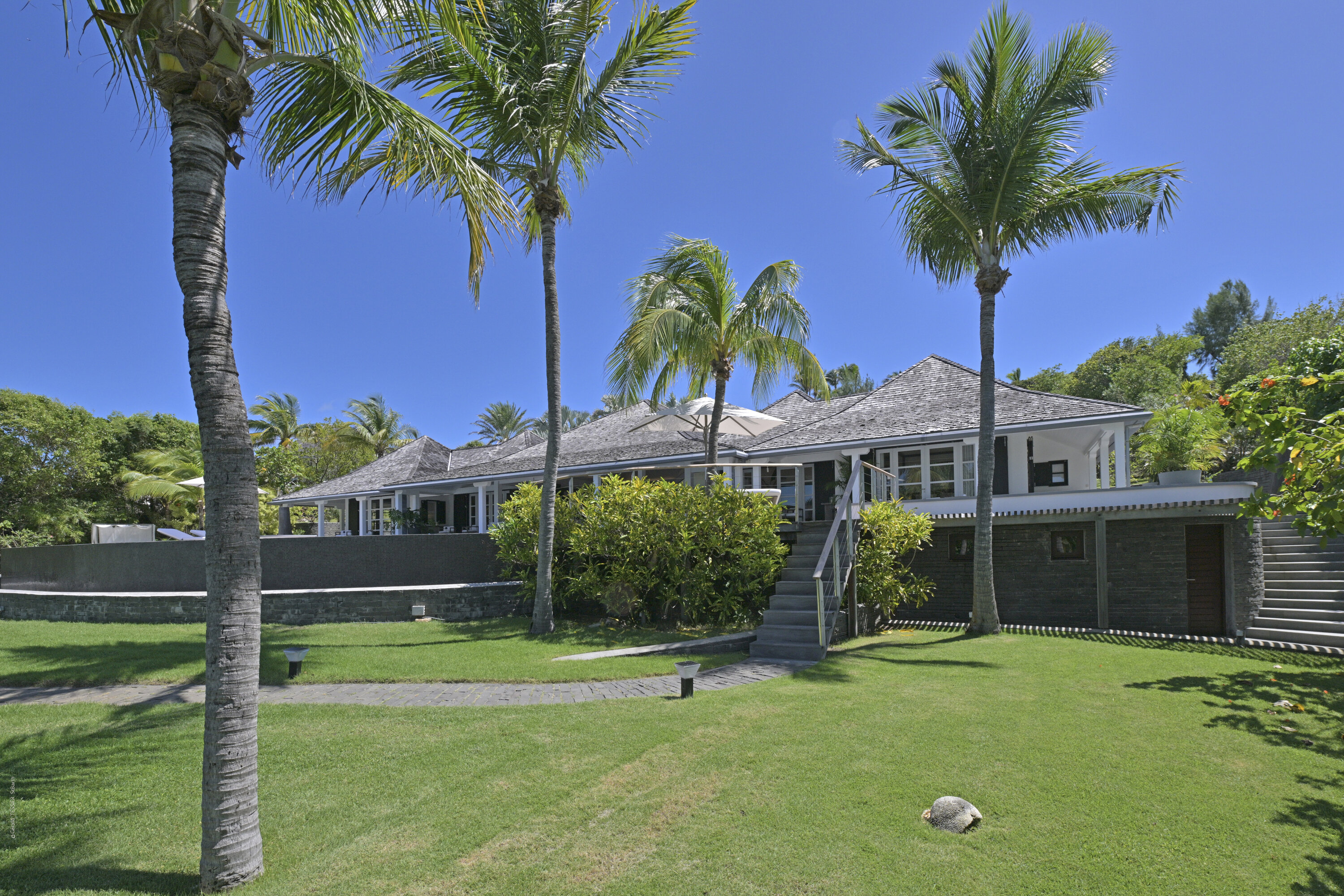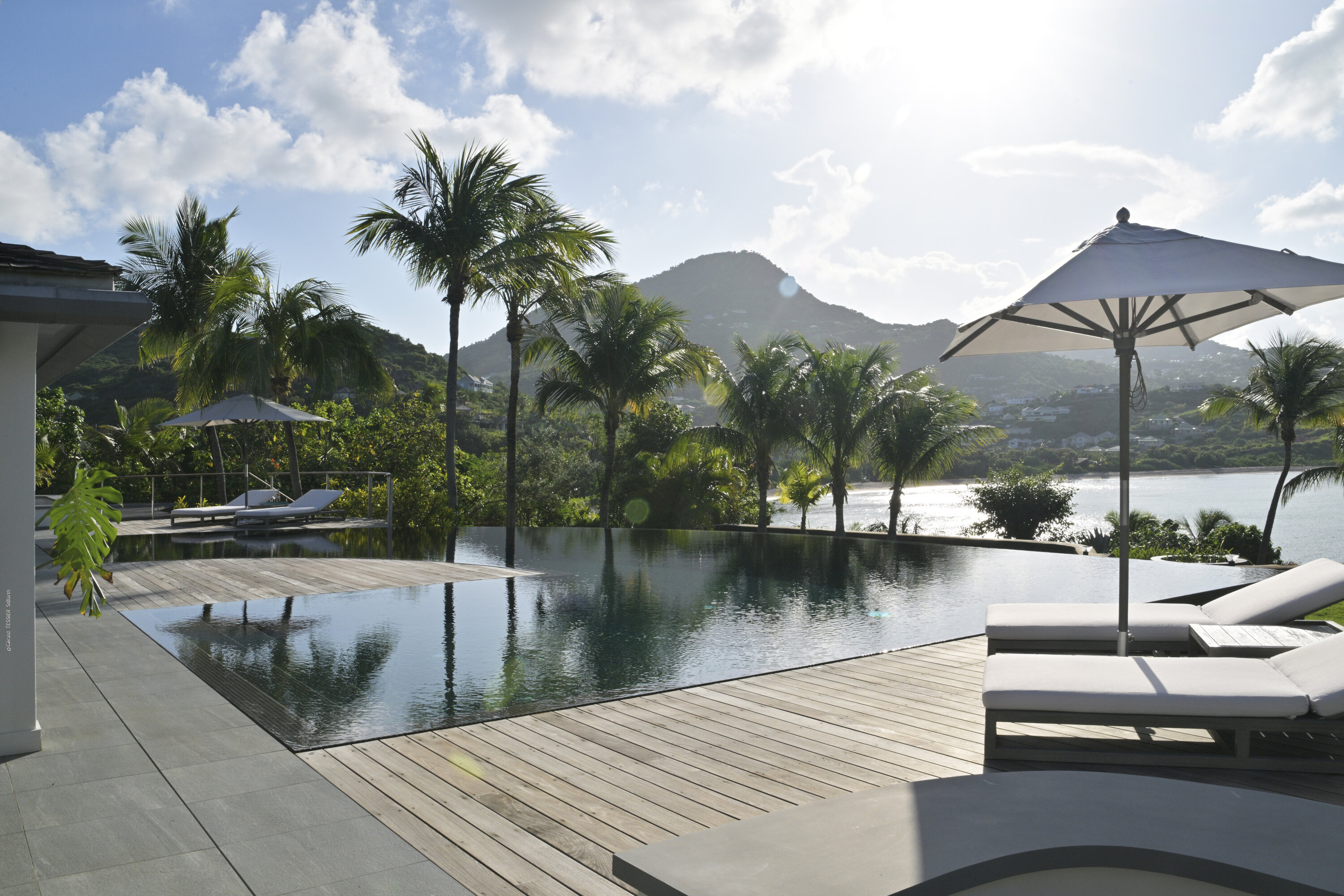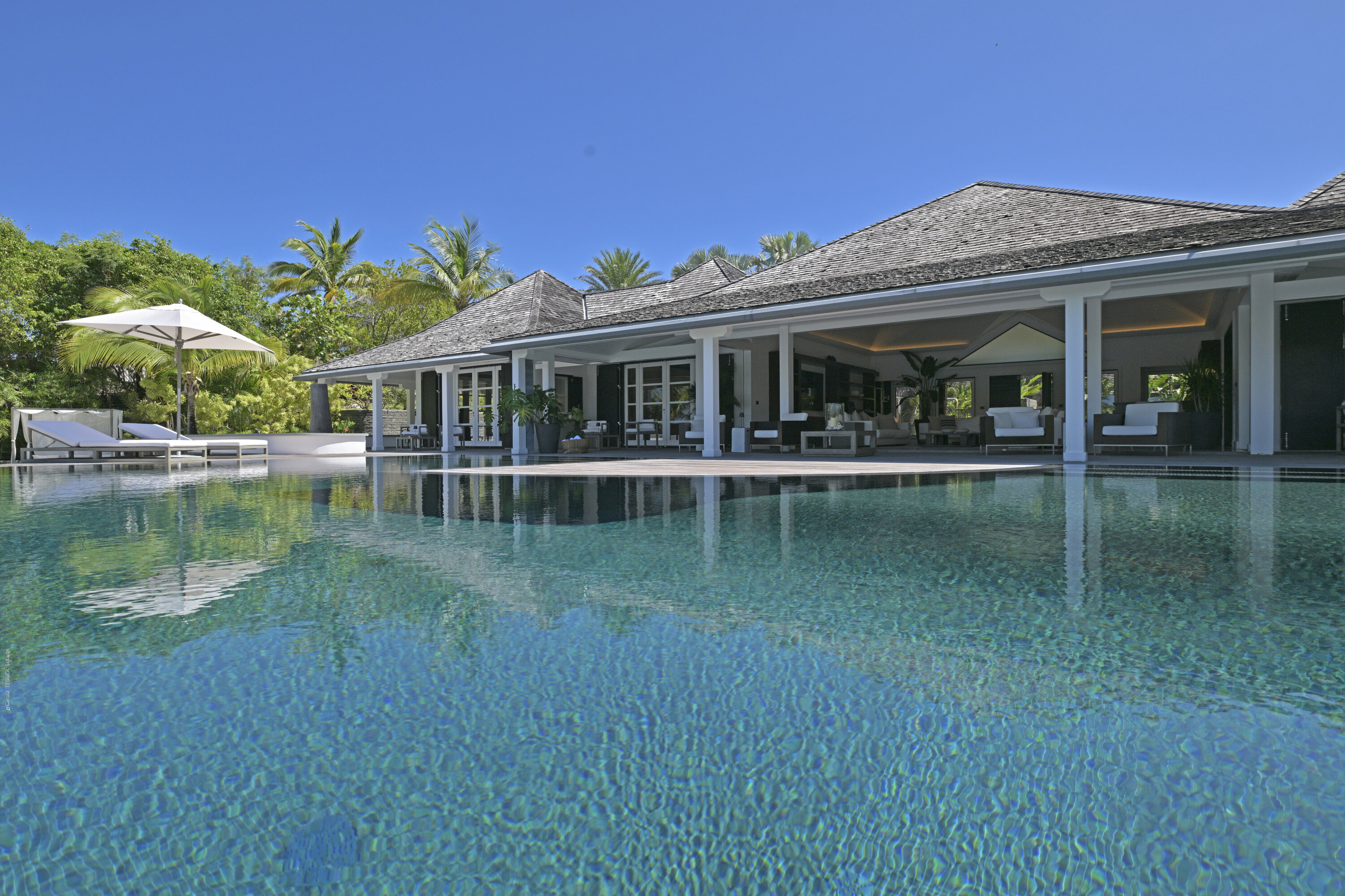 Villa Silver Rainbow, (villa code: WV SIL), is a contemporary 6-bedroom villa located in Petit Cul de Sac within a short walk of the beach and minutes from shopping. This villa offers stunning views of the bay and nearby island. A large, double staircase made of grey stones leads to the living room and large terrace with a heated infinity pool overlooking the bay. The modern living room is elegantly decorated with large comfortable sofas and a bar and opens to the air-conditioned gourmet kitchen. A private dining room features a large, wooden table with seating for 8 guests. Located next door is the master suite, which overlooks the view and has a 4-poster king-size bed and a spacious ensuite bathroom with a rain shower, bathtub, and a large dressing area. On the other side are 2 bedrooms with king-size beds, ensuite bathrooms, and ocean views. A junior cottage is located above the main house and includes 2 bedrooms, a kitchenette, and a living room. Each bedroom offers a king-size bed and ensuite bathroom. A well-equipped fitness room, office, and sixth bedroom, with a king-size bed and ensuite bathroom, are located above the cottage near the entrance. A path leads to a Balinese gazebo and, just beyond, access to the bay. The house also has air-conditioning in the bedrooms and fitness area, WiFi, a fax machine, U.S. satellite TV, and the use of shared tennis courts within walking distance. During the Thanksgiving and December holidays, the villa rents at the full occupancy rate regardless of how many bedrooms are used.Please fill out the form to begin your inquiry and we will connect you with a seasoned villa rental specialist.
