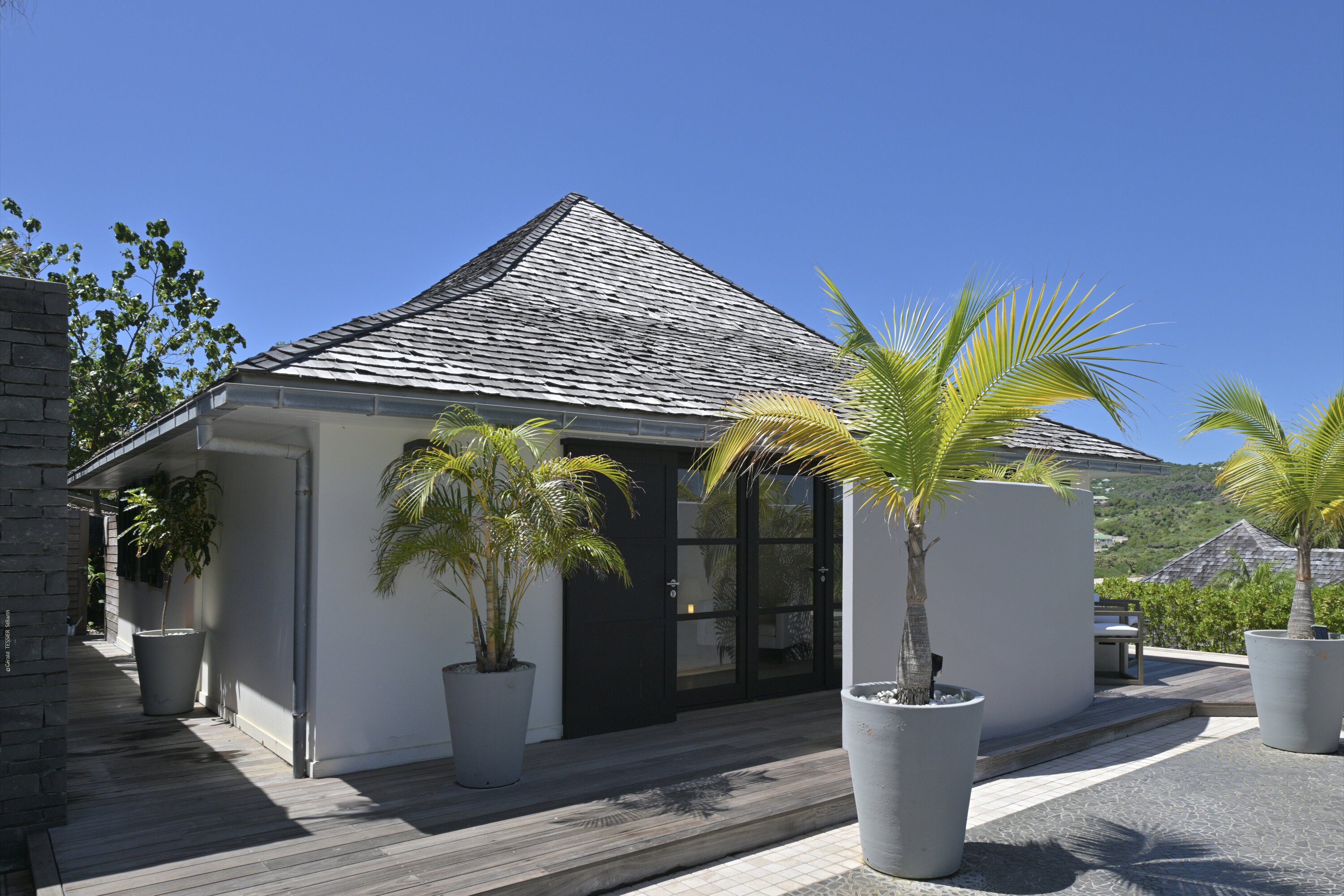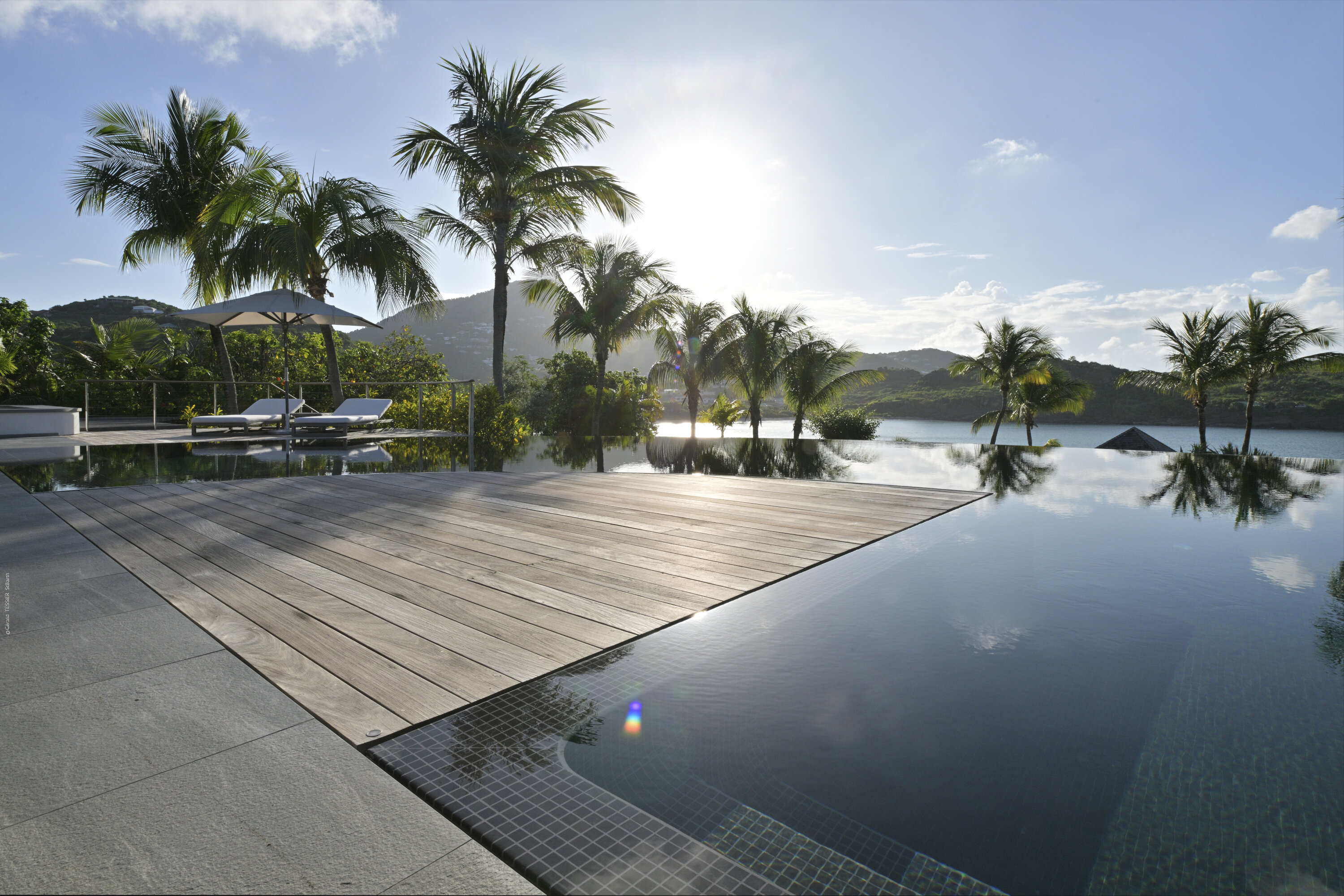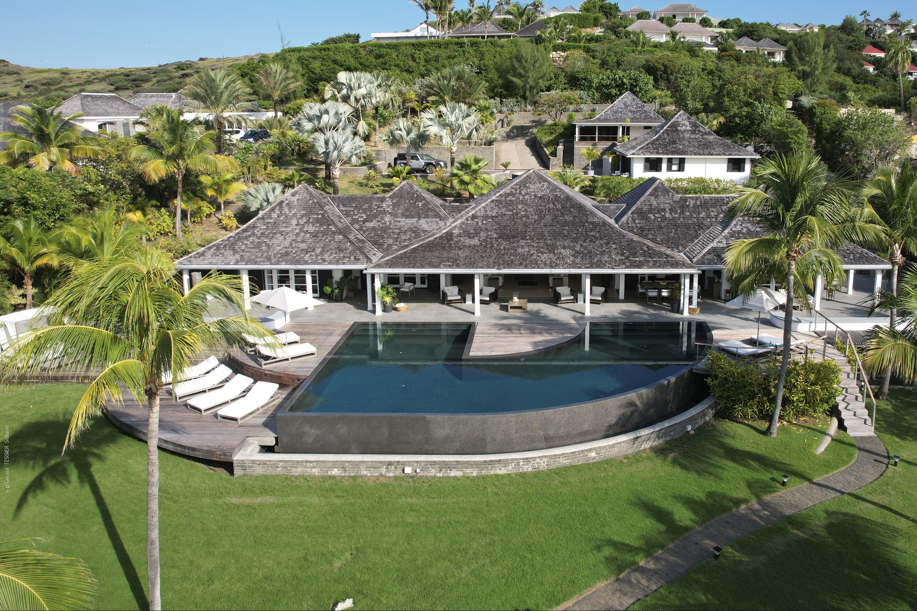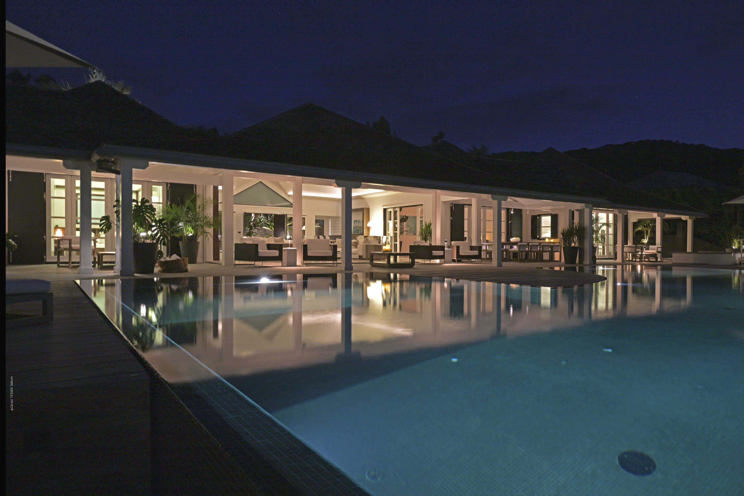 Villa Silver Rainbow, (villa code: WV SIL), is a contemporary 6-bedroom villa located in Petit Cul de Sac within a short walk of the beach and minutes from shopping. This villa offers stunning views of the bay and nearby island. A large, double staircase made of grey stones leads to the living room and large terrace with a heated infinity pool overlooking the bay. The modern living room is elegantly decorated with large comfortable sofas and a bar and opens to the air-conditioned gourmet kitchen. A private dining room features a large, wooden table with seating for 8 guests. Located next door is the master suite, which overlooks the view and has a 4-poster king-size bed and a spacious ensuite bathroom with a rain shower, bathtub, and a large dressing area. On the other side are 2 bedrooms with king-size beds, ensuite bathrooms, and ocean views. A junior cottage is located above the main house and includes 2 bedrooms, a kitchenette, and a living room. Each bedroom offers a king-size bed and ensuite bathroom. A well-equipped fitness room, office, and sixth bedroom, with a king-size bed and ensuite bathroom, are located above the cottage near the entrance. A path leads to a Balinese gazebo and, just beyond, access to the bay. The house also has air-conditioning in the bedrooms and fitness area, WiFi, a fax machine, U.S. satellite TV, and the use of shared tennis courts within walking distance. During the Thanksgiving and December holidays, the villa rents at the full occupancy rate regardless of how many bedrooms are used.Please fill out the form to begin your inquiry and we will connect you with a seasoned villa rental specialist.
