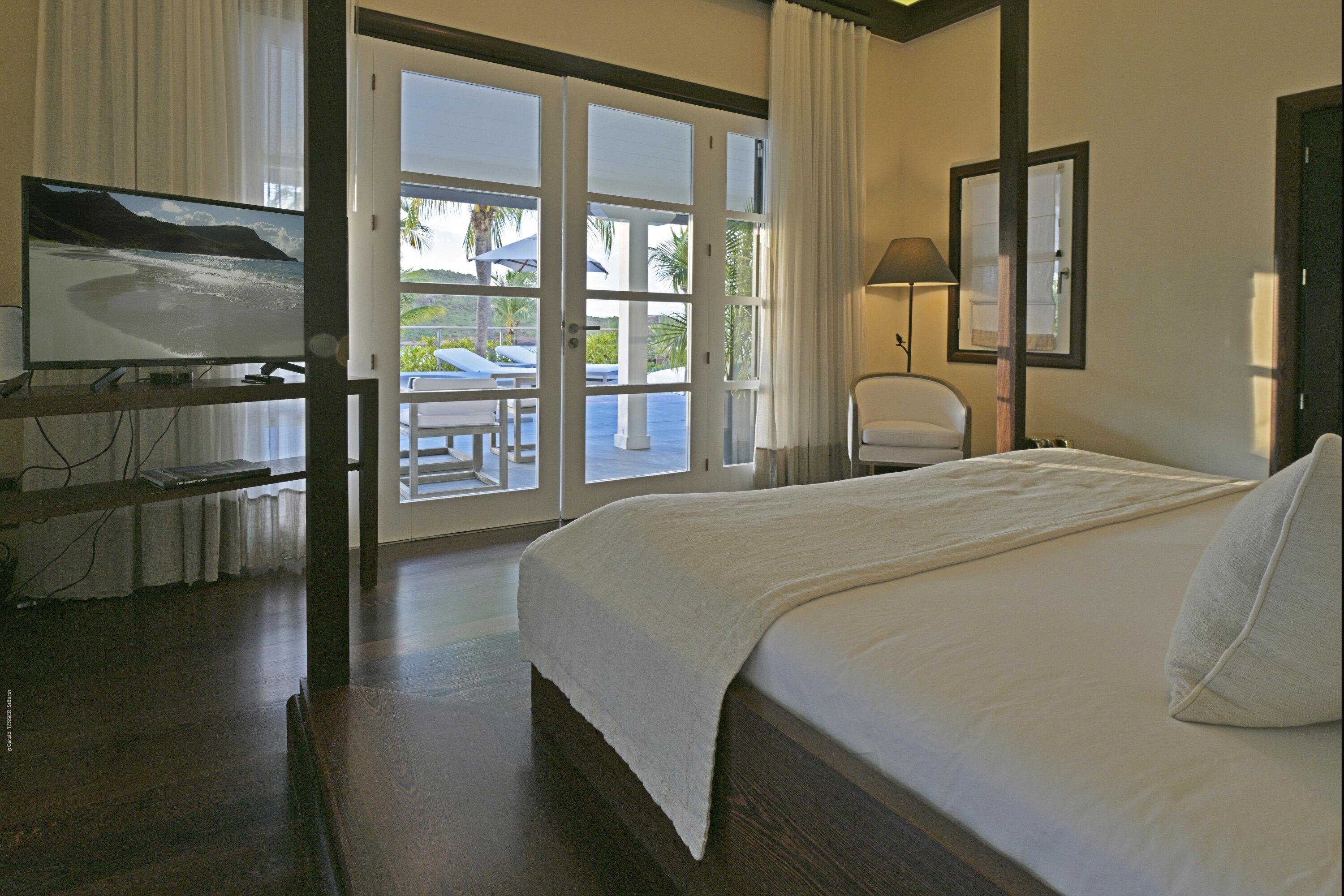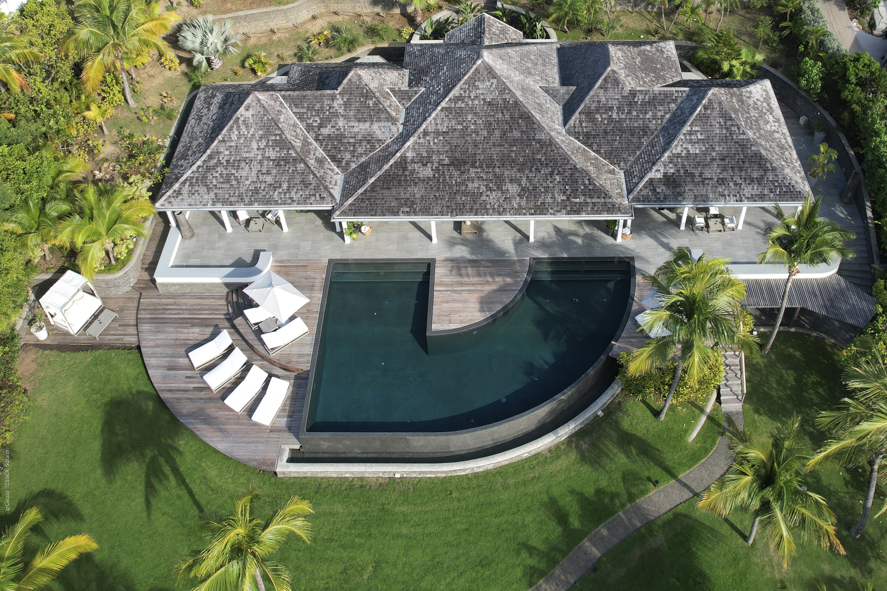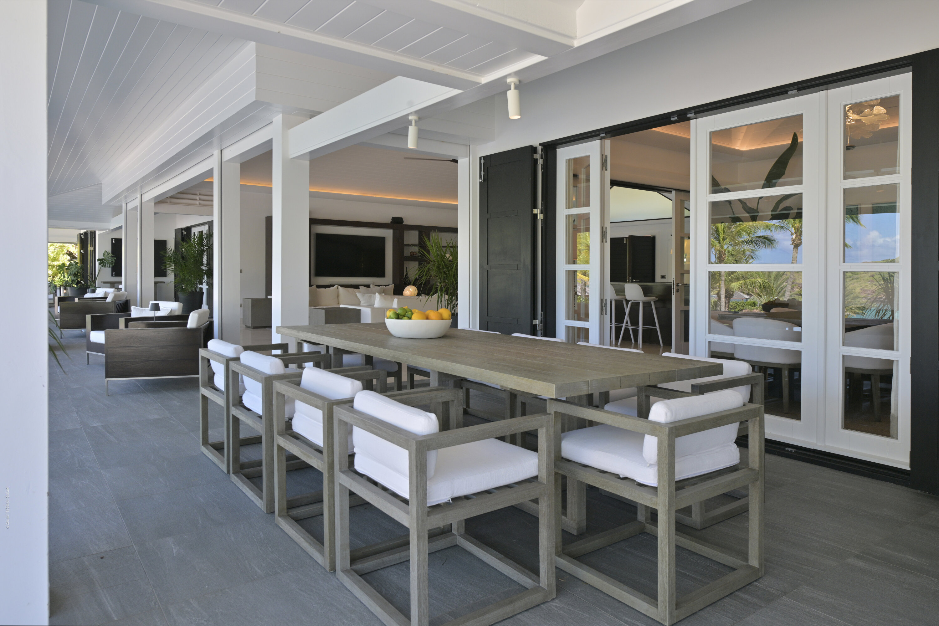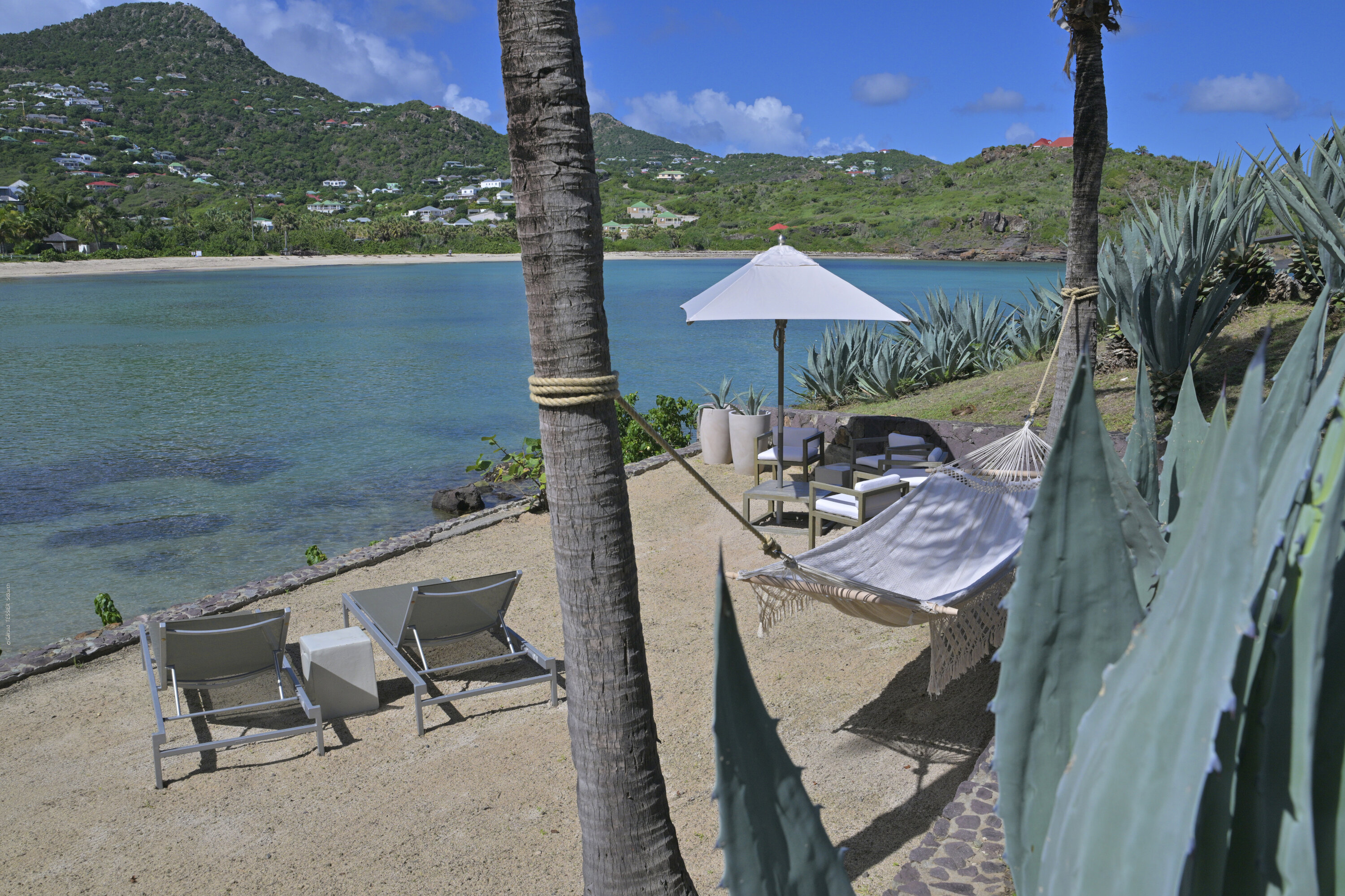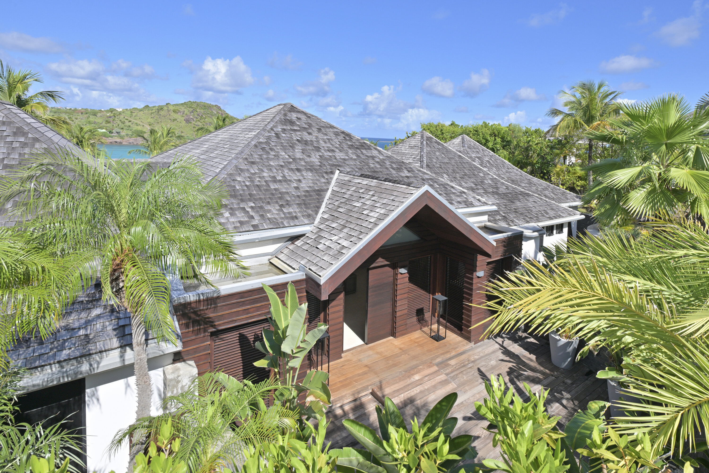 Villa Silver Rainbow, (villa code: WV SIL), is a contemporary 6-bedroom villa located in Petit Cul de Sac within a short walk of the beach and minutes from shopping. This villa offers stunning views of the bay and nearby island. A large, double staircase made of grey stones leads to the living room and large terrace with a heated infinity pool overlooking the bay. The modern living room is elegantly decorated with large comfortable sofas and a bar and opens to the air-conditioned gourmet kitchen. A private dining room features a large, wooden table with seating for 8 guests. Located next door is the master suite, which overlooks the view and has a 4-poster king-size bed and a spacious ensuite bathroom with a rain shower, bathtub, and a large dressing area. On the other side are 2 bedrooms with king-size beds, ensuite bathrooms, and ocean views. A junior cottage is located above the main house and includes 2 bedrooms, a kitchenette, and a living room. Each bedroom offers a king-size bed and ensuite bathroom. A well-equipped fitness room, office, and sixth bedroom, with a king-size bed and ensuite bathroom, are located above the cottage near the entrance. A path leads to a Balinese gazebo and, just beyond, access to the bay. The house also has air-conditioning in the bedrooms and fitness area, WiFi, a fax machine, U.S. satellite TV, and the use of shared tennis courts within walking distance. During the Thanksgiving and December holidays, the villa rents at the full occupancy rate regardless of how many bedrooms are used.Please fill out the form to begin your inquiry and we will connect you with a seasoned villa rental specialist.