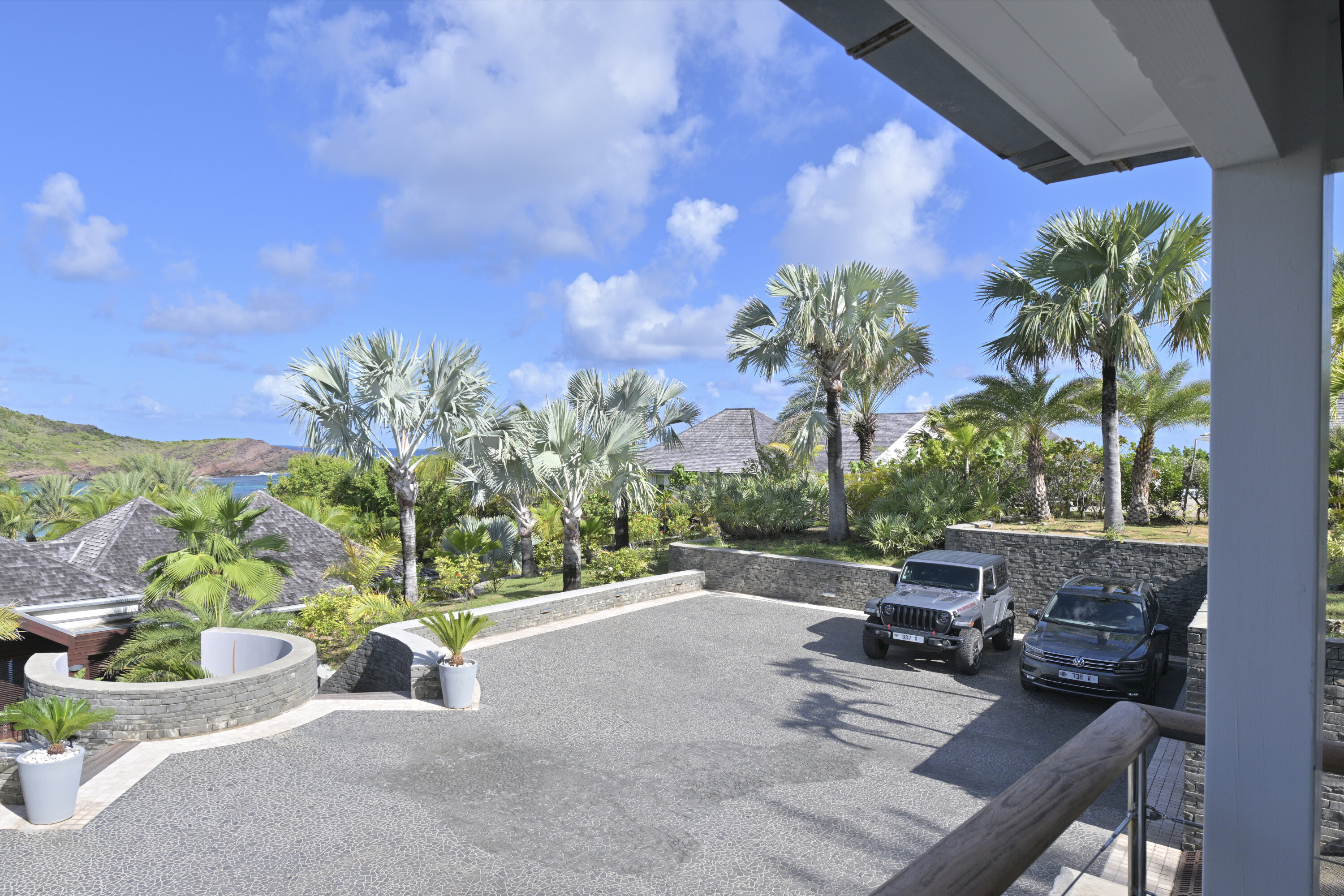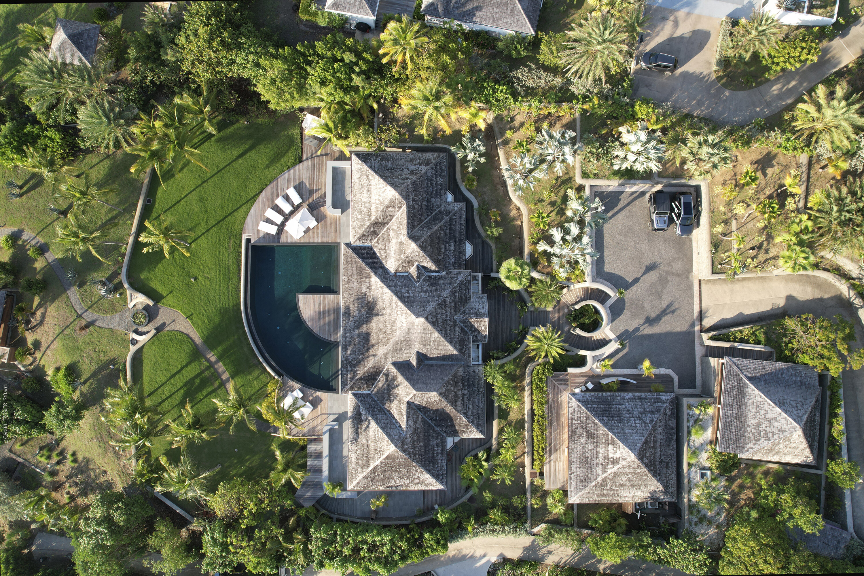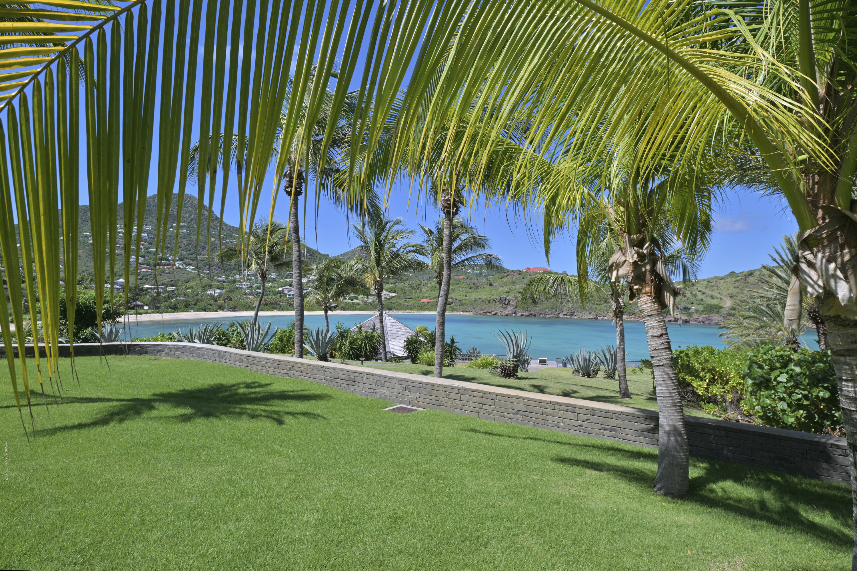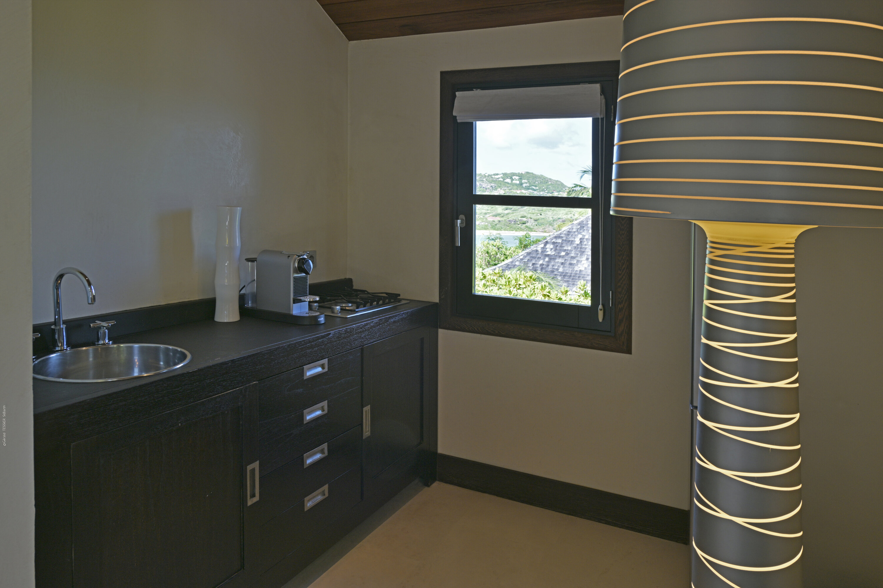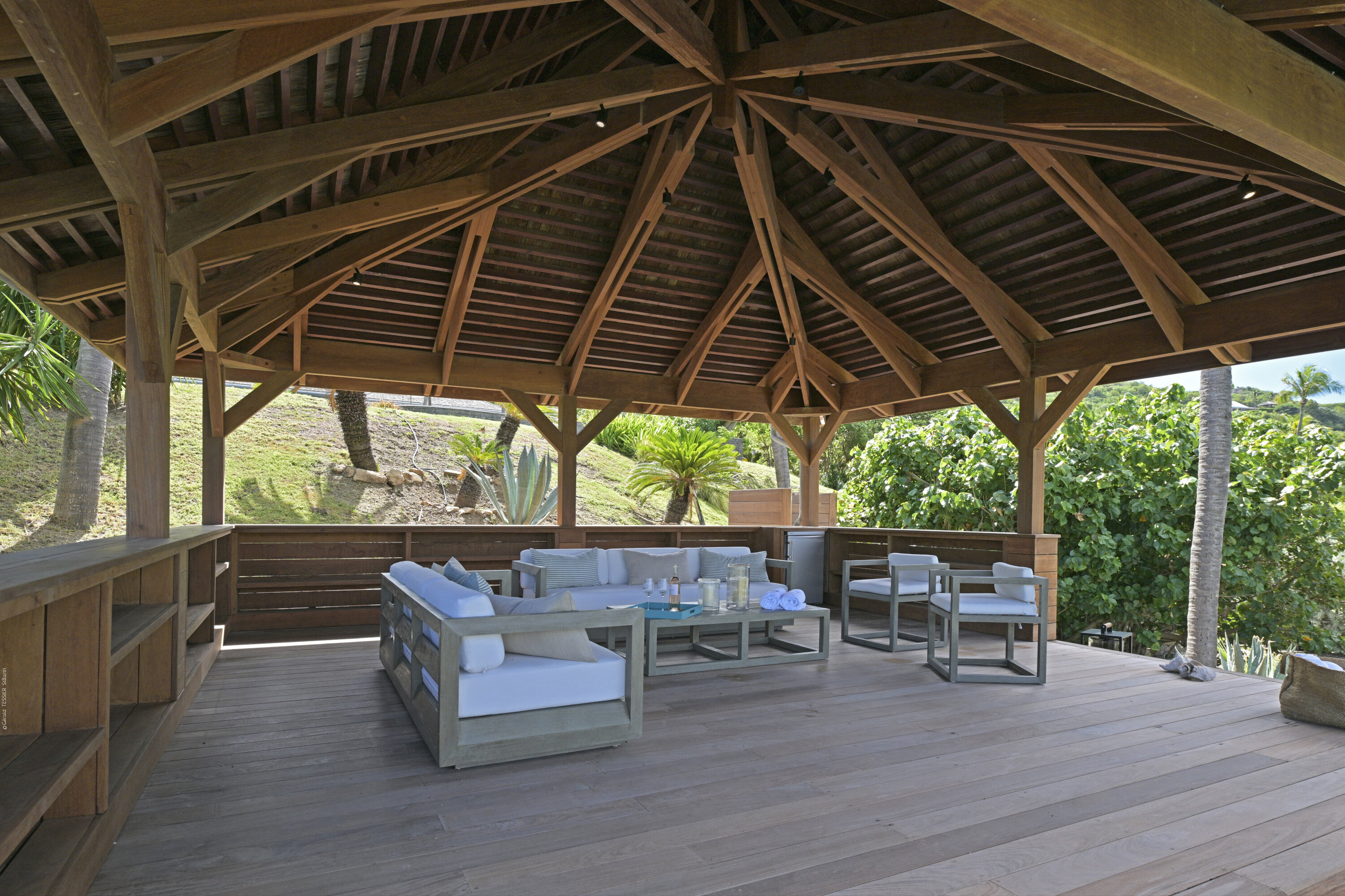 Villa Silver Rainbow, (villa code: WV SIL), is a contemporary 6-bedroom villa located in Petit Cul de Sac within a short walk of the beach and minutes from shopping. This villa offers stunning views of the bay and nearby island. A large, double staircase made of grey stones leads to the living room and large terrace with a heated infinity pool overlooking the bay. The modern living room is elegantly decorated with large comfortable sofas and a bar and opens to the air-conditioned gourmet kitchen. A private dining room features a large, wooden table with seating for 8 guests. Located next door is the master suite, which overlooks the view and has a 4-poster king-size bed and a spacious ensuite bathroom with a rain shower, bathtub, and a large dressing area. On the other side are 2 bedrooms with king-size beds, ensuite bathrooms, and ocean views. A junior cottage is located above the main house and includes 2 bedrooms, a kitchenette, and a living room. Each bedroom offers a king-size bed and ensuite bathroom. A well-equipped fitness room, office, and sixth bedroom, with a king-size bed and ensuite bathroom, are located above the cottage near the entrance. A path leads to a Balinese gazebo and, just beyond, access to the bay. The house also has air-conditioning in the bedrooms and fitness area, WiFi, a fax machine, U.S. satellite TV, and the use of shared tennis courts within walking distance. During the Thanksgiving and December holidays, the villa rents at the full occupancy rate regardless of how many bedrooms are used.Please fill out the form to begin your inquiry and we will connect you with a seasoned villa rental specialist.