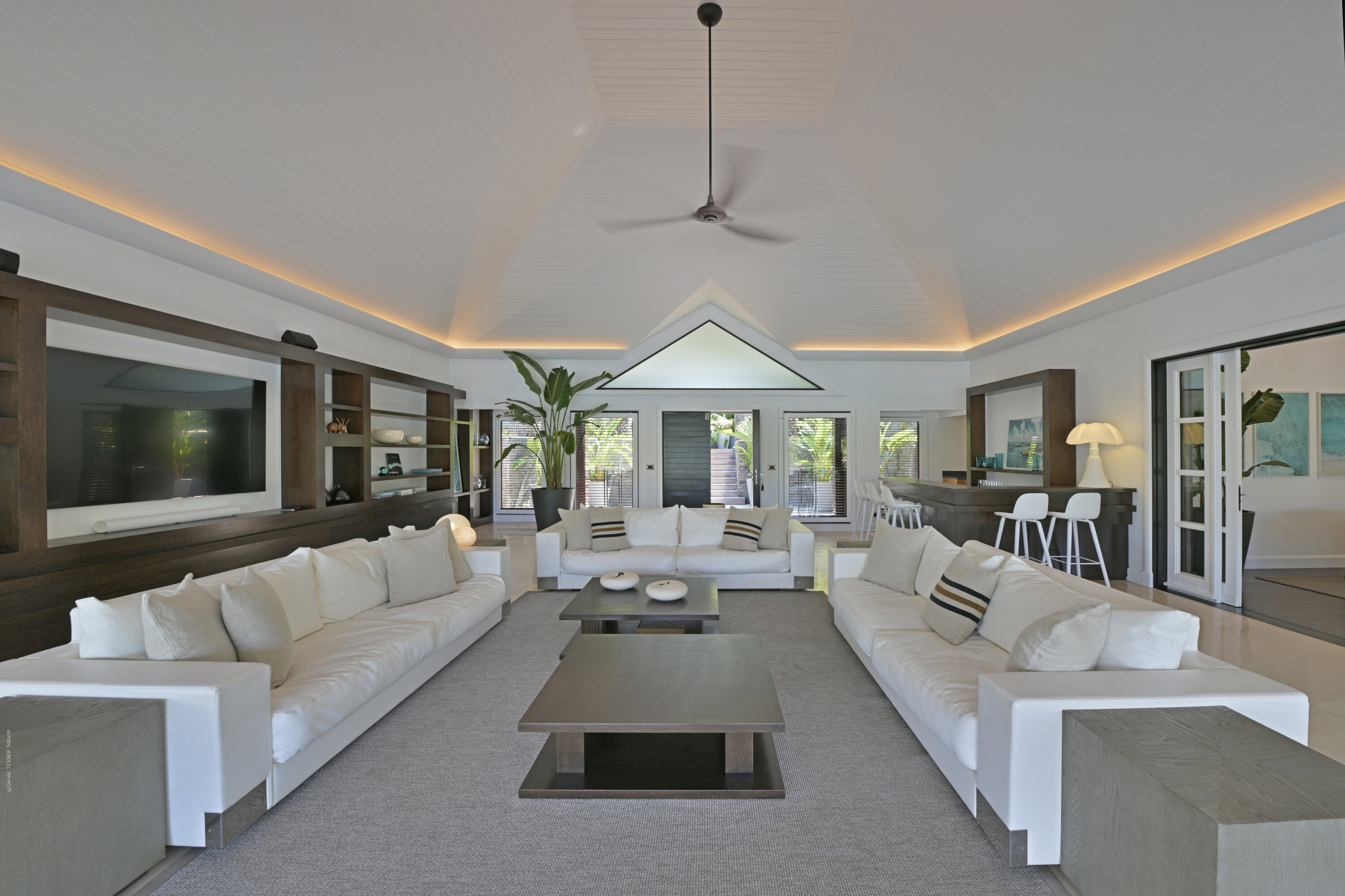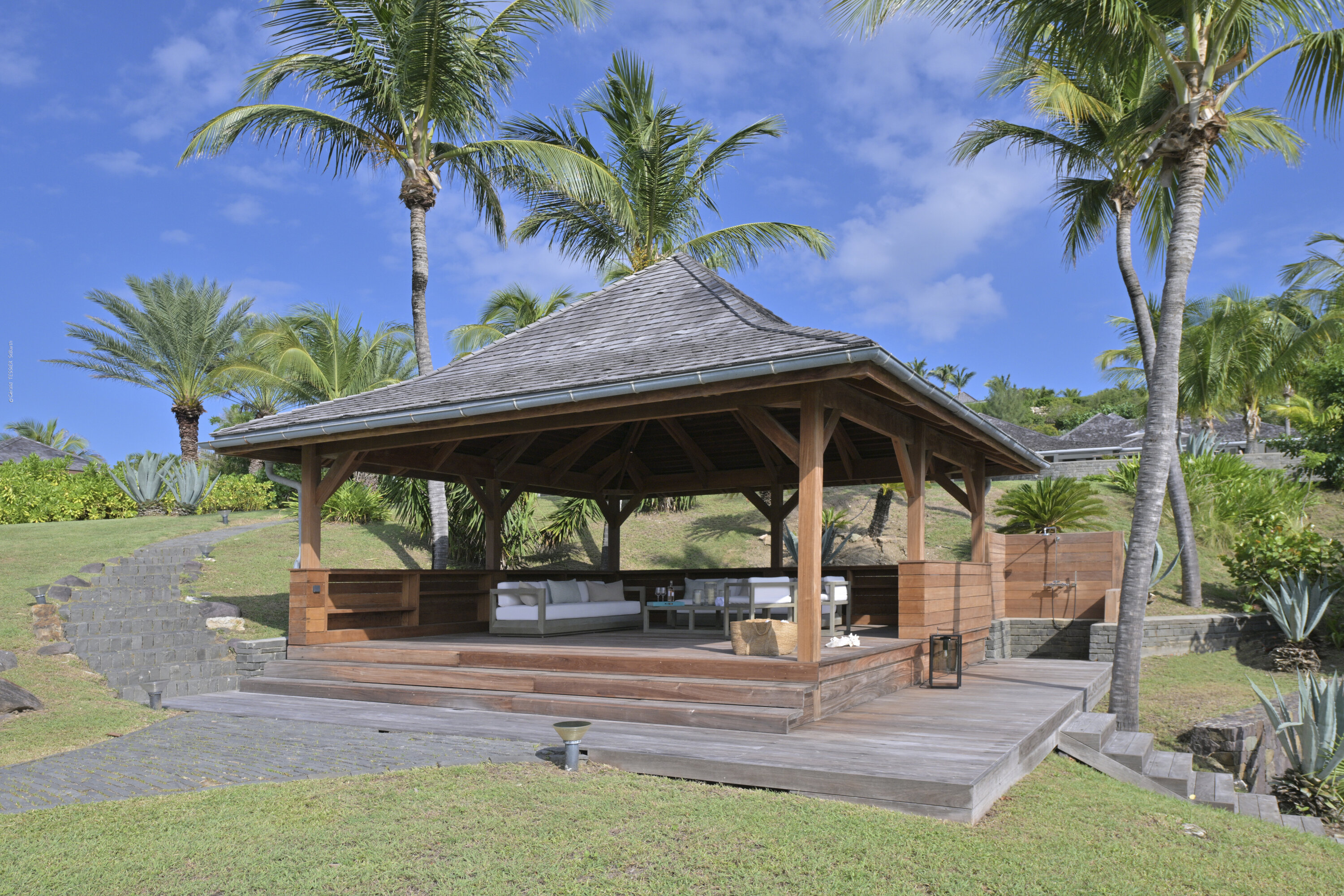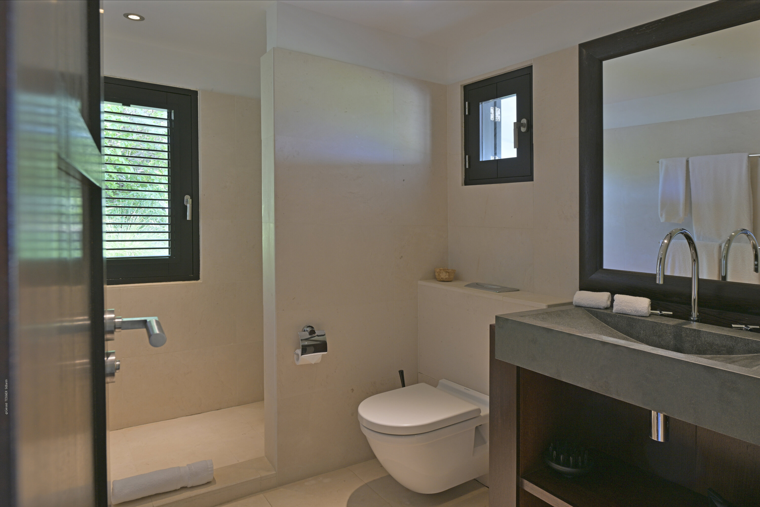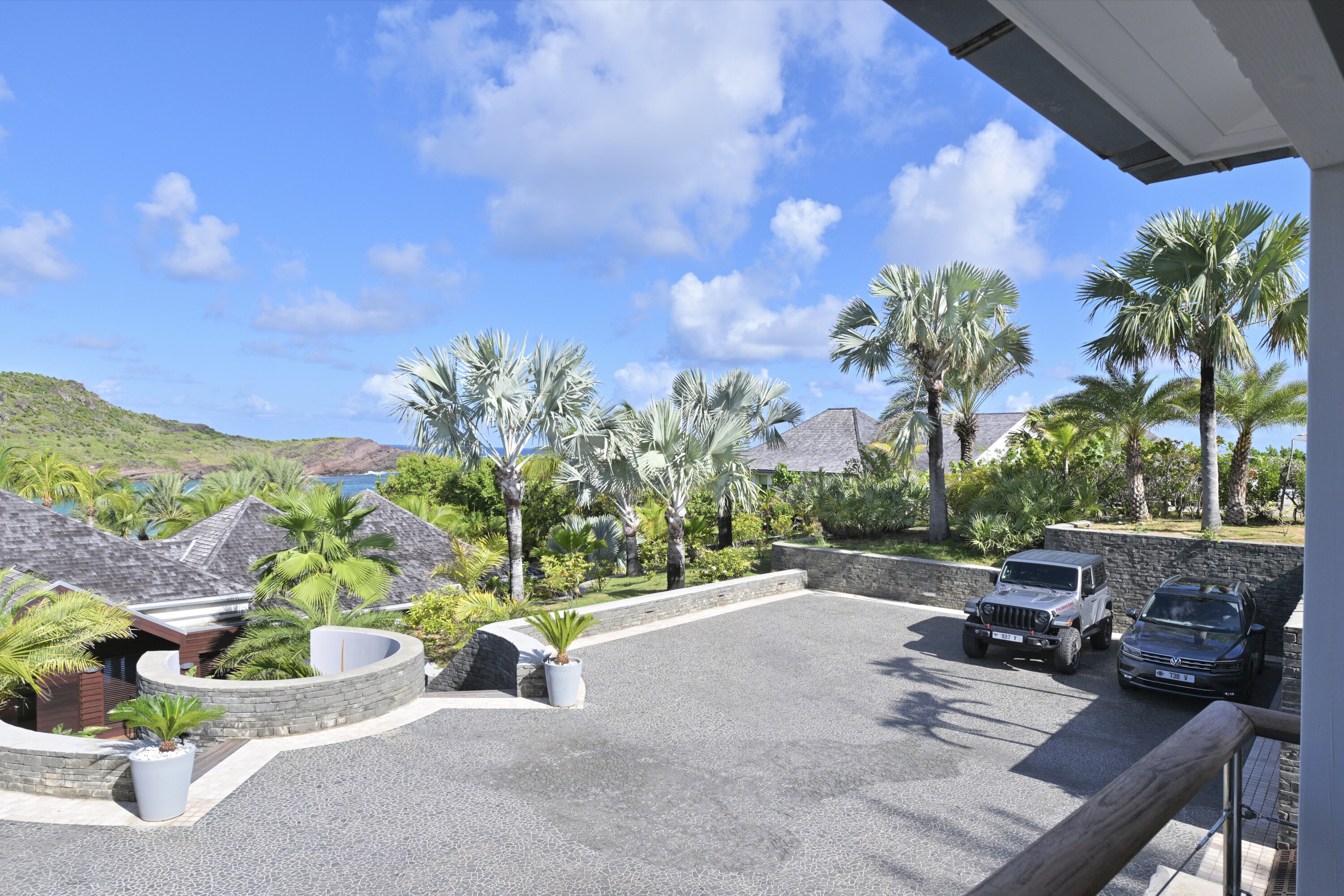 Villa Silver Rainbow, (villa code: WV SIL), is a contemporary 6-bedroom villa located in Petit Cul de Sac within a short walk of the beach and minutes from shopping. This villa offers stunning views of the bay and nearby island. A large, double staircase made of grey stones leads to the living room and large terrace with a heated infinity pool overlooking the bay. The modern living room is elegantly decorated with large comfortable sofas and a bar and opens to the air-conditioned gourmet kitchen. A private dining room features a large, wooden table with seating for 8 guests. Located next door is the master suite, which overlooks the view and has a 4-poster king-size bed and a spacious ensuite bathroom with a rain shower, bathtub, and a large dressing area. On the other side are 2 bedrooms with king-size beds, ensuite bathrooms, and ocean views. A junior cottage is located above the main house and includes 2 bedrooms, a kitchenette, and a living room. Each bedroom offers a king-size bed and ensuite bathroom. A well-equipped fitness room, office, and sixth bedroom, with a king-size bed and ensuite bathroom, are located above the cottage near the entrance. A path leads to a Balinese gazebo and, just beyond, access to the bay. The house also has air-conditioning in the bedrooms and fitness area, WiFi, a fax machine, U.S. satellite TV, and the use of shared tennis courts within walking distance. During the Thanksgiving and December holidays, the villa rents at the full occupancy rate regardless of how many bedrooms are used.Please fill out the form to begin your inquiry and we will connect you with a seasoned villa rental specialist.