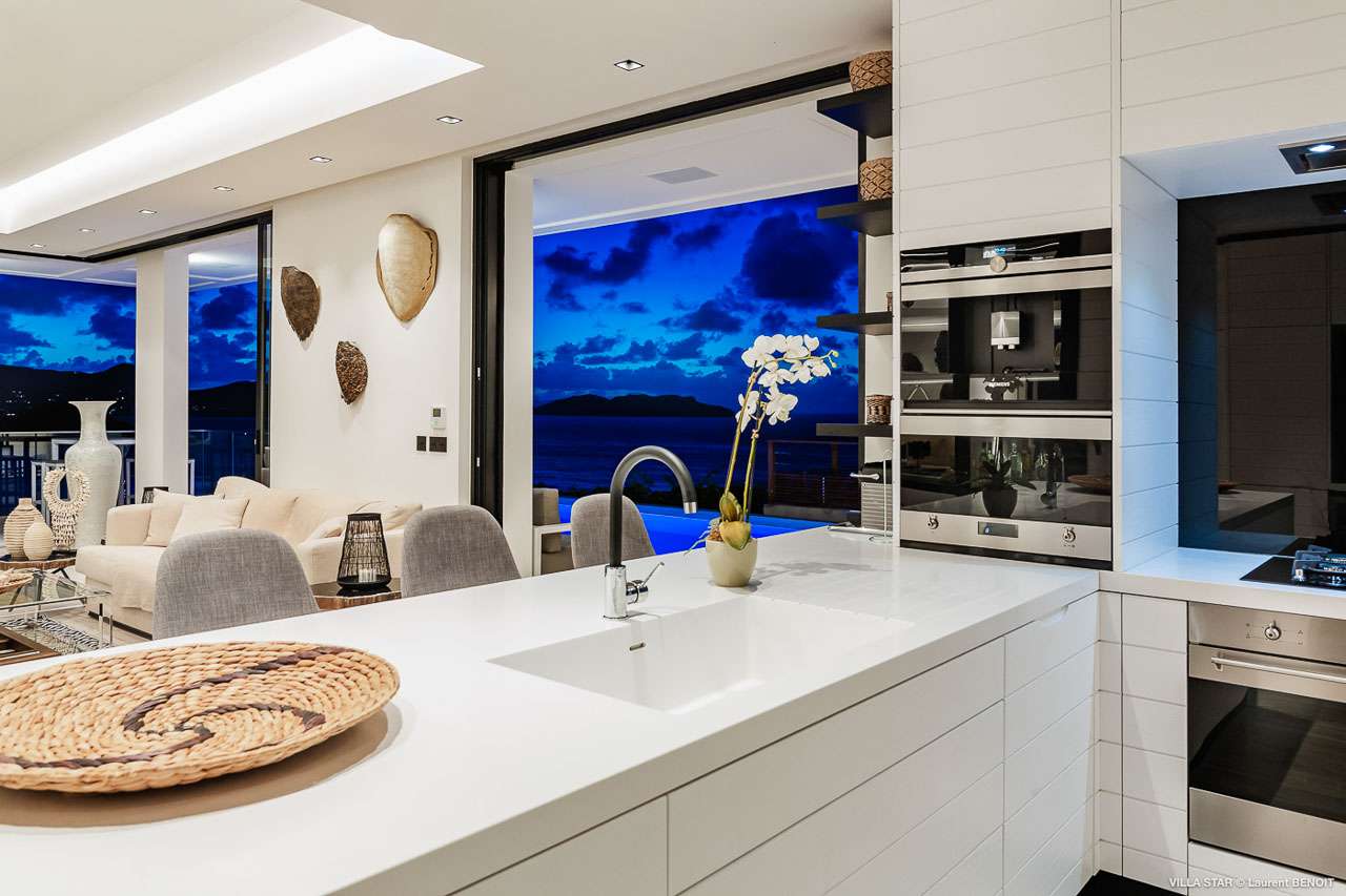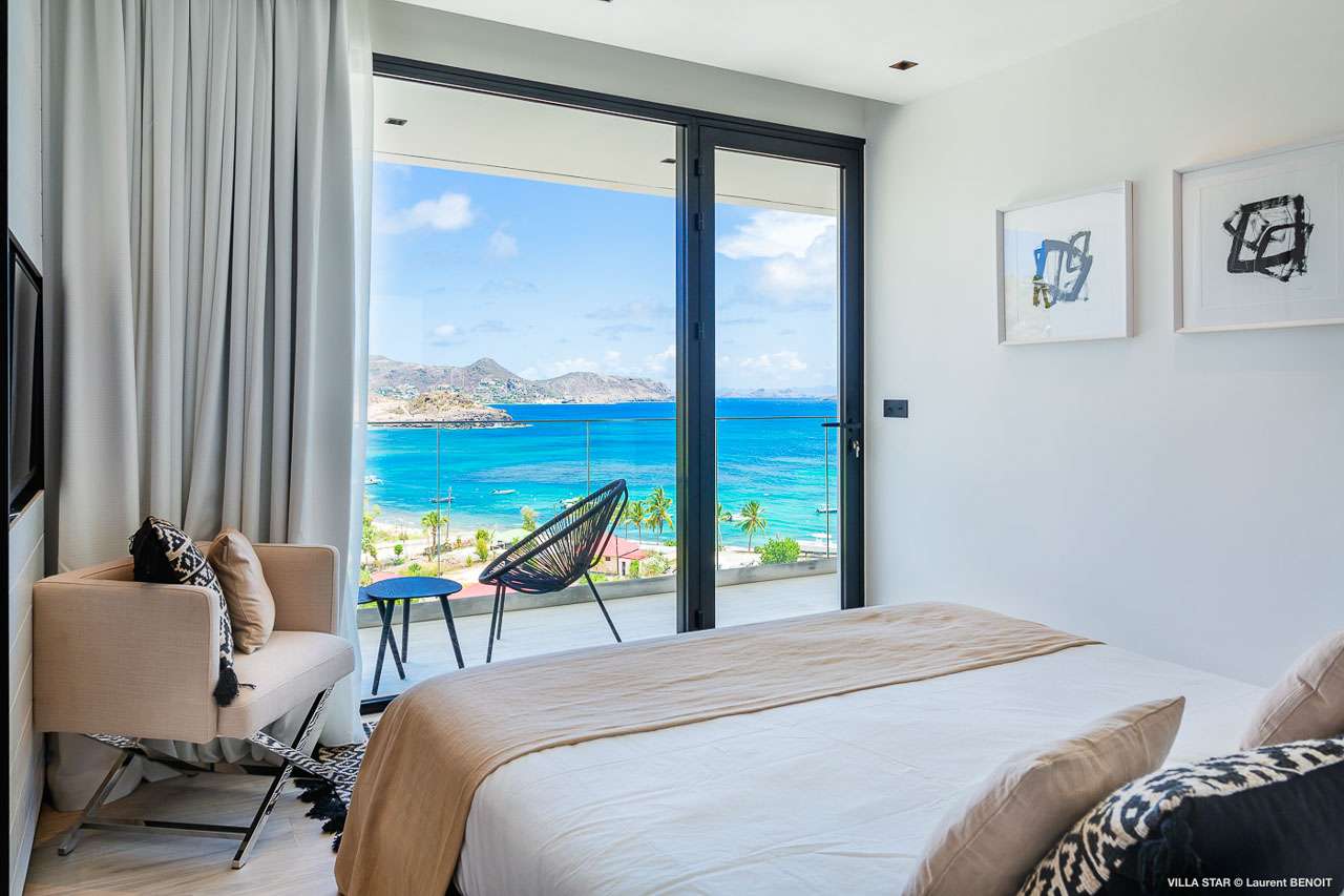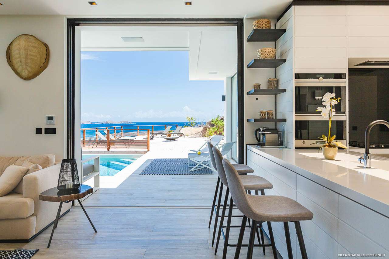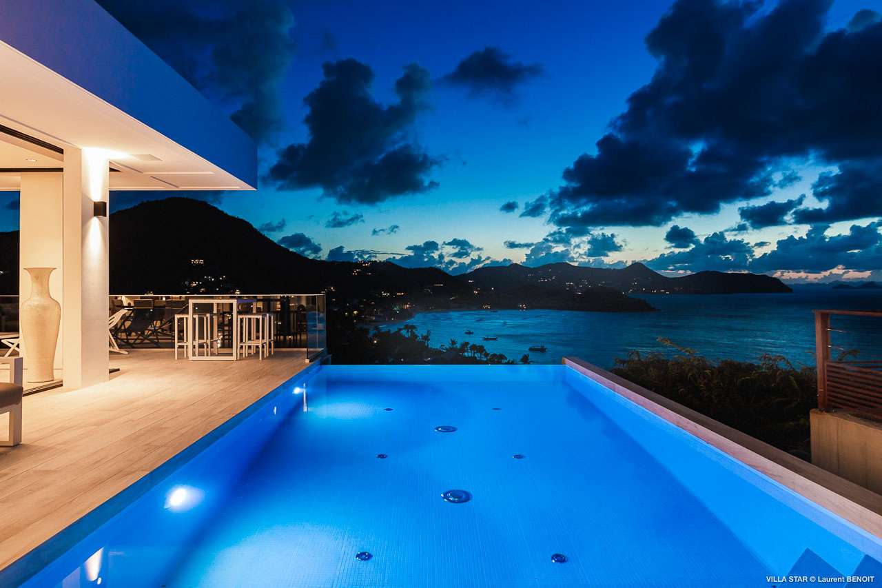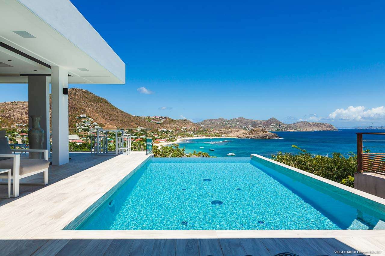 Welcome to Villa Star (villa code: WV TAR), a modern 3-bedroom villa in Camaruche above Lorient Bay, St. Barts. This luxurious home unabashedly celebrates the finer things in life, from the outstanding island views to the high-end design. The interiors of Villa Star are sleek and chic, contemporary white with black trim creating a luxurious atmosphere. Stylish furnishings offer comfortable spots to relax, while large doors let in plenty of island breezes and natural light. Built into the rock of the hillside overlooking Lorient and its magnificent bay, Villa Star offers spectacular views and sunsets. The beach is a short drive away, while nearby St. Jean is an exquisite spot with excellent restaurants and an enticing, laid-back tempo. Fully air-conditioned, the villa’s main room can be a welcome refuge after a long day in the sun. It can also be opened to the natural breezes for those who prefer the feeling of being outside with the comforts of home. This space features the living room, dining area, and kitchen. In the living room, there are comfortable couches that coax you to sink in at any time of the day. Whether you’re reading a good book, watching TV, or indulging in an afternoon nap, this is the most relaxing space inside Villa Star. Next to the living room is the stylish kitchen, with sleek cabinetry and the latest modern appliances. You’ll have no trouble preparing meals for your group here. Our concierge even has a few tricks up their sleeves to make your stay easier, from grocery deliveries to arranging a private chef for an unforgettable in-villa experience. At the far end of the great room is the dining table, sitting in front of the amazing view. Pairing a fine island meal and a bottle of wine with these vistas is a great way to enjoy an evening with family and friends. There are 3 outstanding bedrooms inside Villa Star, quiet places to reflect and recharge each evening. The master bedroom is situated right outside the living room in front of the pool. This room has a large ensuite bathroom with an indoor and outdoor shower. Two more bedrooms are on the lower floor in a hallway next to the parking area and accessed via exterior stairs, both have ensuite bathrooms with indoor showers. All bedrooms benefit from the views and come with a TV, his-and-hers closets, a minibar, and a plush European king-sized bed. Villa Star is situated directly above WV STR and can be rented together for a total of 8 bedrooms. The large outdoor space is centered around the infinity pool and enjoys the sun for most of the day. You could spend countless hours here, sunbathing on loungers with a cool drink between dips in the refreshing water. Around the corner is a lounge area with outstanding views over the shimmering Caribbean below. At sunset, golden light glows across the tropical landscape, lighting up the turquoise waters, the hills on either side and the luxury yachts scattered around the bay. On the other side of Villa Star’s pool is a unique terrace filled with sand, nicknamed “The Beach”. There are loungers here for more sunbathing, and you can scrunch your toes in the soft sand with a drink or two. It’s also a great area to host a beach-themed party, with the terrific vistas acting as a backdrop. During the Thanksgiving and December holidays, the villa rents at full occupancy rates regardless of how many bedrooms are used.Please fill out the form to begin your inquiry and we will connect you with a seasoned villa rental specialist.
