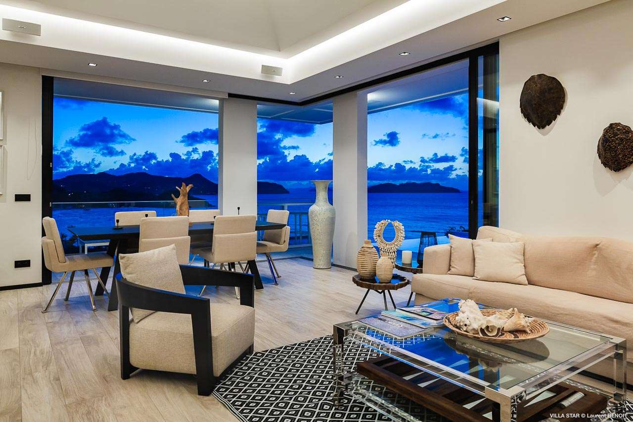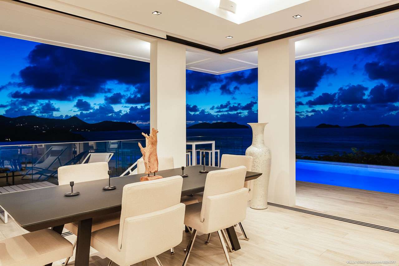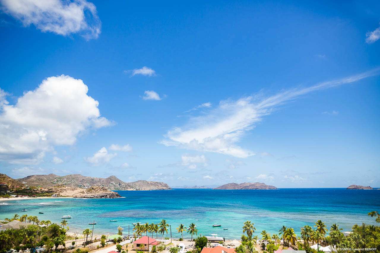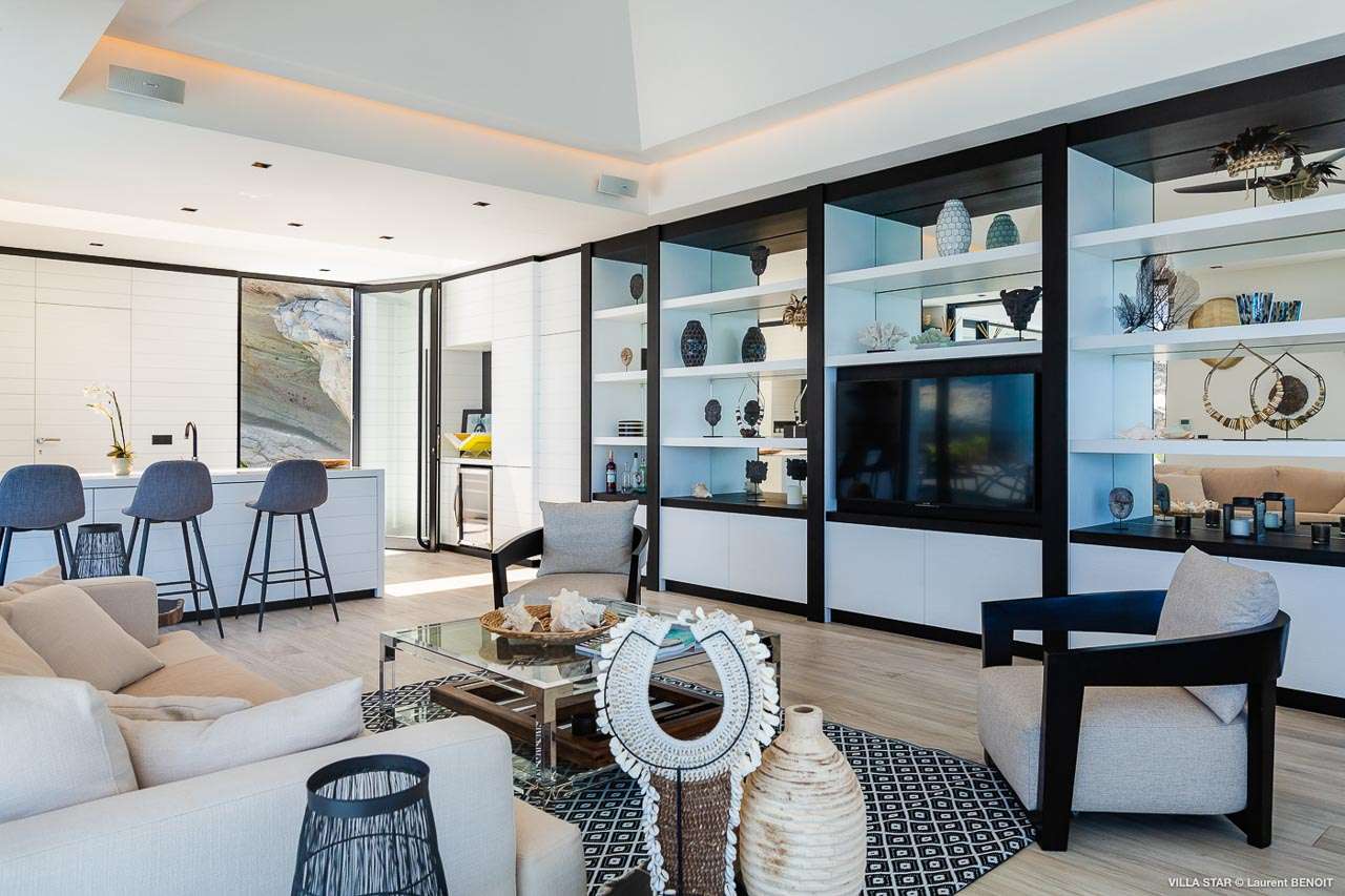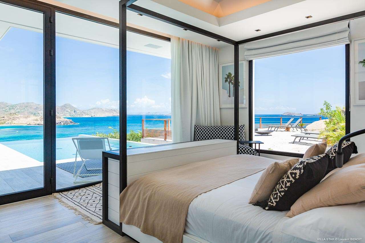 Welcome to Villa Star (villa code: WV TAR), a modern 3-bedroom villa in Camaruche above Lorient Bay, St. Barts. This luxurious home unabashedly celebrates the finer things in life, from the outstanding island views to the high-end design. The interiors of Villa Star are sleek and chic, contemporary white with black trim creating a luxurious atmosphere. Stylish furnishings offer comfortable spots to relax, while large doors let in plenty of island breezes and natural light. Built into the rock of the hillside overlooking Lorient and its magnificent bay, Villa Star offers spectacular views and sunsets. The beach is a short drive away, while nearby St. Jean is an exquisite spot with excellent restaurants and an enticing, laid-back tempo. Fully air-conditioned, the villa’s main room can be a welcome refuge after a long day in the sun. It can also be opened to the natural breezes for those who prefer the feeling of being outside with the comforts of home. This space features the living room, dining area, and kitchen. In the living room, there are comfortable couches that coax you to sink in at any time of the day. Whether you’re reading a good book, watching TV, or indulging in an afternoon nap, this is the most relaxing space inside Villa Star. Next to the living room is the stylish kitchen, with sleek cabinetry and the latest modern appliances. You’ll have no trouble preparing meals for your group here. Our concierge even has a few tricks up their sleeves to make your stay easier, from grocery deliveries to arranging a private chef for an unforgettable in-villa experience. At the far end of the great room is the dining table, sitting in front of the amazing view. Pairing a fine island meal and a bottle of wine with these vistas is a great way to enjoy an evening with family and friends. There are 3 outstanding bedrooms inside Villa Star, quiet places to reflect and recharge each evening. The master bedroom is situated right outside the living room in front of the pool. This room has a large ensuite bathroom with an indoor and outdoor shower. Two more bedrooms are on the lower floor in a hallway next to the parking area and accessed via exterior stairs, both have ensuite bathrooms with indoor showers. All bedrooms benefit from the views and come with a TV, his-and-hers closets, a minibar, and a plush European king-sized bed. Villa Star is situated directly above WV STR and can be rented together for a total of 8 bedrooms. The large outdoor space is centered around the infinity pool and enjoys the sun for most of the day. You could spend countless hours here, sunbathing on loungers with a cool drink between dips in the refreshing water. Around the corner is a lounge area with outstanding views over the shimmering Caribbean below. At sunset, golden light glows across the tropical landscape, lighting up the turquoise waters, the hills on either side and the luxury yachts scattered around the bay. On the other side of Villa Star’s pool is a unique terrace filled with sand, nicknamed “The Beach”. There are loungers here for more sunbathing, and you can scrunch your toes in the soft sand with a drink or two. It’s also a great area to host a beach-themed party, with the terrific vistas acting as a backdrop. During the Thanksgiving and December holidays, the villa rents at full occupancy rates regardless of how many bedrooms are used.Please fill out the form to begin your inquiry and we will connect you with a seasoned villa rental specialist.