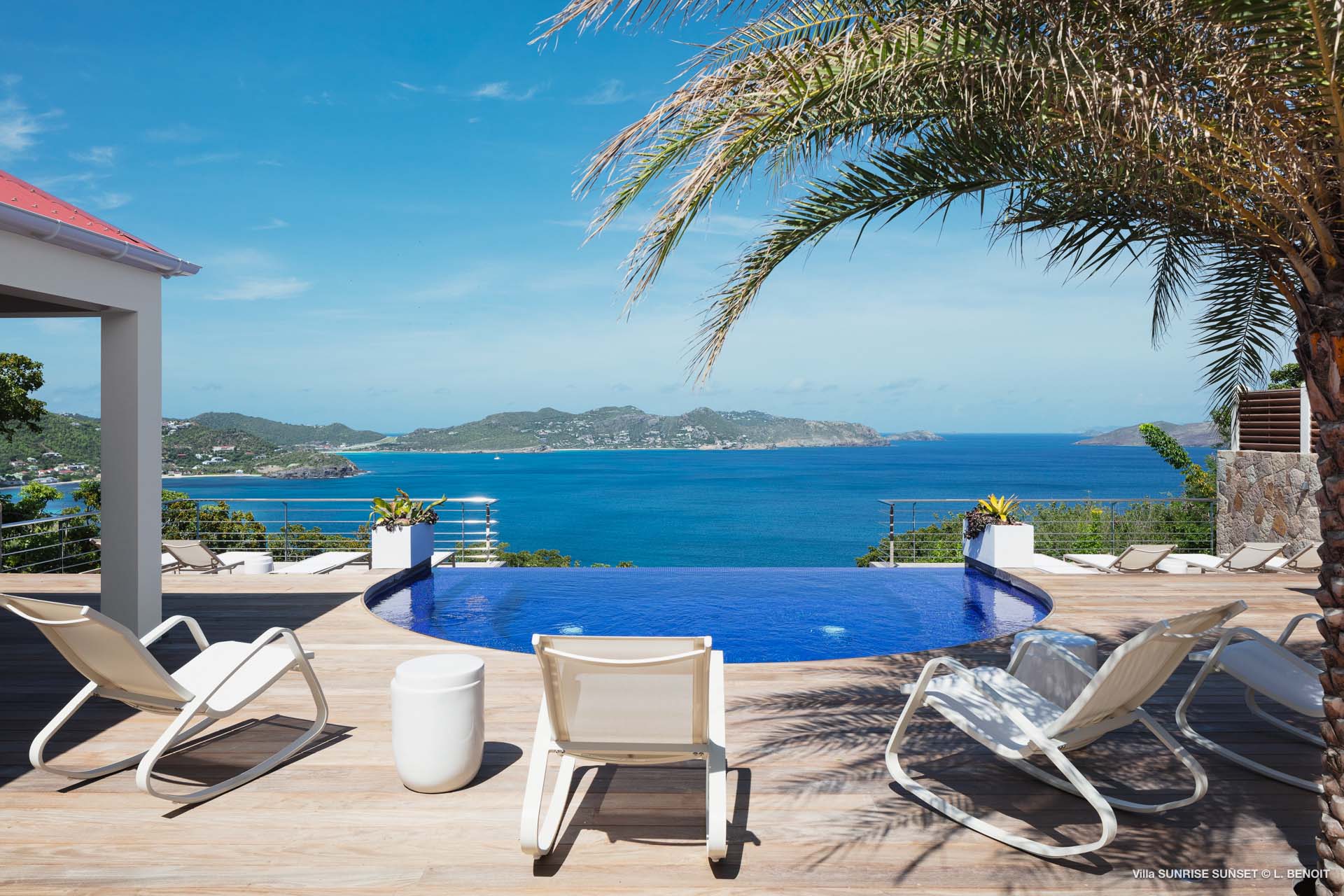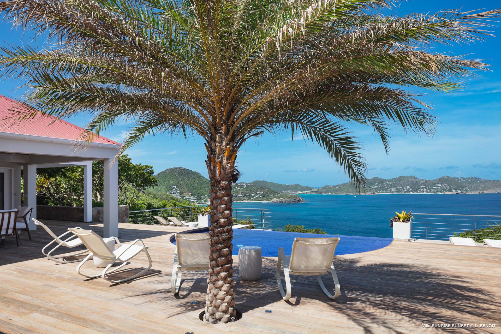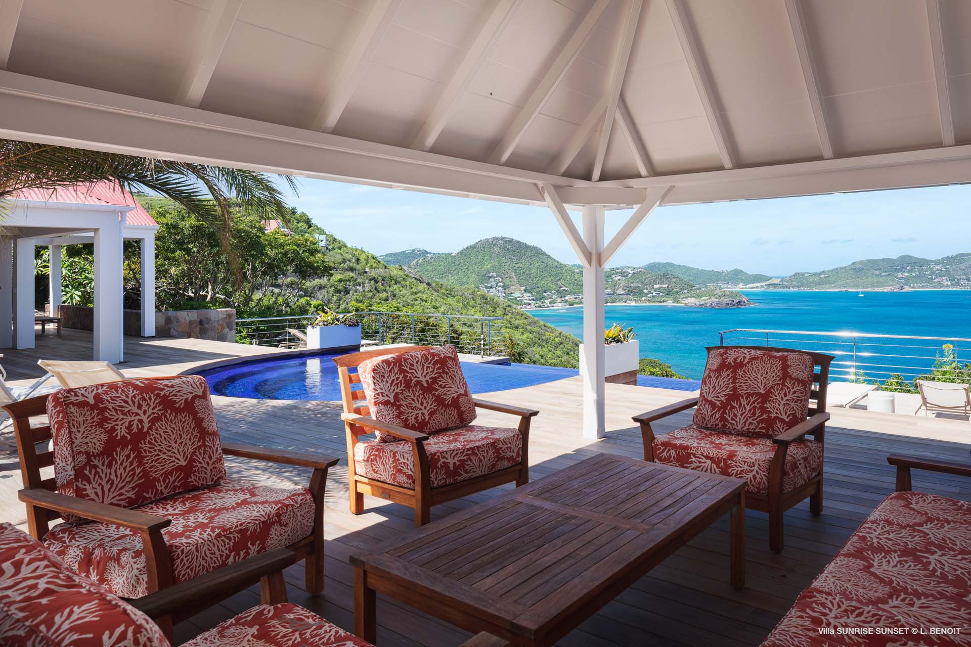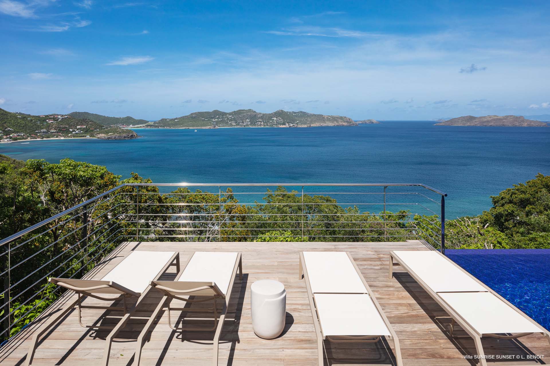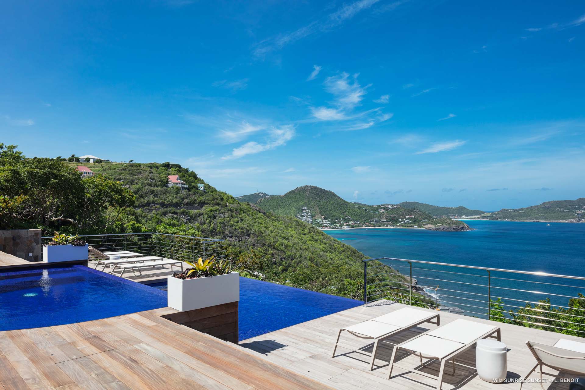 Villa Sunrise-Sunset (villa code: WV SRS) is a rare opportunity to be located high on the coveted Ridge Road in beautiful Point Milou. From here you will enjoy stunning views of the Caribbean as well as St Martin, Anguilla, and the sun as it sets behind St Bart’s airport. Have your morning coffee on the Atlantic side terrace with the sunrise. The Caribbean side offers a spacious deck with a heated pool cascading down into the lower-level pool. The bench in the upper pool is perfect for sipping your sunset cocktails and taking in the breathtaking panorama. The terrace offers sun and shade as well as abundant living and dining options. The house has a spacious living room open to both the Caribbean and Atlantic side terraces, a formal dining area as well as a separate TV room, and a new contemporary kitchen. The main house has 2 air-conditioned bedrooms with ensuite baths and a patio that opens to the sea. Adjacent to the main house is a very spacious air-conditioned guest house with an ensuite bath along with a sitting and coffee area, as well as a private deck overlooking the Atlantic. The home was newly-renovated and furnished in 2023. Villa Sunrise-Sunset is a lovely vacation home that will suit honeymooners, couples as well as families with children.Please fill out the form to begin your inquiry and we will connect you with a seasoned villa rental specialist.