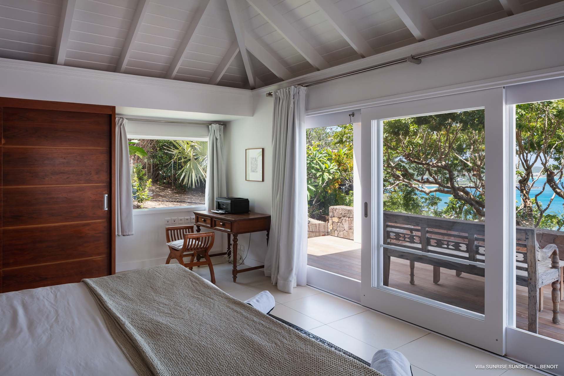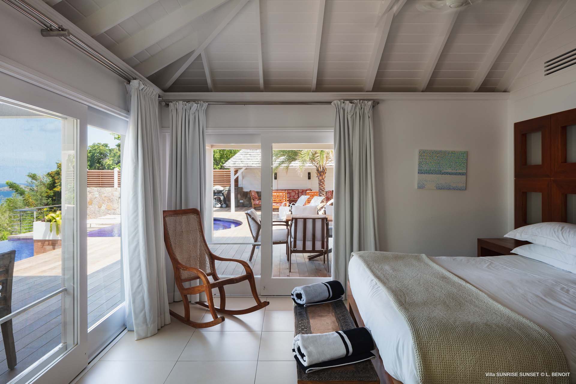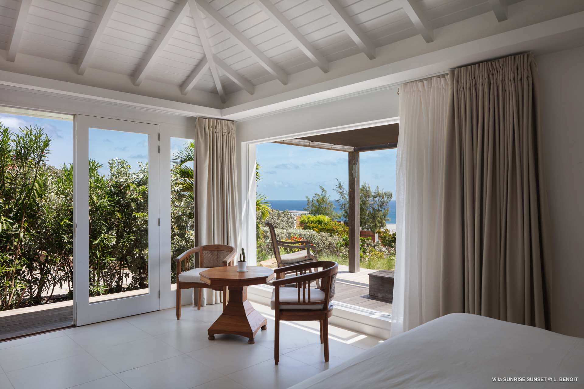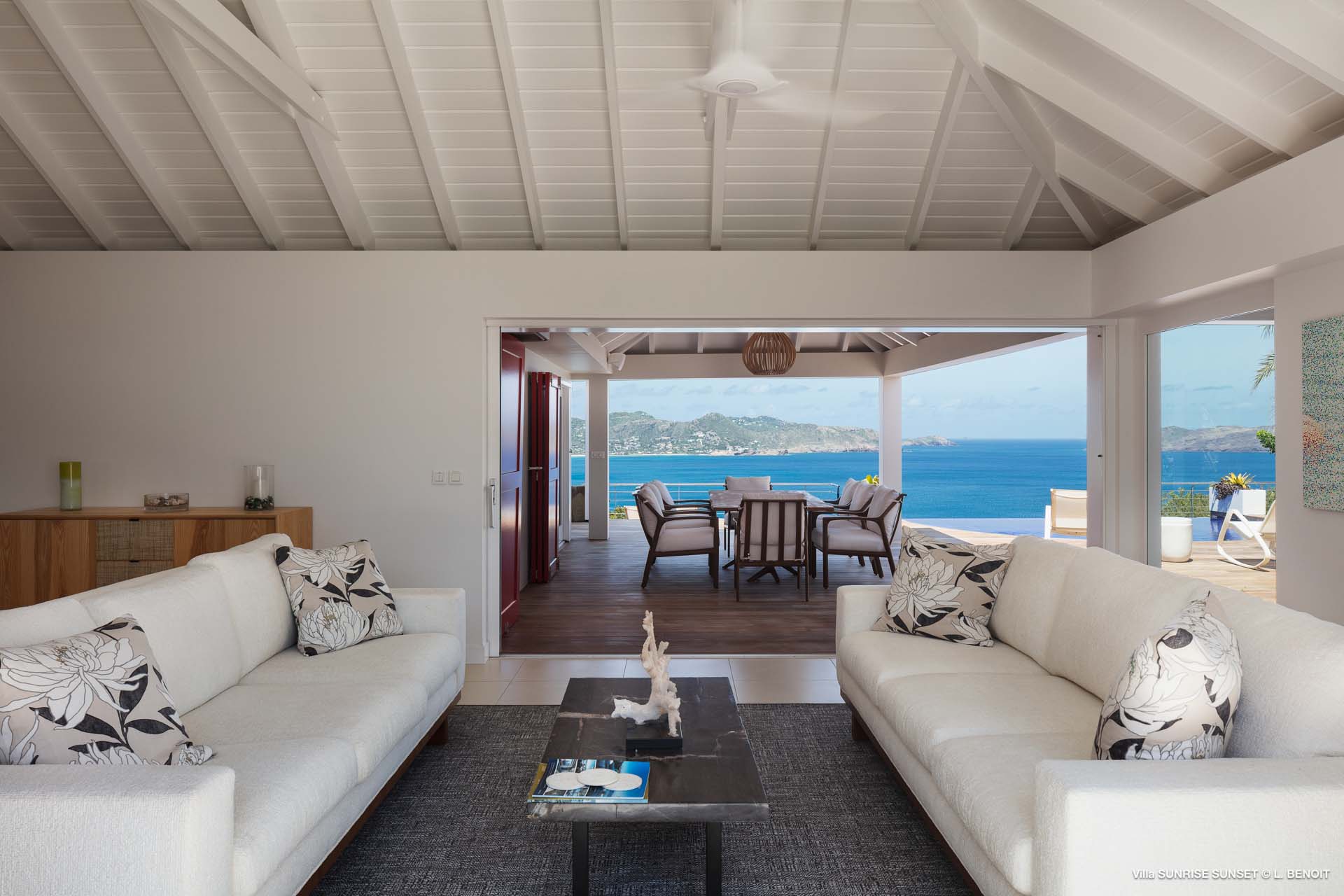 Villa Sunrise-Sunset (villa code: WV SRS) is a rare opportunity to be located high on the coveted Ridge Road in beautiful Point Milou. From here you will enjoy stunning views of the Caribbean as well as St Martin, Anguilla, and the sun as it sets behind St Bart’s airport. Have your morning coffee on the Atlantic side terrace with the sunrise. The Caribbean side offers a spacious deck with a heated pool cascading down into the lower-level pool. The bench in the upper pool is perfect for sipping your sunset cocktails and taking in the breathtaking panorama. The terrace offers sun and shade as well as abundant living and dining options. The house has a spacious living room open to both the Caribbean and Atlantic side terraces, a formal dining area as well as a separate TV room, and a new contemporary kitchen. The main house has 2 air-conditioned bedrooms with ensuite baths and a patio that opens to the sea. Adjacent to the main house is a very spacious air-conditioned guest house with an ensuite bath along with a sitting and coffee area, as well as a private deck overlooking the Atlantic. The home was newly-renovated and furnished in 2023. Villa Sunrise-Sunset is a lovely vacation home that will suit honeymooners, couples as well as families with children.Please fill out the form to begin your inquiry and we will connect you with a seasoned villa rental specialist.