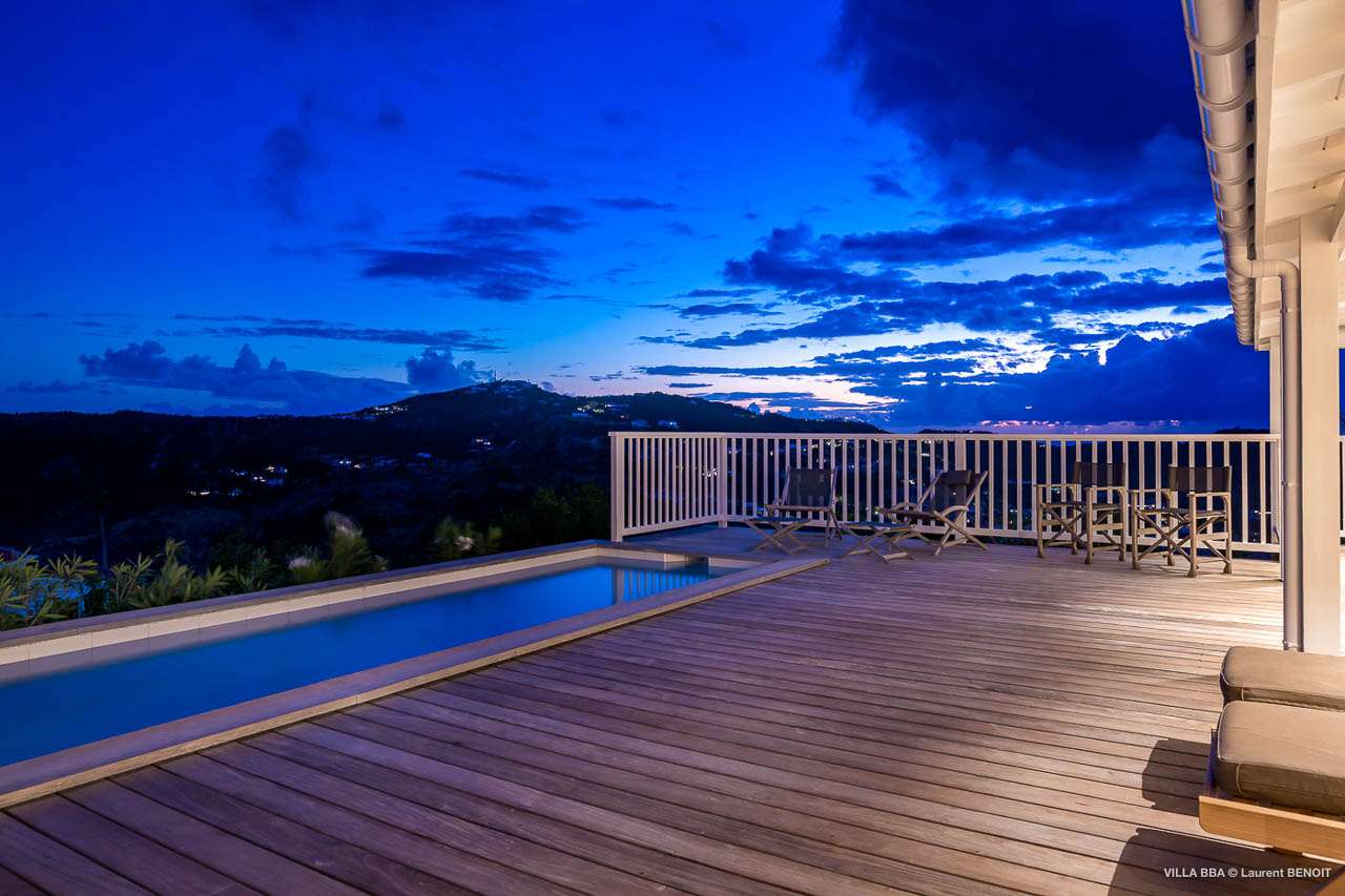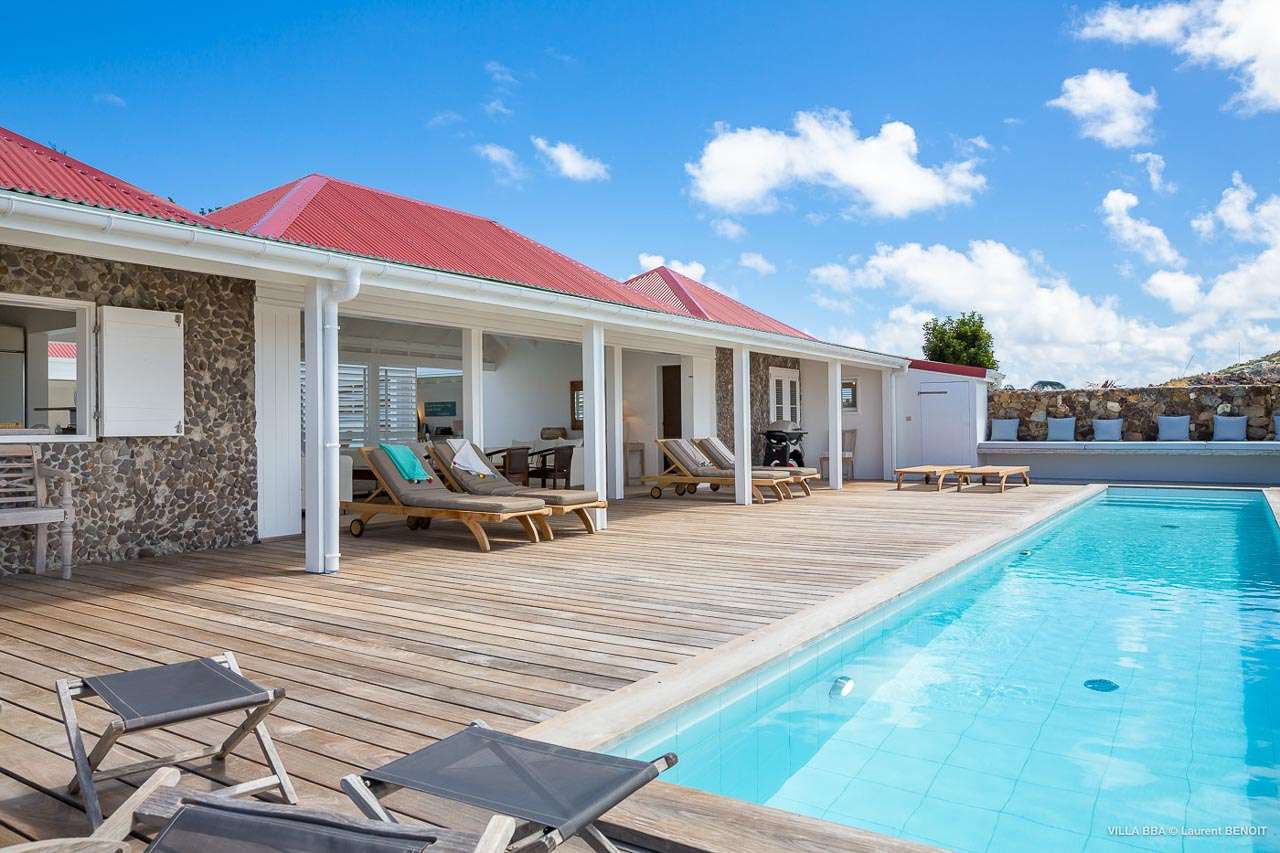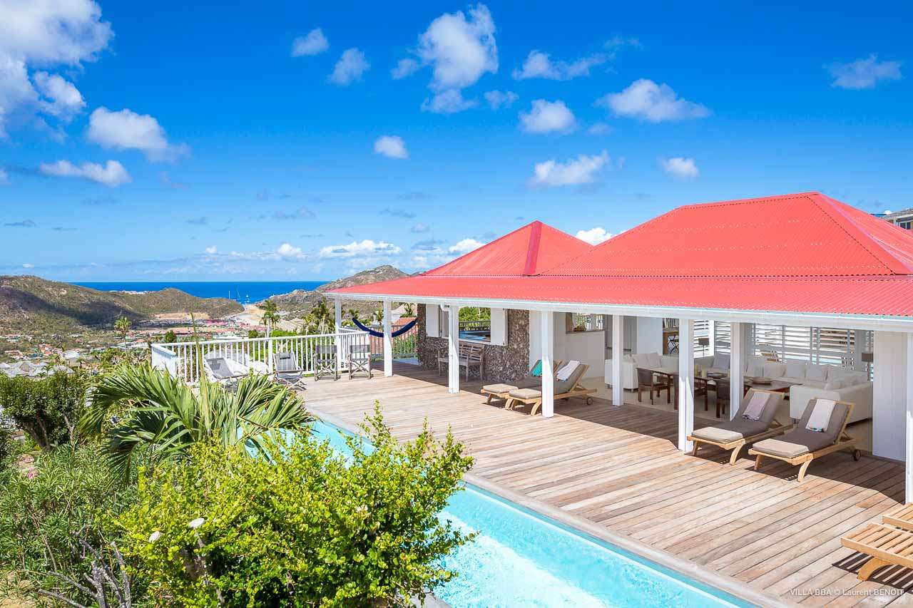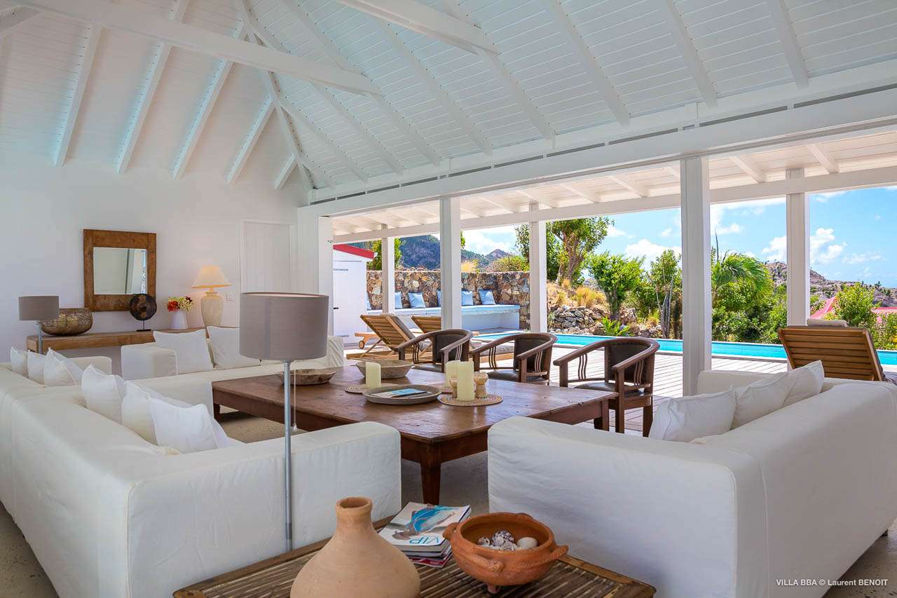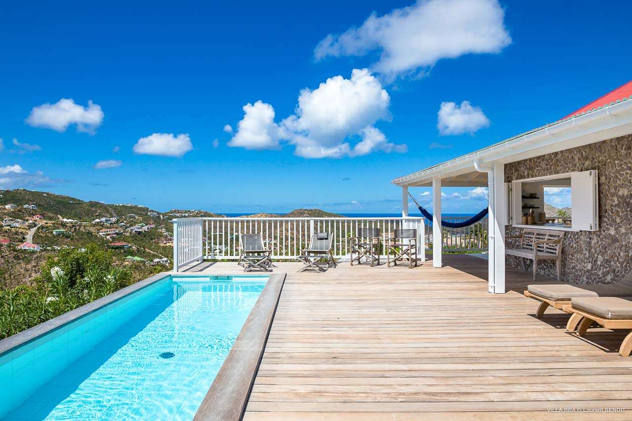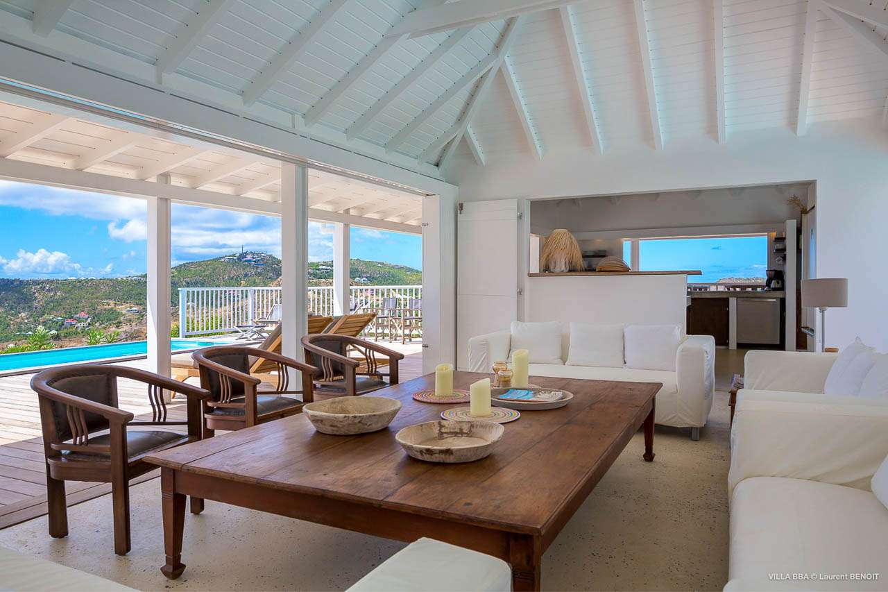 Welcome to Villa Super Sky (villa code: WV BBA), a stunning 3-bedroom villa located in the hills above St. Jean Bay within minutes of beaches and shopping. The key to this villa is all in its name. Perched high in the hills of St. Barts, from this lofty vantage point you can enjoy breathtaking panoramas of the Caribbean and rugged coastline of St. Barts. The unique design of Villa Super Sky is easy to love. The home is set around a central courtyard with a pool, wall-to-wall doors opening wide to the stunning views – and even a second pool. The interiors embrace a casual, island elegance, with natural fabrics and rustic wood blending superbly with earthy stone walls. The fantastic location puts you within easy reach of three beaches: St. Jean, Lorient, and Saline. From here you are also less than 10 minutes from the elegant restaurants and boutiques of Gustavia, making this a fantastic choice for an island getaway on St. Barts. A comfortable and spacious living room overlooks the outdoor terrace. Soft sofas offer nice spots to sink in and unwind, while the doors on either side wash the space in the sea breeze. You’ll immediately want to grab a good book, settle in for a nap, or enjoy a cocktail hour at sunset in this magnificent setting. Next to the inner courtyard is another comfortable lounge area. While open to the plunge pool, it’s a great spot to unwind between swims. Otherwise, the room closes entirely off and transforms into a media room, complete with a large TV for a movie night. Connected to the living room is Villa Super Sky’s modern kitchen. Well-equipped with the latest appliances and a portable wine cellar, cooking here is a breeze. Our concierge can even organize grocery pre-stocking or delivery, catered meals, or arrange private chef service for a special occasion. Flowing on from the kitchen is the dining room, with a beautiful and rustic wooden table that seats 8 guests. Opening to a covered terrace, the views over the rolling hills from here are stunning, the ideal accompaniment to an island feast. There are 3 bedrooms at Super Sky Villa, each occupying its own corner of the house to ensure privacy between guests. Two of the bedrooms have king-sized beds, while the third bedroom has twin beds. Each bedroom comes with air-conditioning, a spacious ensuite, and screened windows so you can fall asleep to the cool island trade winds. The inner courtyard surrounds Villa Super Sky’s plunge pool, a fantastic spot to cool off during the day. To one side is a covered lounge area, a nice spot for a cool drink or bite to eat before diving back in the water. On the other side of the living room is the villa’s lap pool, overlooking the lush hills of St. Barts. Loungers lining the water let you bask in the island sun. From this vantage point high in the hills, the sunsets are stunning. A large terrace has an extended covered lounge area, which is ideal for either sunbathing or relaxing in the shade. For days on the beach, you’re spoilt for choice – 5 minutes by car are some of St. Barts’ most stunning stretches of sand. To the north is Lorient, while St. Jean lies to the west. For something quieter and more understated, Saline Beach is to the south. During the December holidays, the villa rents at the full occupancy rate regardless of how many bedrooms are used.Please fill out the form to begin your inquiry and we will connect you with a seasoned villa rental specialist.