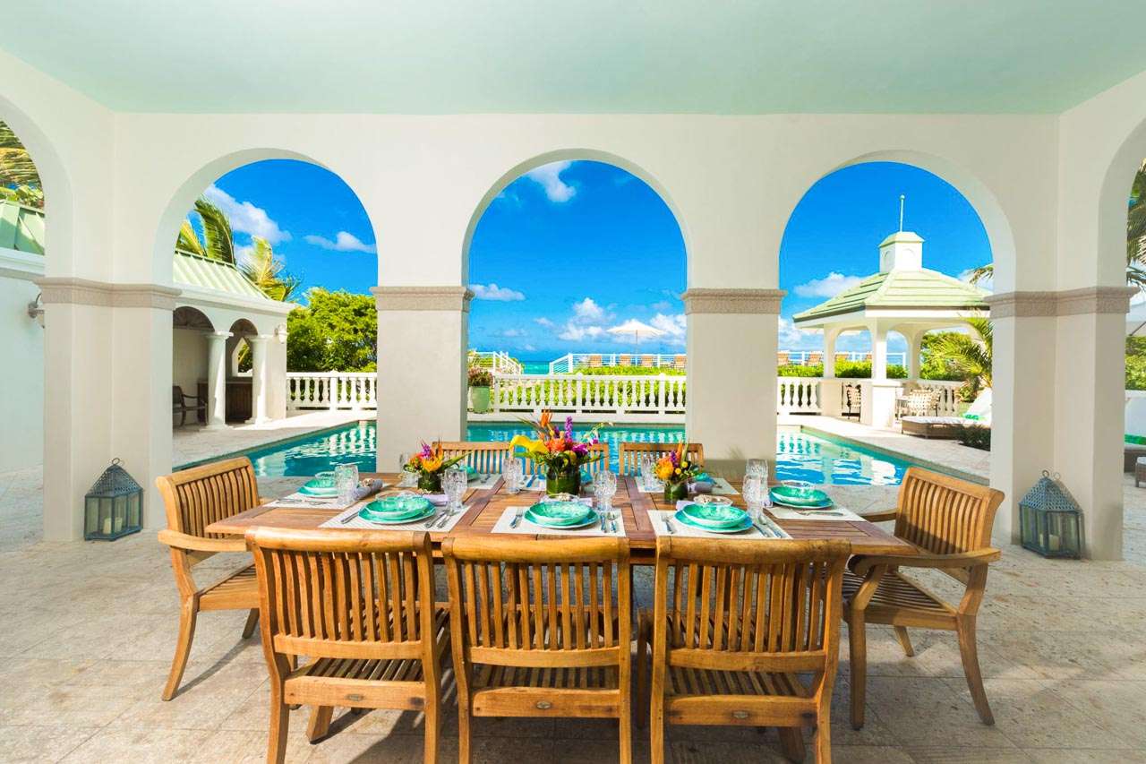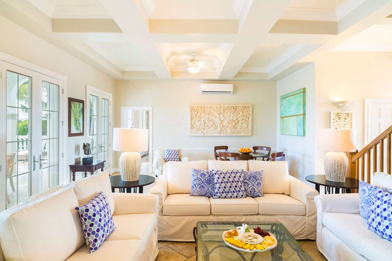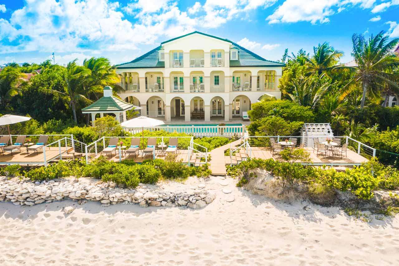Welcome to Villa Tamarind (booking code: IE TAM), a colorful and contemporary 6-bedroom villa located on Grace Bay Beach, Providenciales. Just steps from the sand, and a short walk to restaurants and shops at Turtle Cove Marina, this is a refined and luxurious beachfront home. With a grand and elegant design, this is a Caribbean palace fit for royalty. Inside is bright and beautiful, featuring a flowing open-plan and gorgeous high ceilings. Spread over 3 levels, there’s a lot of amazing ocean views to enjoy from every room, while just a short walk in the other direction is Turtle Cove Marina, offering restaurants, shops, and cafes. Located on a prime stretch of Grace Bay Beach, this envious location is hard to beat. But the best part? Under the calm and clear surface is Smith’s Reef, directly opposite the villa. Offering the finest snorkeling in Providenciales, diving in reveals colorful corals, tropical fish, and vibrant marine life. It doesn’t get much better than that. Living Room: The living room has comfortable sofas facing towards a large flat-screen TV. You’ll love sinking in here to unwind, feeling the gentle island breeze drift through the French doors and admiring the view. This is the ideal space to gather after dinner and settle in for a drink and some conversation. Dining Room and Kitchen: Adjacent to the living room is the dining table, which comfortably seats 10 guests. It’s a lovely place for a dinner party during your stay, enjoying the company of friends and family. Foodies will immediately feel at home in the villa’s comfortable kitchen, with everything you need for your stay. With lovely views over the pool towards the ocean, inspiration for gourmet Caribbean dishes comes easy. Bedrooms: With 6 bedrooms spread across the three levels, there’s plenty of room to spread out in Villa Tamarind. Each room comes with a deluxe king-sized bed, air-conditioning, ensuite bathroom, and a large flat-screen TV. Two bedrooms on the top floor and three on the second floor each have a private balcony overlooking the pool and ocean beyond. The suite on the ground floor opens to the pool terrace. Every space is quiet and relaxing, with airy canopy beds and island furnishings exuding an island charm. You’ll wake up every morning feeling refreshed and recharged, ready for another day of languishing by the ocean or exploring the beautiful island of Provo. Outdoor Features: Warm island days are best spent outside, where a grand shaded terrace gives way to the villa’s luxurious swimming pool. Cooling dips are the order of the day here, while loungers let you bask in the island sun. Following the wooden boardwalk towards the beach leads you to a set of elevated beach decks. On one are a set of tables, perfect for an evening aperitif hour with some punchy island rum cocktails. On the others, sunbeds encourage you to collapse and recharge after dips in the turquoise water. Back at the main terrace, a gazebo with a gas grill lets you host your own island-style fish fry. Grilling while the setting sun sends tinges of golden light across the villa is exactly what Caribbean vacations are all about. Amenities: Thoughtful design at Villa Tamarind helps elevate your stay. The fully air-conditioned house also has high-speed Wi-Fi, an outdoor shower, gated entry, and 2 washers and dryers. Please note that the air-conditioning in Villa Tamarind is metered; guests are allotted the first $200, after which it will be charged at the market rate + 12% tax. There are 9 separate air-conditioning systems throughout the property, letting you cool certain parts as needed. Although with a near-constant trade wind, it’s rare that you’ll exceed the AC allotment during your stay. Villa Tamarind rents at full occupancy rates during the Thanksgiving and December holidays, regardless of how many bedrooms are used.