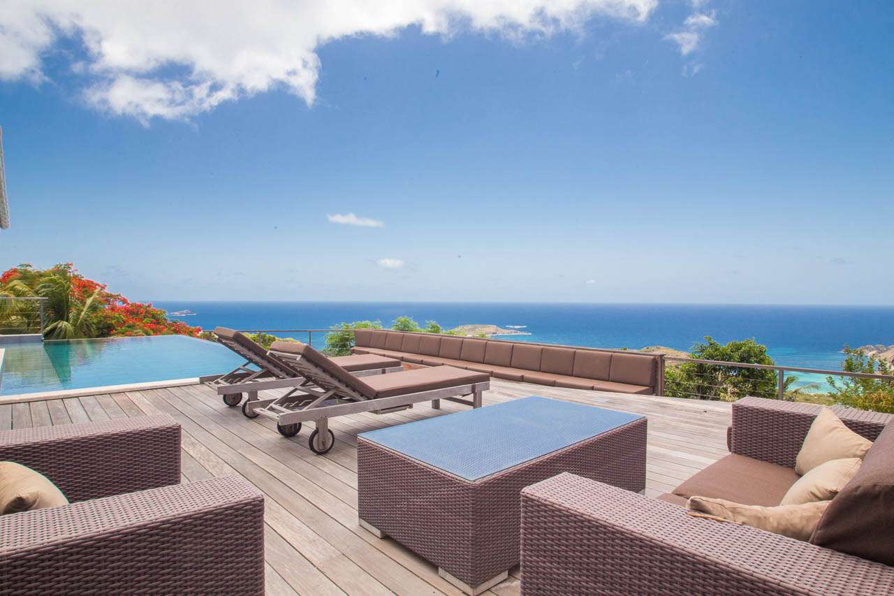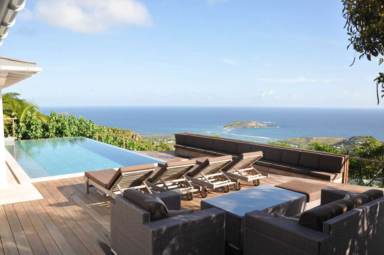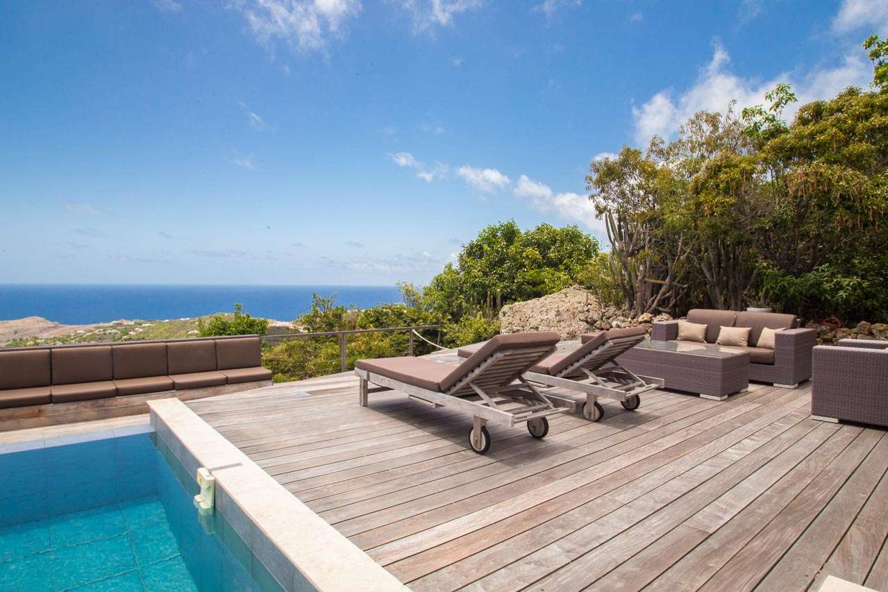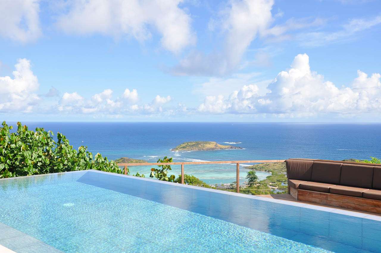Villa Teddy (villa code: WV TED) is a 2-bedroom villa located in Vitet within minutes of the beach and shopping. This hillside villa offers panoramic ocean views. To the right of the entrance and a Koi pond is an open, modern kitchen with a breakfast bar and pantry. The living room is furnished with inviting chairs and a sofa. The 2 bedrooms are located on either side of the living room. Both bedrooms have ensuite bathrooms. Both bedrooms have king-size beds, ocean views, and screens for sleeping without air-conditioning. The enormous deck offers several seating and lounging areas, all with sweeping views. The large, infinity-edge pool is ideal for a refreshing swim. During the December holidays, the villa rents at the full occupancy rate regardless of how many bedrooms are used.Please fill out the form to begin your inquiry and we will connect you with a seasoned villa rental specialist.