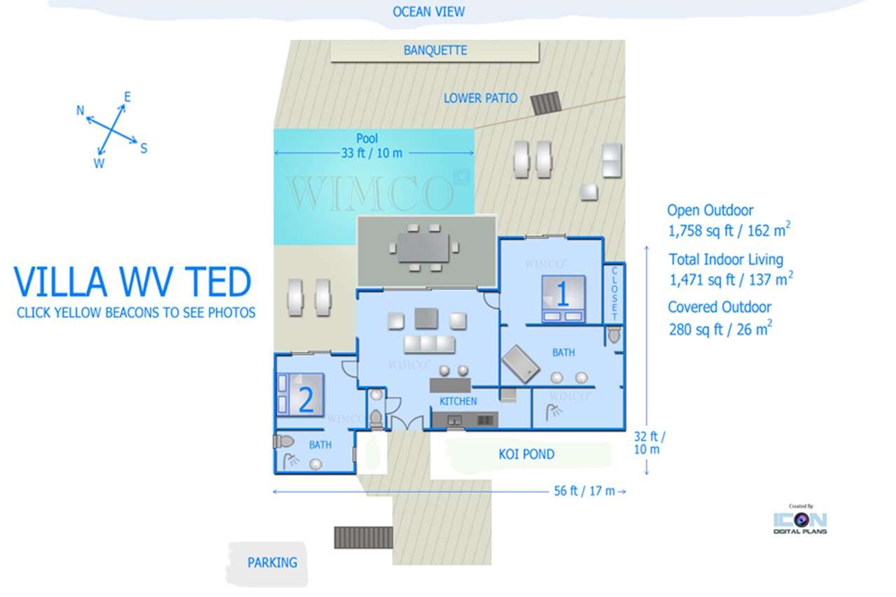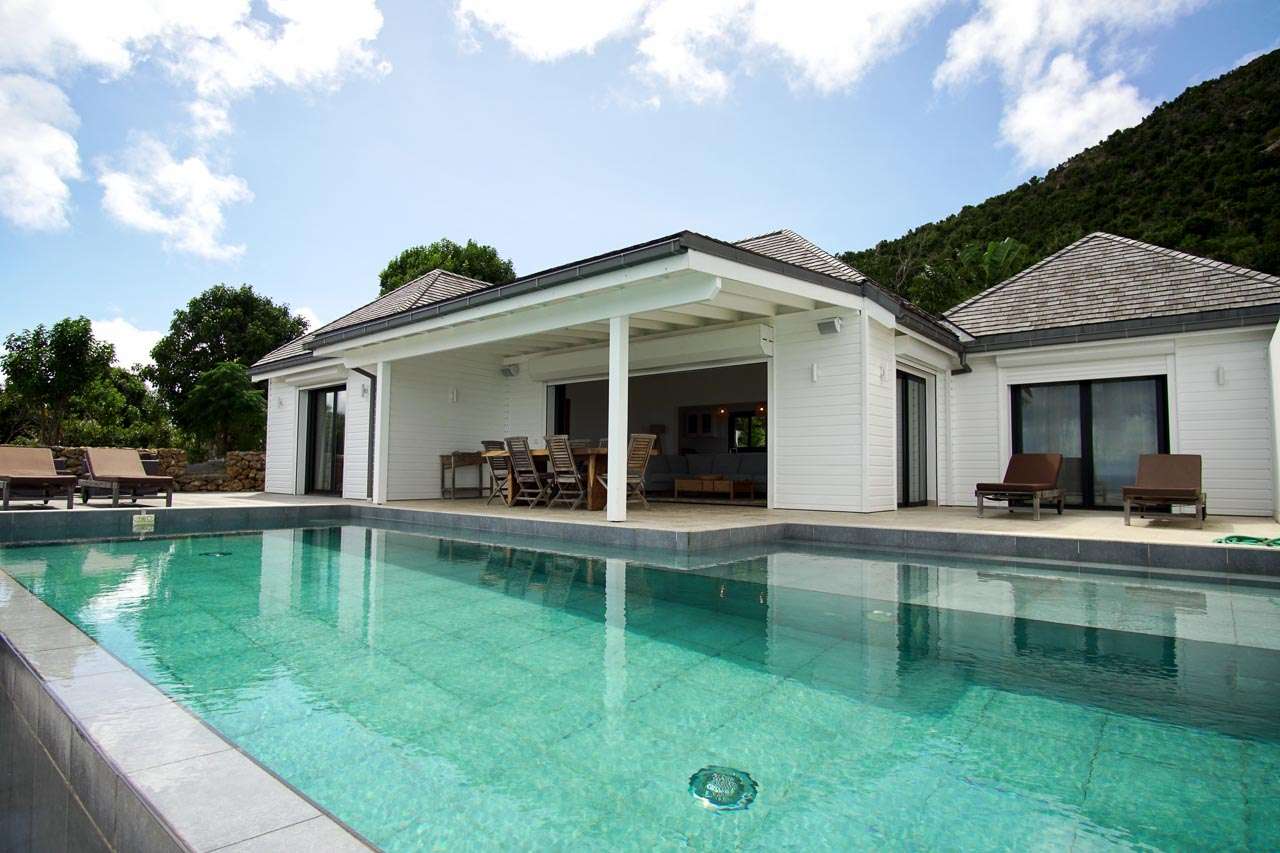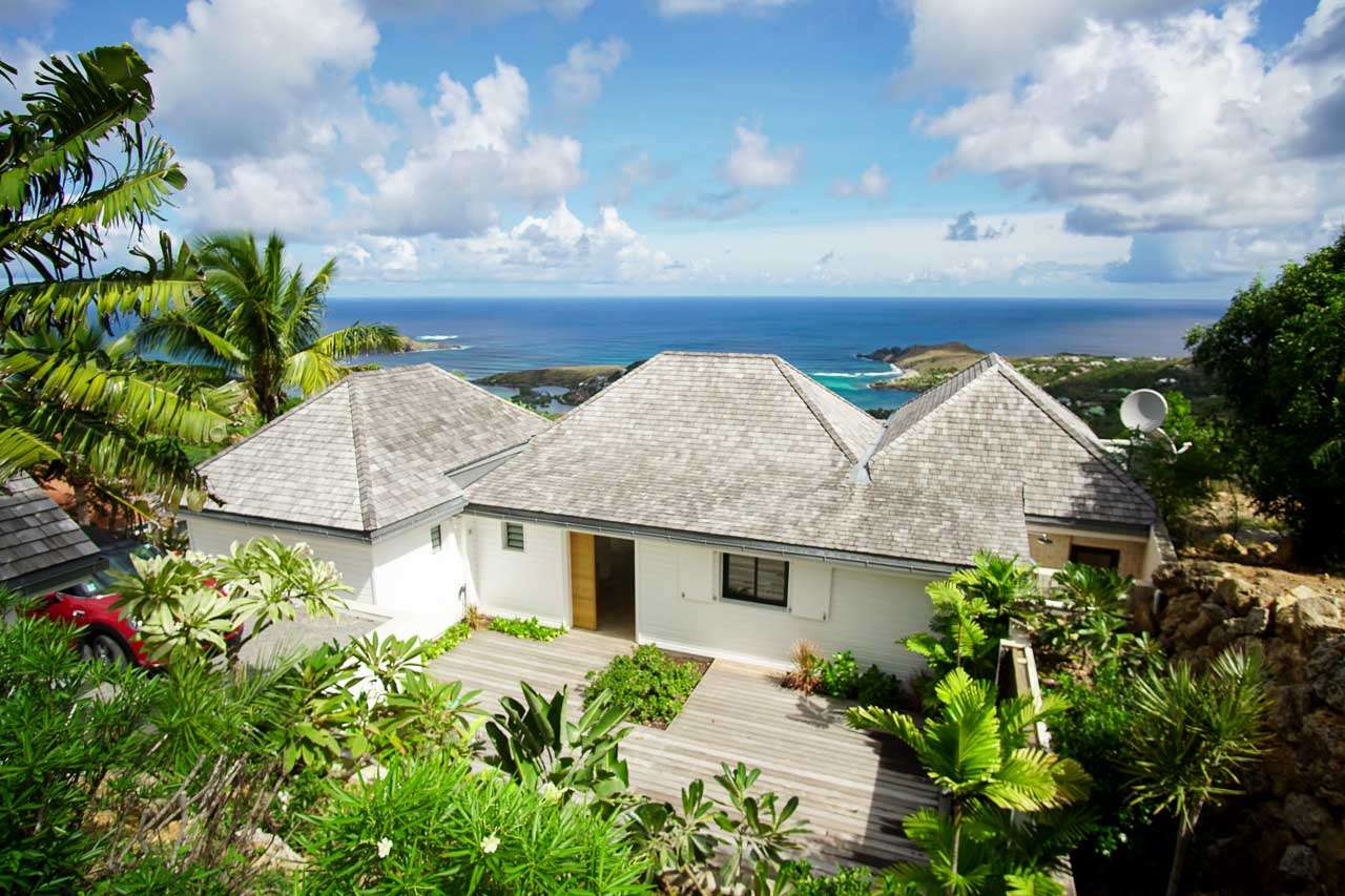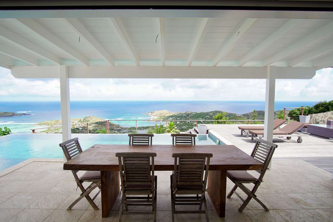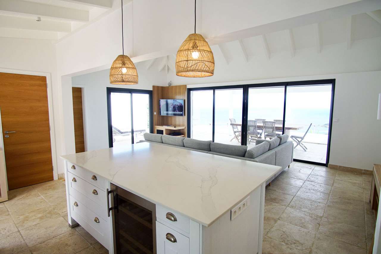 Villa Teddy (villa code: WV TED) is a 2-bedroom villa located in Vitet within minutes of the beach and shopping. This hillside villa offers panoramic ocean views. To the right of the entrance and a Koi pond is an open, modern kitchen with a breakfast bar and pantry. The living room is furnished with inviting chairs and a sofa. The 2 bedrooms are located on either side of the living room. Both bedrooms have ensuite bathrooms. Both bedrooms have king-size beds, ocean views, and screens for sleeping without air-conditioning. The enormous deck offers several seating and lounging areas, all with sweeping views. The large, infinity-edge pool is ideal for a refreshing swim. During the December holidays, the villa rents at the full occupancy rate regardless of how many bedrooms are used.Please fill out the form to begin your inquiry and we will connect you with a seasoned villa rental specialist.