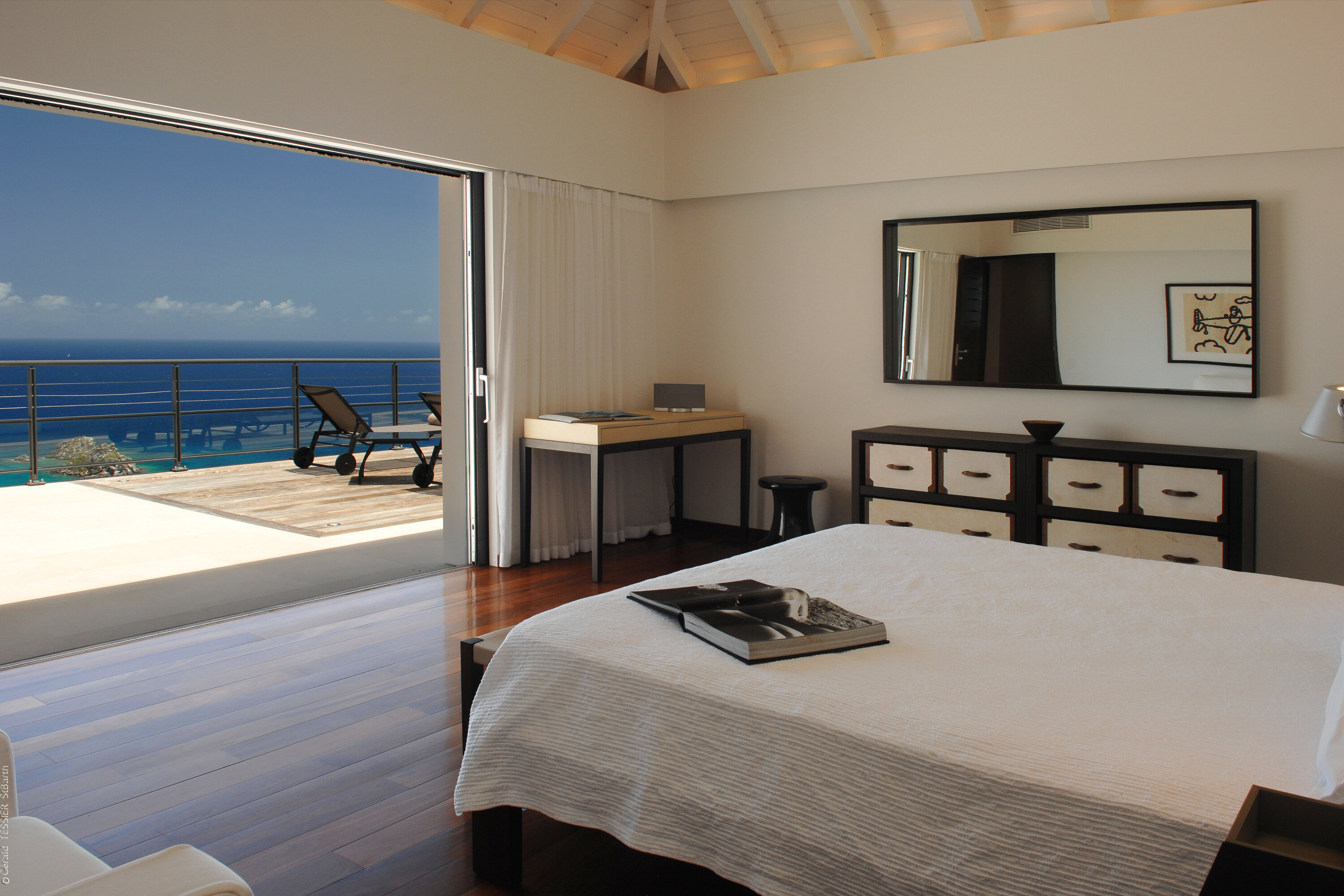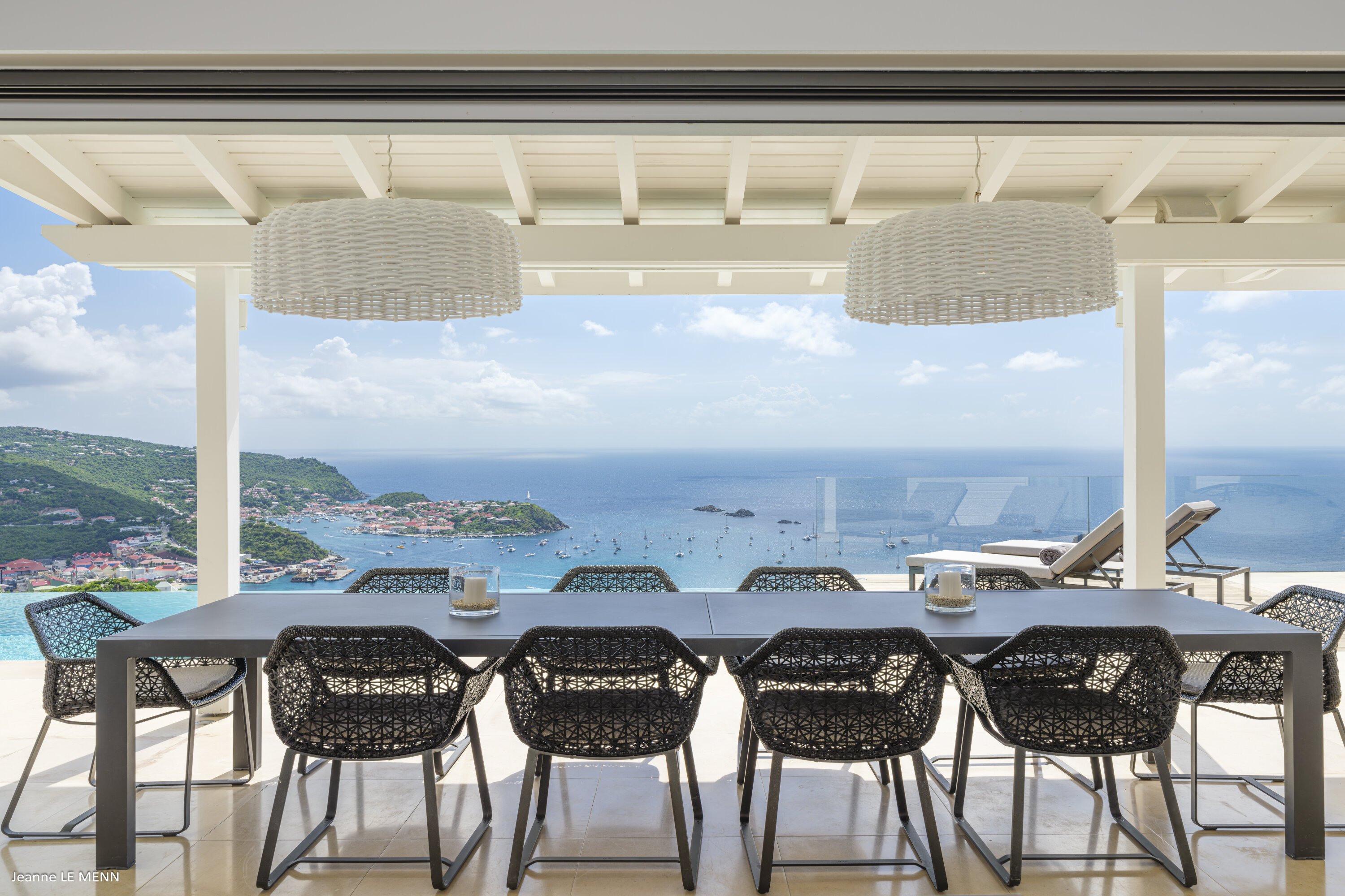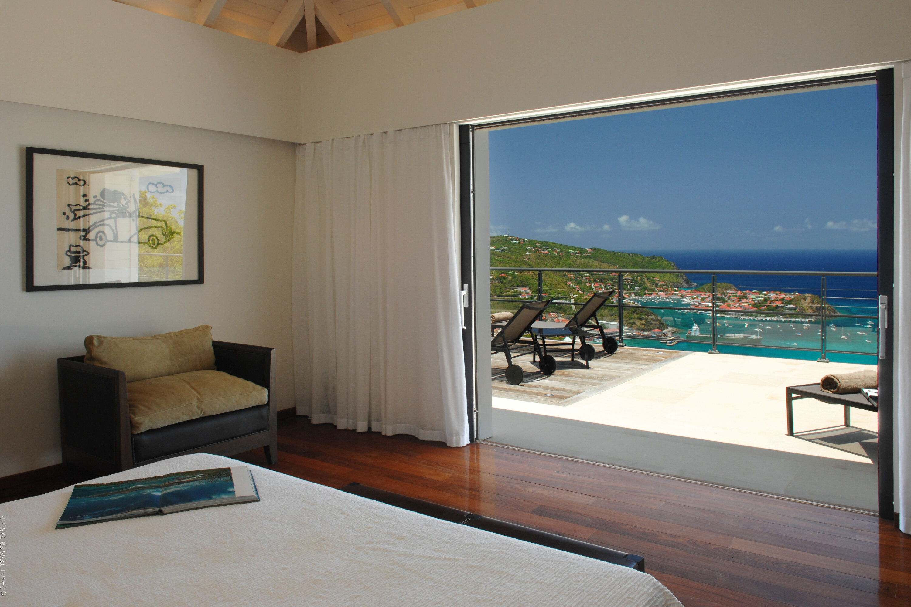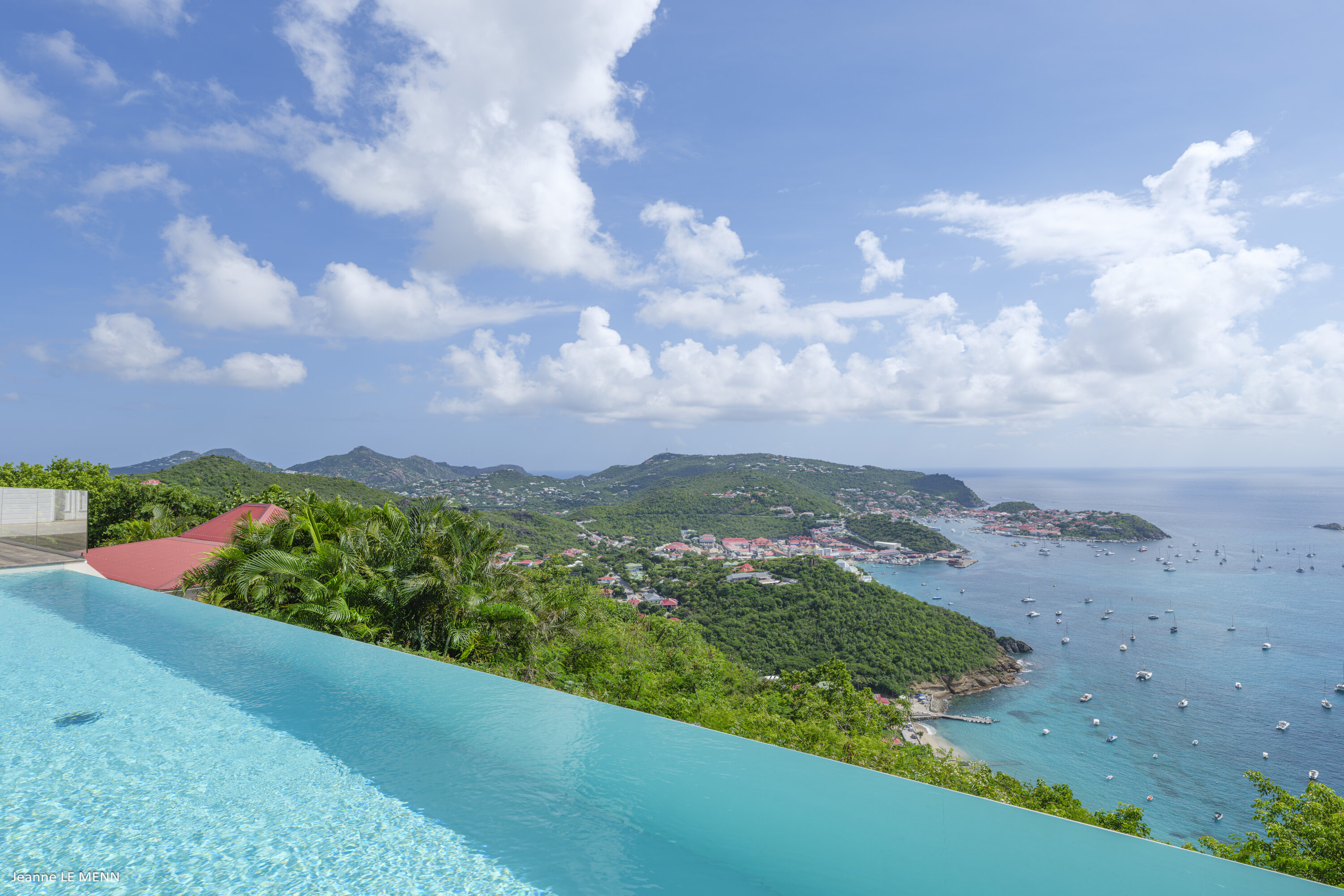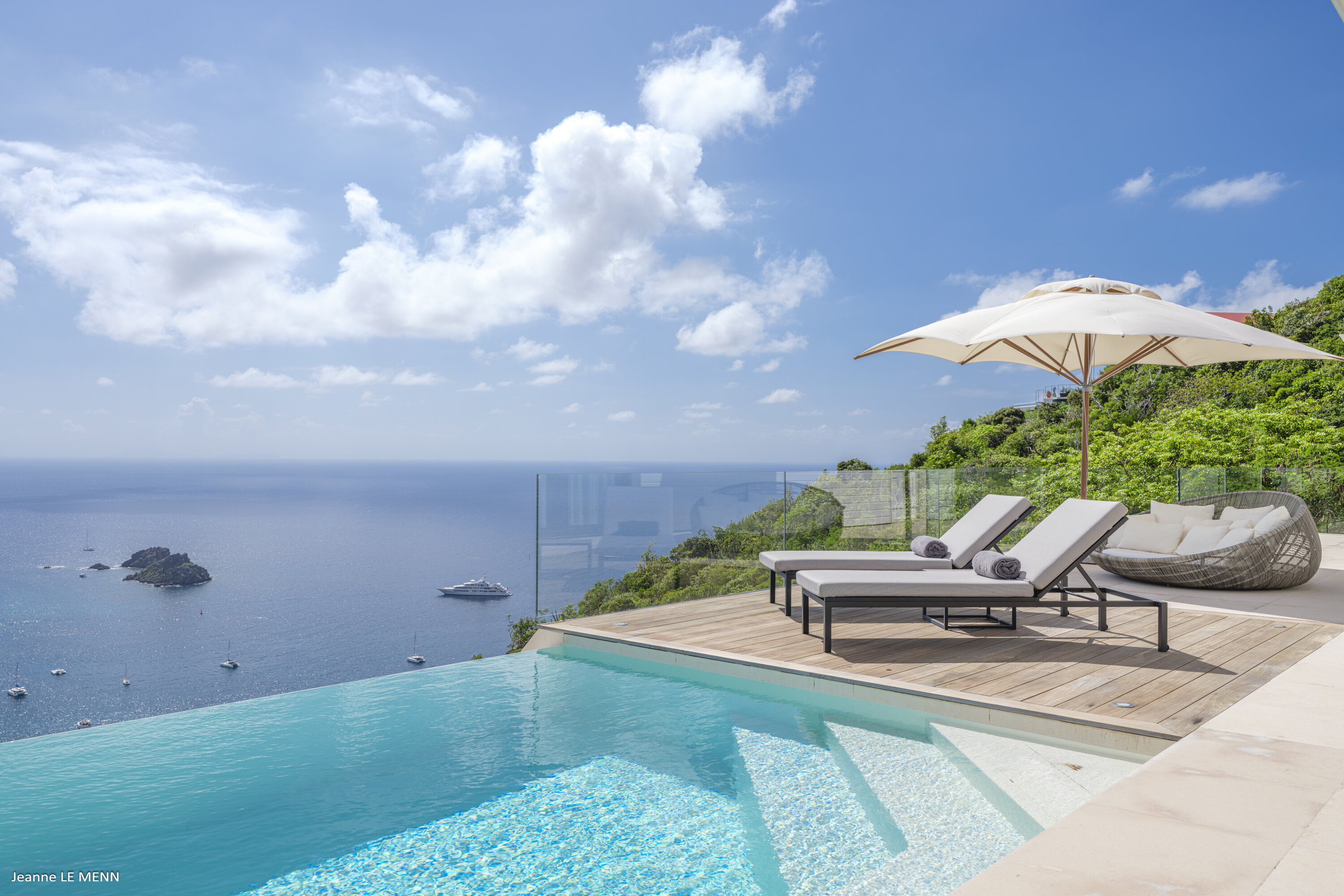 Welcome to Villa "The View” (villa code: WV VUE), a contemporary 4-bedroom villa in Colombier, St. Barts. Located high on the hillside, this villa offers spectacular panoramic views of nearby islands and Gustavia harbor, as well as beautiful sunsets. Elegant and refined, the interiors of The View Villa exude an effortless grace. Chic décor is complemented by a unique collection of leather and parchment designer furniture, in earthy, natural hues. The seamless and beautiful blend of indoor and outdoor spaces makes for a glamorous stay in the Caribbean. From the high vantage point, guests can enjoy stunning views over the Caribbean and the islands of Saba, Saint Eustatius, and Saint Kitts & Nevis. Both Flamands Beach and St Jean Beach are just a short drive away. Stone steps lead down to Villa The View’s entrance, where trickling sounds from a stone waterfall set a soothing tone for your stay. The door leads you into a covered outdoor hallway, with the living room to your left and kitchen and dining to your right. The spacious living room opens wide to the outdoor terrace, with soft sofas inviting you to sink in and unwind. Dark hardwood furnishings add a touch of class, while the views over the infinity pool make it look as if it overflows into the ocean beyond. The modern kitchen at Villa The View is a gourmet foodie’s delight. Featuring high-end appliances and even a wine cave, cooking here is a breeze. Our concierge can organize grocery pre-stocking or delivery, catered meals, or arrange private chef service for a special occasion. Next to the kitchen is the indoor dining area, which opens to the covered terrace with an outside table. Both areas have exquisite views over Gustavia and the Caribbean sea; a wonderful accompaniment to a gourmet feast. There are 4 spacious and comfortable bedrooms at Villa The View. Spread across multiple levels of the property, each offers the utmost privacy for your stay. There are two bedrooms on the main level, featuring incredible views and large ensuite bathrooms with double vanities and spacious showers. The third master suite is on the level below the main house, with its own private stairway and furnished deck area. The fourth suite is down one level more, in its own separate cottage. Completely private from the main villa, this suite enjoys a lounge area, office space, and a huge ensuite bathroom. On the private terrace, there’s even a Jacuzzi, an ideal spot for a night of stargazing with a bottle of champagne. On the main level, the outdoor terrace makes the most of the island weather. There’s a plush outdoor sofa for relaxing, loungers for sunbathing, and daybeds for curling up with a good book. The stunning infinity pool is in the center of it all, offering uninterrupted views over the hills below and Gustavia Harbor. You could relax in the water all day, watching yachts sailing back and forth across the glittering sea. For days at the beach, the lovely Flamands Beach is a 5-minute drive. With soft white sand and inviting turquoise water, it’s one of the dreamiest beaches on St. Barts. The restaurants and shops at St Jean beach are less than 10 minutes away. During the Thanksgiving and December holidays, the villa rents at full occupancy rates regardless of how many bedrooms are used. This villa is suitable for children, ages 12 and older.Please fill out the form to begin your inquiry and we will connect you with a seasoned villa rental specialist.