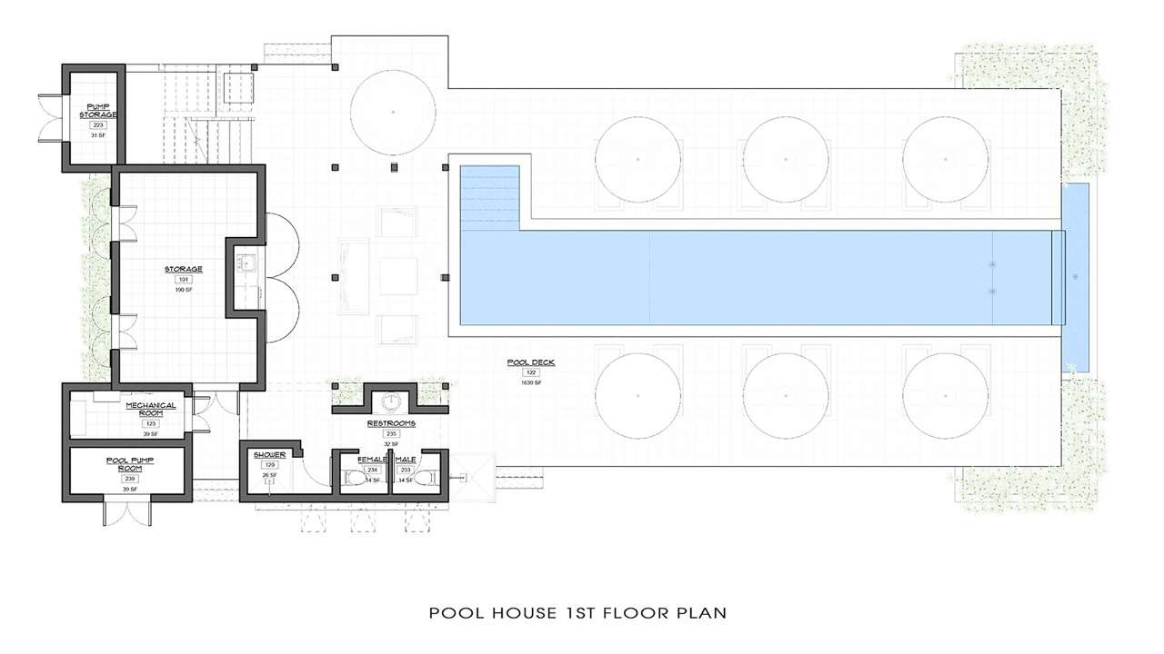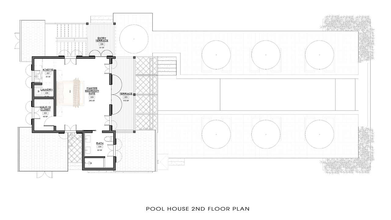 The sparkling lap pool is your own private paradise, lined with large wicker chaises for 12 guests. You could spend all day sunning yourself here, every now and then slipping into the water. The ground floor of the pool house also has a wet bar for cocktails, a screened porch, and an outdoor shower for rinsing after your dip.