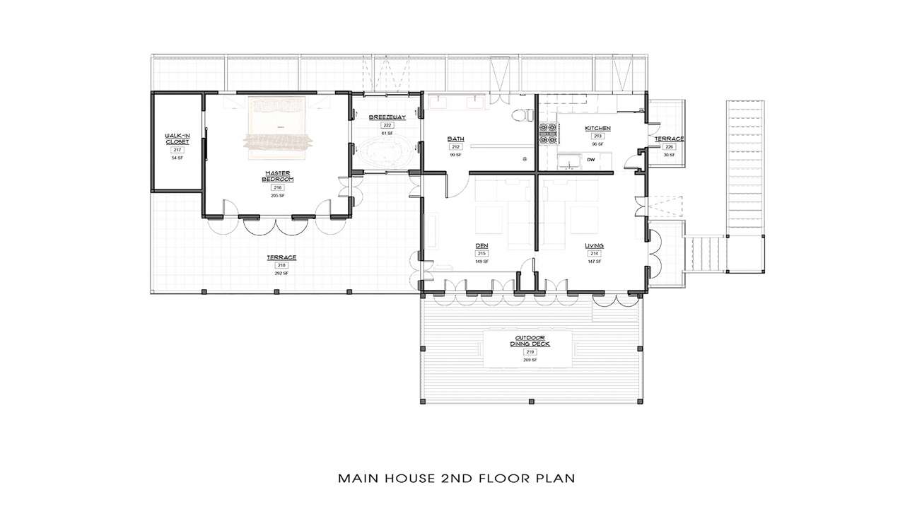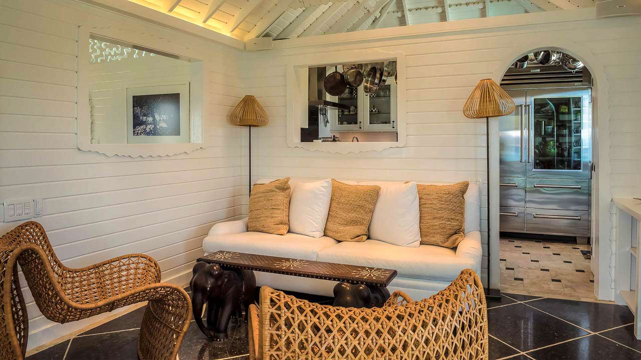 The second level of the main house features a cozy den, dining room, and kitchen. In the den are soft sofas, ideal for sinking in and relaxing with some TV. The classic island style is charming and slightly retro, while the sea breeze floats in through the window.