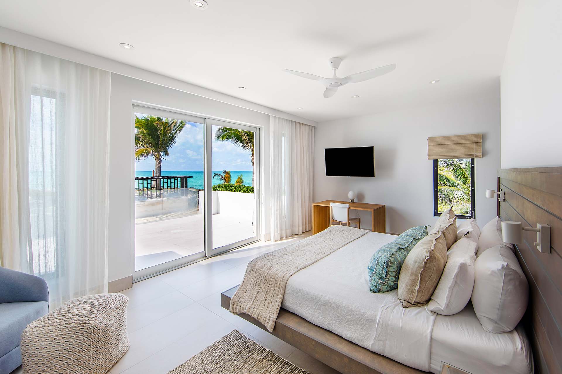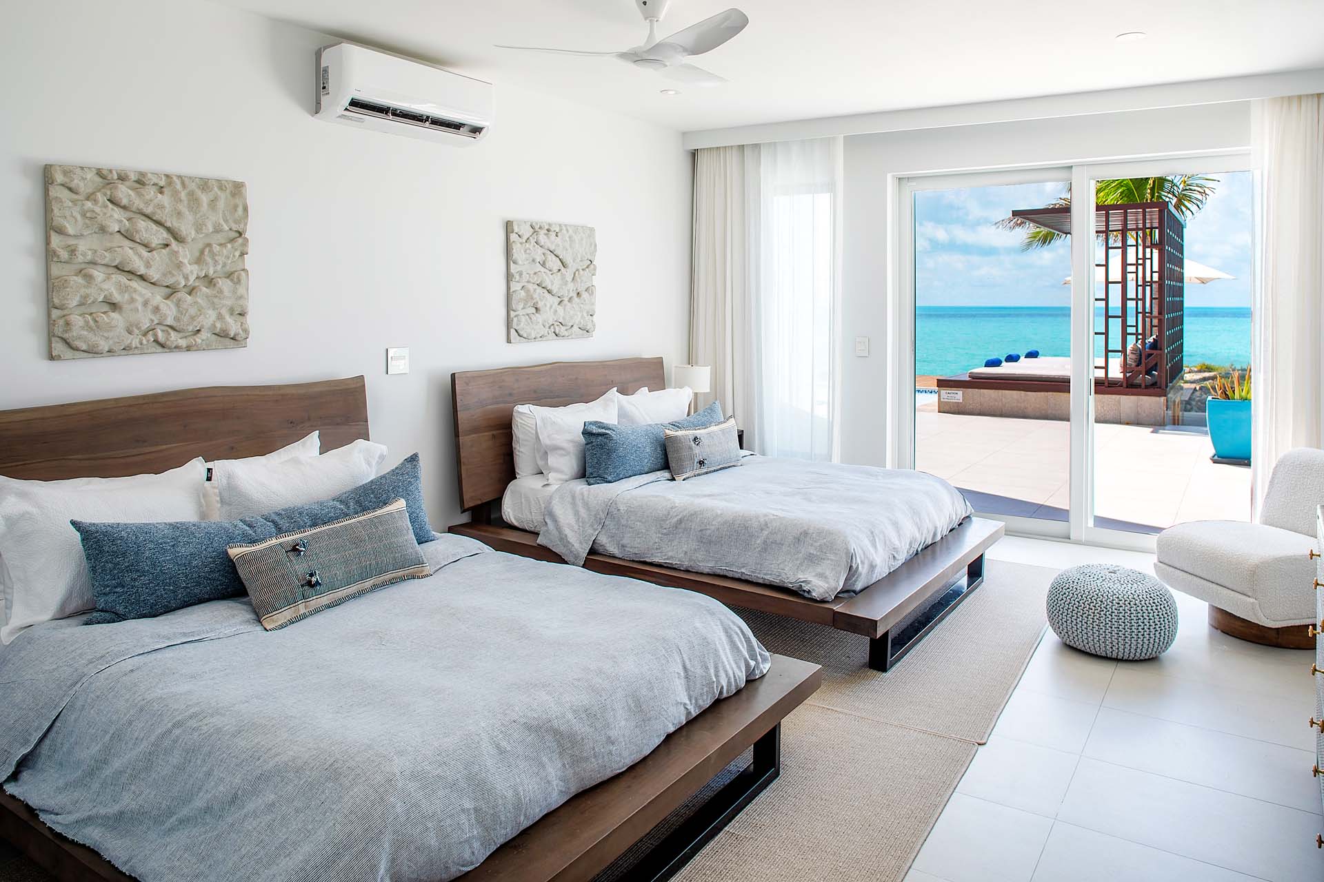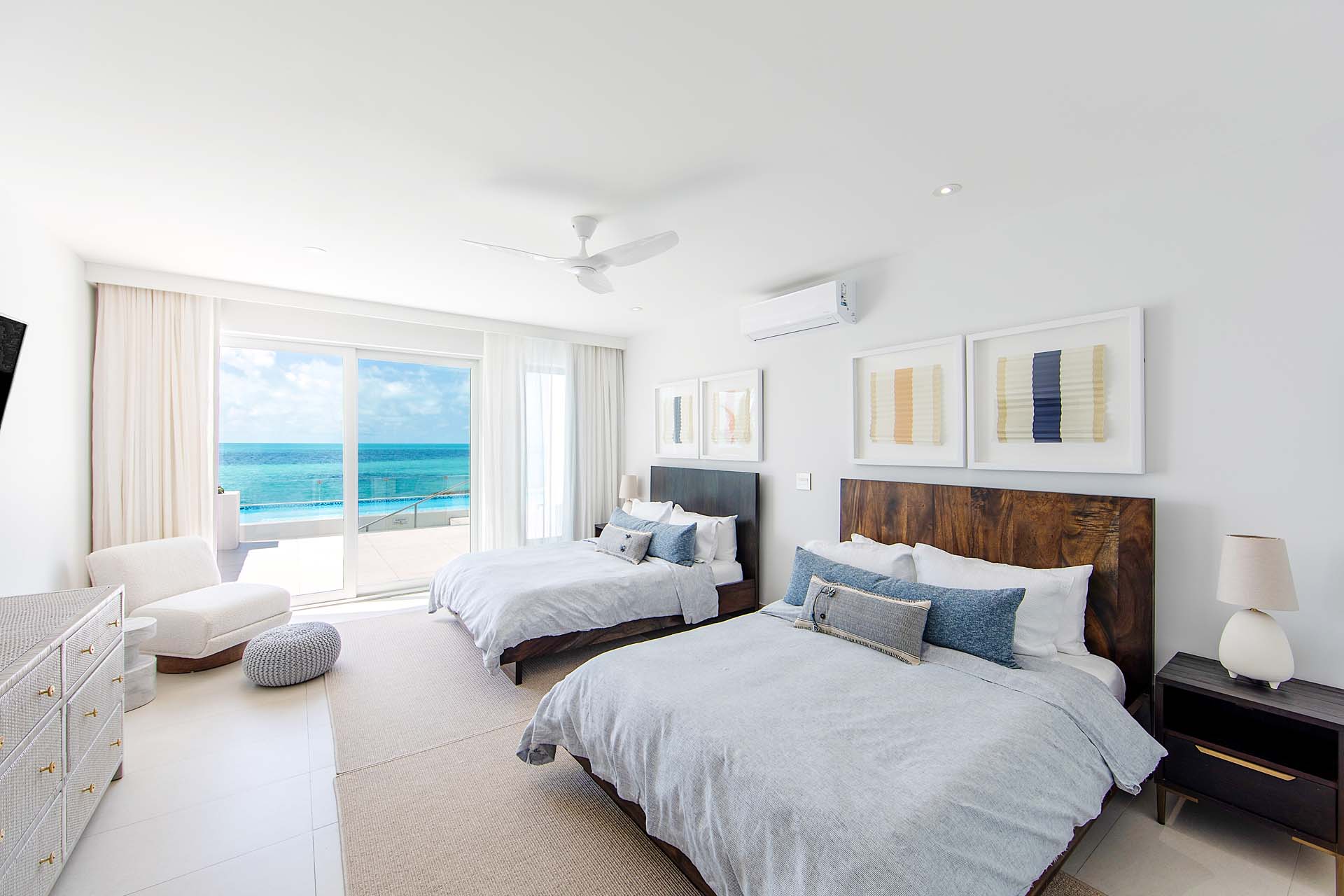 Two guest bedrooms each have two plush queen sized bed. And the 5th bedroom has a queen size bed and is on the lower level, next to the villa’s beach bar and private cove.