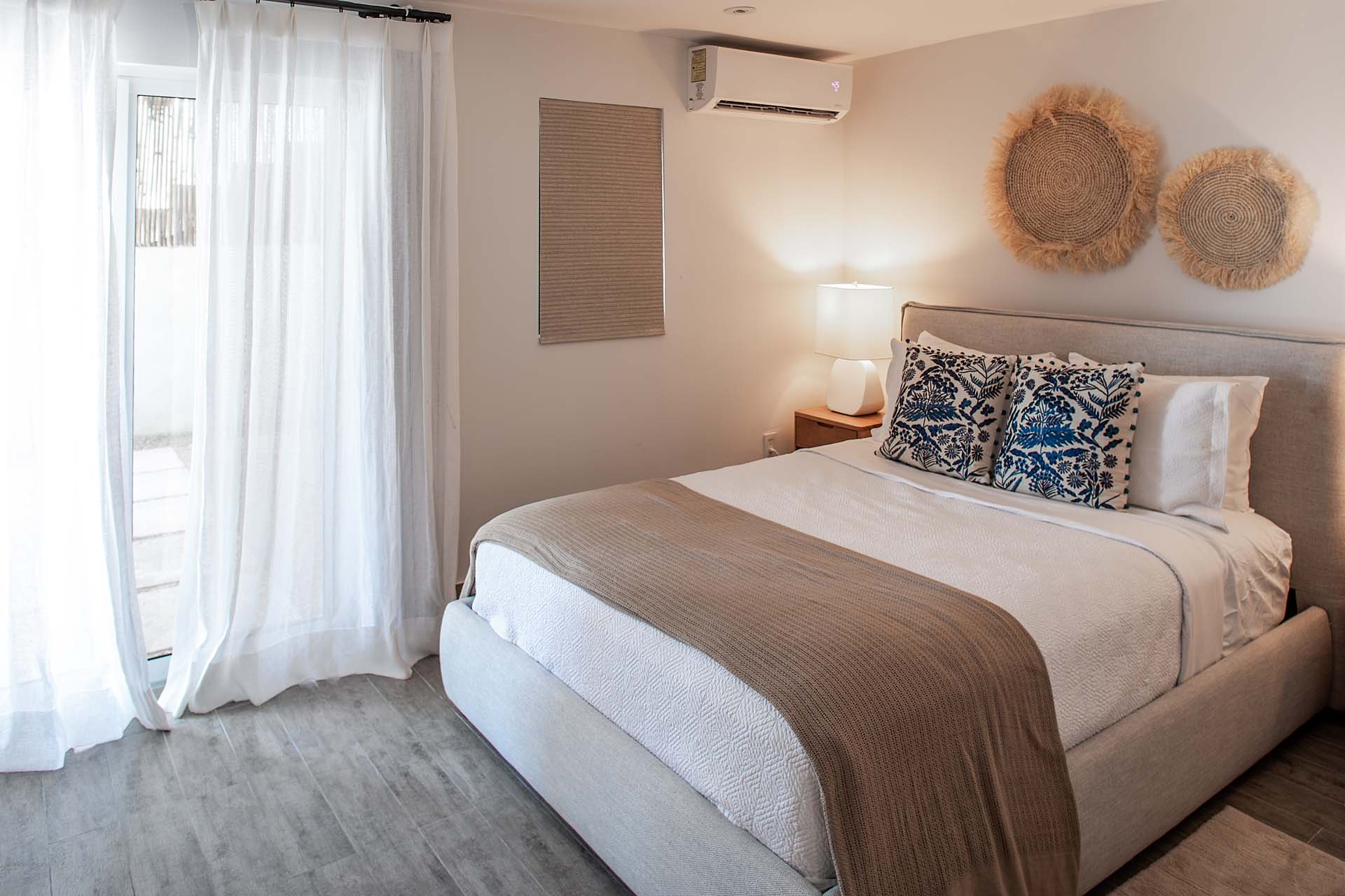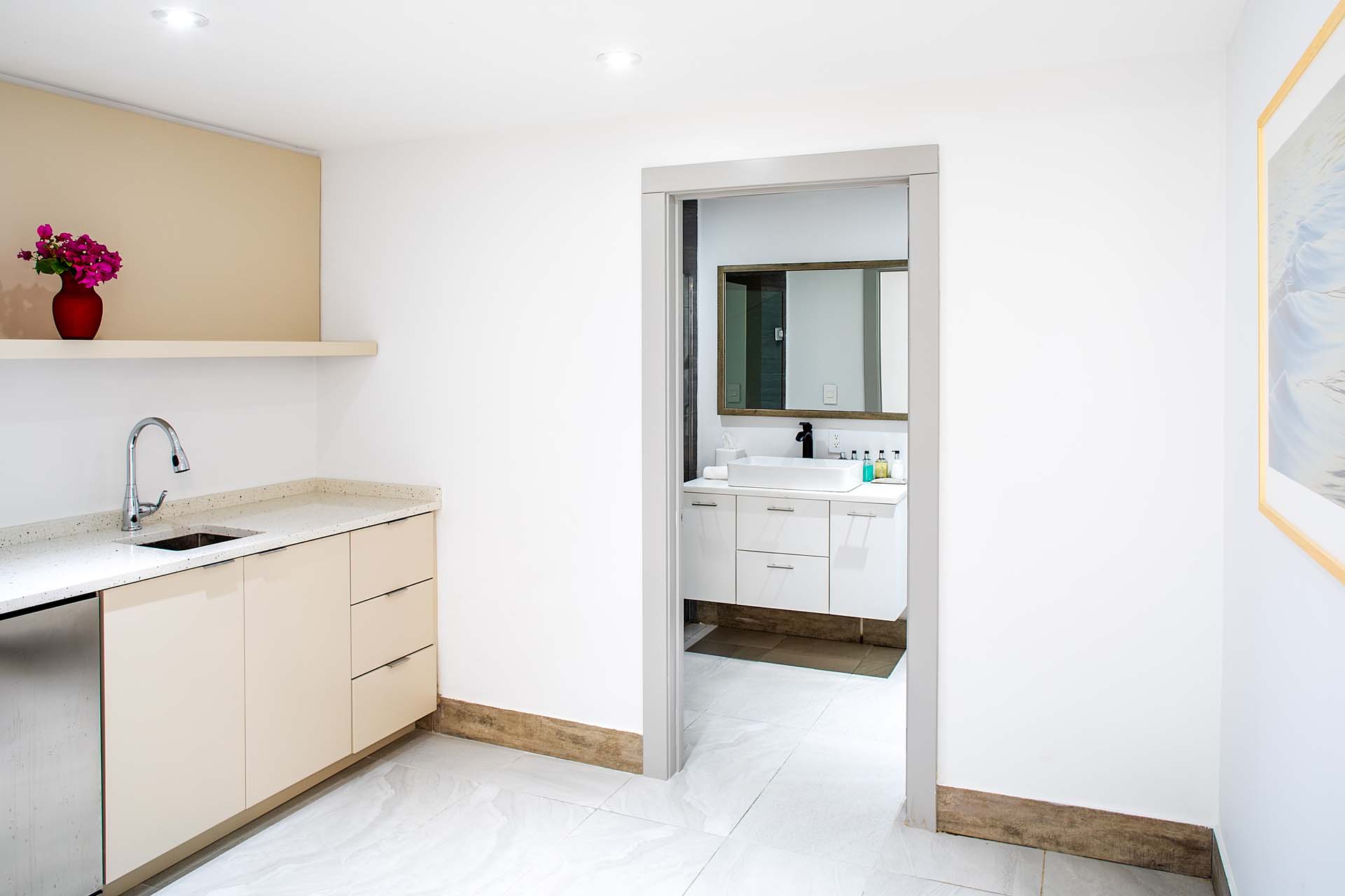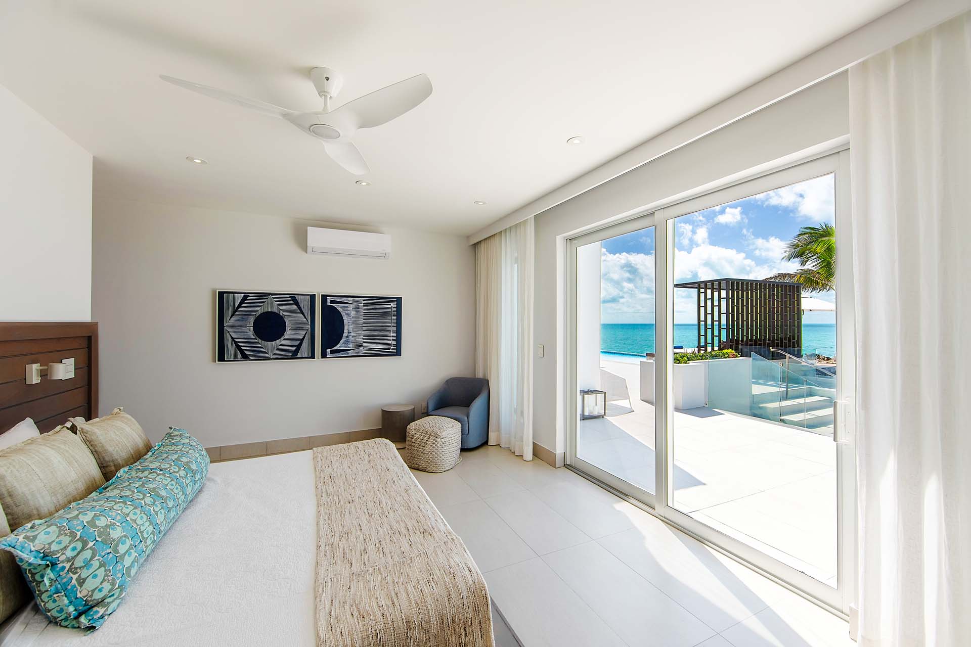 Two guest bedrooms each have two plush queen sized bed. And the 5th bedroom has a queen size bed and is on the lower level, next to the villa’s beach bar and private cove.