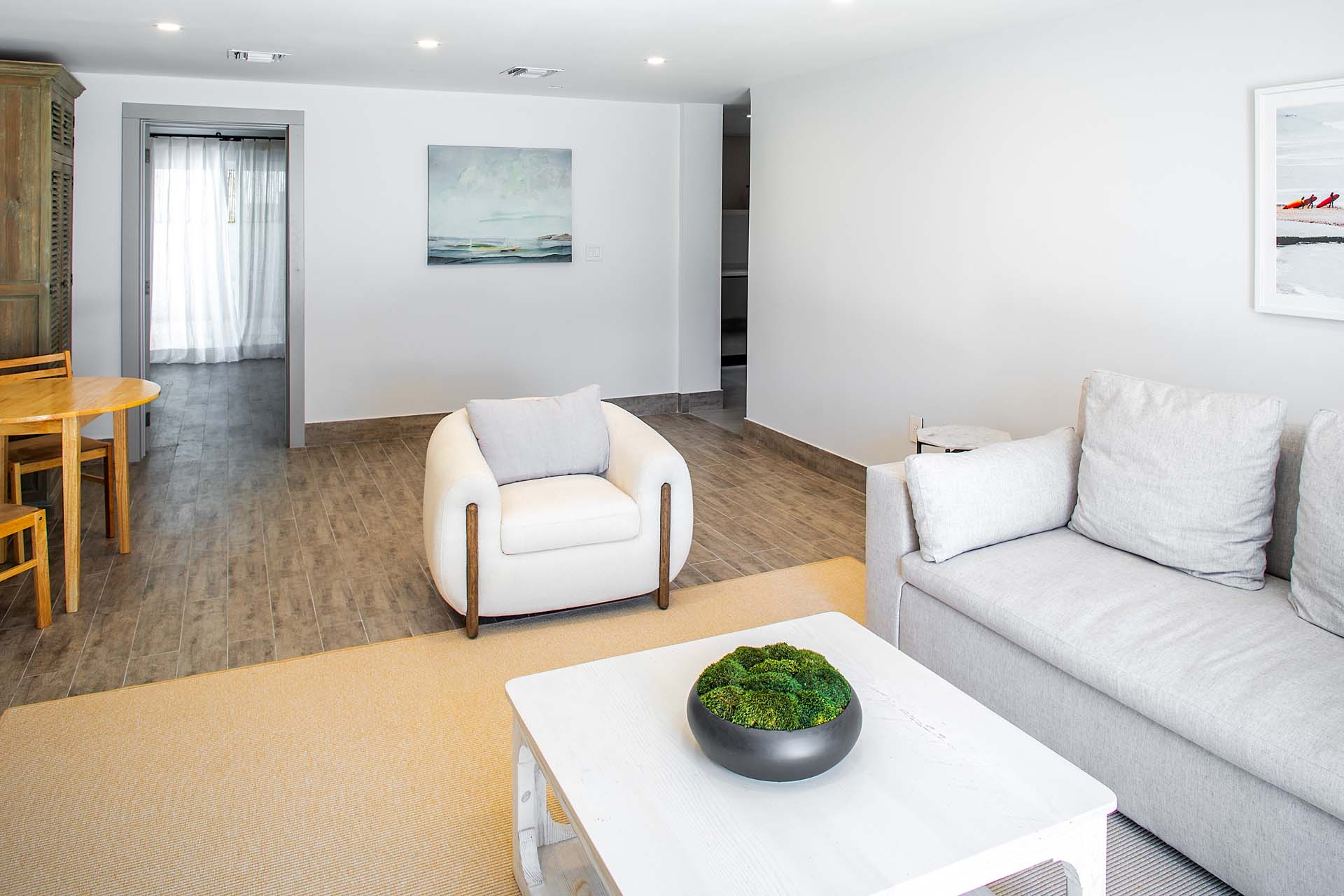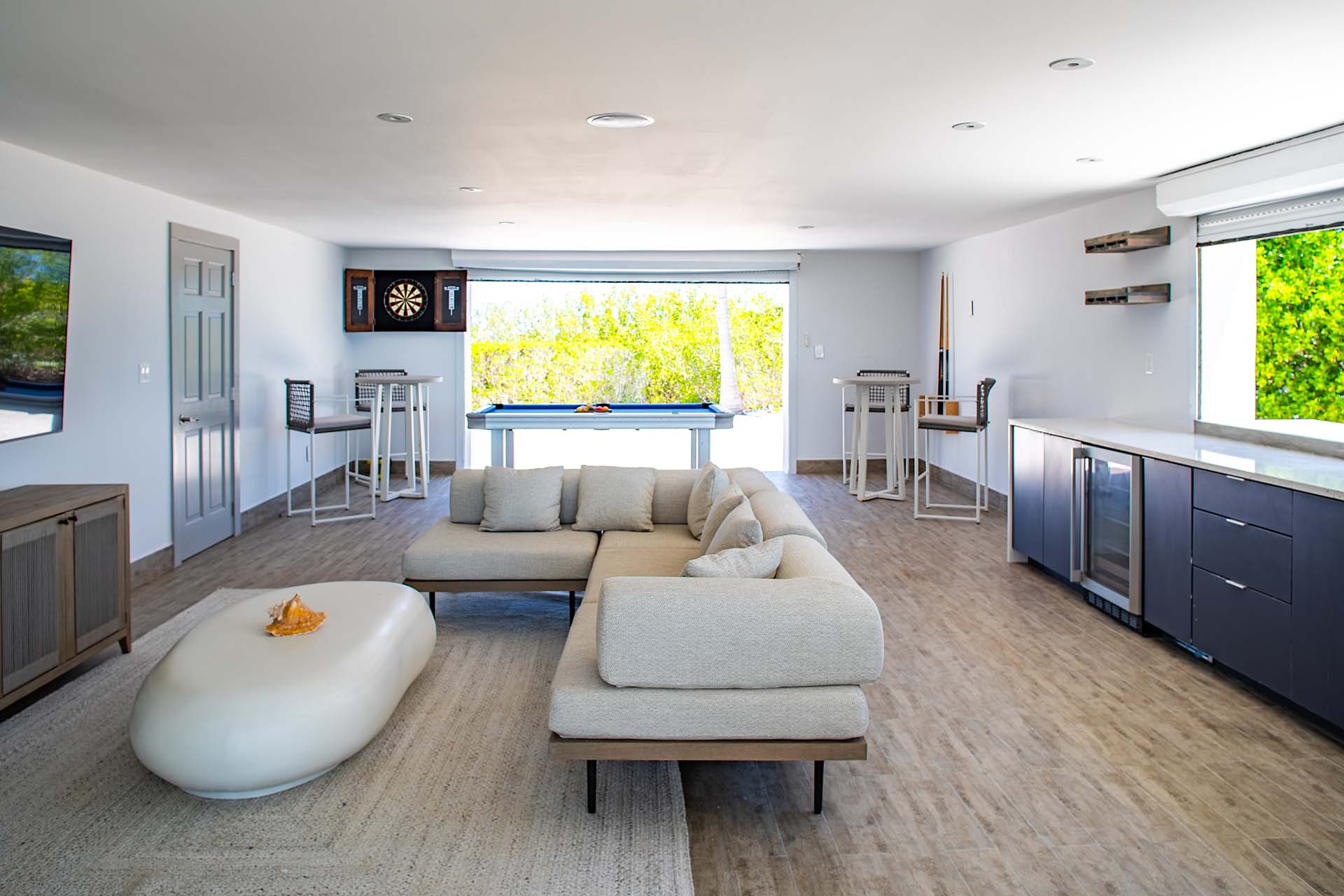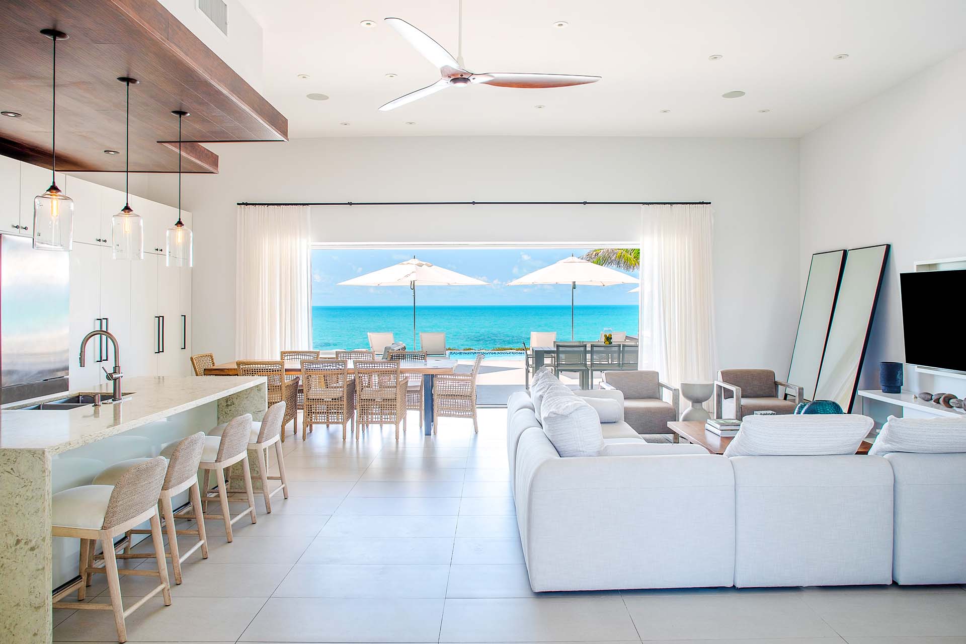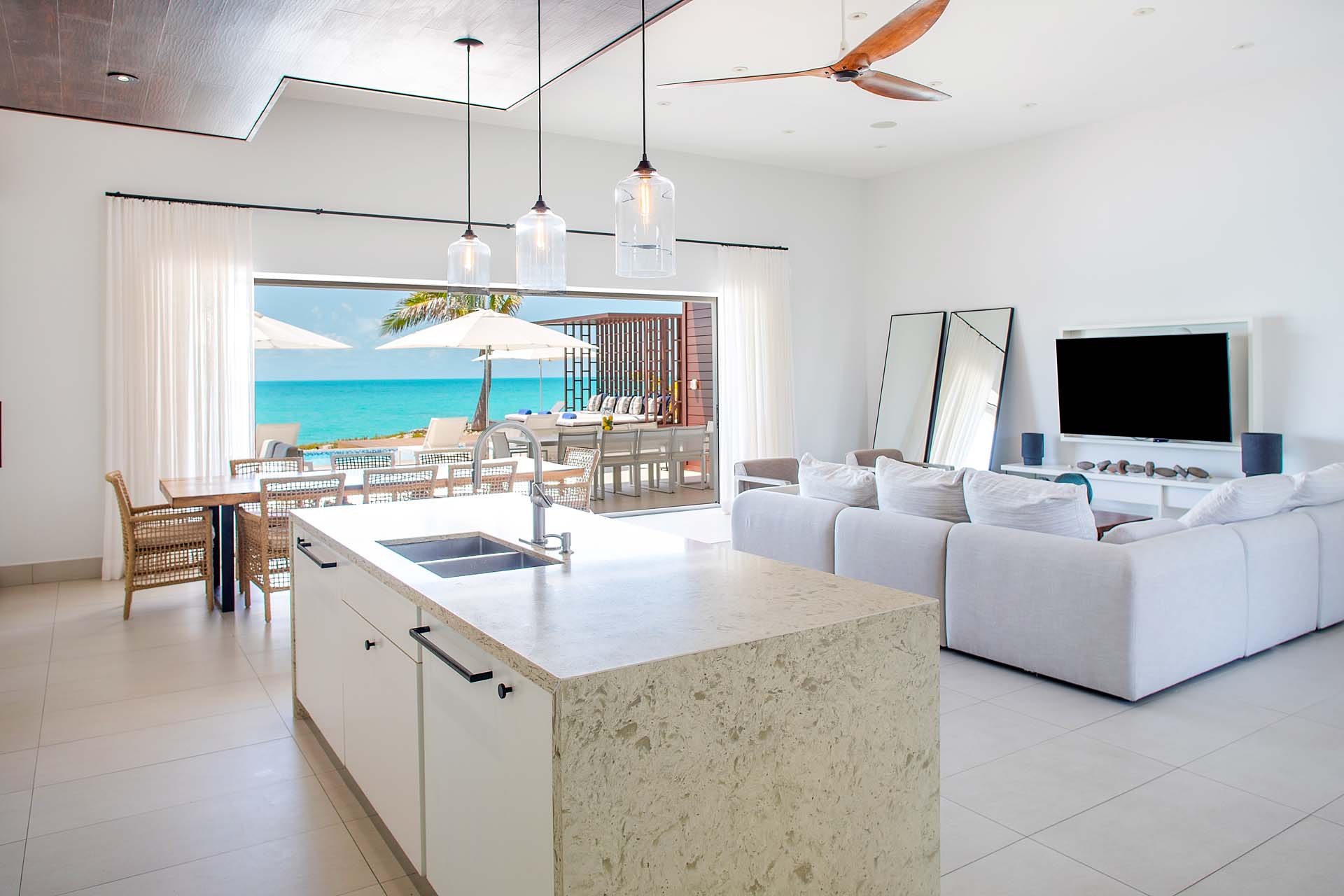 You’ll fall in love as soon as you step inside Tip of the Tail Villa. The spacious great room is minimalist and modern, home to the living room, dining area, and kitchen. A bounty of natural light illuminates contemporary ocean hues, while solid wooden furnishings add a rustic touch.