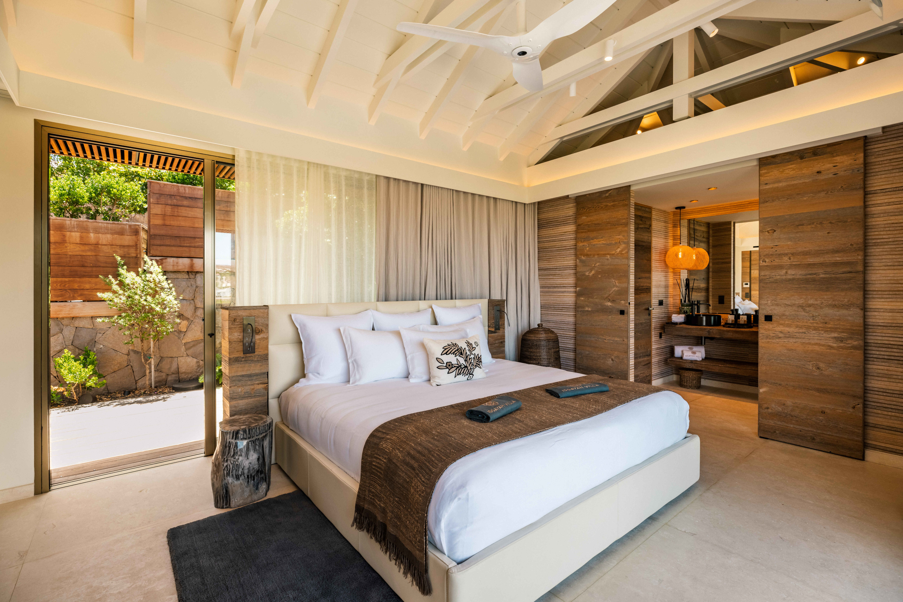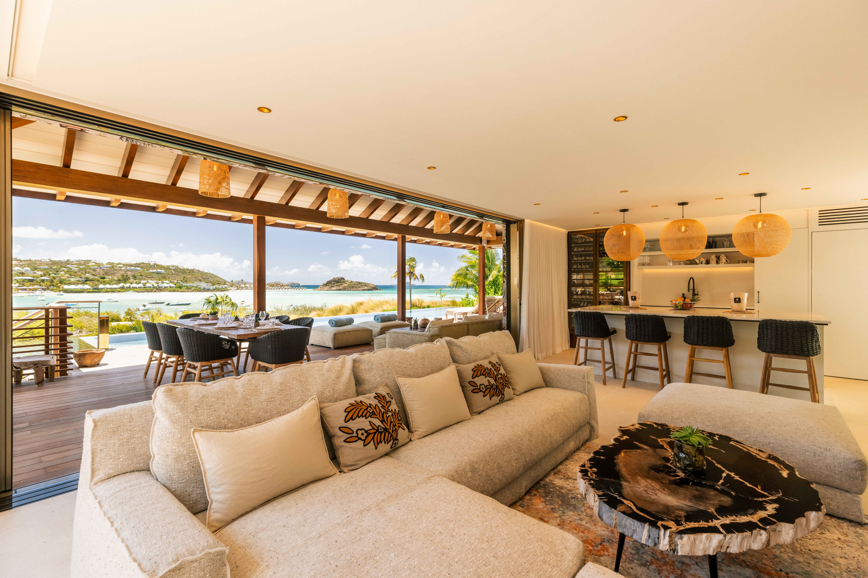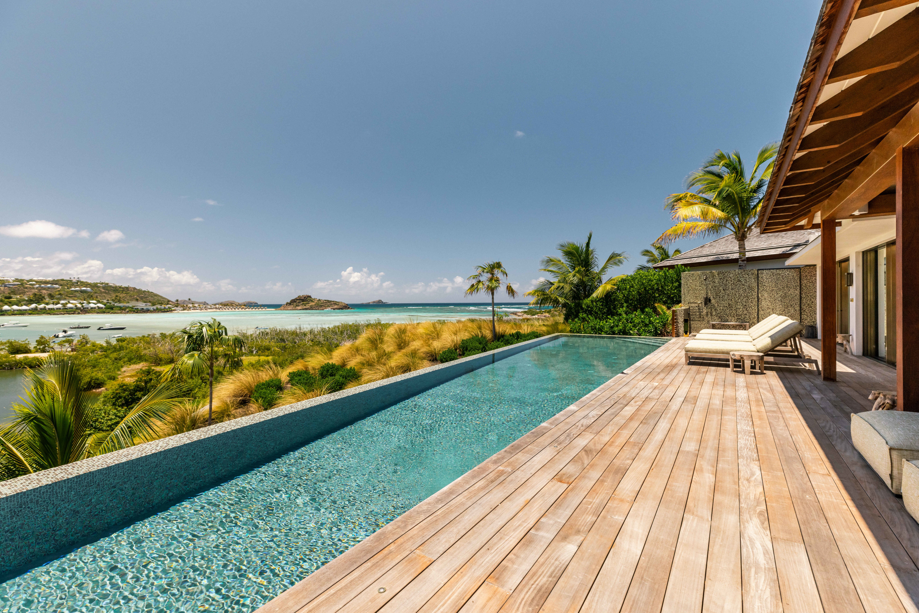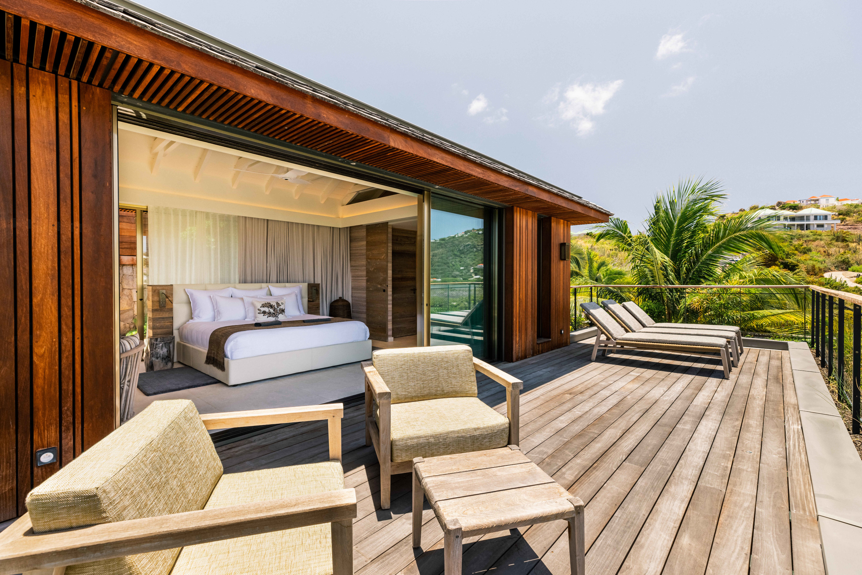 Villa Tourmaline (villa code: WV INE) is at the end of the path to Grand Cul-de-Sac, where a majestic golden gate opens onto the Issayah estate, within which this luxurious villa is nestled in nature. This magnificent property features a master suite in a private bungalow, offering a luxurious bathroom and a large terrace with breathtaking views of the lagoon. Just a few steps away, two additional bedrooms with private bathrooms provide more privacy and independence for your guests. The centerpiece of the Tourmaline villa is undoubtedly the beautiful, slightly secluded terrace, nestled in the heart of nature. Settled on comfortable garden furniture, in the shade of the island's famous Gaiac tree, you can relax, lulled by the songs of birds or around a firepit for unforgettable evenings. At the heart of the villa, a superb 16-meter pool awaits you, surrounded by comfortable sun loungers. Enjoy this oasis of coolness and relaxation, while admiring the stunning view and the blue colors of the lagoon. Inside, you will be charmed by the warm and soothing atmosphere of the villa. The noble materials and refined decor, in natural tones that blend perfectly with the surrounding vegetation, create a sense of sweetness and well-being. Lovely tapestries and a touch of sophistication add an elegant note to this comfortable and fully air-conditioned villa. Whether to recharge or to fully enjoy the joys of a vacation, villa Tourmaline will captivate you with its authenticity and unparalleled charm. If more bedrooms are needed, Villa Tourmaline can be rented with other villas within Issayah Estate. For a 10-bedroom rent with villas Lazuli and Quartz. For a 14-bedroom rent with villas Lazuli, Larimar, and Quartz. Please inquire for pricing.Please fill out the form to begin your inquiry and we will connect you with a seasoned villa rental specialist.
