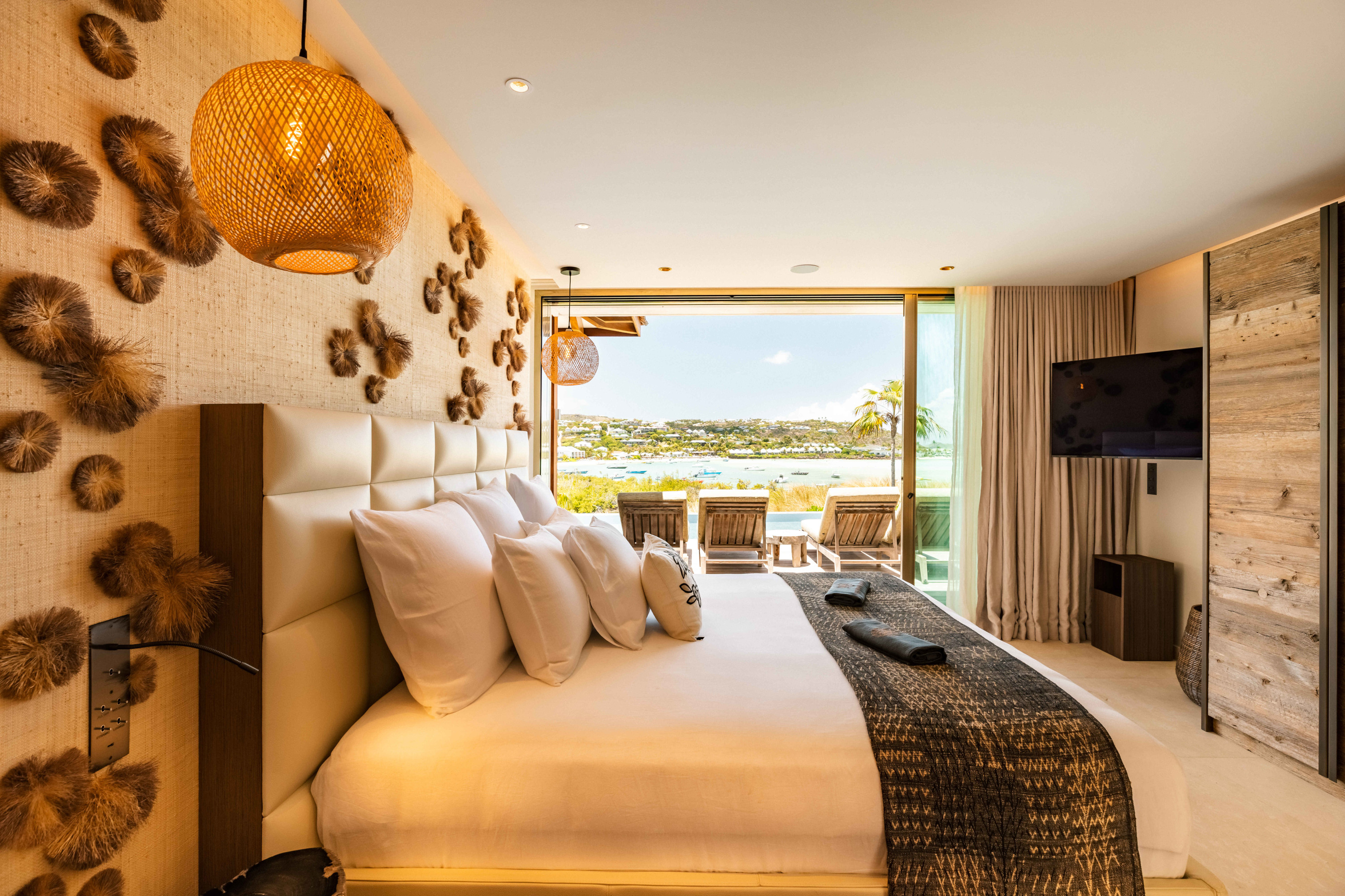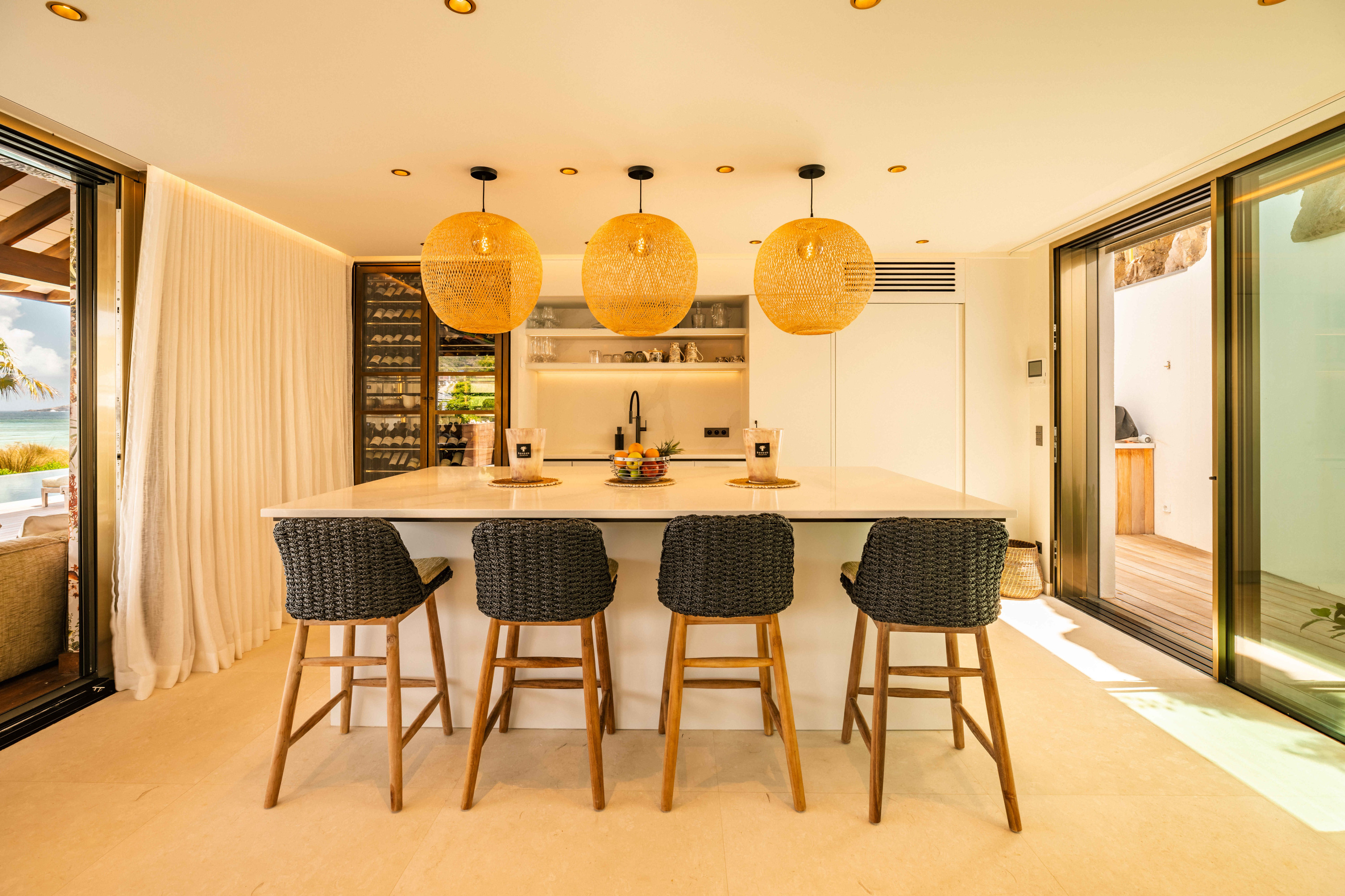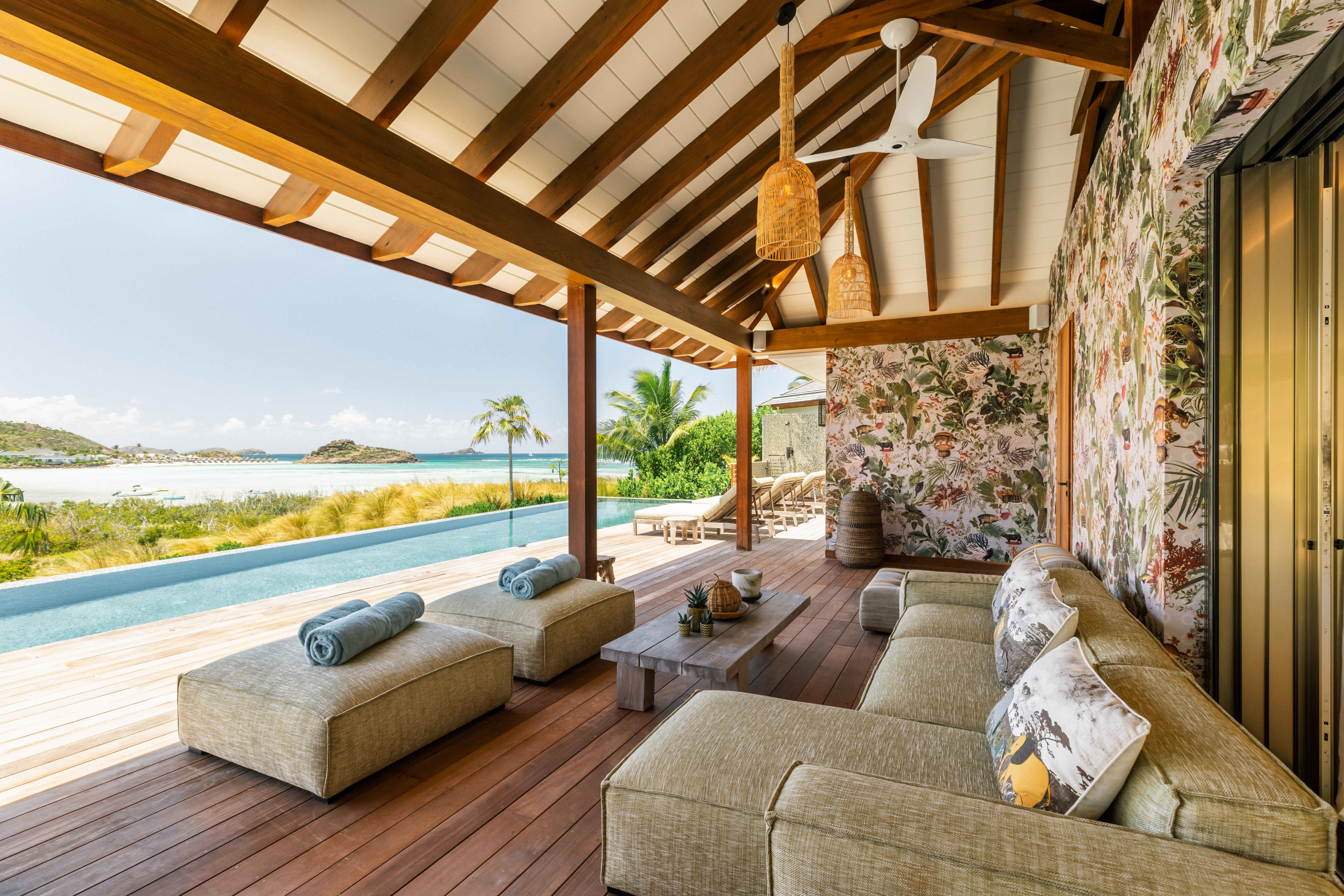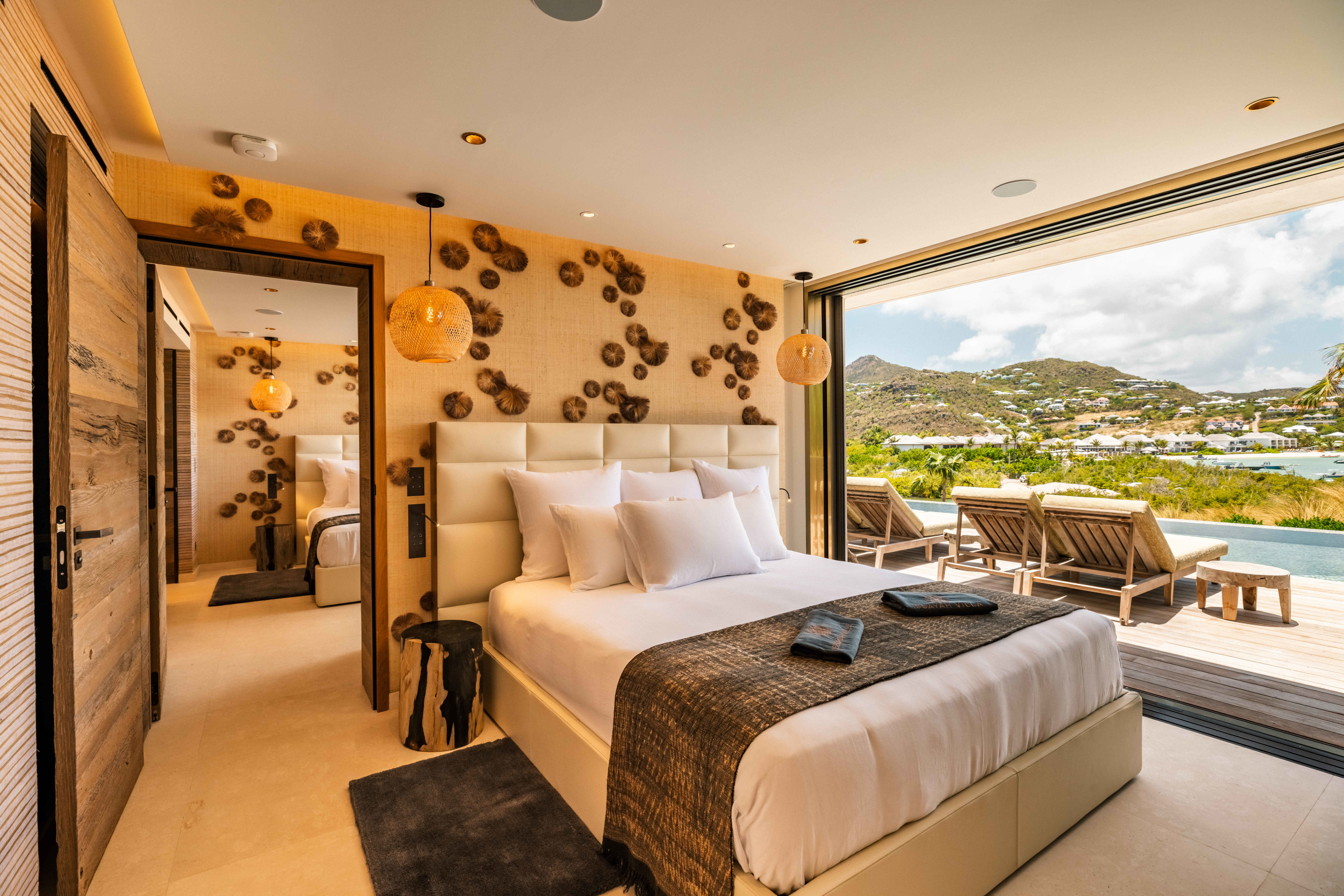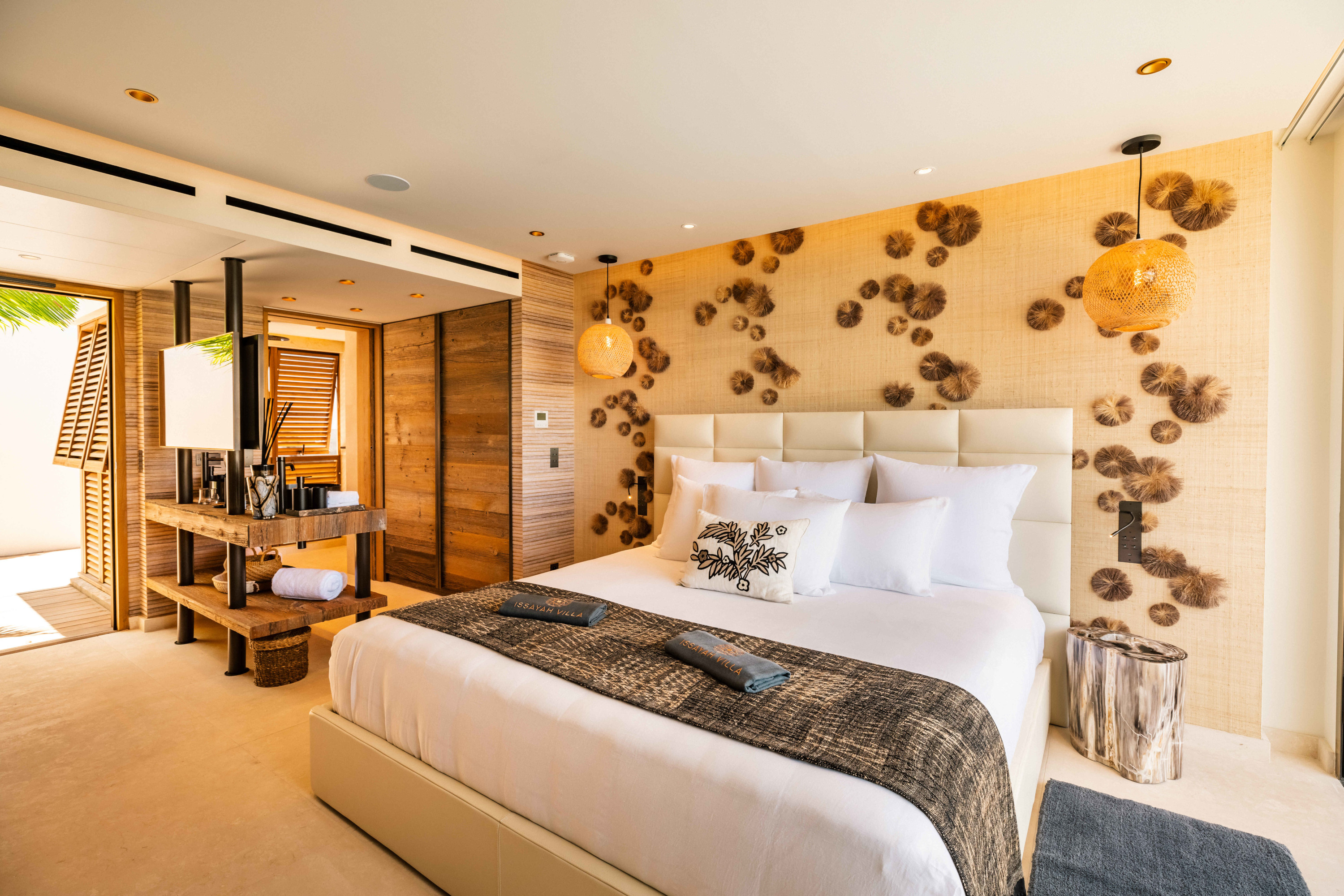 Villa Tourmaline (villa code: WV INE) is at the end of the path to Grand Cul-de-Sac, where a majestic golden gate opens onto the Issayah estate, within which this luxurious villa is nestled in nature. This magnificent property features a master suite in a private bungalow, offering a luxurious bathroom and a large terrace with breathtaking views of the lagoon. Just a few steps away, two additional bedrooms with private bathrooms provide more privacy and independence for your guests. The centerpiece of the Tourmaline villa is undoubtedly the beautiful, slightly secluded terrace, nestled in the heart of nature. Settled on comfortable garden furniture, in the shade of the island's famous Gaiac tree, you can relax, lulled by the songs of birds or around a firepit for unforgettable evenings. At the heart of the villa, a superb 16-meter pool awaits you, surrounded by comfortable sun loungers. Enjoy this oasis of coolness and relaxation, while admiring the stunning view and the blue colors of the lagoon. Inside, you will be charmed by the warm and soothing atmosphere of the villa. The noble materials and refined decor, in natural tones that blend perfectly with the surrounding vegetation, create a sense of sweetness and well-being. Lovely tapestries and a touch of sophistication add an elegant note to this comfortable and fully air-conditioned villa. Whether to recharge or to fully enjoy the joys of a vacation, villa Tourmaline will captivate you with its authenticity and unparalleled charm. If more bedrooms are needed, Villa Tourmaline can be rented with other villas within Issayah Estate. For a 10-bedroom rent with villas Lazuli and Quartz. For a 14-bedroom rent with villas Lazuli, Larimar, and Quartz. Please inquire for pricing.Please fill out the form to begin your inquiry and we will connect you with a seasoned villa rental specialist.