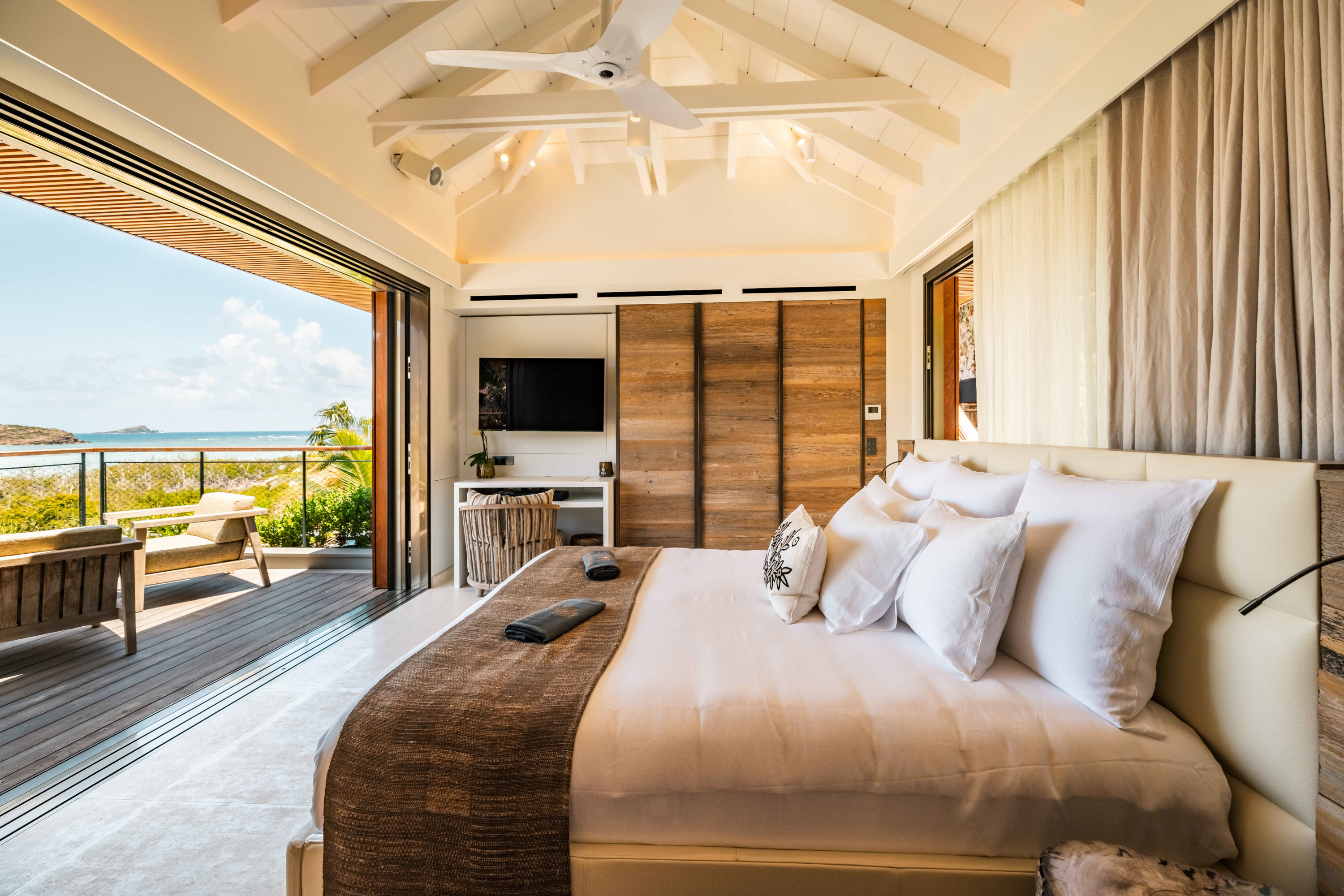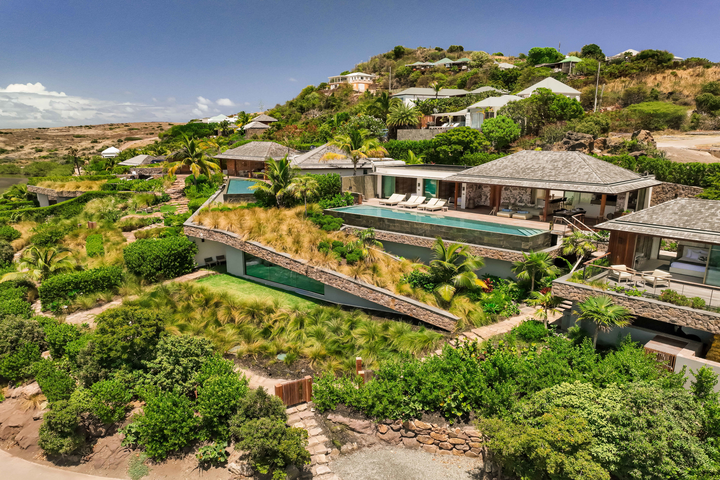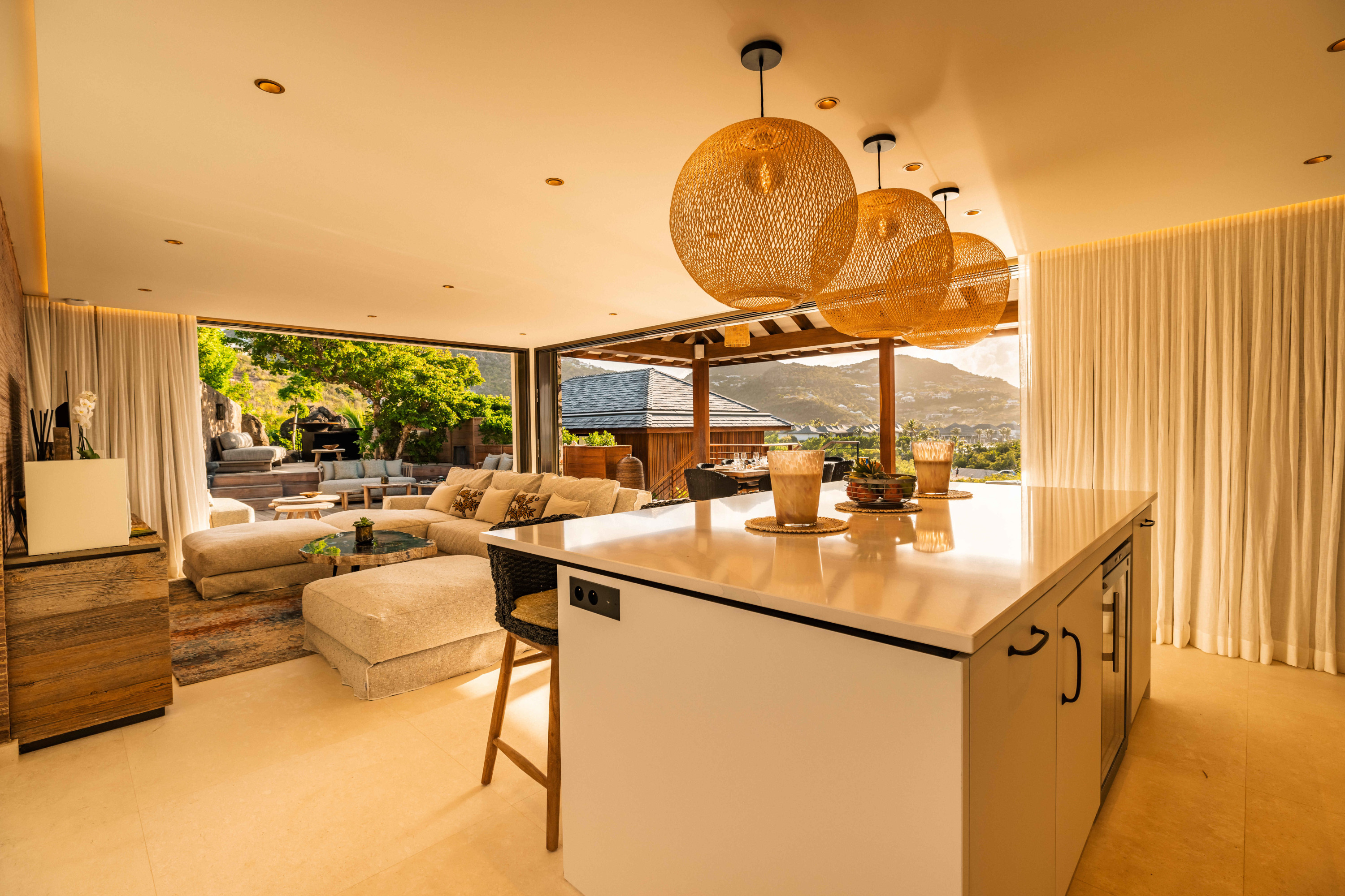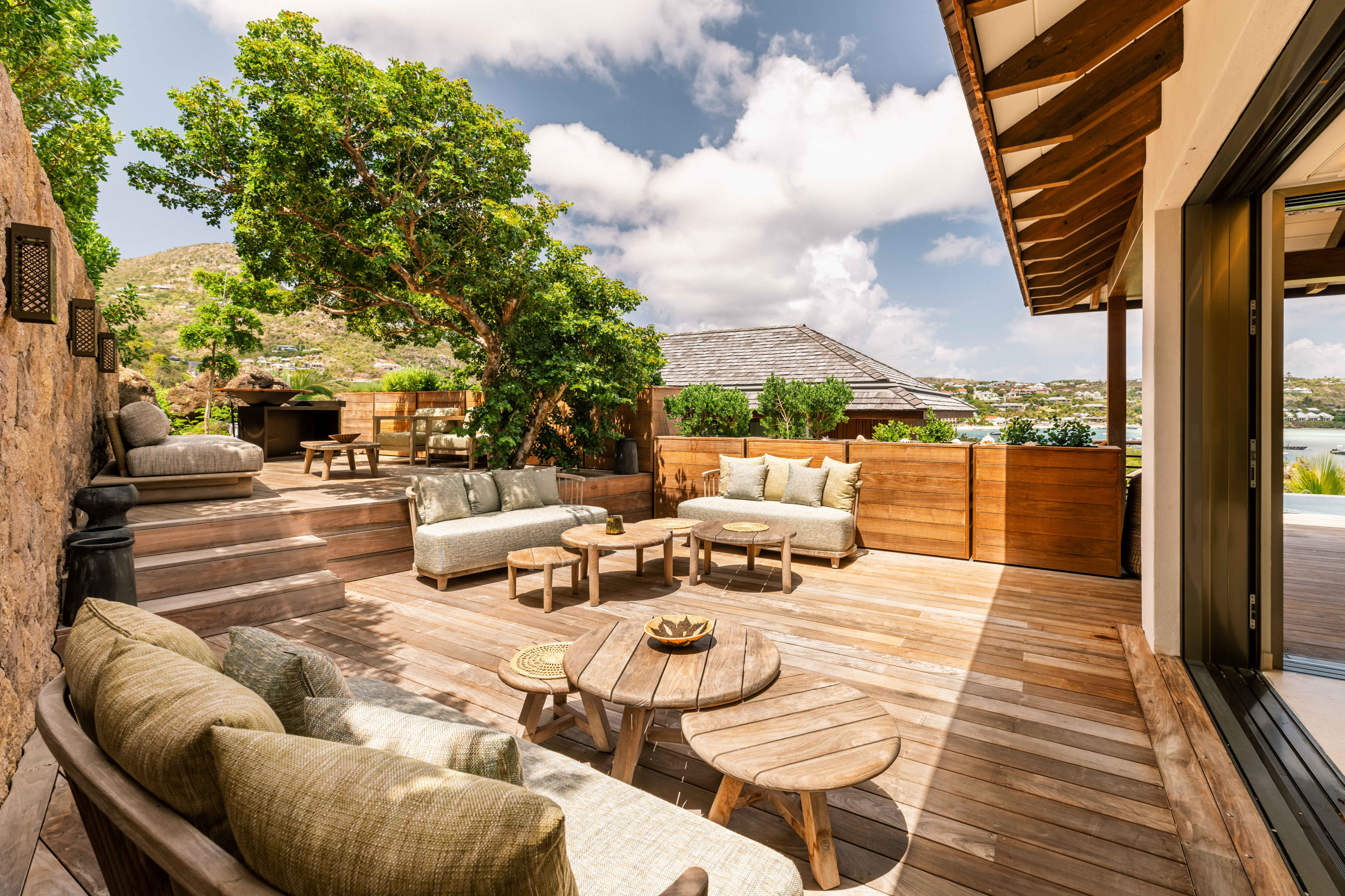 Villa Tourmaline (villa code: WV INE) is at the end of the path to Grand Cul-de-Sac, where a majestic golden gate opens onto the Issayah estate, within which this luxurious villa is nestled in nature. This magnificent property features a master suite in a private bungalow, offering a luxurious bathroom and a large terrace with breathtaking views of the lagoon. Just a few steps away, two additional bedrooms with private bathrooms provide more privacy and independence for your guests. The centerpiece of the Tourmaline villa is undoubtedly the beautiful, slightly secluded terrace, nestled in the heart of nature. Settled on comfortable garden furniture, in the shade of the island's famous Gaiac tree, you can relax, lulled by the songs of birds or around a firepit for unforgettable evenings. At the heart of the villa, a superb 16-meter pool awaits you, surrounded by comfortable sun loungers. Enjoy this oasis of coolness and relaxation, while admiring the stunning view and the blue colors of the lagoon. Inside, you will be charmed by the warm and soothing atmosphere of the villa. The noble materials and refined decor, in natural tones that blend perfectly with the surrounding vegetation, create a sense of sweetness and well-being. Lovely tapestries and a touch of sophistication add an elegant note to this comfortable and fully air-conditioned villa. Whether to recharge or to fully enjoy the joys of a vacation, villa Tourmaline will captivate you with its authenticity and unparalleled charm. If more bedrooms are needed, Villa Tourmaline can be rented with other villas within Issayah Estate. For a 10-bedroom rent with villas Lazuli and Quartz. For a 14-bedroom rent with villas Lazuli, Larimar, and Quartz. Please inquire for pricing.Please fill out the form to begin your inquiry and we will connect you with a seasoned villa rental specialist.