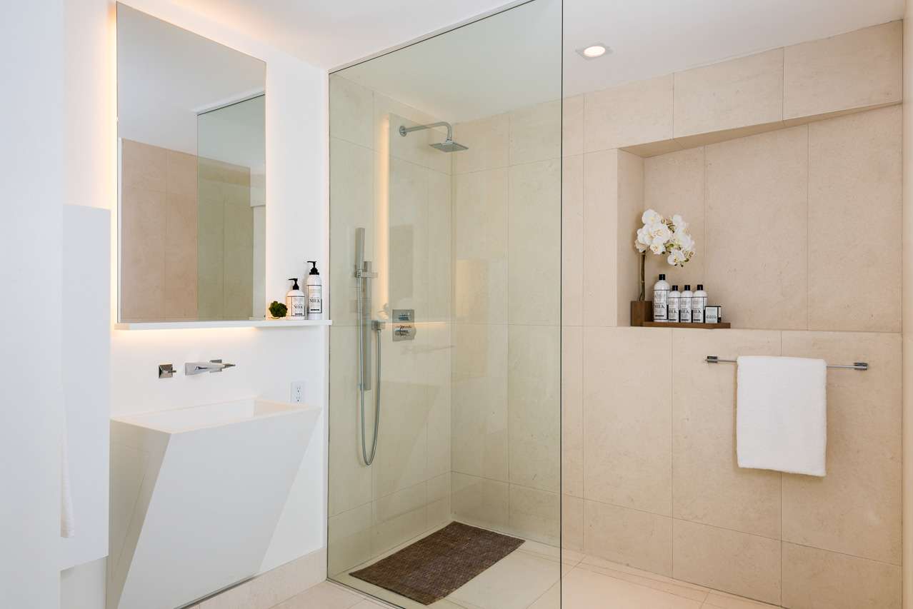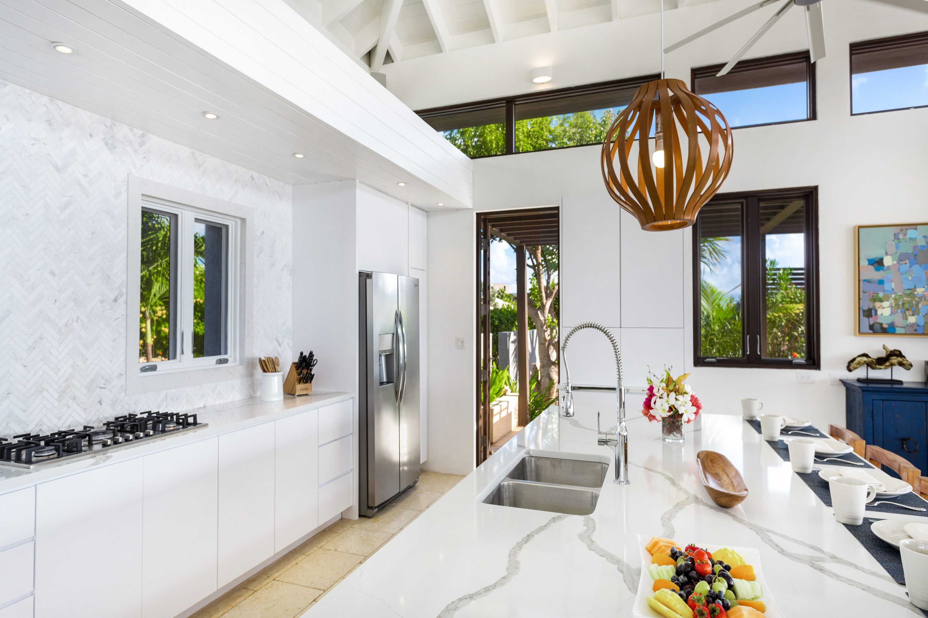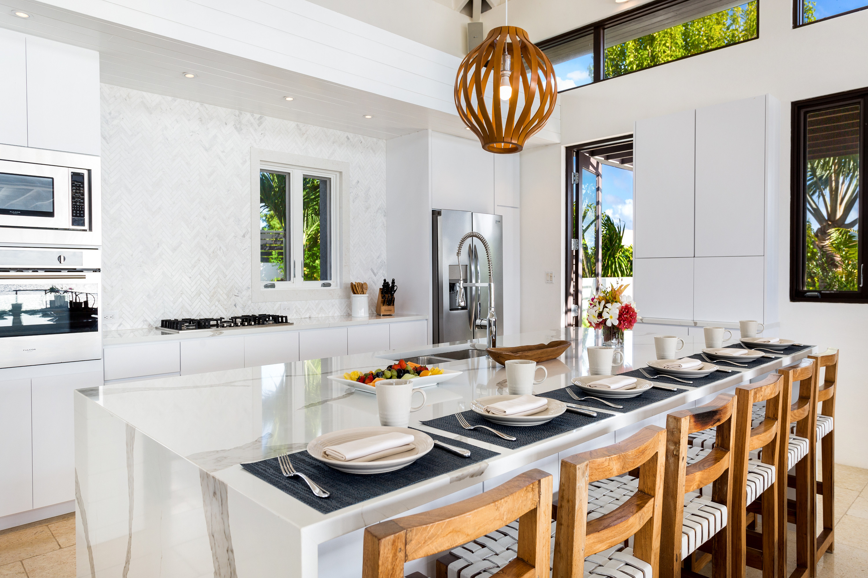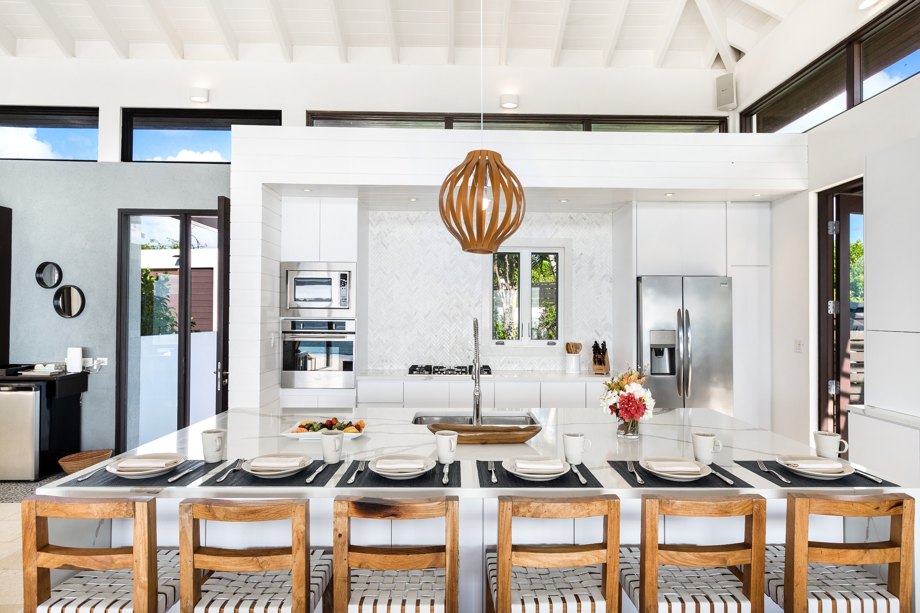 The architecture of the villa facilitates social gatherings with a large entertainment space located between two dining areas. In an effort to connect our guests with the beautiful weather, Triton Villa features two beach decks, a large ocean view terrace on the east side and an intimate sunset garden and pool on the west side.