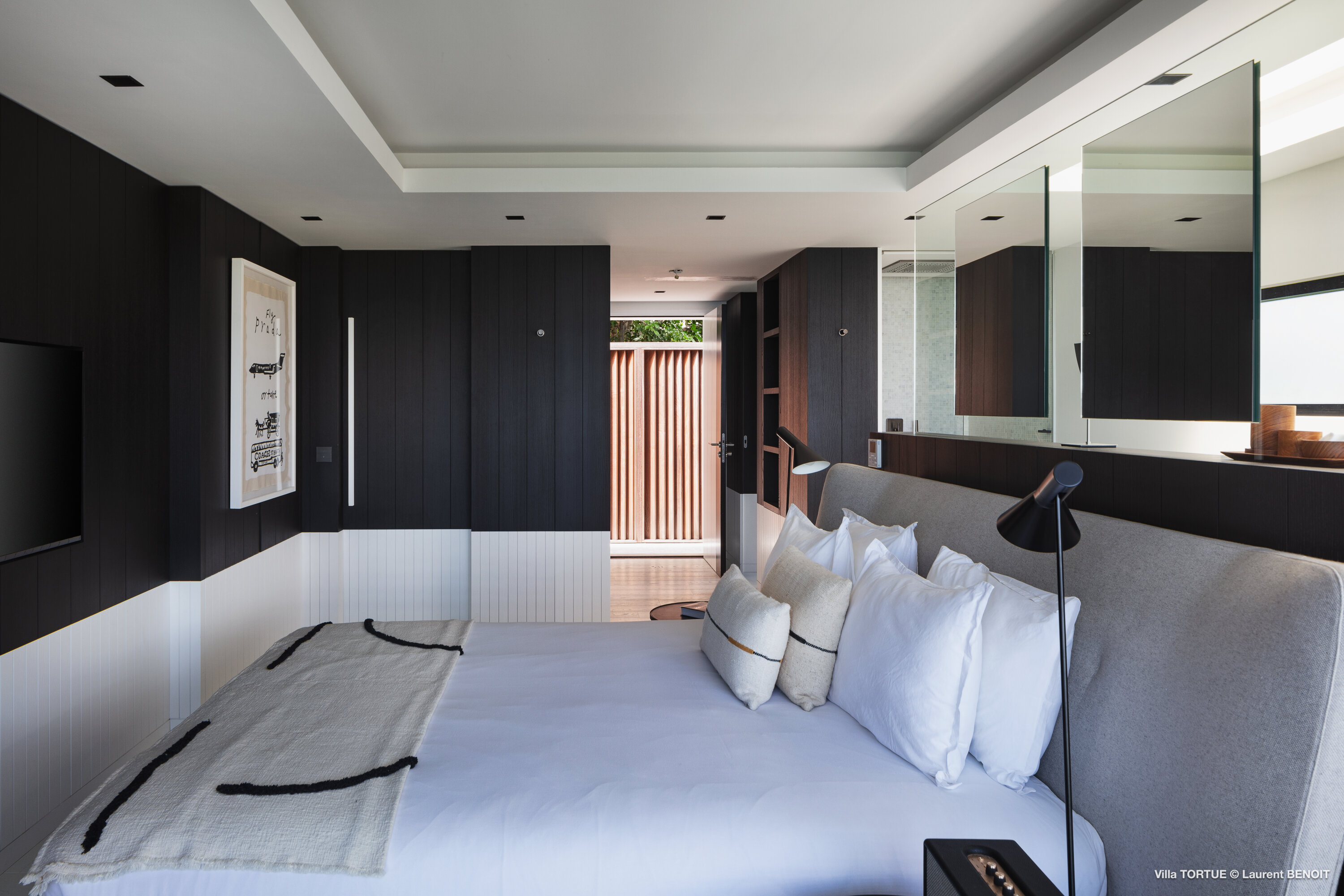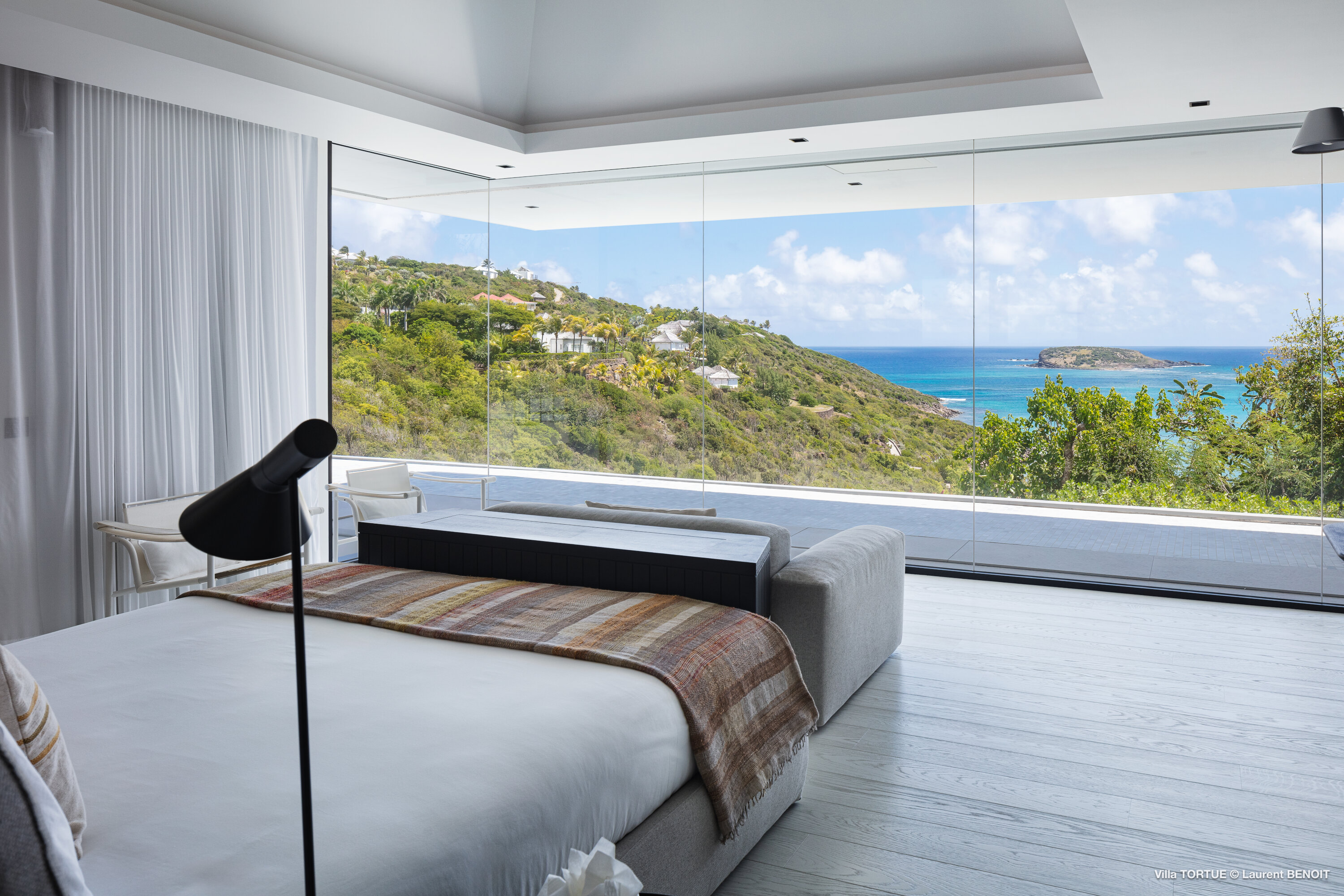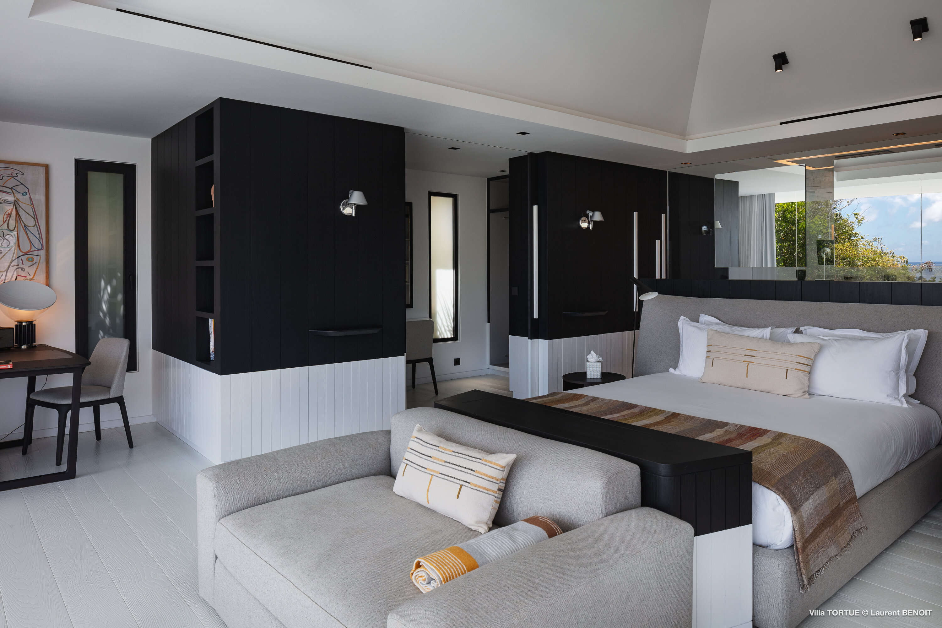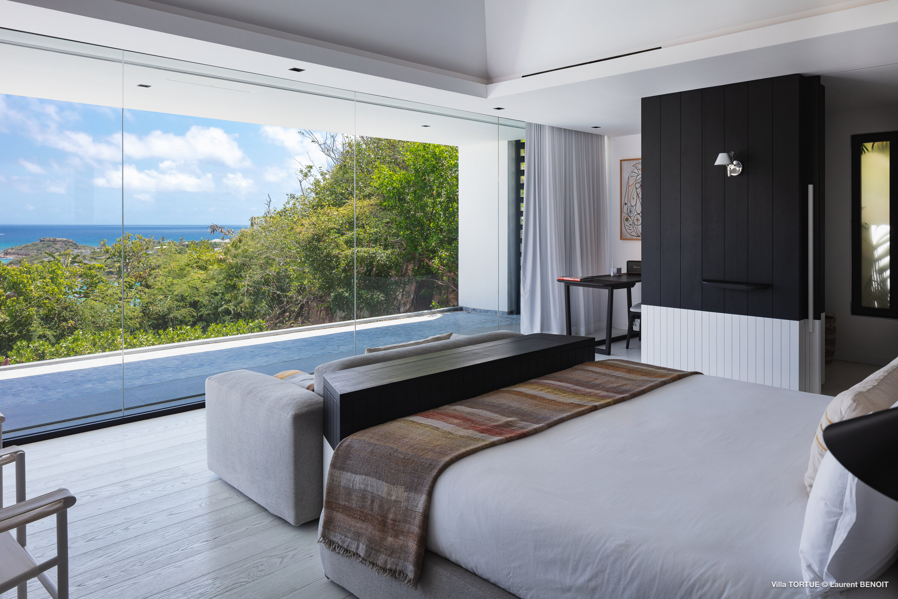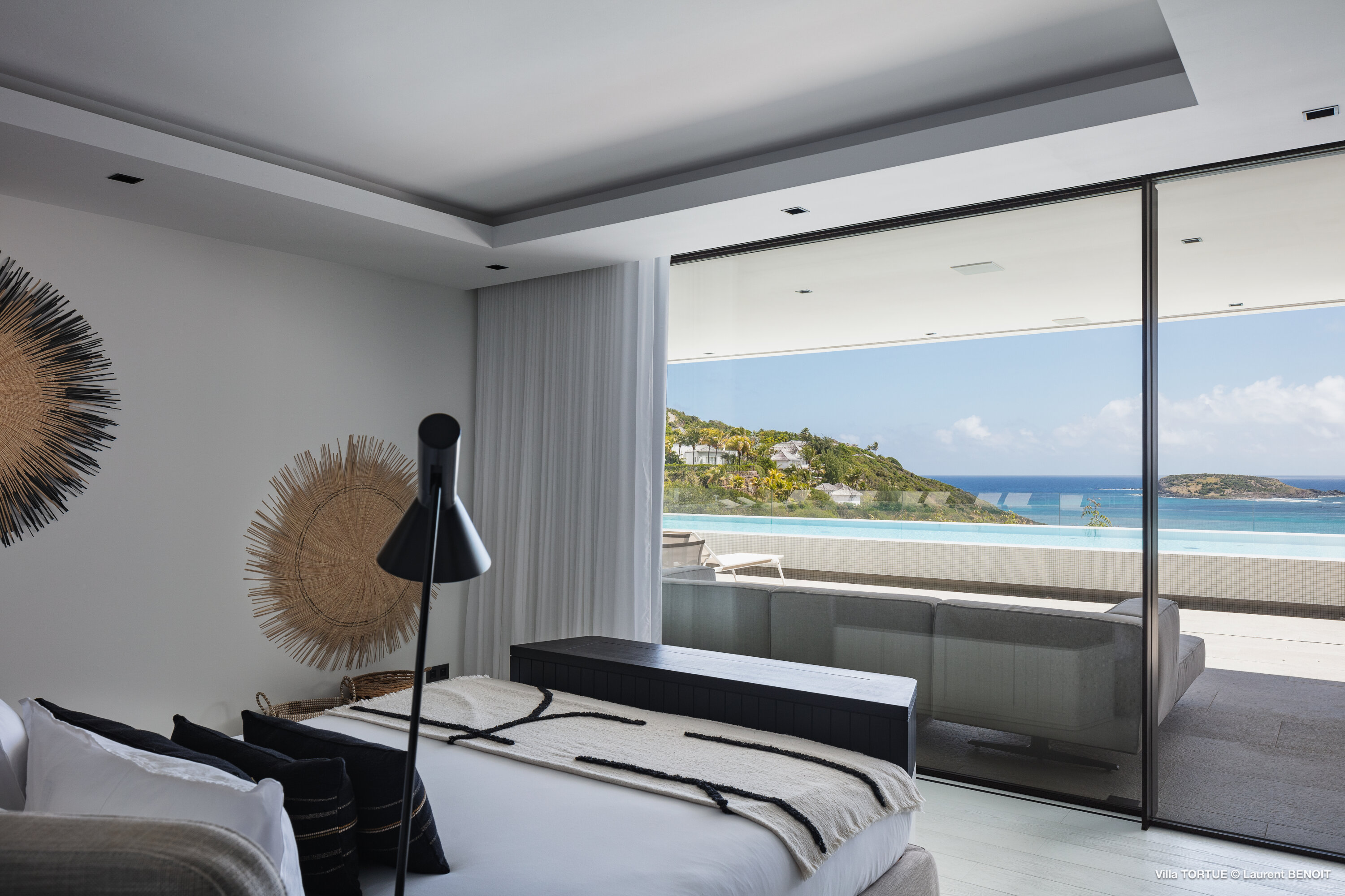 Villa Tortue offers four beautifully appointed suites, each with an ensuite bathroom and calming views over the sea, the lush valley, or the surrounding greenery. The primary suite, located on the upper level, enjoys a private terrace with exceptional panoramic views. Two additional bedrooms are situated on the main level, while the fourth, more intimate suite is located on the lower level, near the fully equipped fitness room.