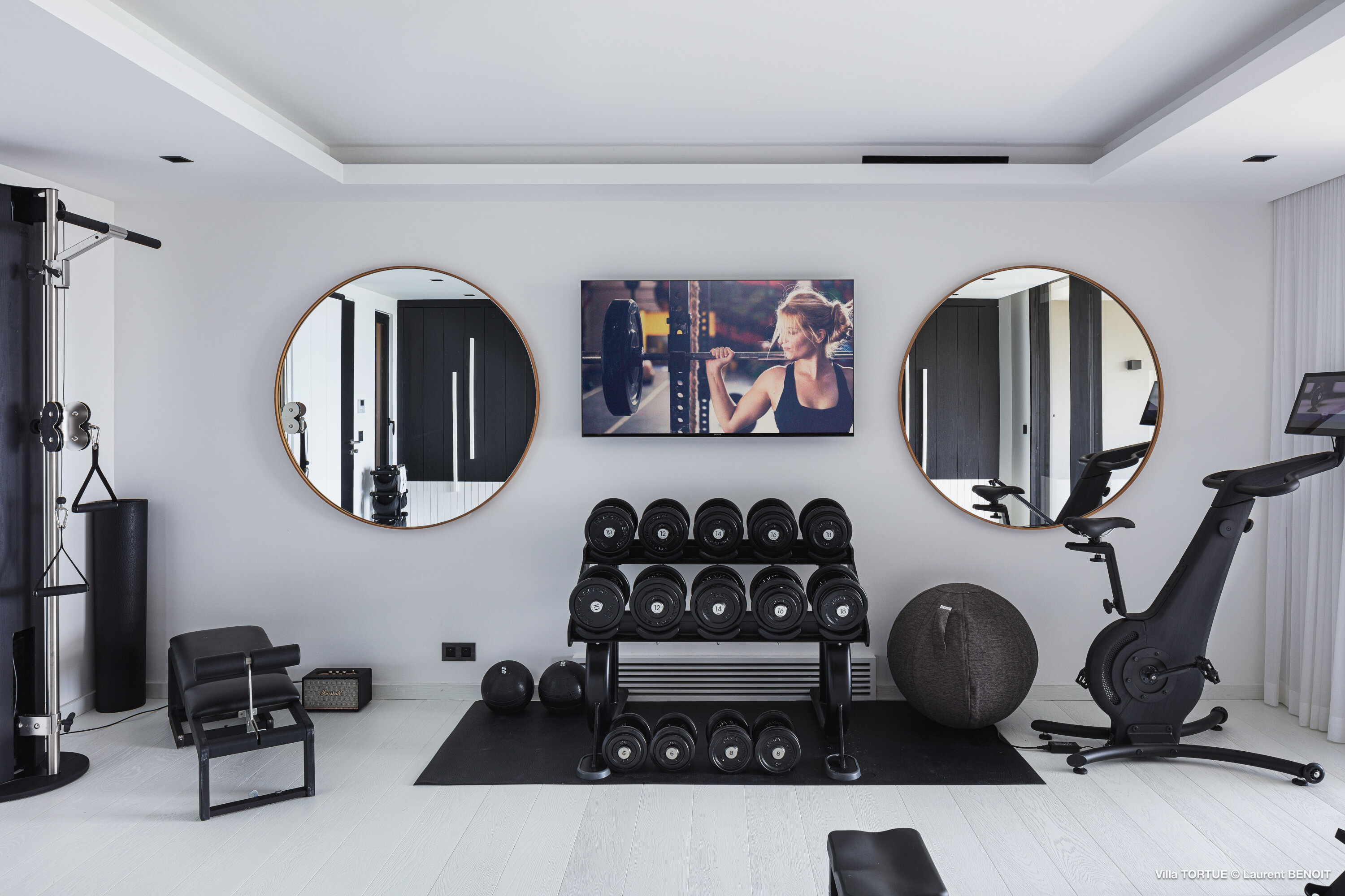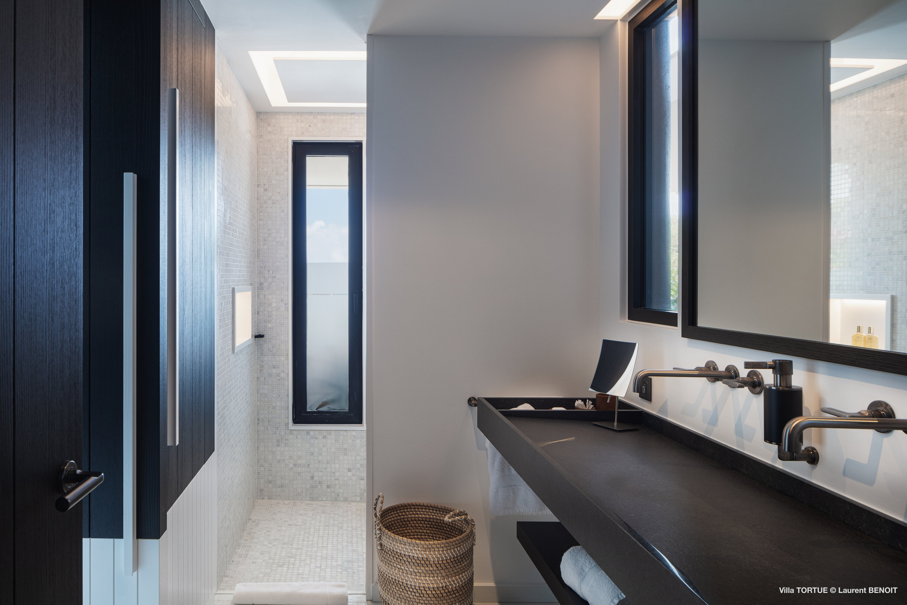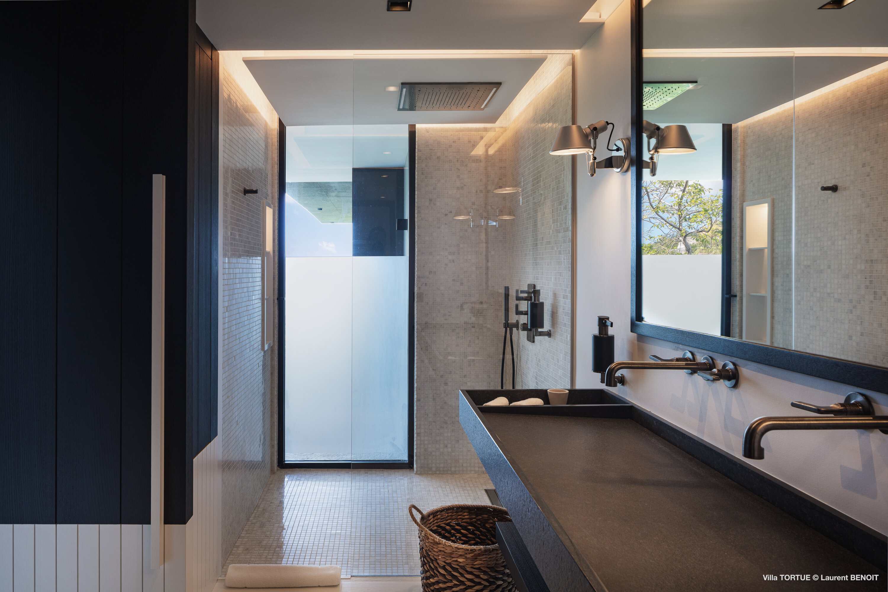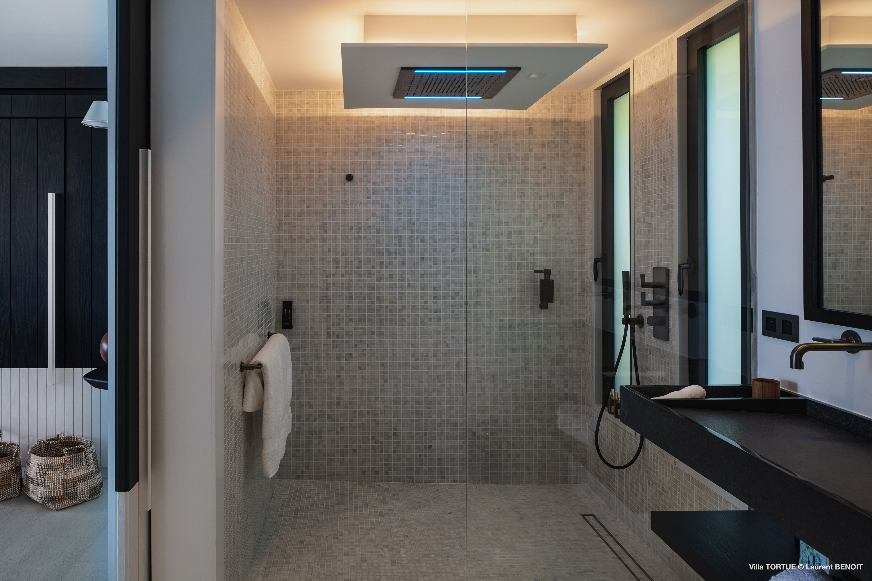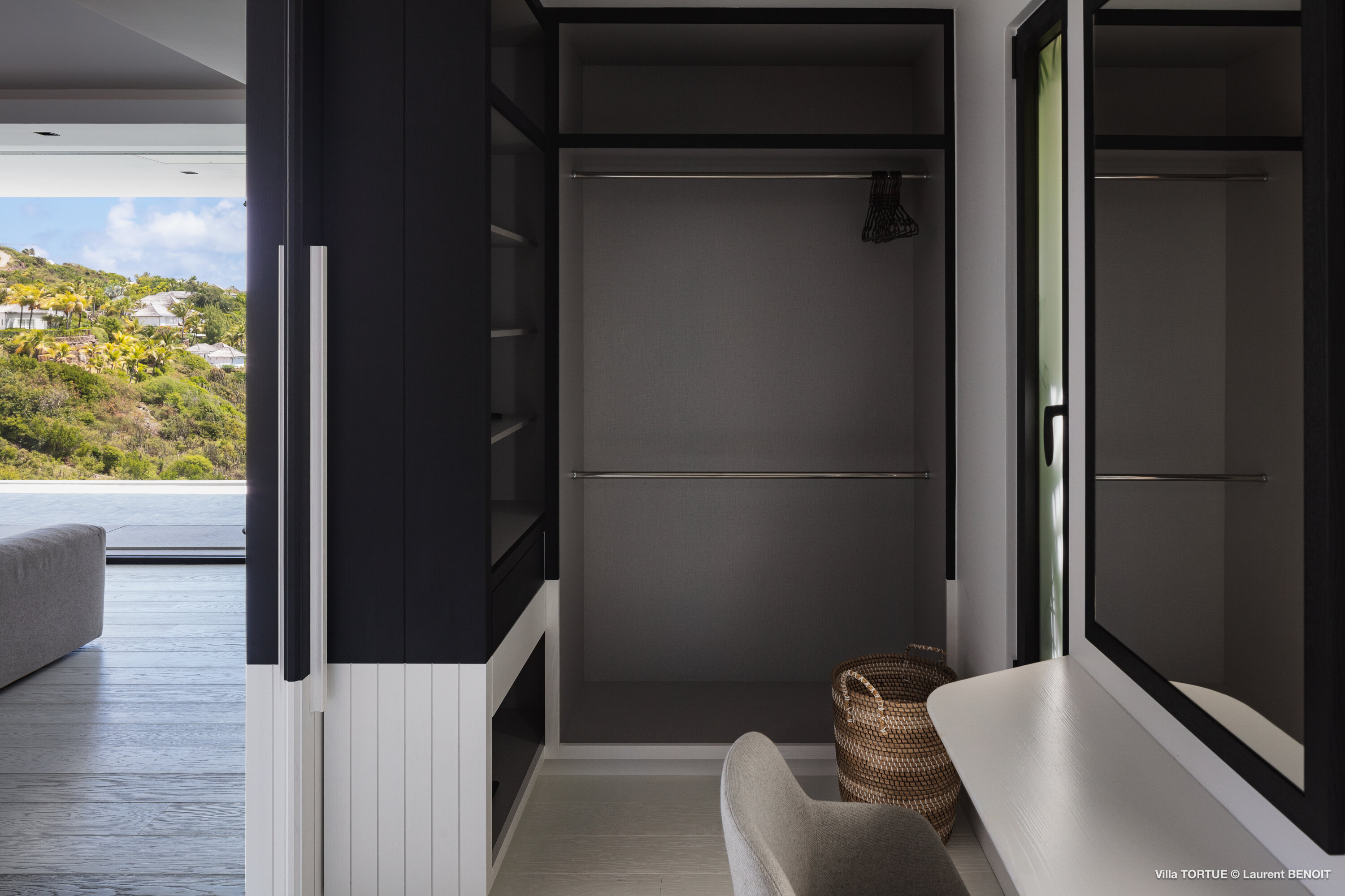 Villa Tortue offers four beautifully appointed suites, each with an ensuite bathroom and calming views over the sea, the lush valley, or the surrounding greenery. The primary suite, located on the upper level, enjoys a private terrace with exceptional panoramic views. Two additional bedrooms are situated on the main level, while the fourth, more intimate suite is located on the lower level, near the fully equipped fitness room.
