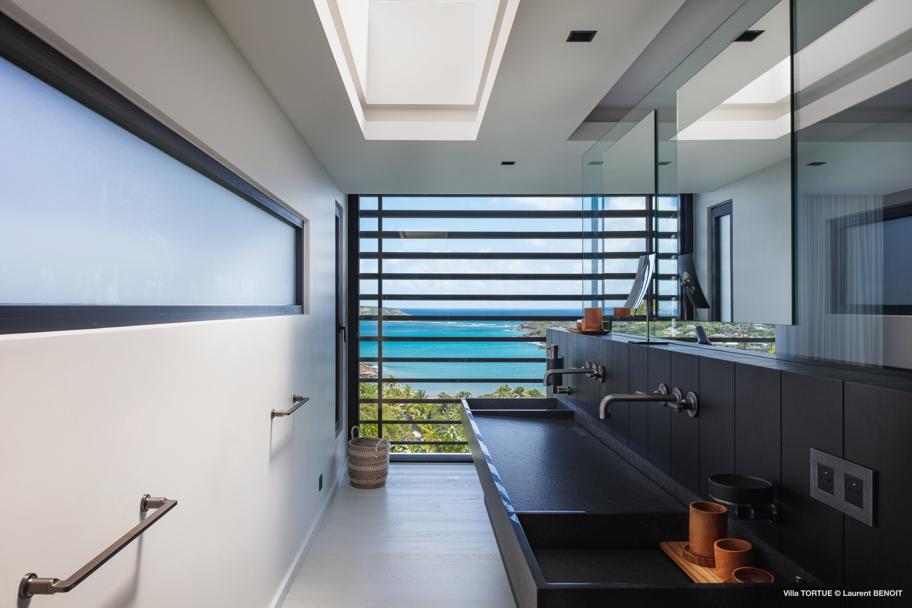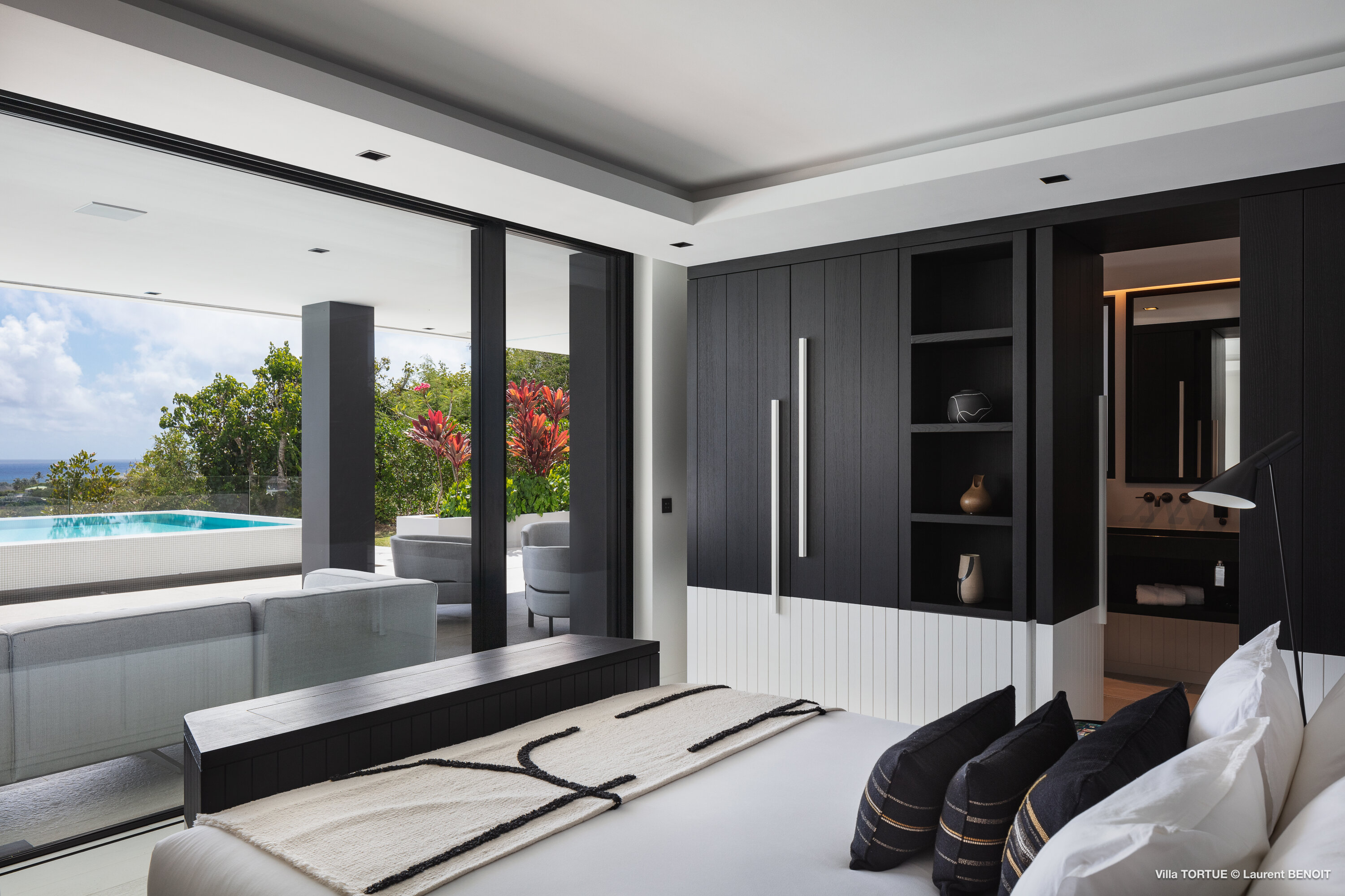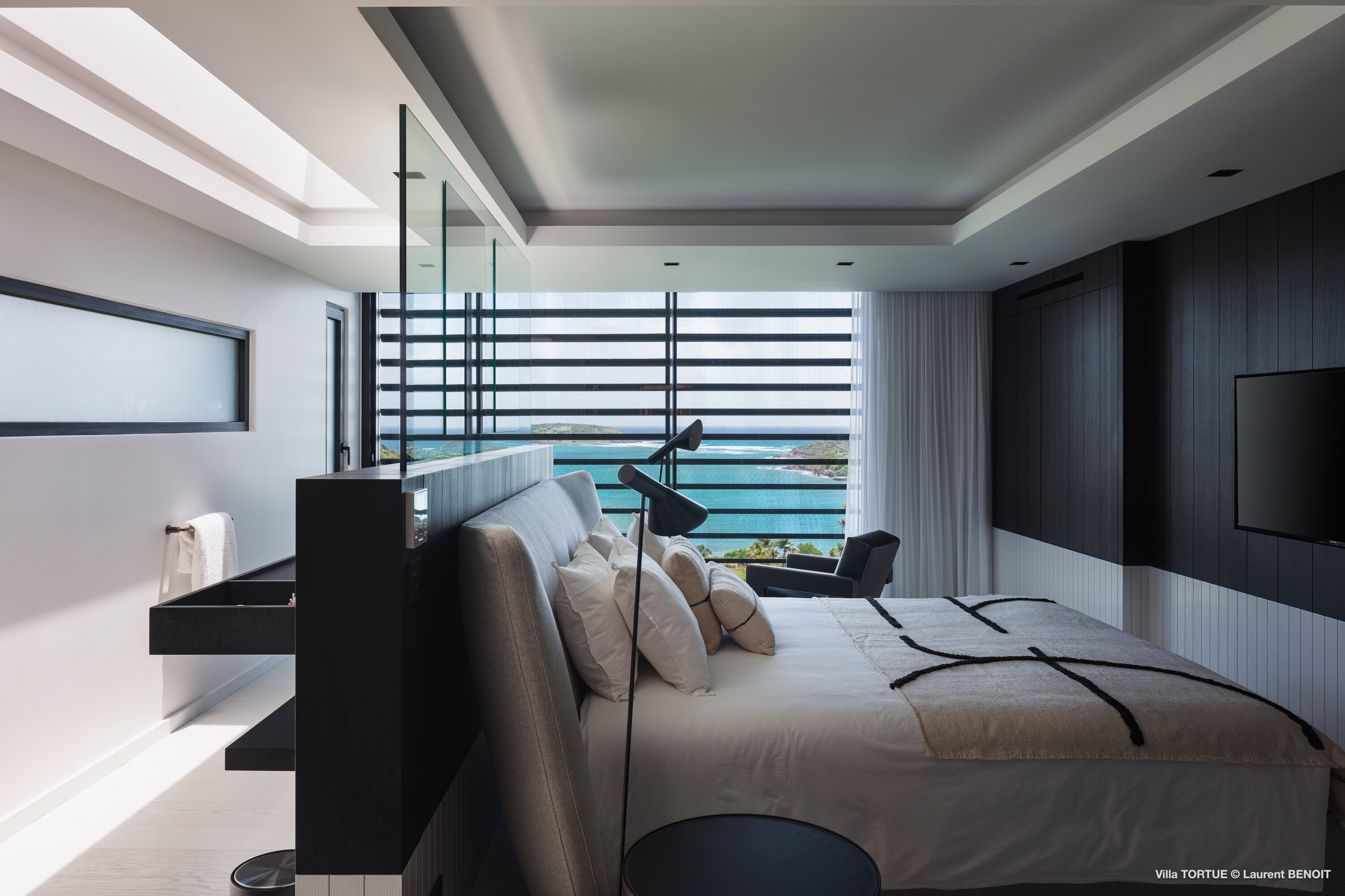 Built across three levels, the villa immediately impresses with its striking modern architecture, clean lines, and sophisticated black-and-white color palette. Custom-designed furnishings, high-end finishes, and expansive floor-to-ceiling windows enhance the generous interiors, filling each space with natural light and framing the sea at every turn.